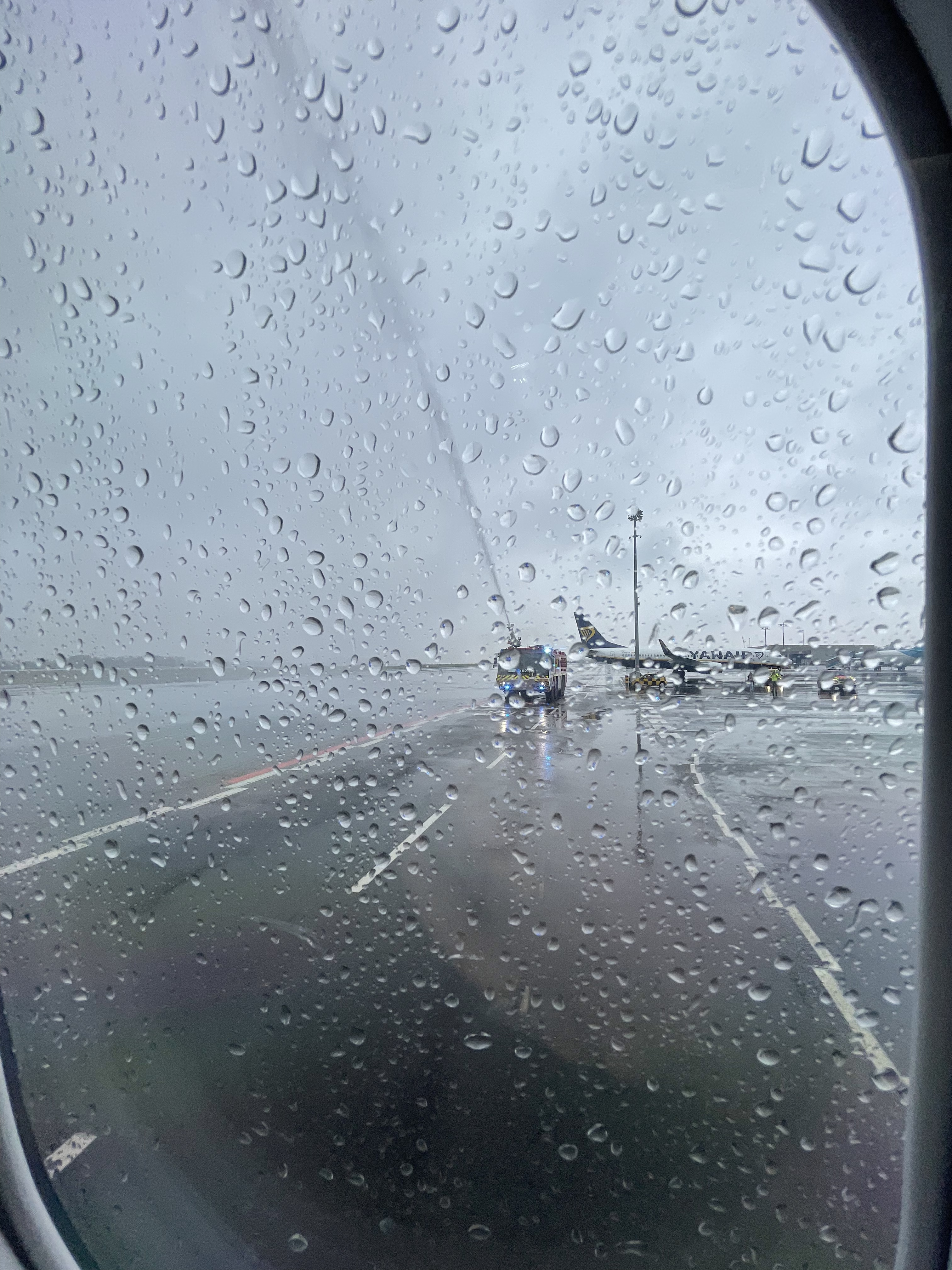 C’est sous la pluie et le vent que nous arrivons au Findel. Accueillis par Maeva au check-in, nous voilà tout de suite dans l’ambiance. Une fois dans l’avion, surprise, on nous annonce que l’avion sera salué par une arche d’eau pour les 60 ans du vol inaugural de la ligne Luxembourg-Paris.