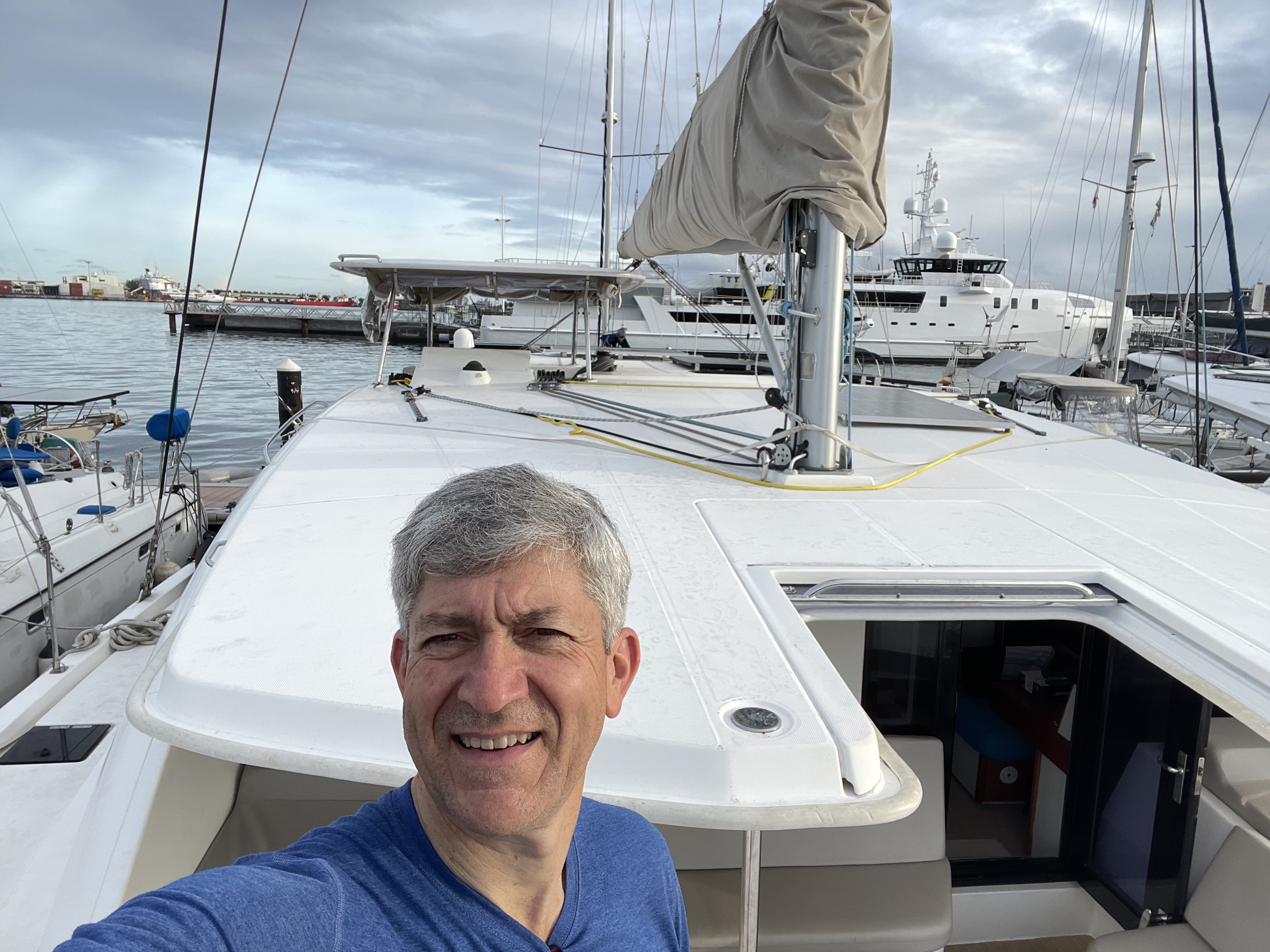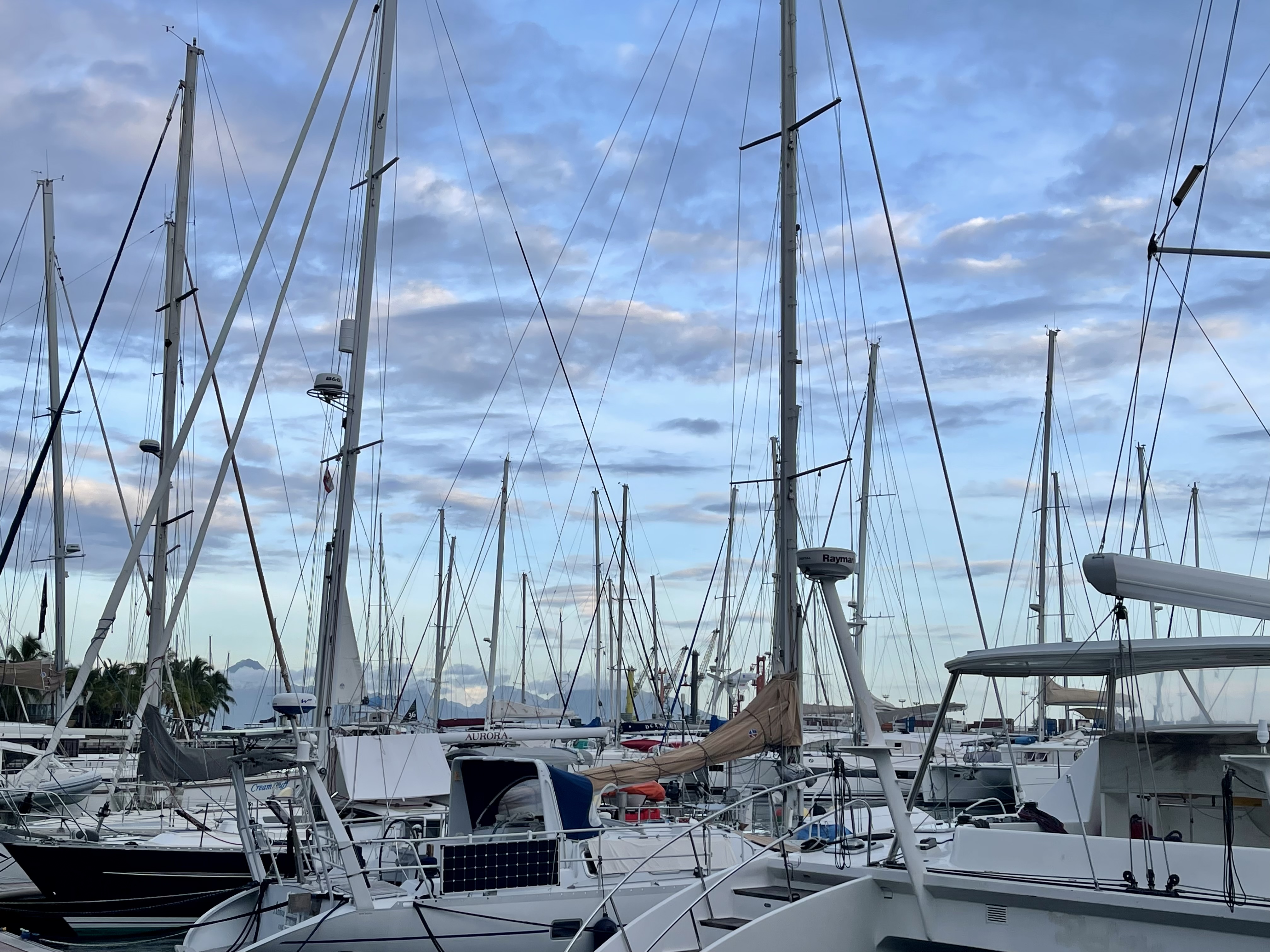 A notre arrivée, une surprise nous attend. Message de Françoise, de passage à Papeete, qui nous propose de nous retrouver et de la rejoindre au port. Devant les portes de la marina, petit souci, Françoise ne répond pas au tél. Après avoir repéré le catamaran, Christian demande aux gardes de sécurité d’aller prévenir (réveiller?? – et oui, les formalités ont été tellement rapides que nous sommes déjà à la marina avant 6h du matin).
