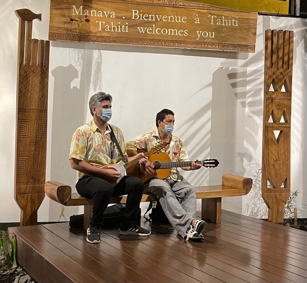Nous arrivons en avance à 4h50 du matin. C’est au son du ukulélé que nous débarquons à Papeete. Tout de suite dans l’ambiance…