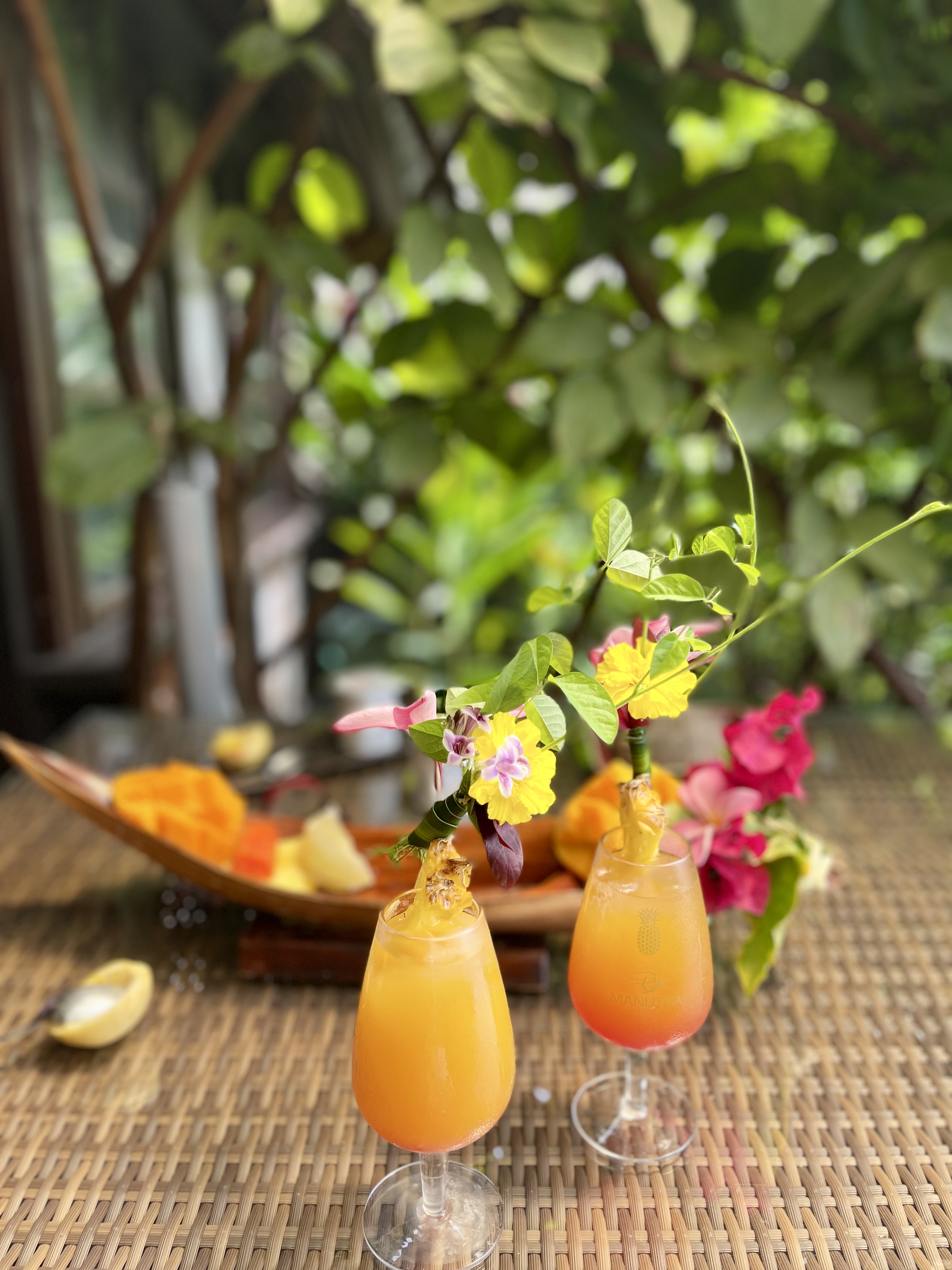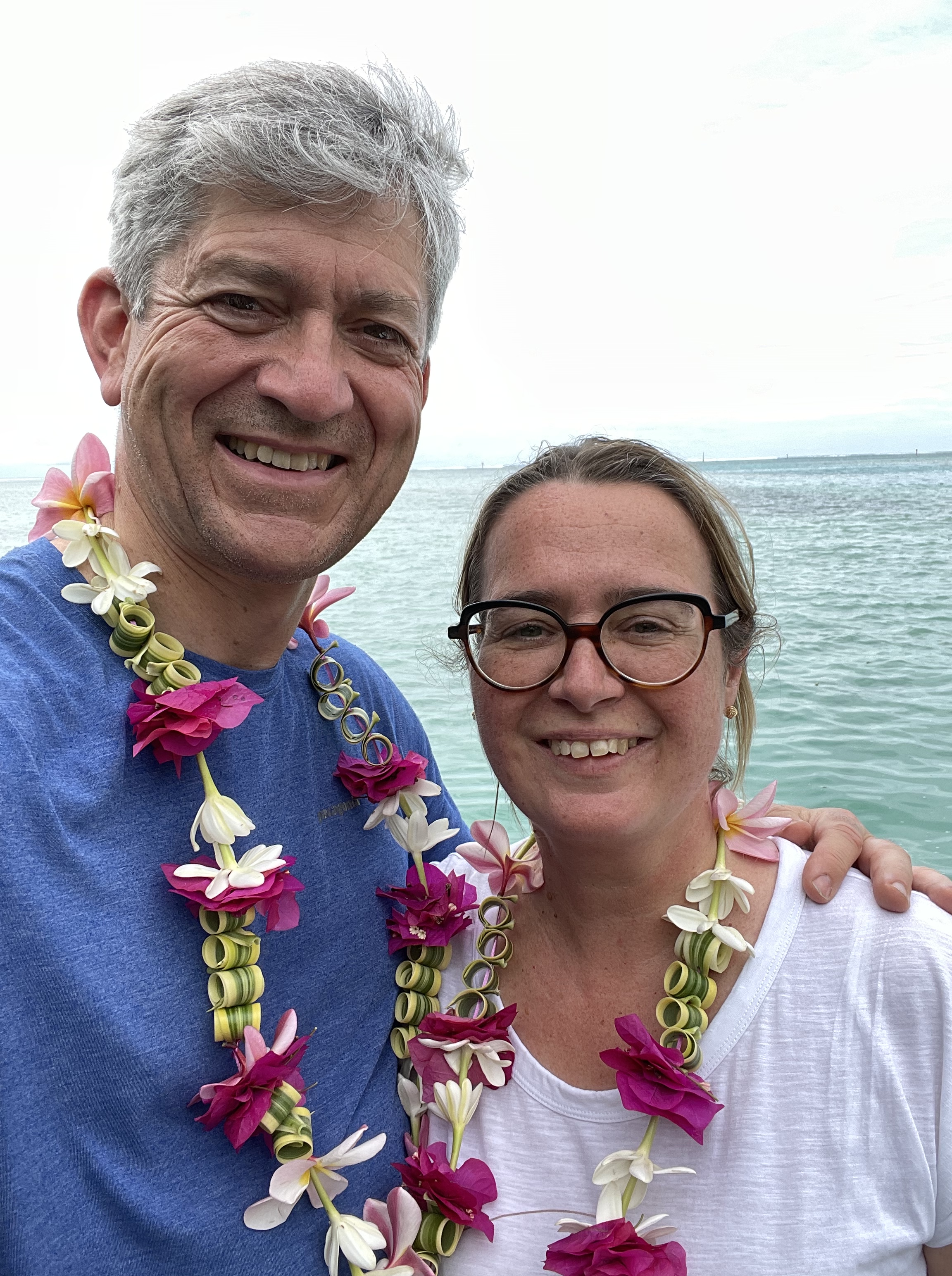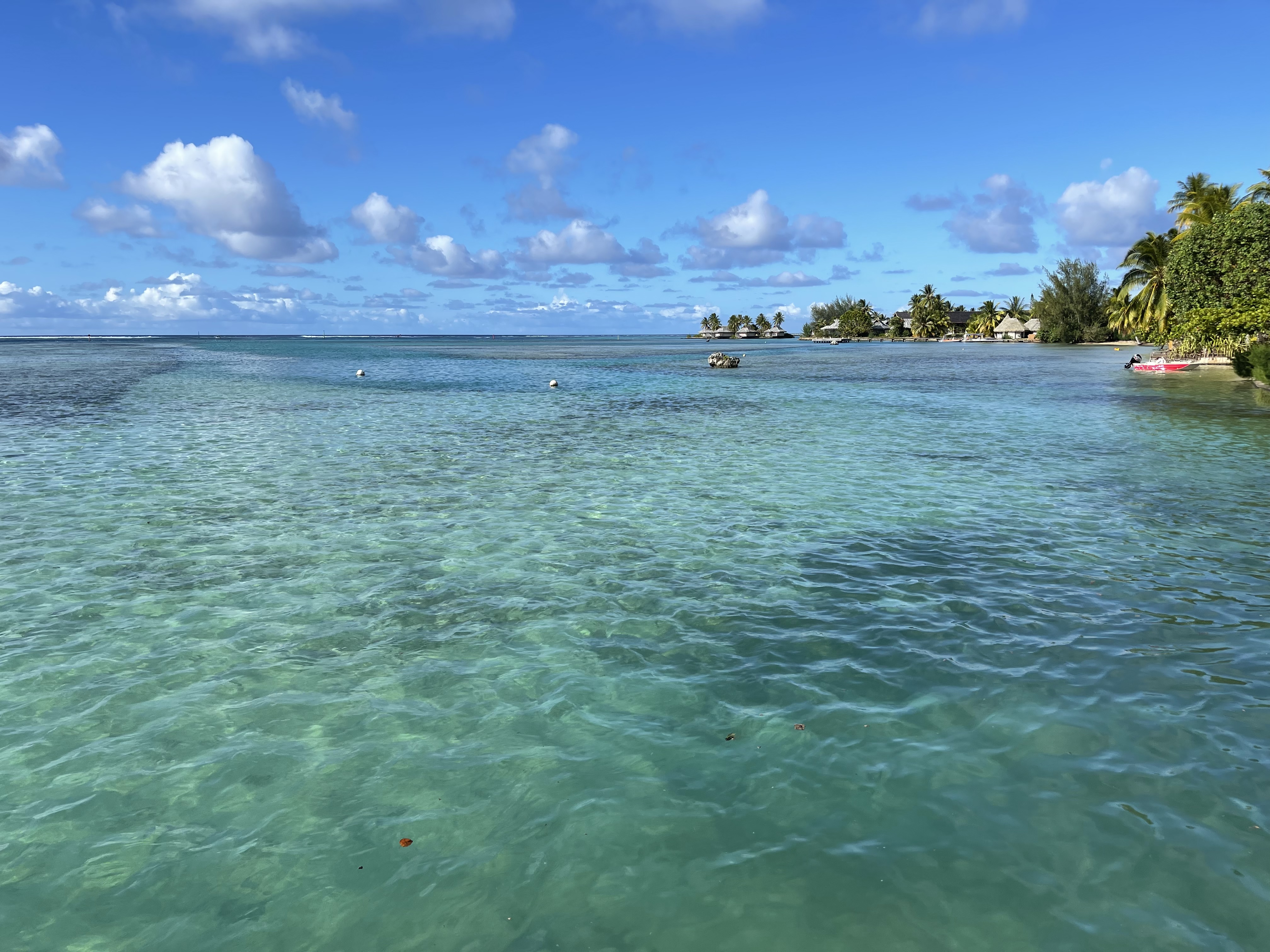 30 minutes plus tard, nous traversons Moorea sous une pluie fine et nous nous installons (sous le soleil) au Fenua Mata’i’Oa face au lagon turquoise. Accueillis par Eileen et de beaux colliers de fleurs 🌸🌼🌸