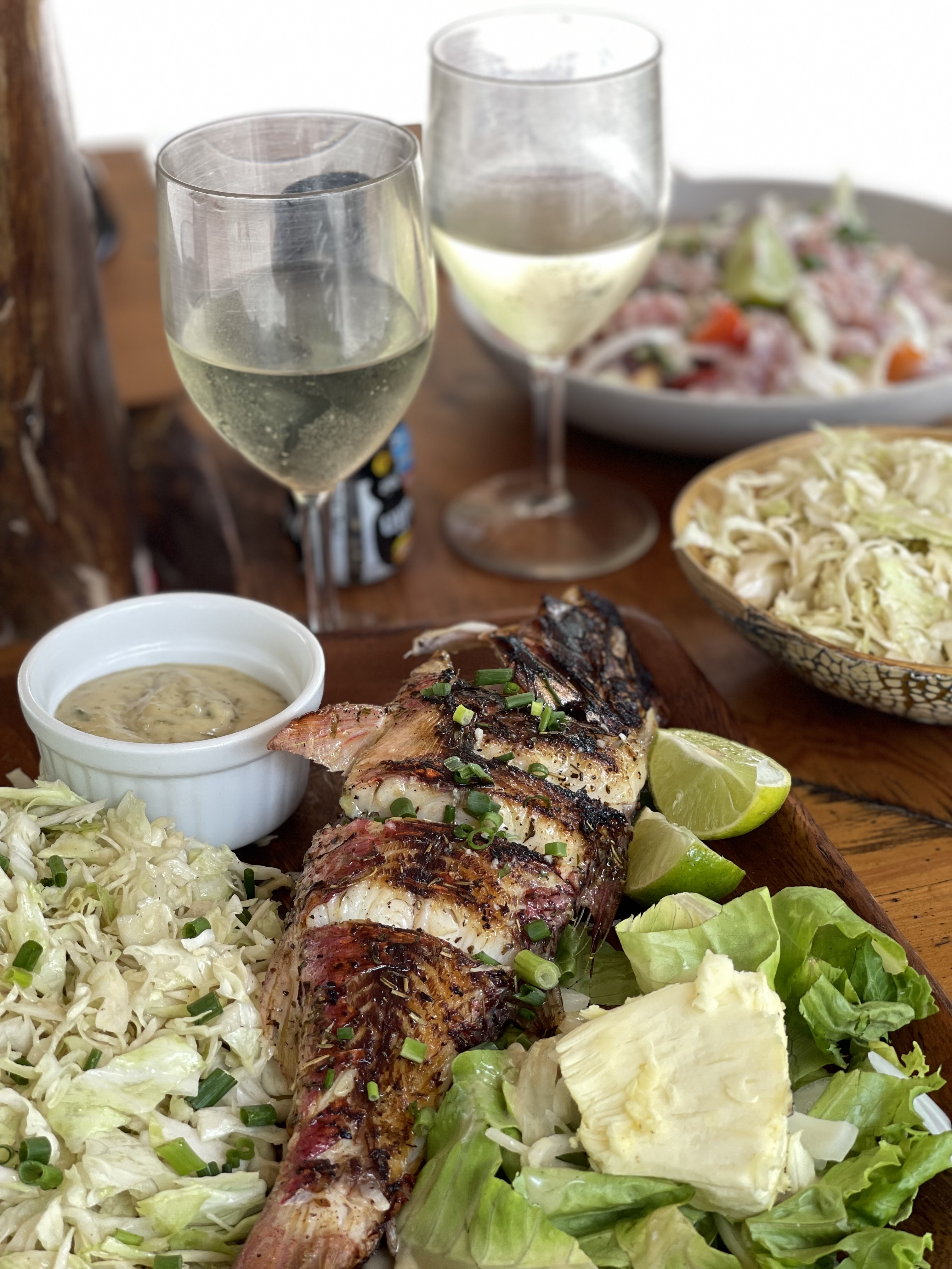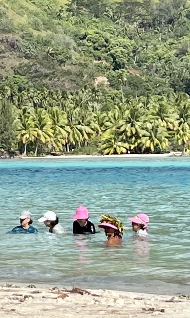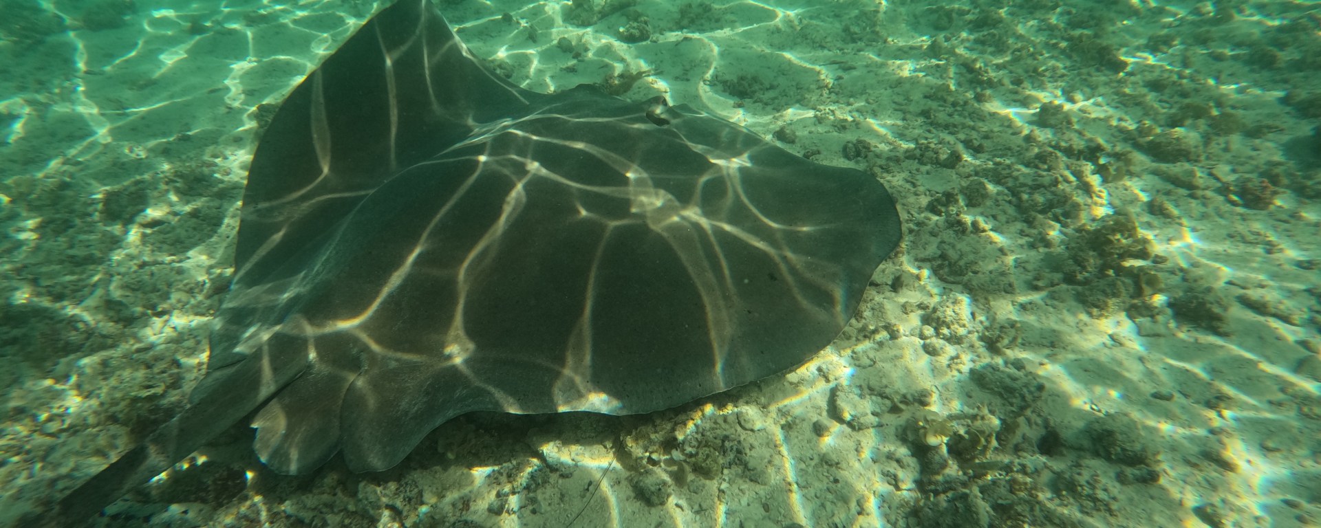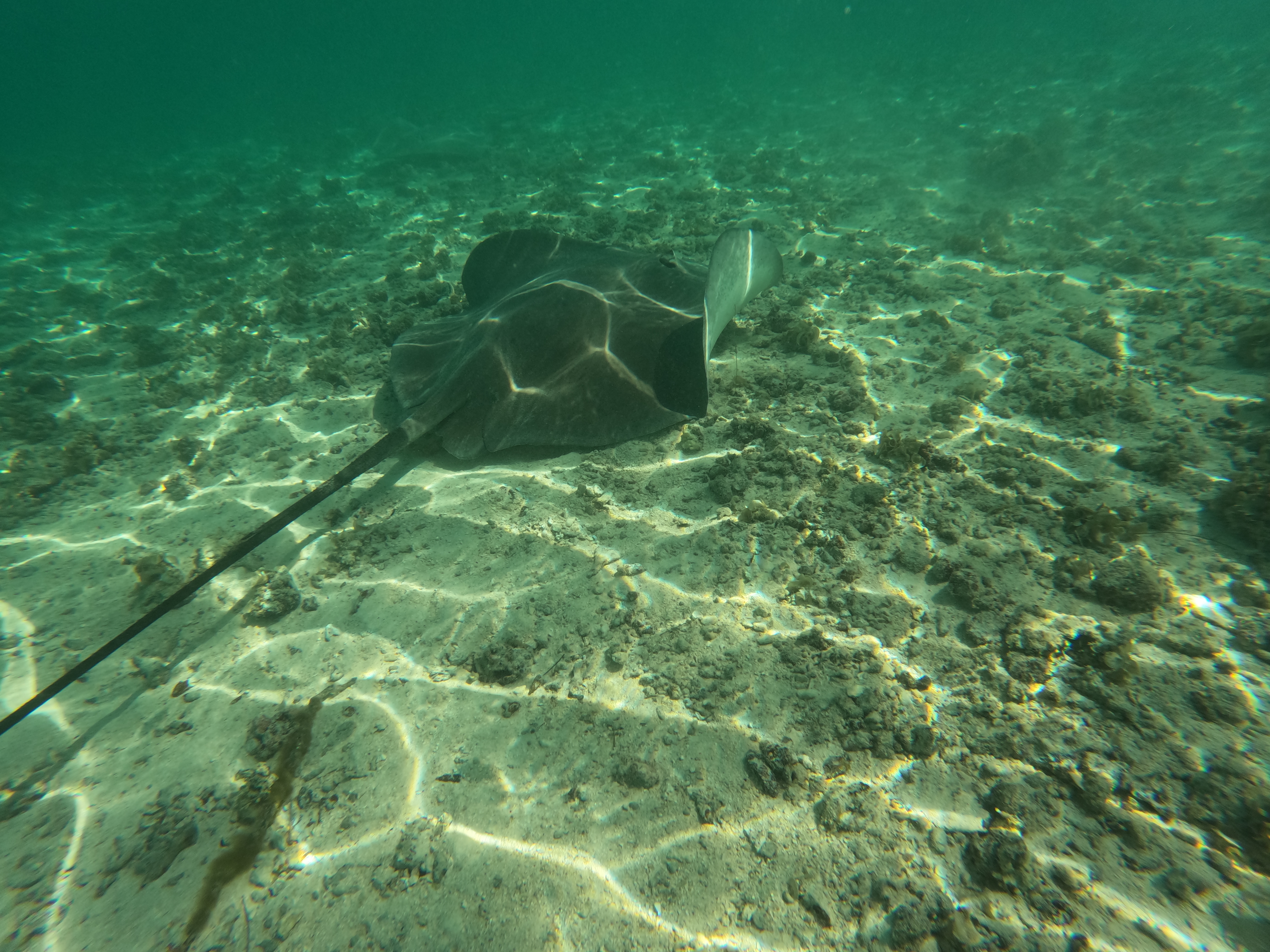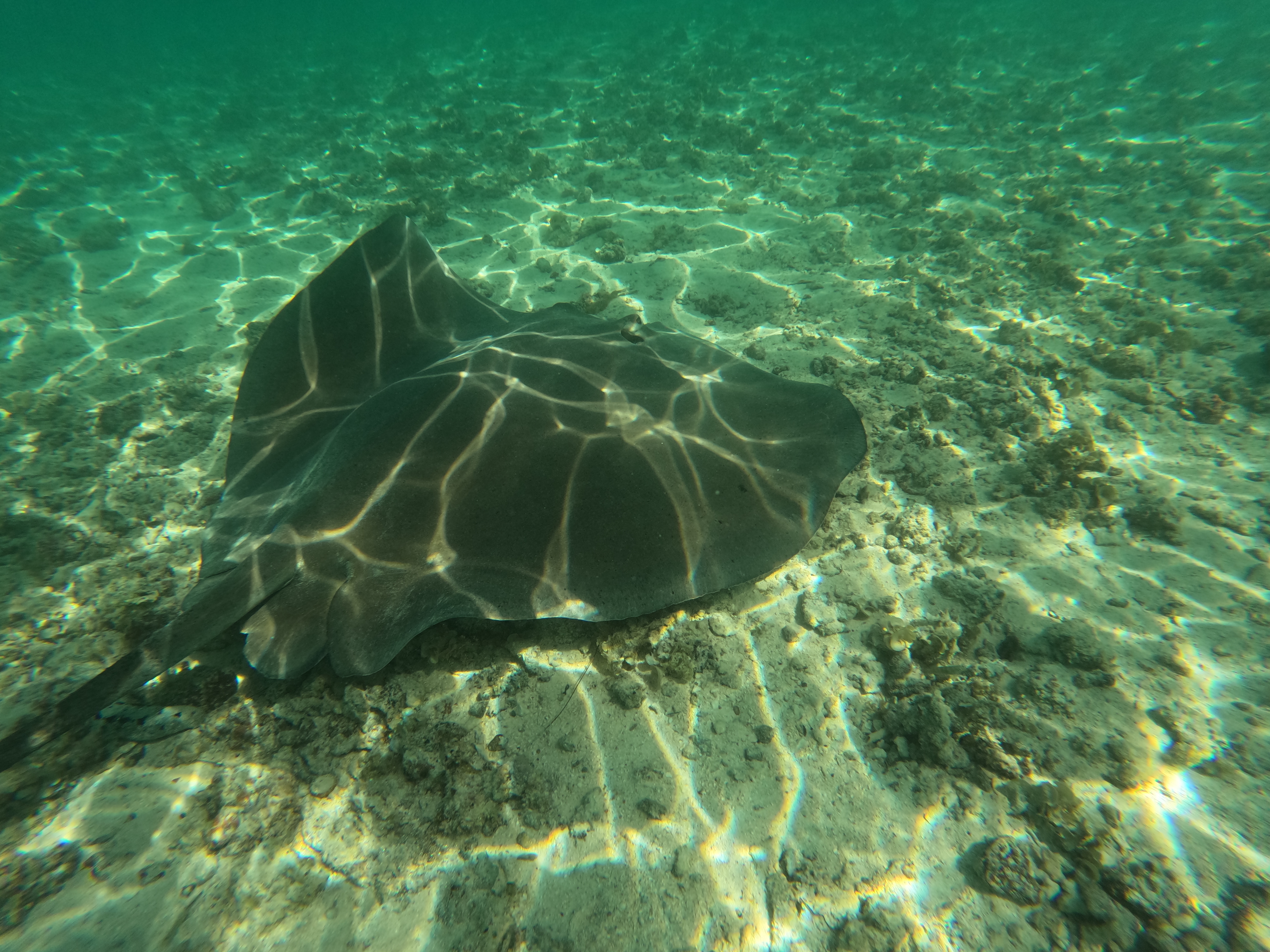 Comme tout le monde, nous terminons le repas par un « plouf digestif » et un moment détente au bord de la plage. Moment magique, des raies viennent se faufiler entre-nous. Et cette fois, on a les images!!!