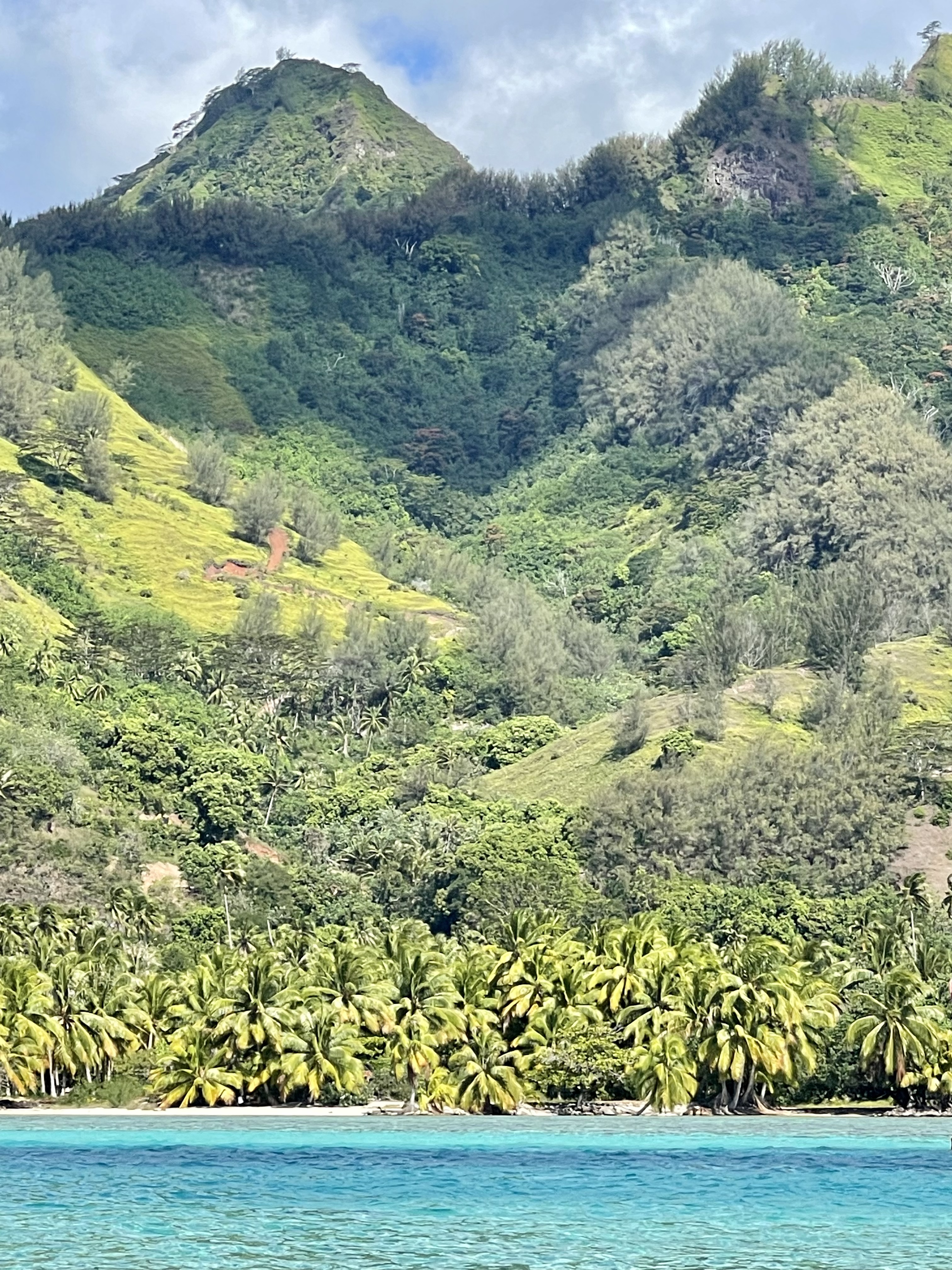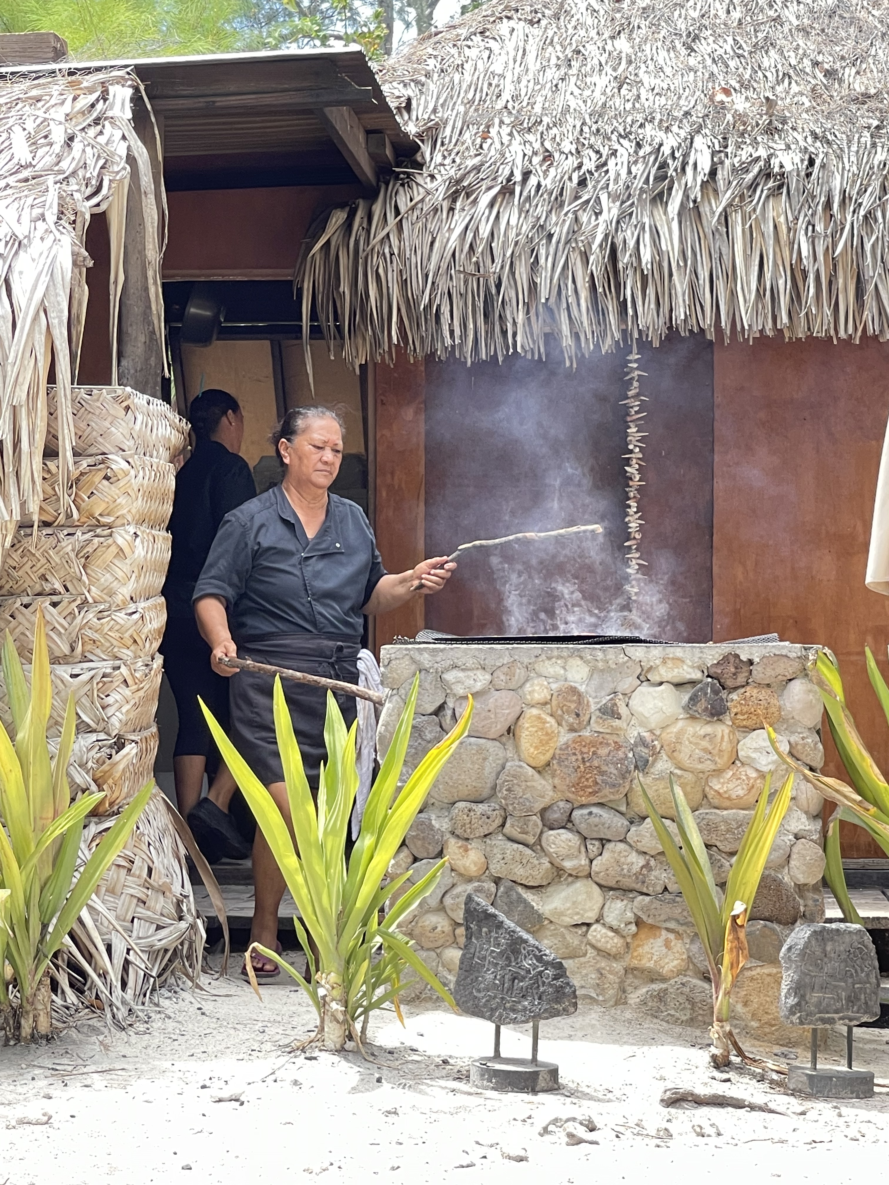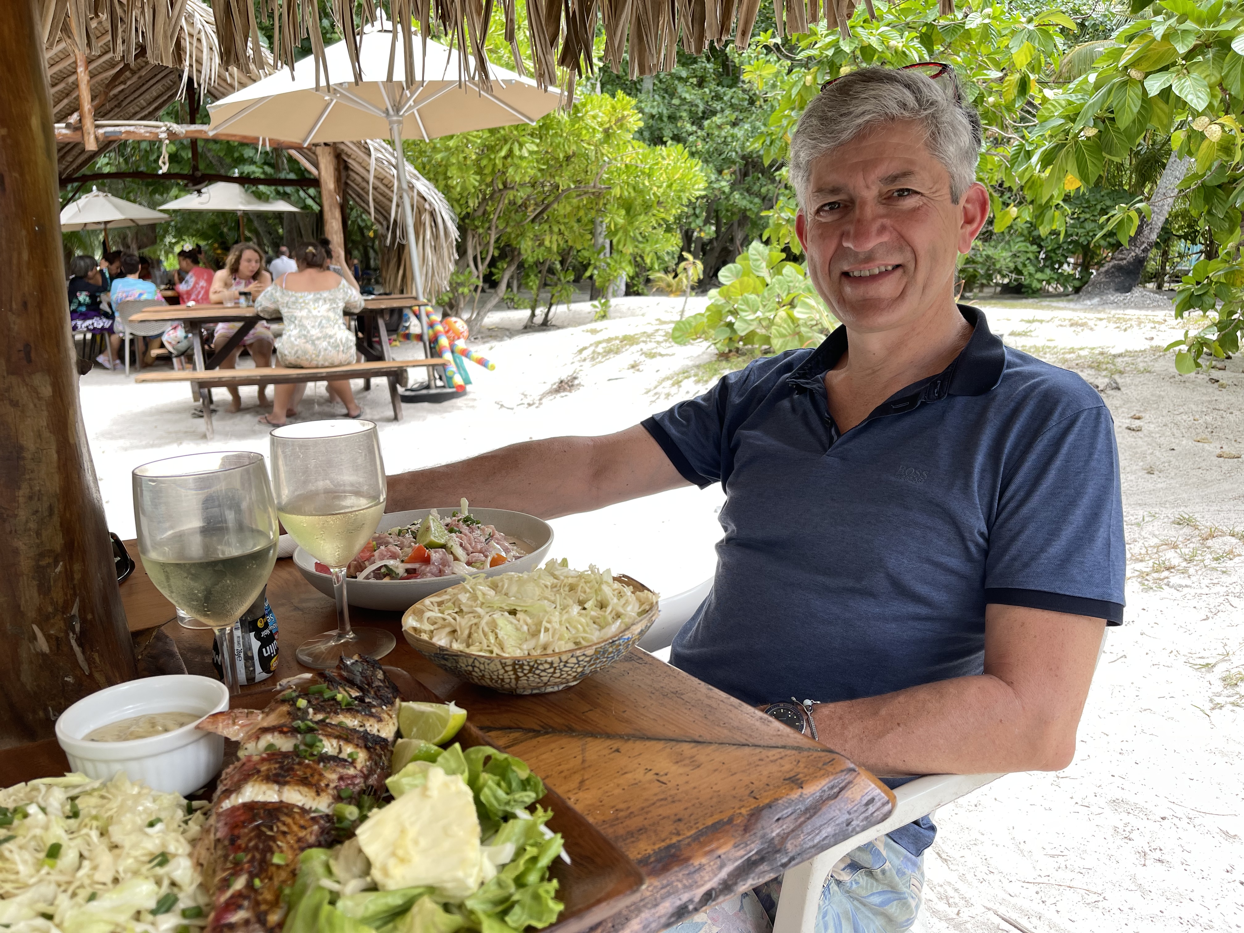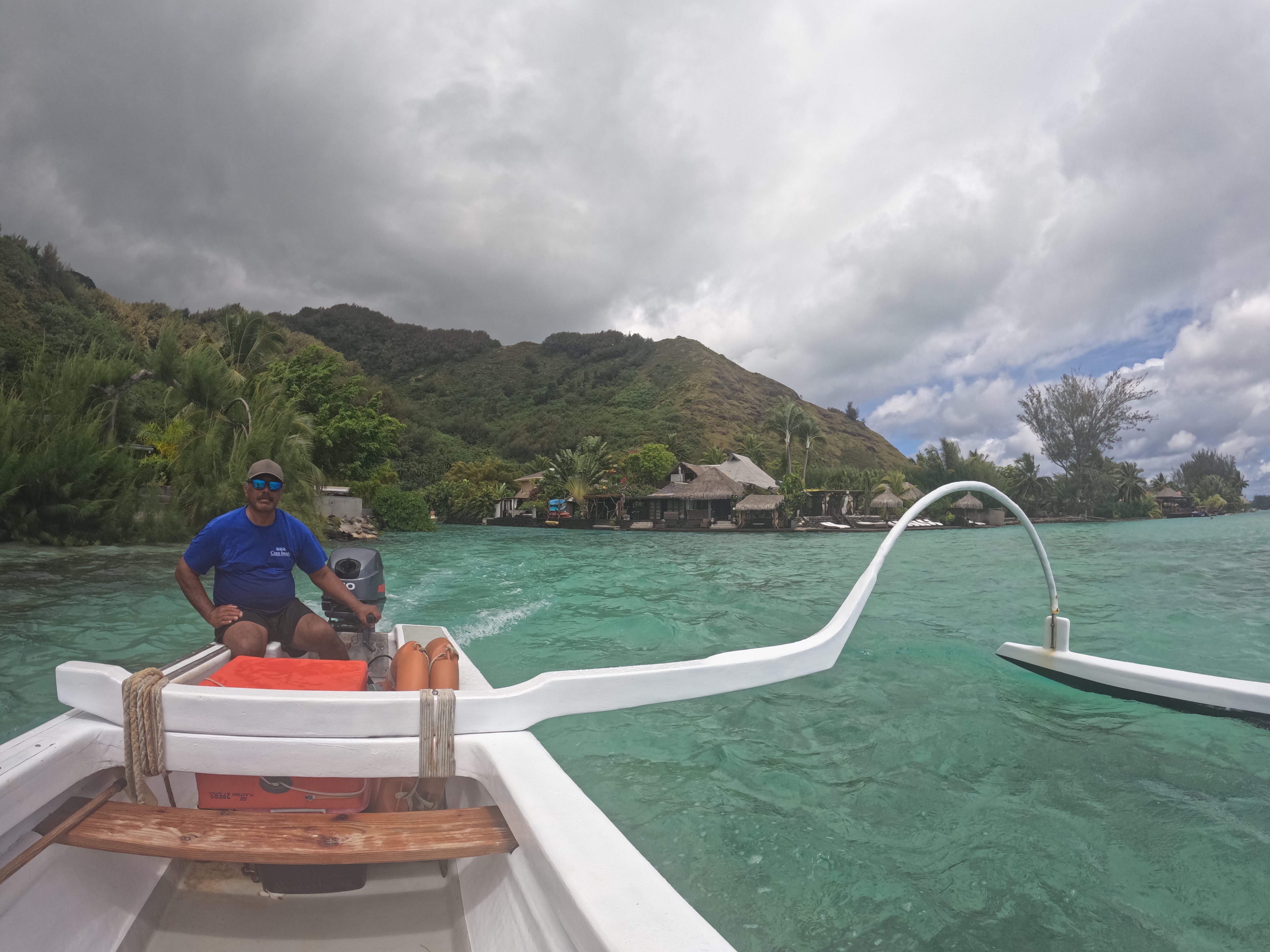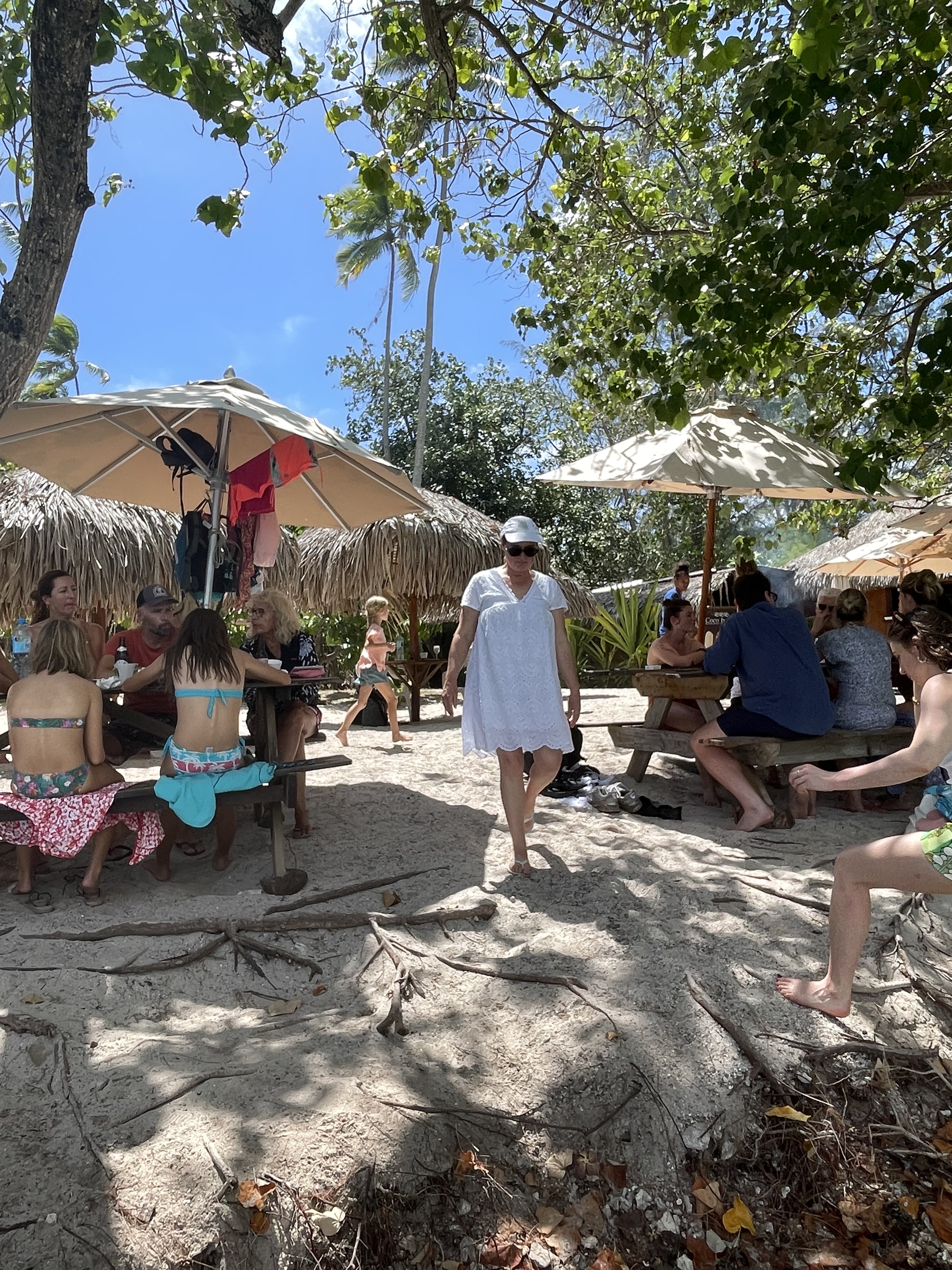 11:30, transfert en bateau vers le Coco Beach; restaurant de plage situé sur le motu Tiahura. Moment culture, un motu est un îlot de sable corallien. On déjeune les pieds dans le sable entourés de Polynésiens venus profiter d’un dimanche en famille ou entre amis.