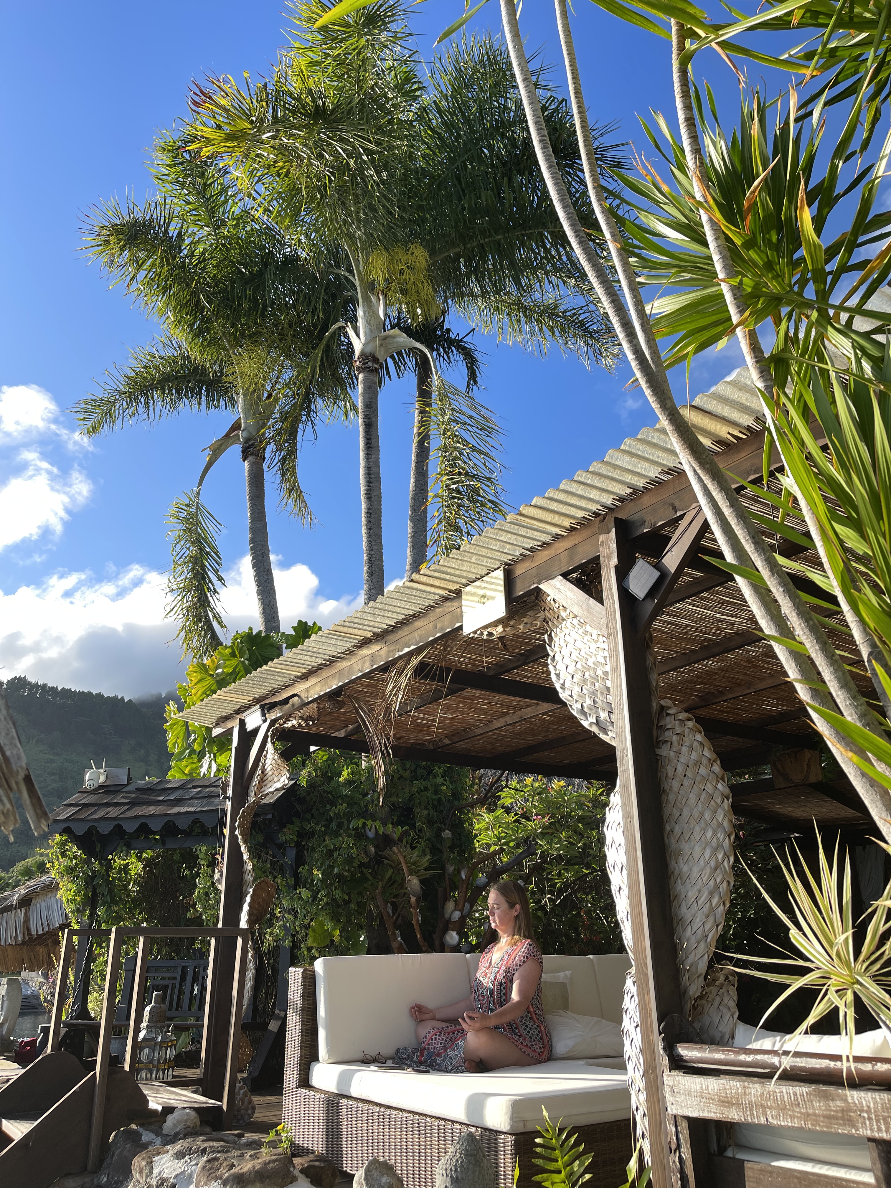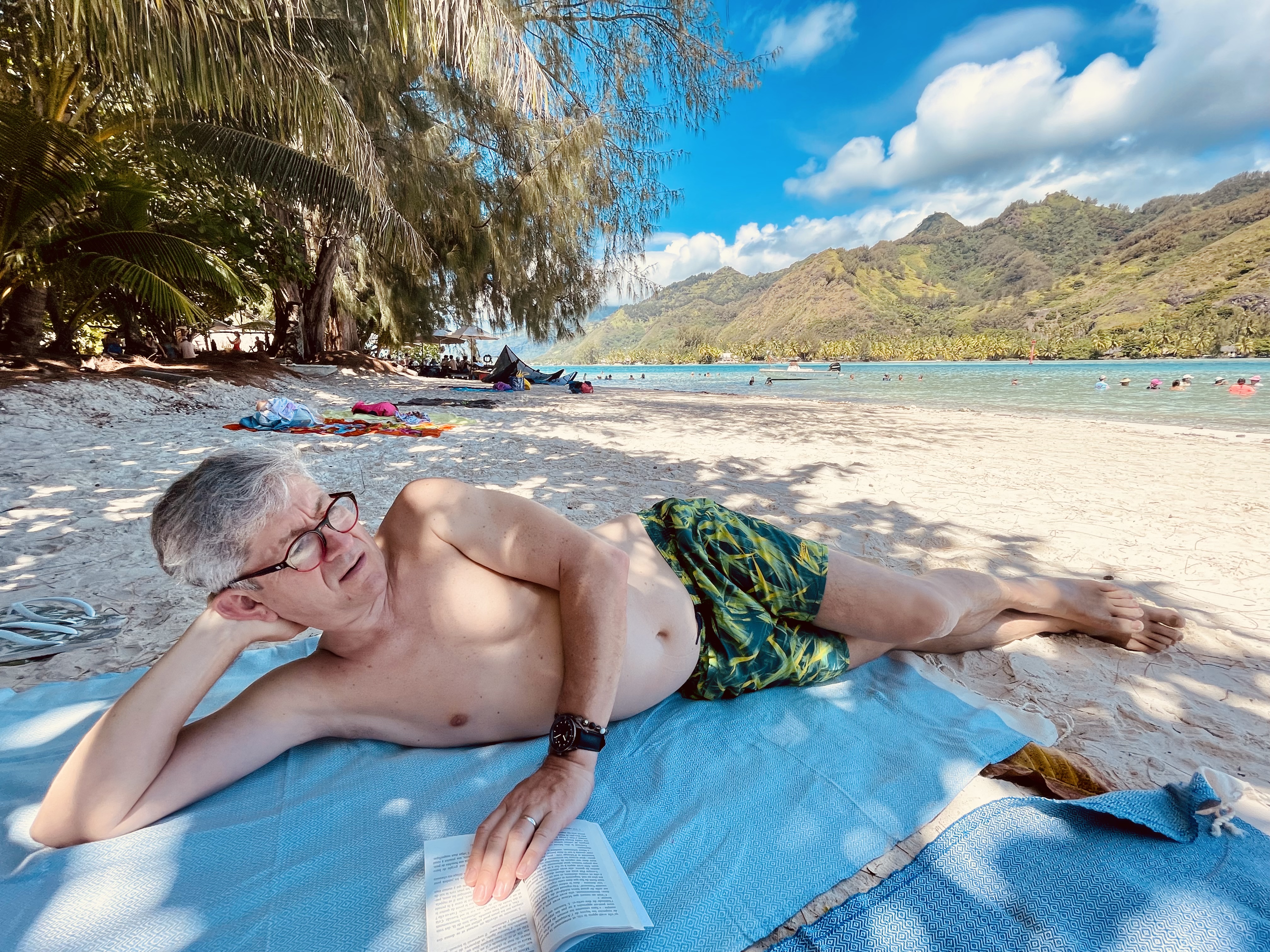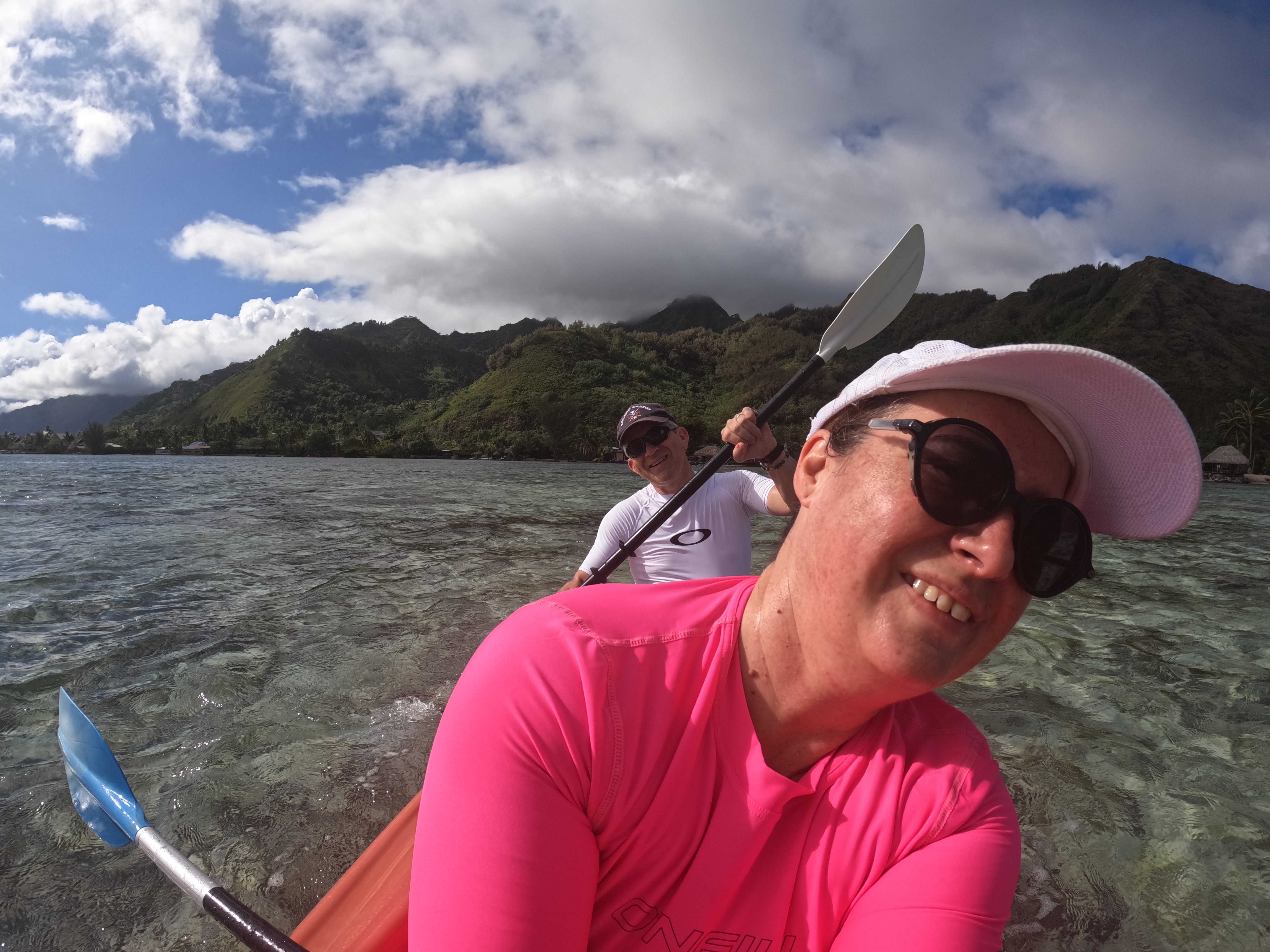 On continue la journée avec une sortie en kayak pour aller voir les raies et les requins à pointe noire. Bien sûr c’est Christian qui pagaye, il faut bien quelqu’un pour prendre les photos 😂. Avec le courant et le vent, la maîtrise du kayak s’avère plus ardue que prévue 😱. Pauvres nageurs autour de nous… Du coup, adieu les photos de raies ou de requins; on se contentera d’un tour du lagon.