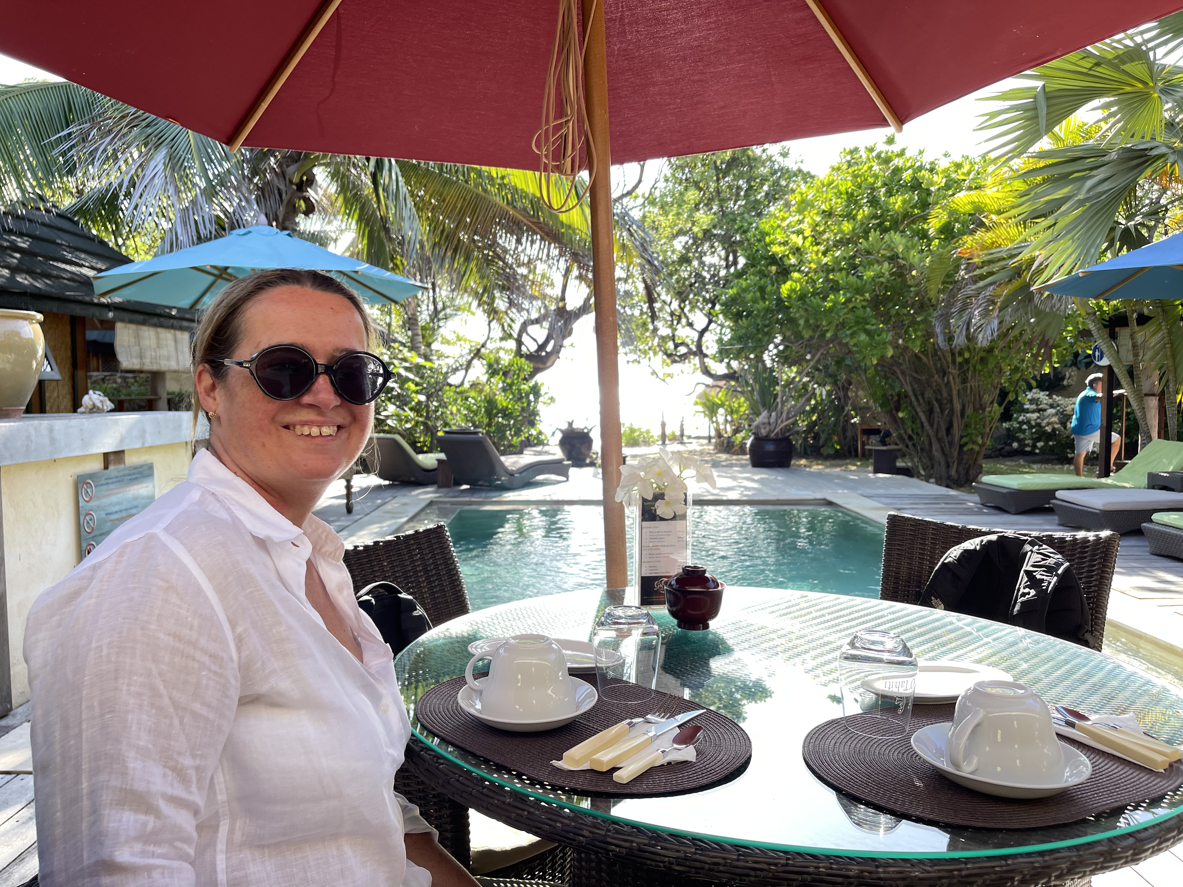 Comme les journées commencent tôt ici, à huit heures, nous étions confortablement installés au bord de la piscine pour prendre le petit-déjeuner et bouquiner ensuite.