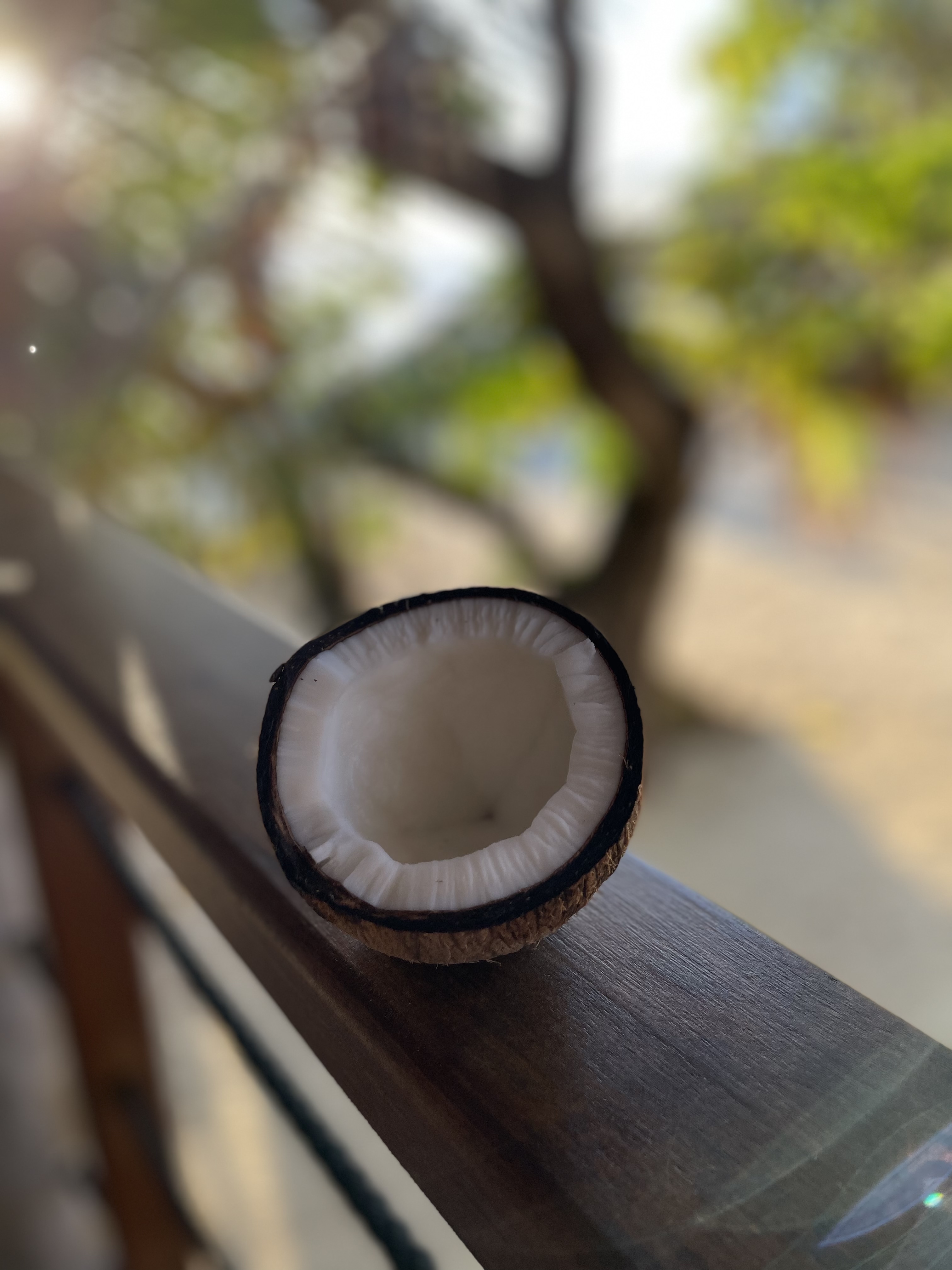 Levé à l’aurore, Christian est intrigué par un bruit sur la plage. Notre voisin ouvre avec des moyens de fortune des noix de coco et c’est moi qui profite d’un jus frais car il n’aime pas ça!