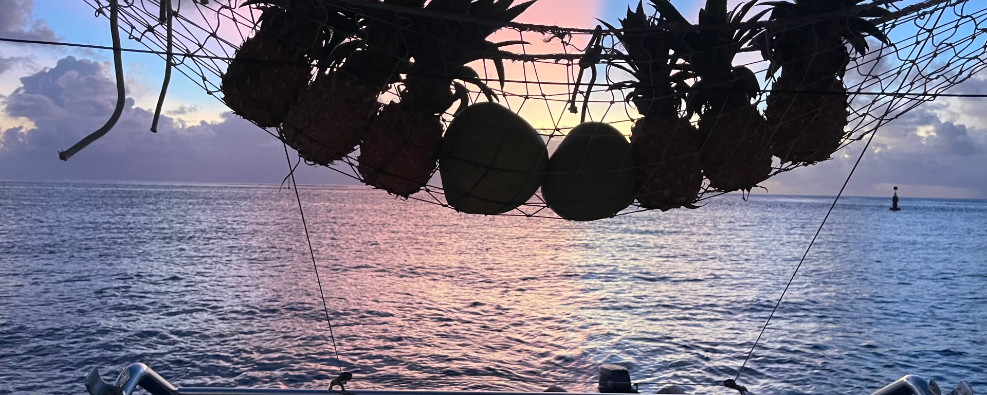 Arrivés à destination, pas de taxi dans ce minuscule aéroport!!!! On ne doit pourtant pas aller bien loin. Alors, pas le choix, on va tester la technique recommandée par Jeanne. Christian repère une voiture qui dépose 2 passagers et fait signe à la conductrice pour lui demander de nous emmener au village. Et la réponse est OUI 😃. En plus, la dame (désolés on n’a pas retenu son prénom polynésien) s’improvise guide touristique et nous donne tout un tas d’info sur Huahine. La première, la signification du nom de l’île. Hua : sexe; Hine (de vahine) : femme. On vous laisse assembler les deux. Elle s’arrête au bord de la route et nous montre le profil des collines devant nous qui évoquent une femme couchée. Devant le supermarché où nous avons rdv, personne. On n’a pas regardé du bon côté, il fallait regarder sur la mer où Giorgi nous attend sur le dingi. On saute à bord pour grimper quelques minutes plus tard sur le catamaran