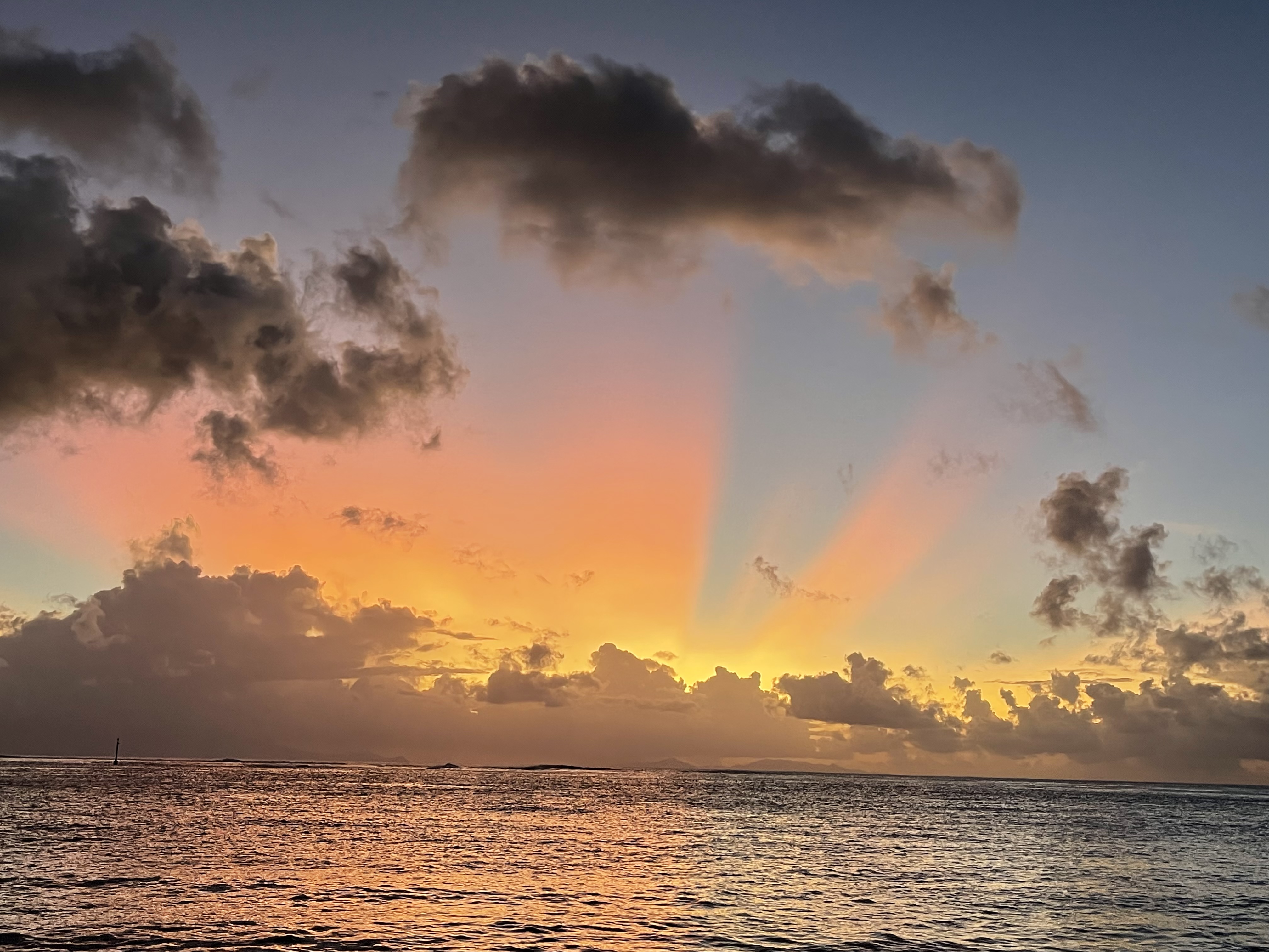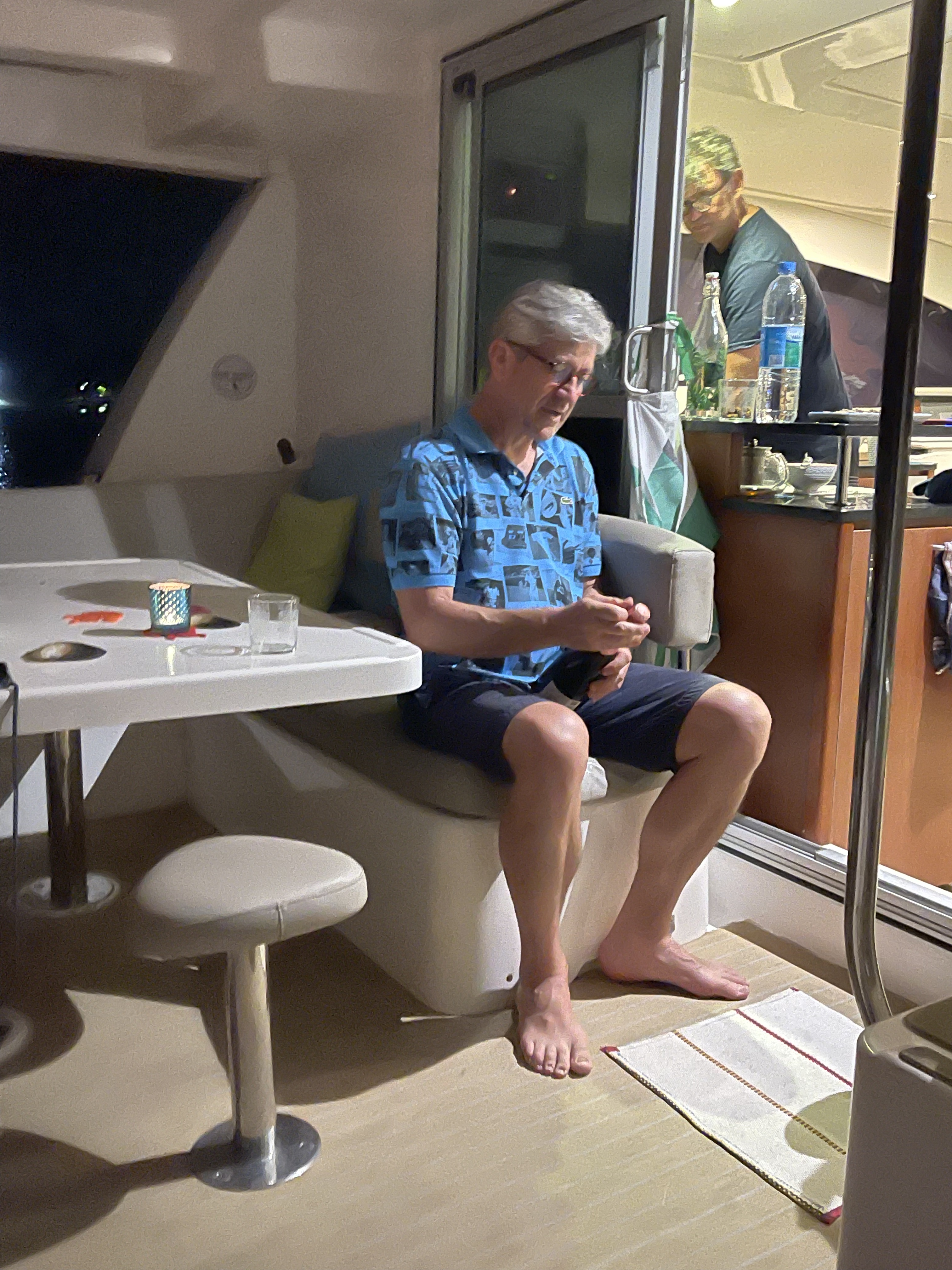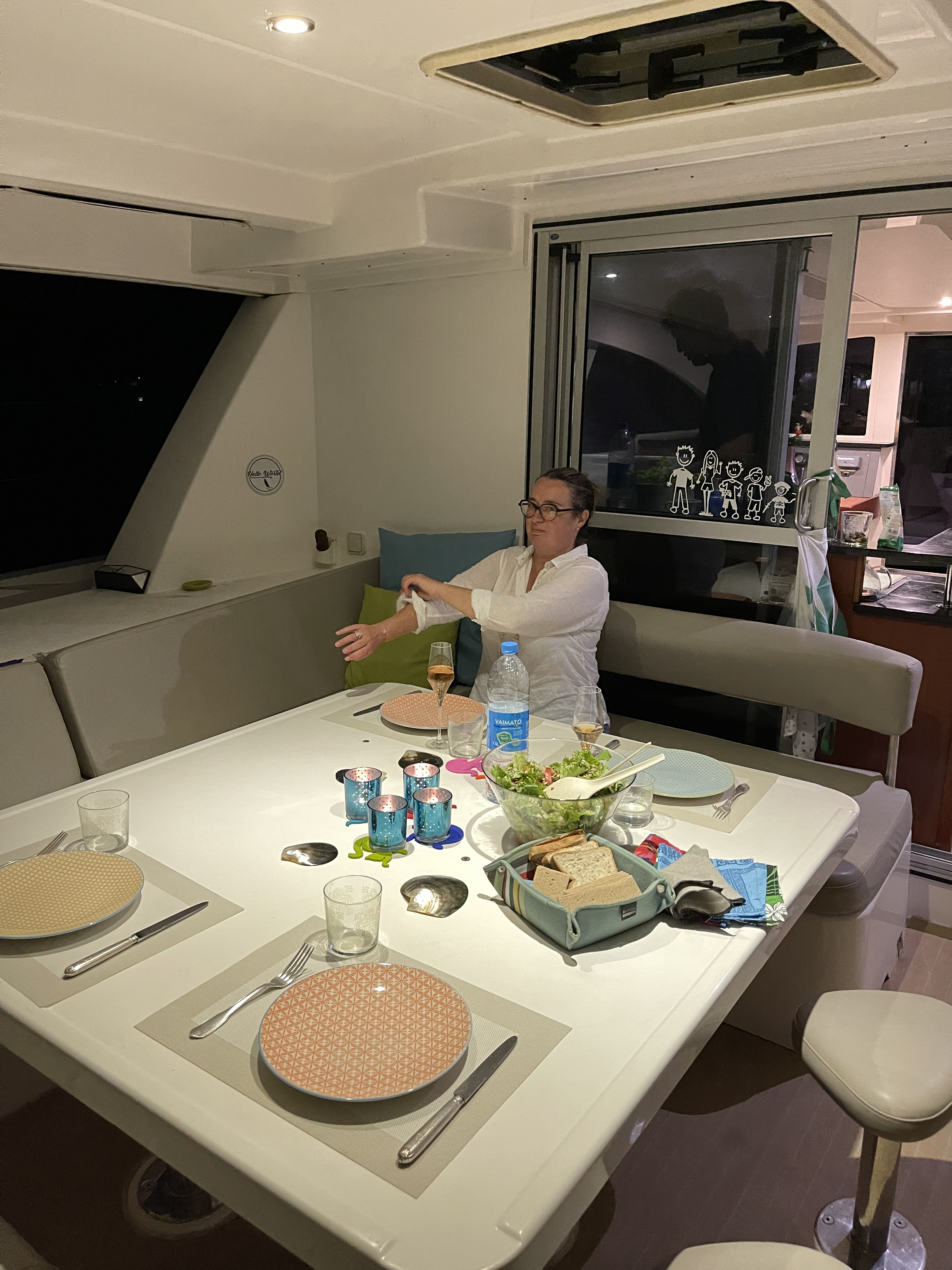 Pour ce premier soir, magnifique coucher de soleil. On trinque au champagne rosé en souvenir de notre amie Christine. Délicieux dîner cuisiné par Giorgi (rouget et poisson perroquet au menu, le tout pêché par ses soins) et discussions animées sur des sujets inattendus (religion, politique, monarchie)! Ca démarre fort.