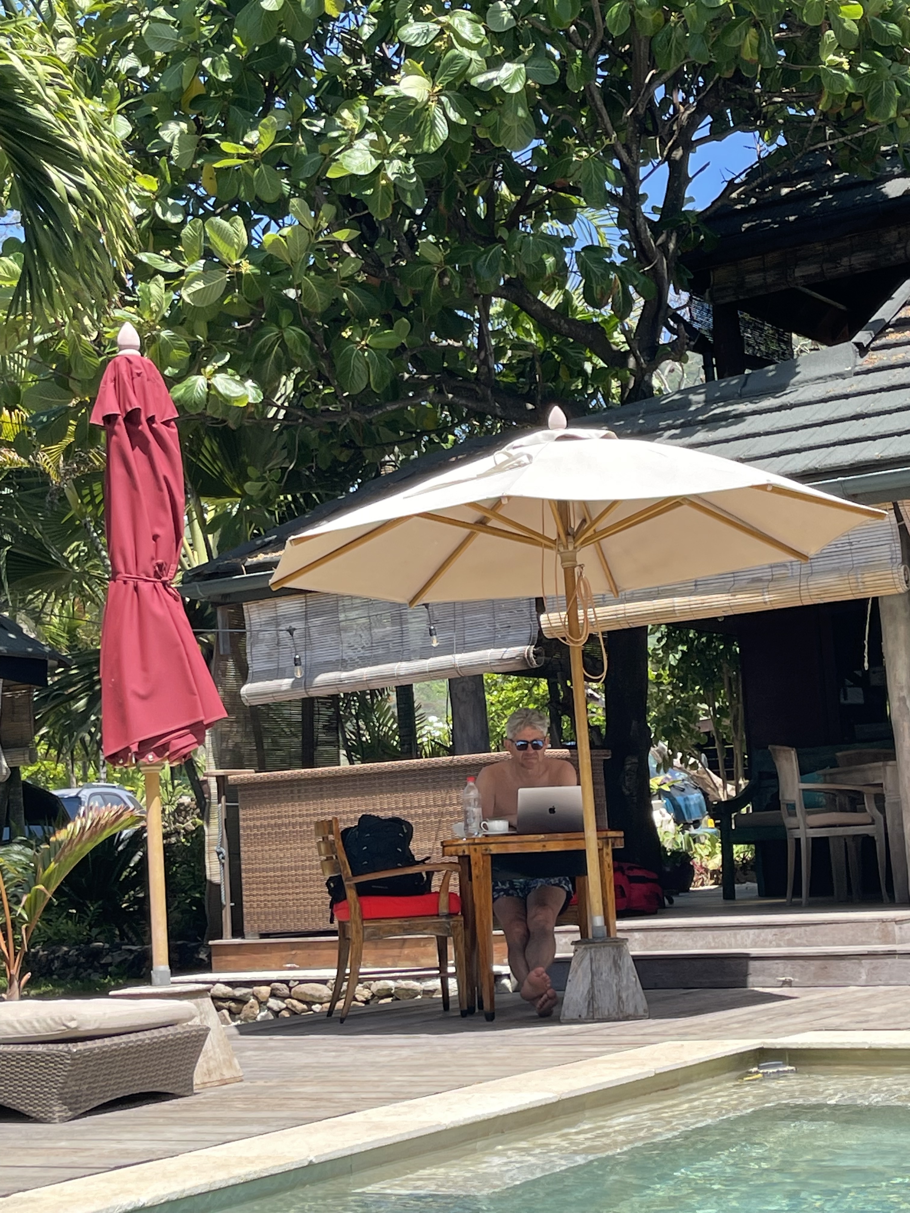 Une nouvelle matinée tranquille au lodge avant de partir vers Huahine. Yoga, petit-déjeuner, travail au bord de la piscine…