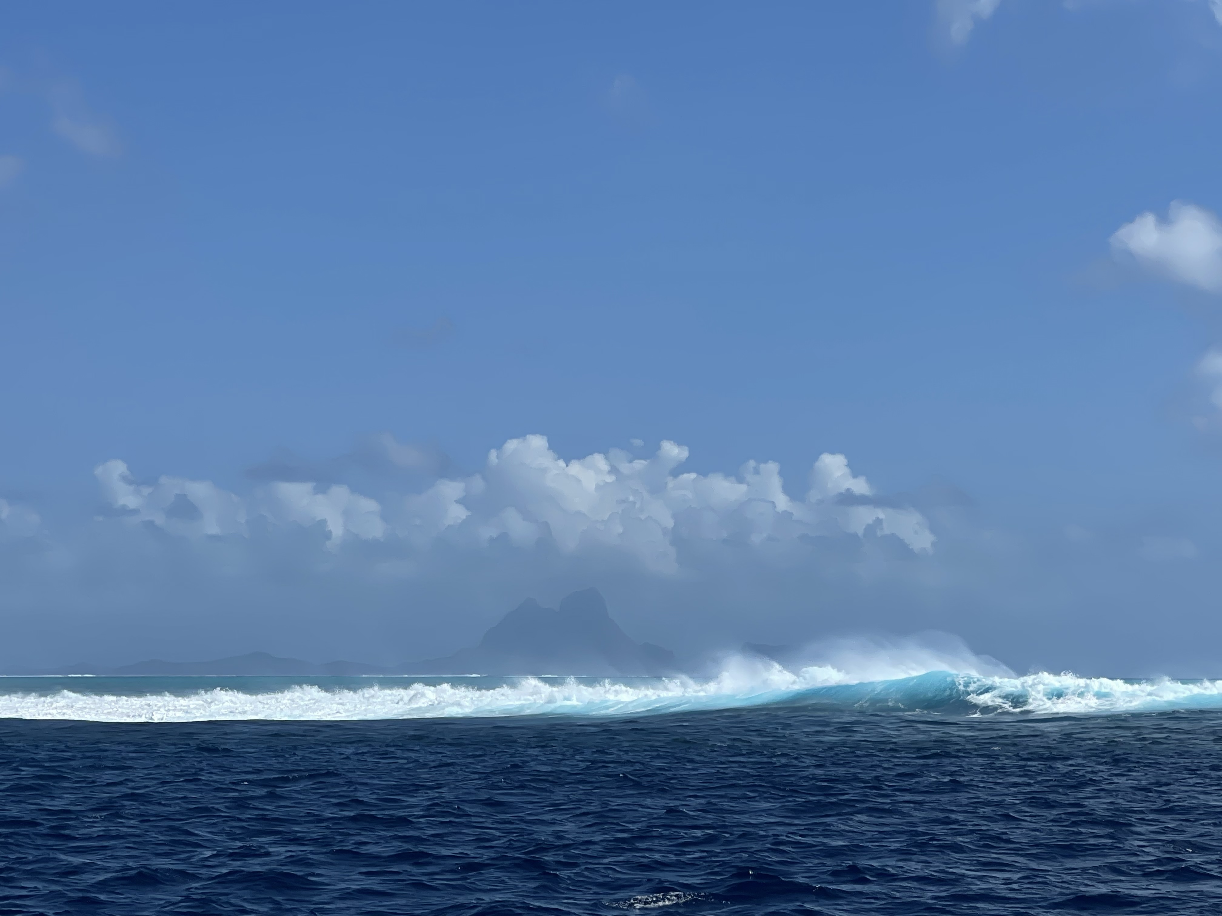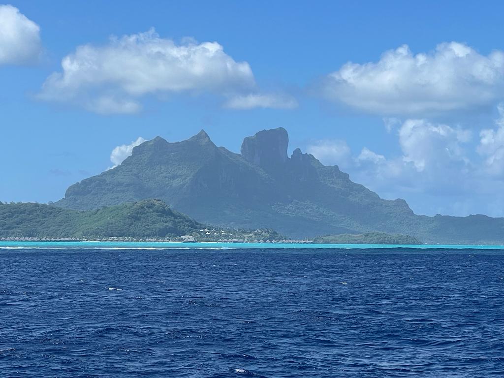 Bora Bora nous attend. On la voit depuis des jours qui se dessine à l’horizon, qui disparaît sous les nuages de pluie avant de réapparaître et de nous appeler. Alors cette fois c’est décidé, on y va! On a un super vent arrière et on traverse plus vite que prévu. L’apparition de la belle est supérieure aux attentes, un vert dense, une montagne sculptée recouverte de mousse et un lagon turquoise qui attire le monde entier depuis des dizaines d’années.