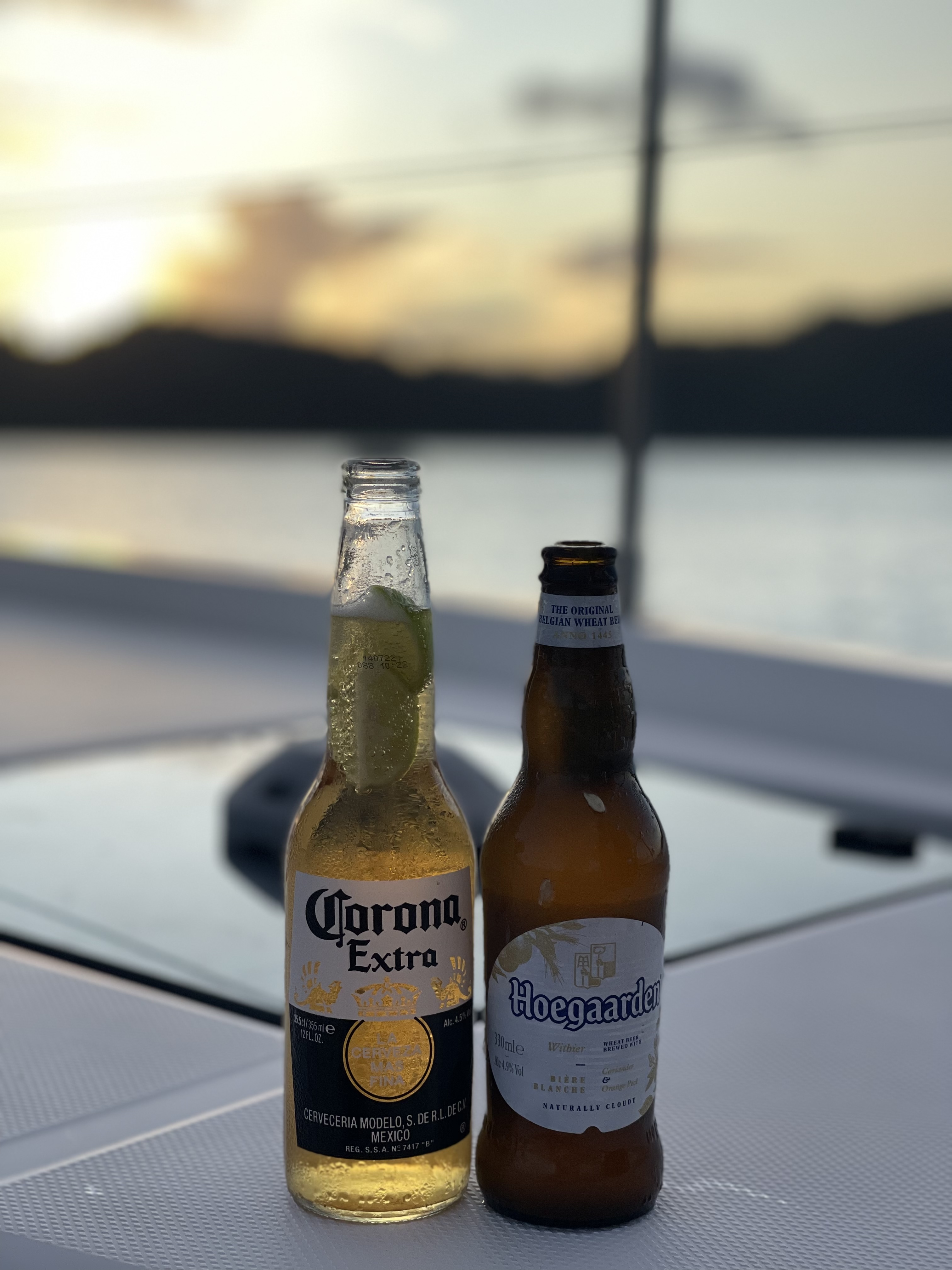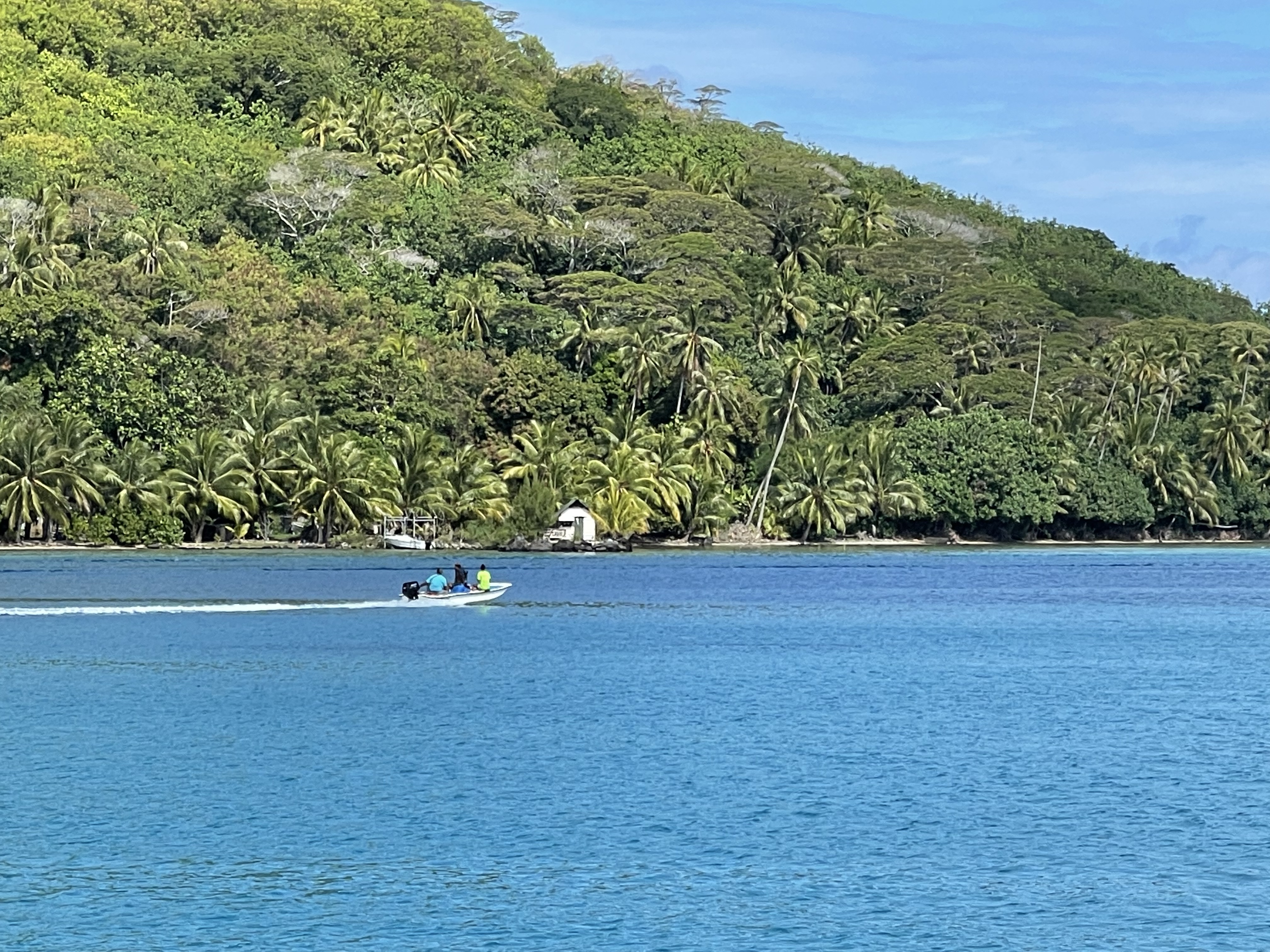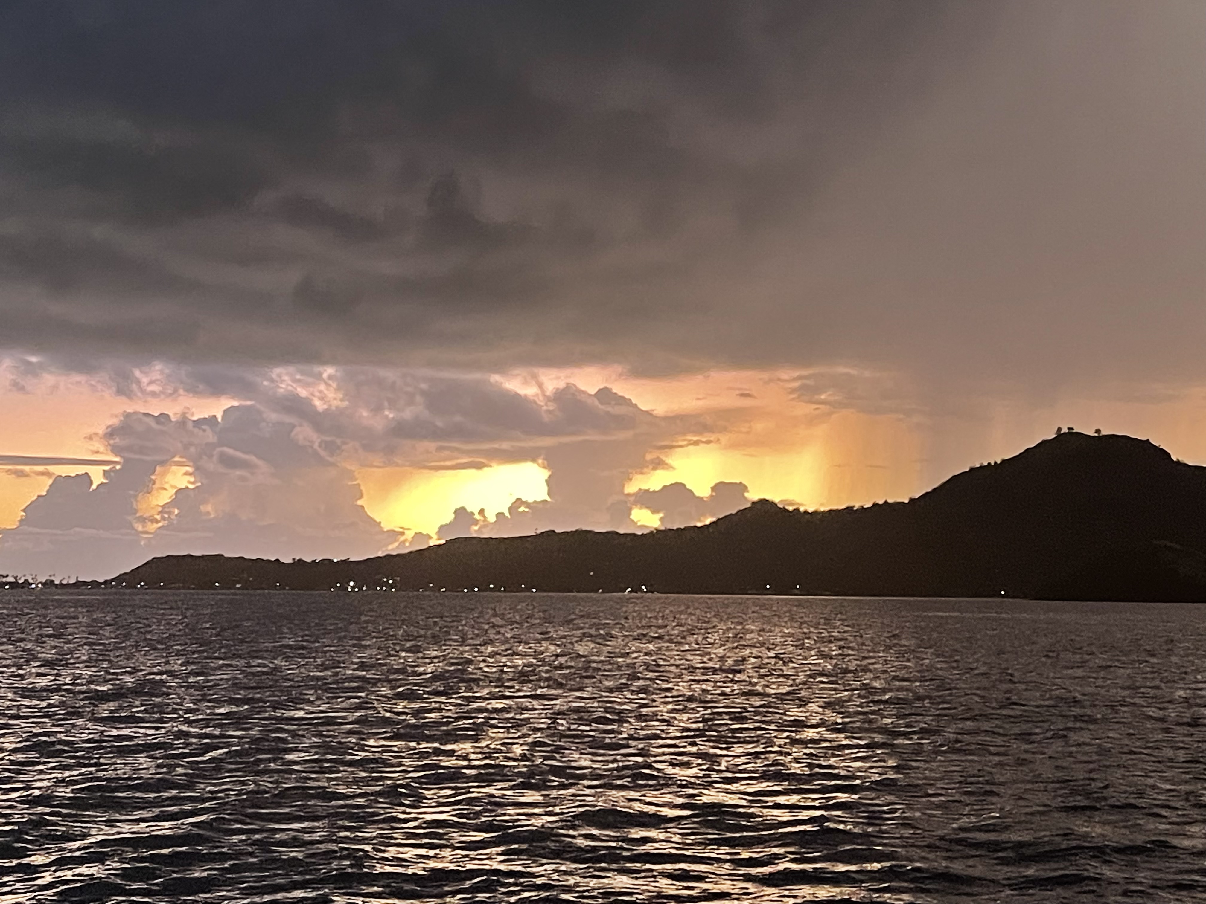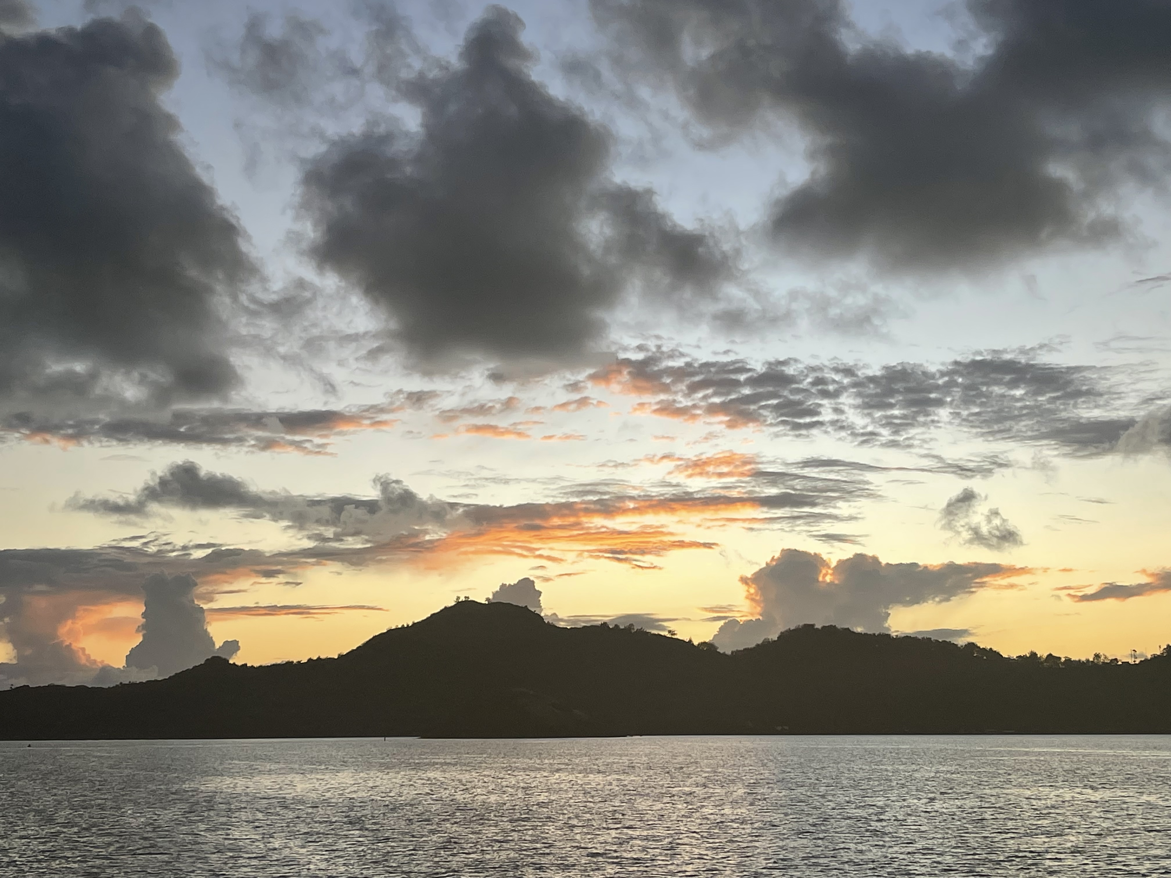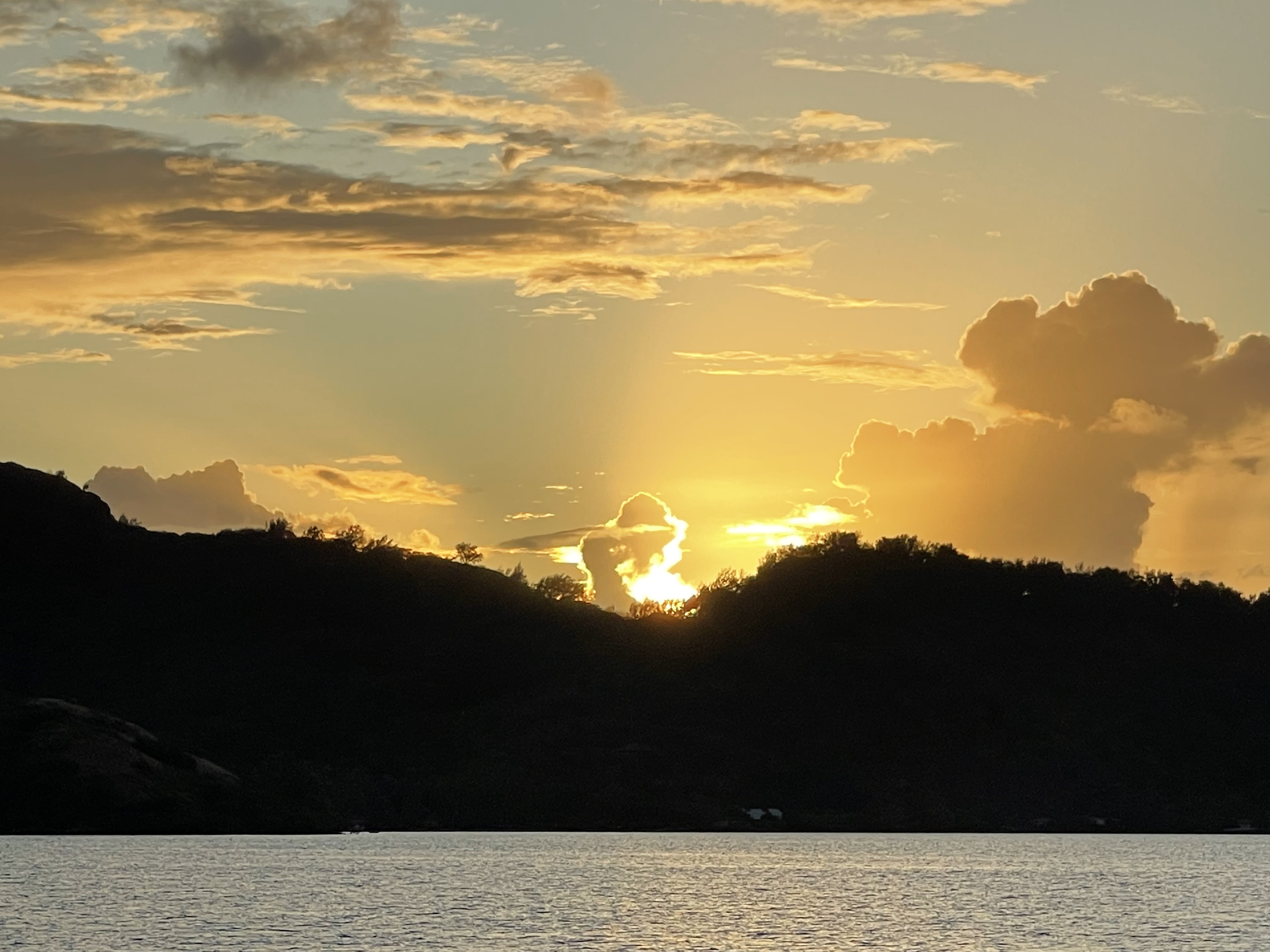 Tandis que nous étions à la messe, Giorgi a fait quelques emplettes. Ce midi, il nous régale avec du thon cru au lait de coco et des bananes plantains. Ensuite, nous traversons le lagon en direction de la côte sud de l’île. Nous nous amarrons à la bouée juste à temps pour une dernière baignade avant de prendre un apéro en regardant le coucher de soleil.