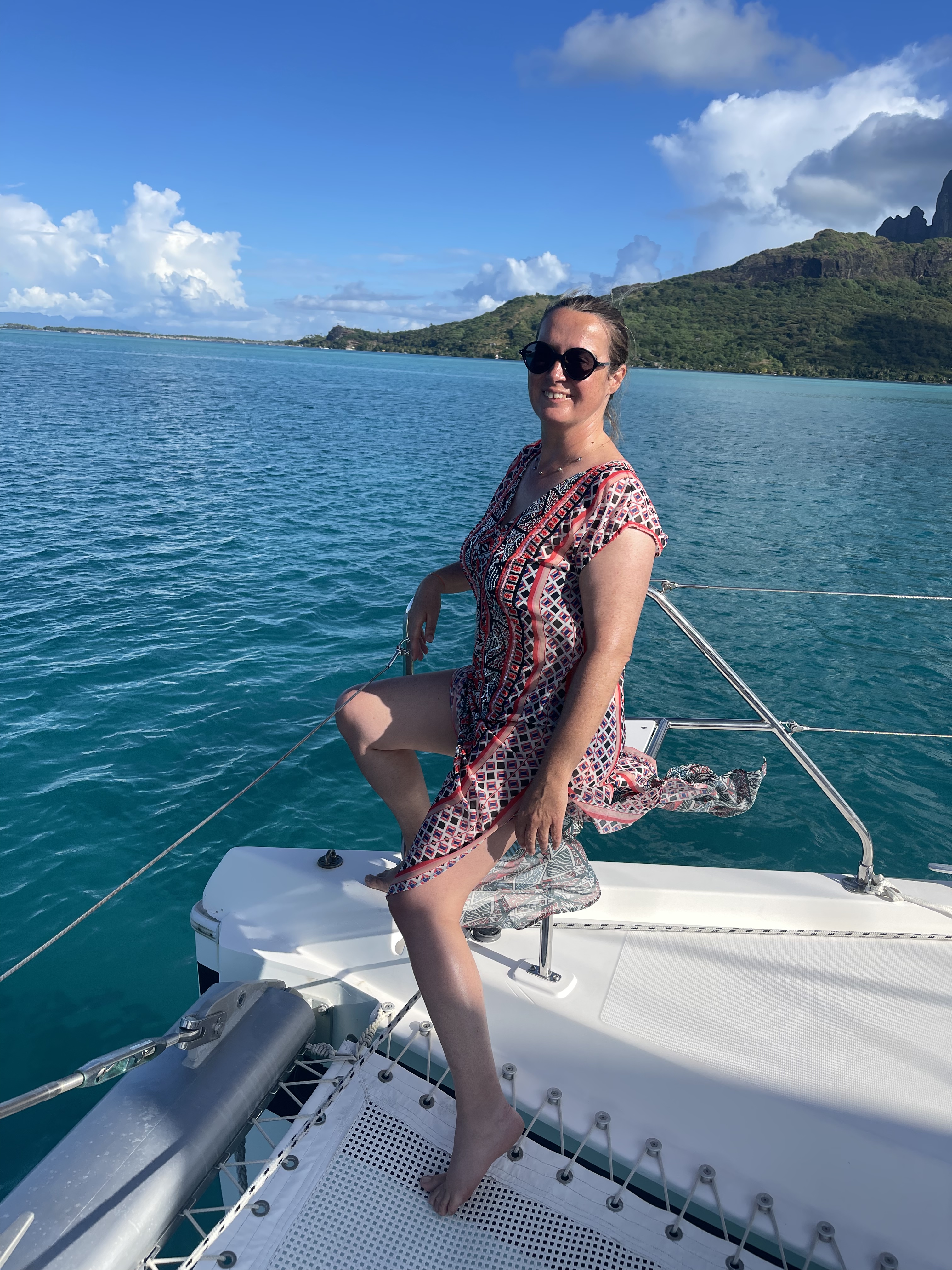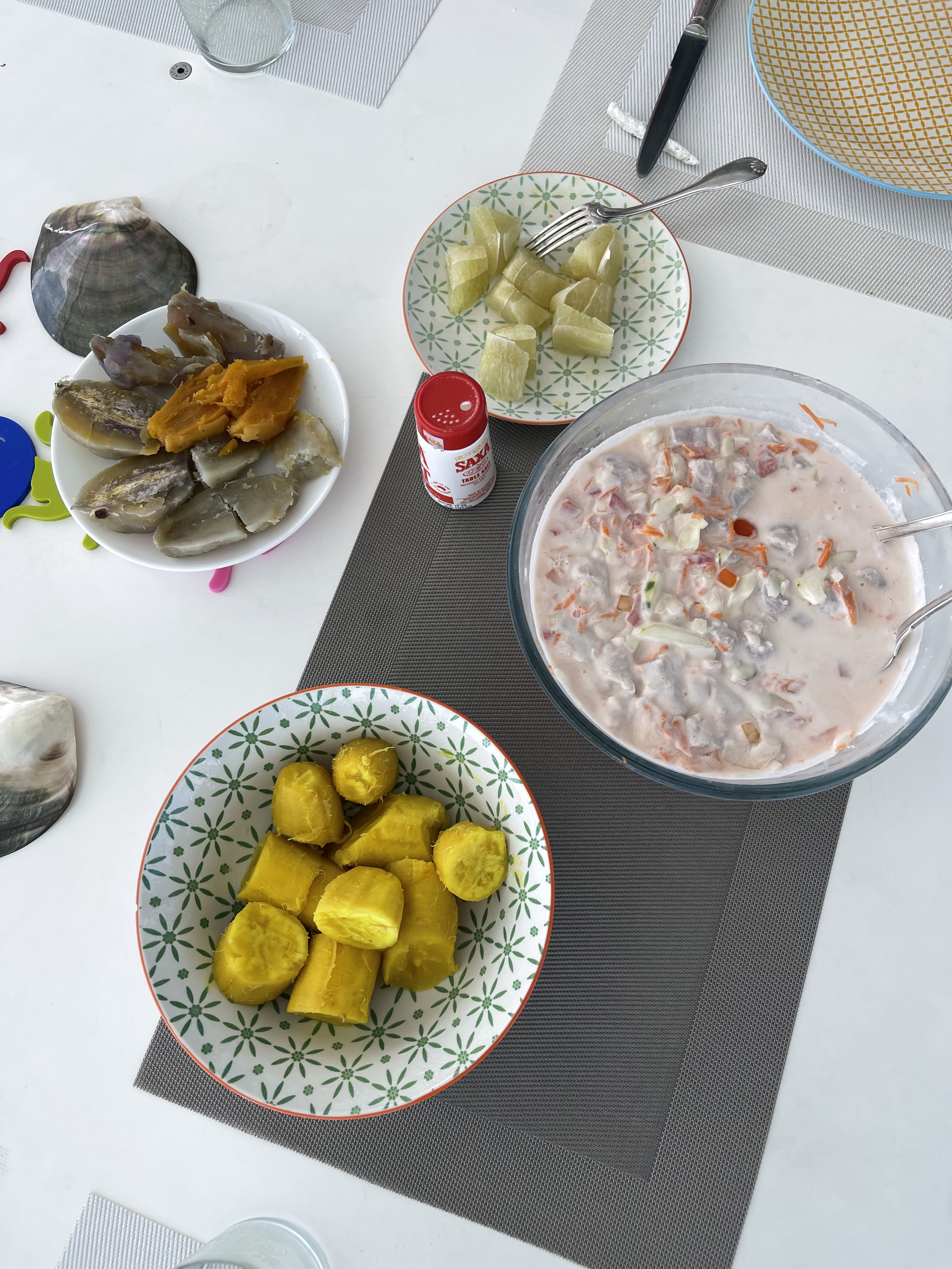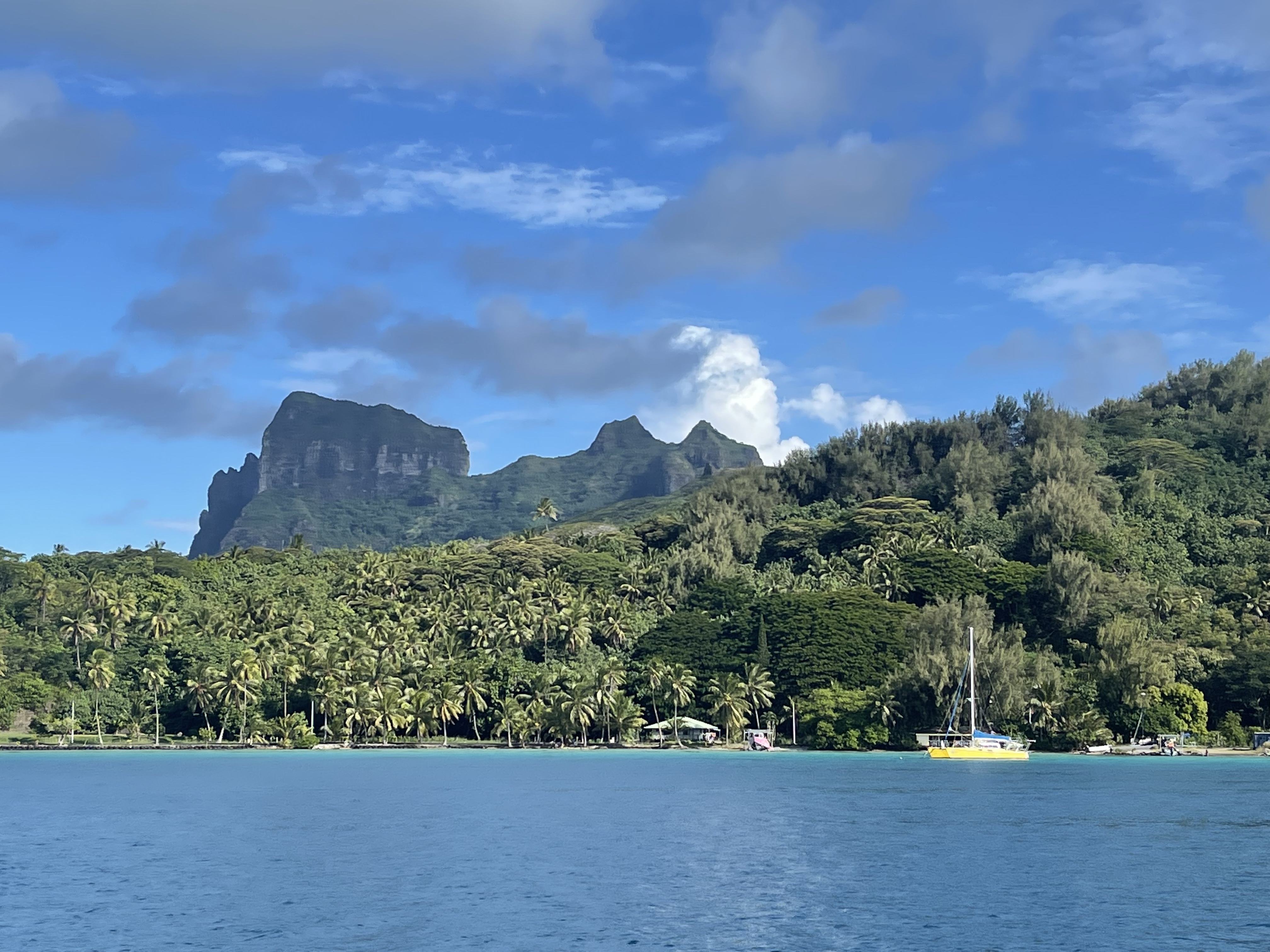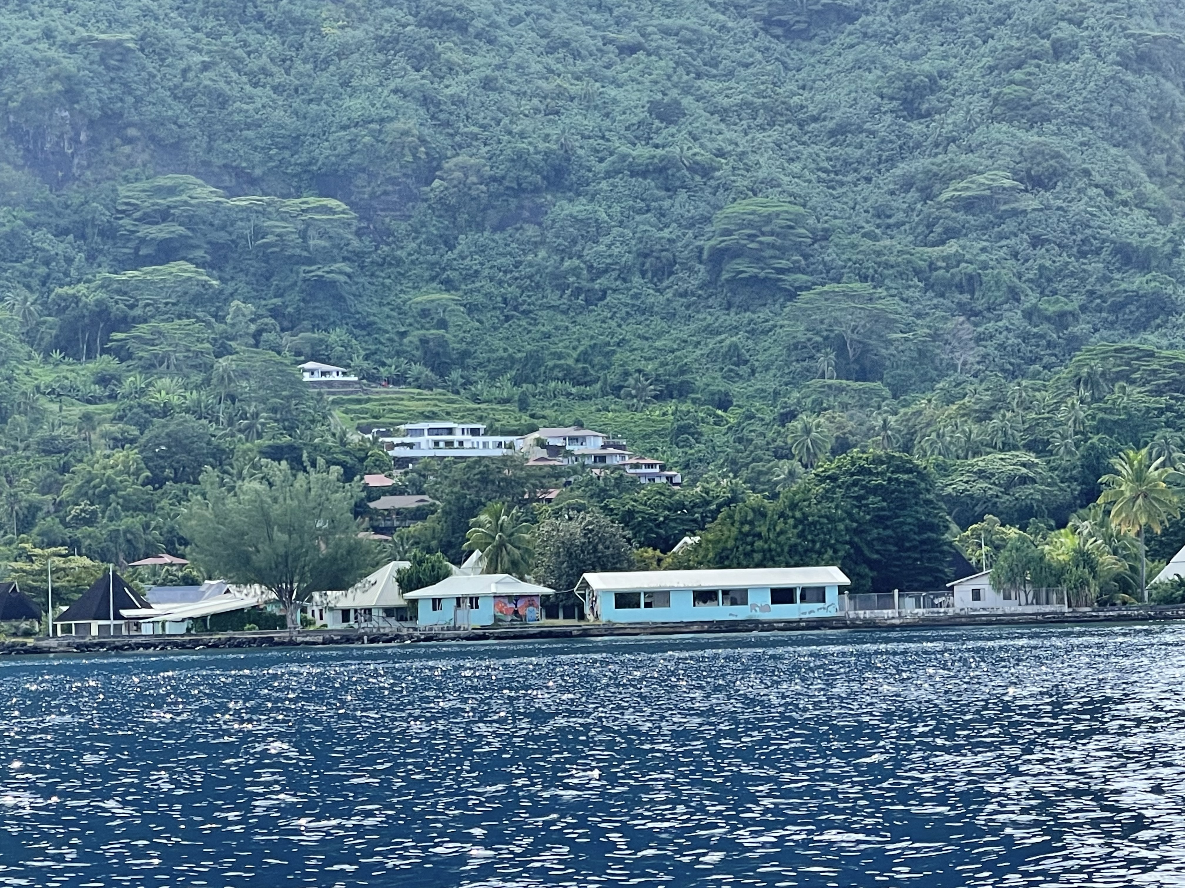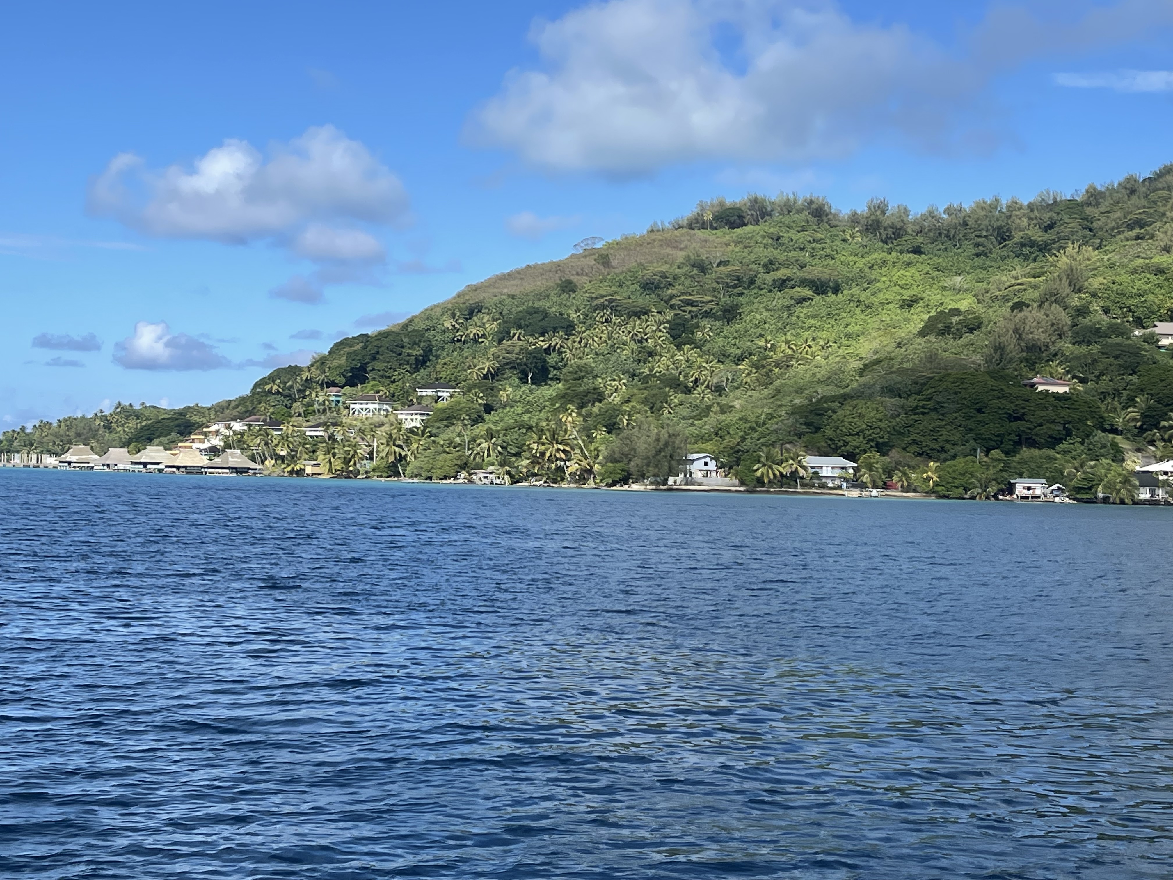 Tandis que nous étions à la messe, Giorgi a fait quelques emplettes. Ce midi, il nous régale avec du thon cru au lait de coco et des bananes plantains. Ensuite, nous traversons le lagon en direction de la côte sud de l’île. Nous nous amarrons à la bouée juste à temps pour une dernière baignade avant de prendre un apéro en regardant le coucher de soleil.