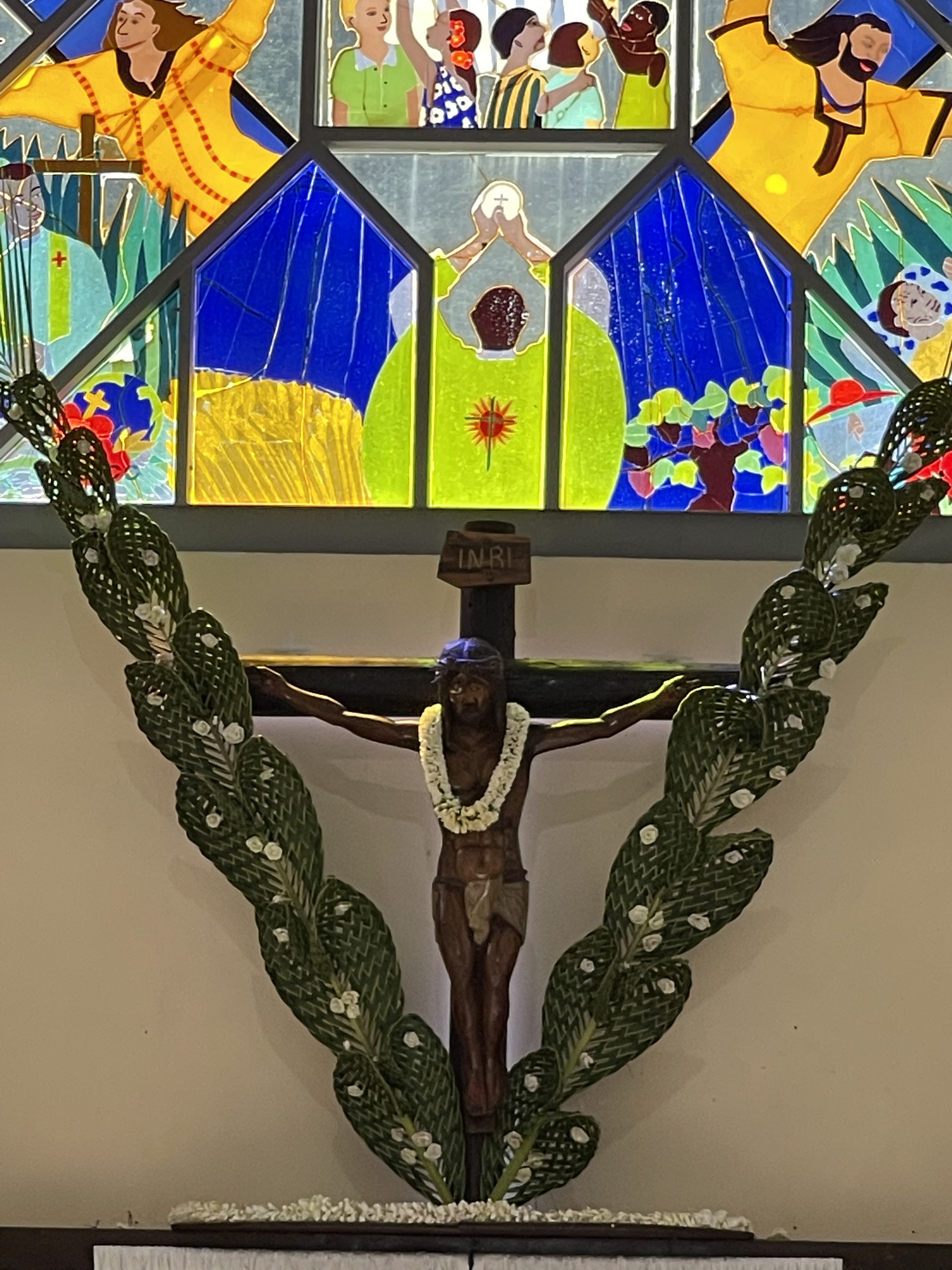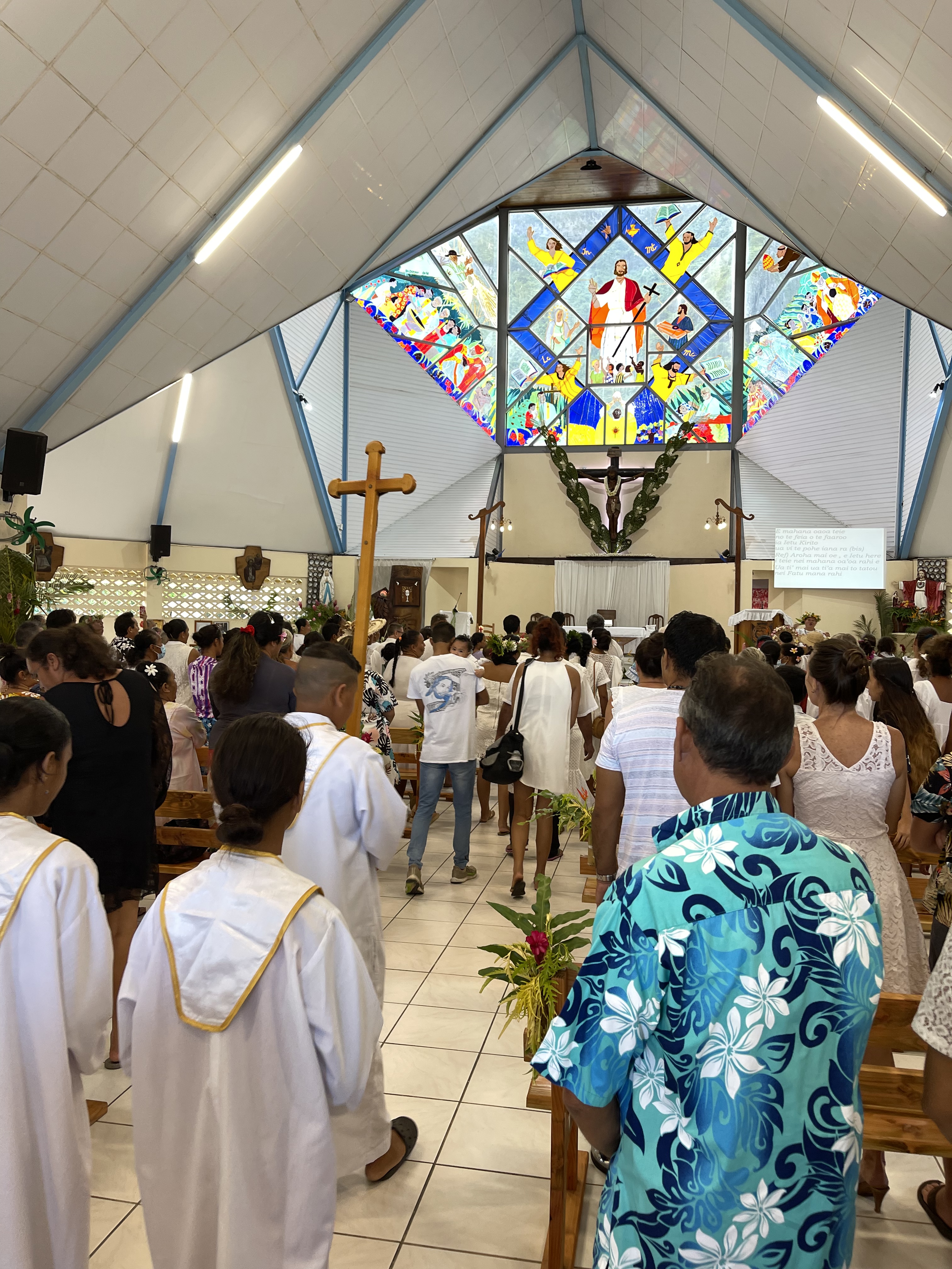 Ces derniers jours, Giorgi et Françoise nous ont parlé des messes colorées et vivantes de Polynésie. Aussi, après un solide petit-déjeuner, nous décidons d’aller à la messe en ce jour de Pâques.