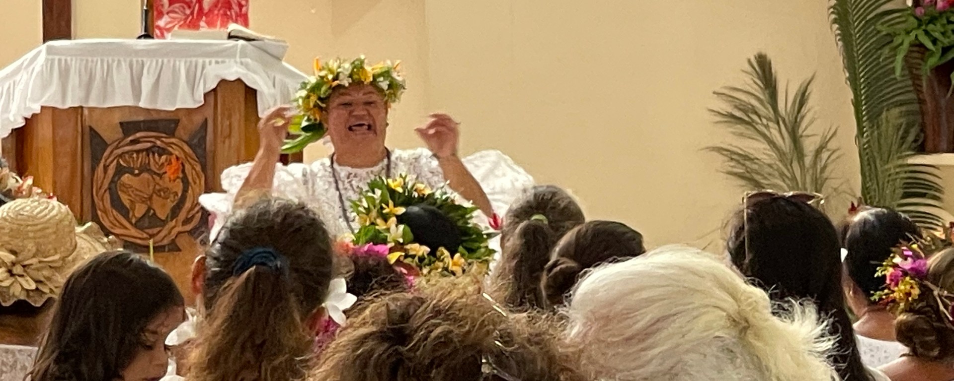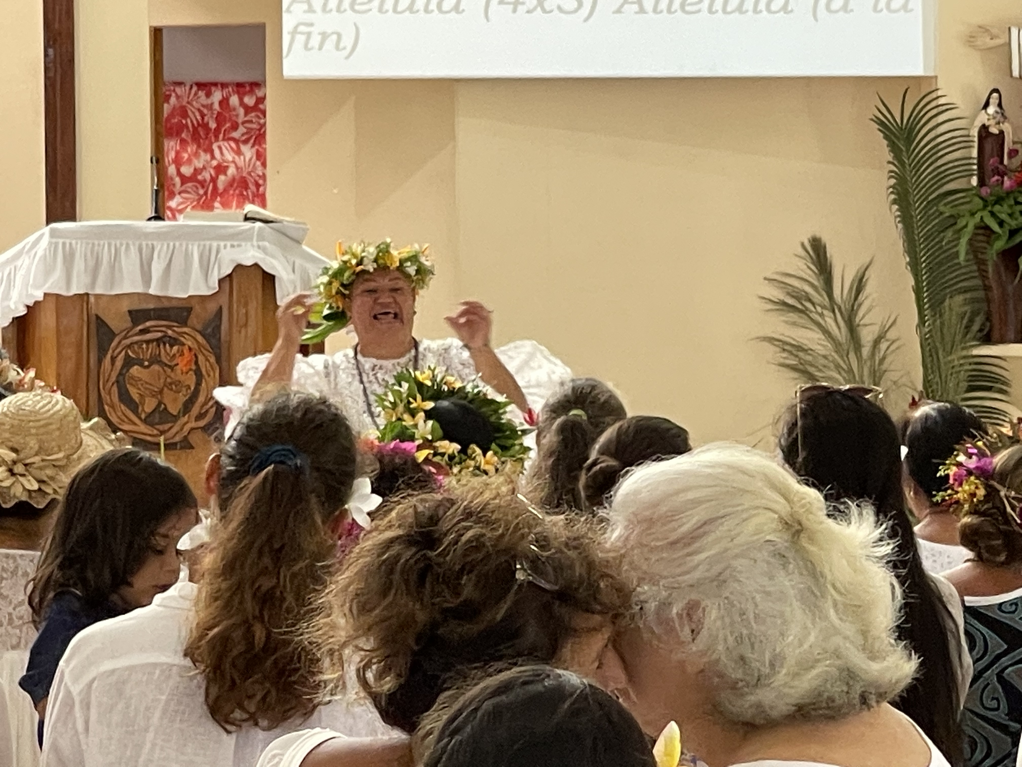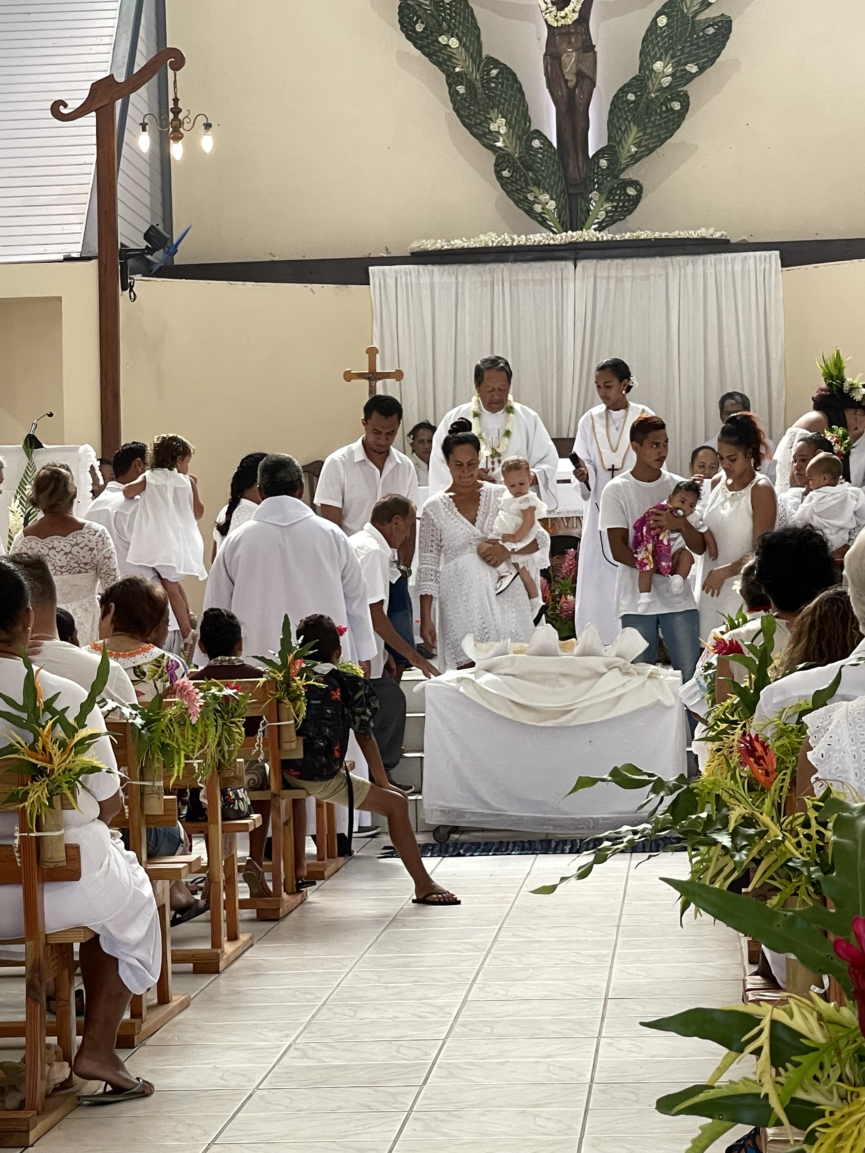 Au son de la conque et des chants polynésiens, le prêtre paré d’un collier de fleurs blanches et accompagné de 12 diacres et enfants de coeur, fait son entrée dans l’église. Ils sont suivis de Marie, Thérèse, Pascal, Martin et de leurs familles respectives. Pas de mariage donc, mais bien 4 baptêmes!