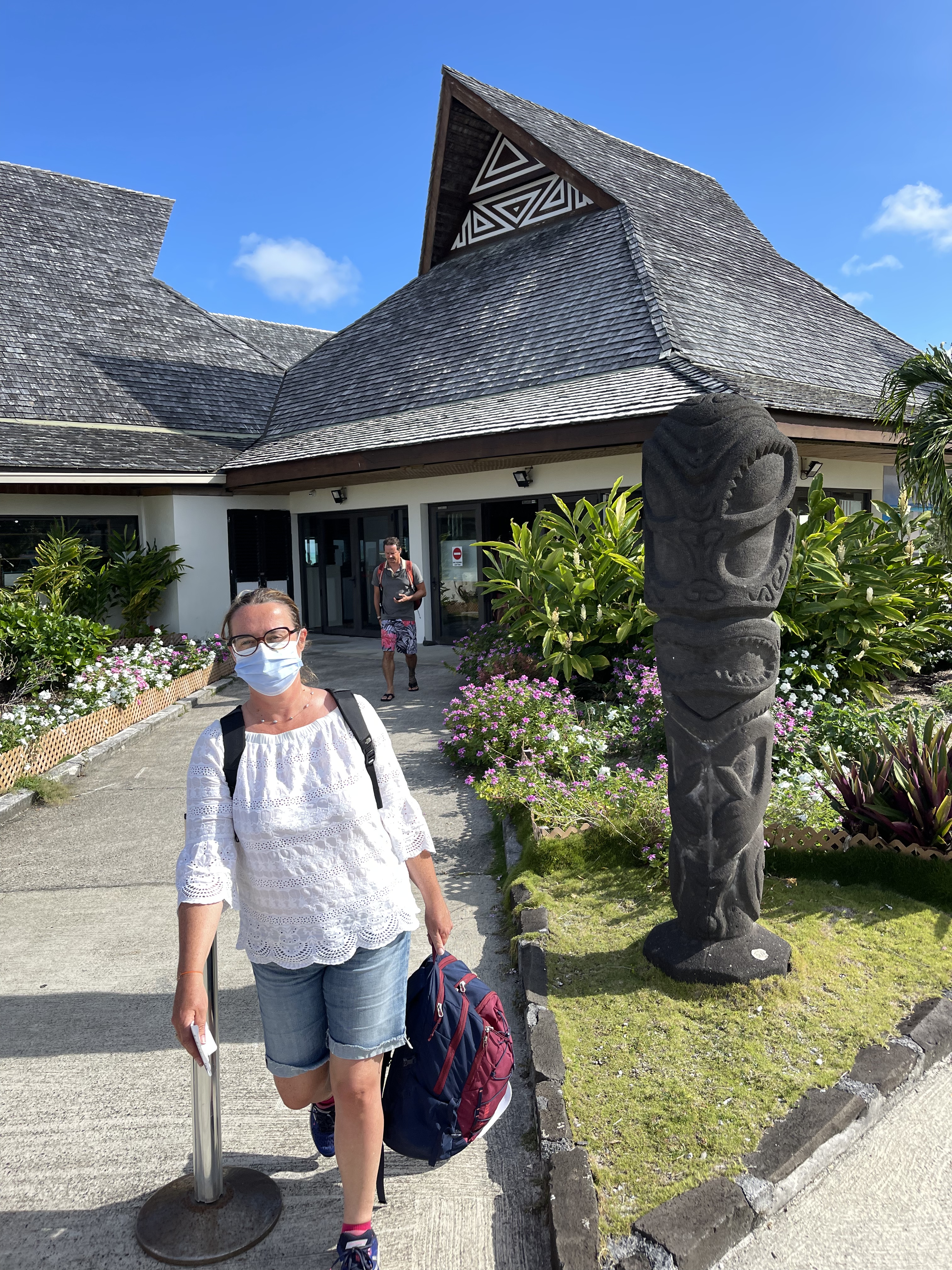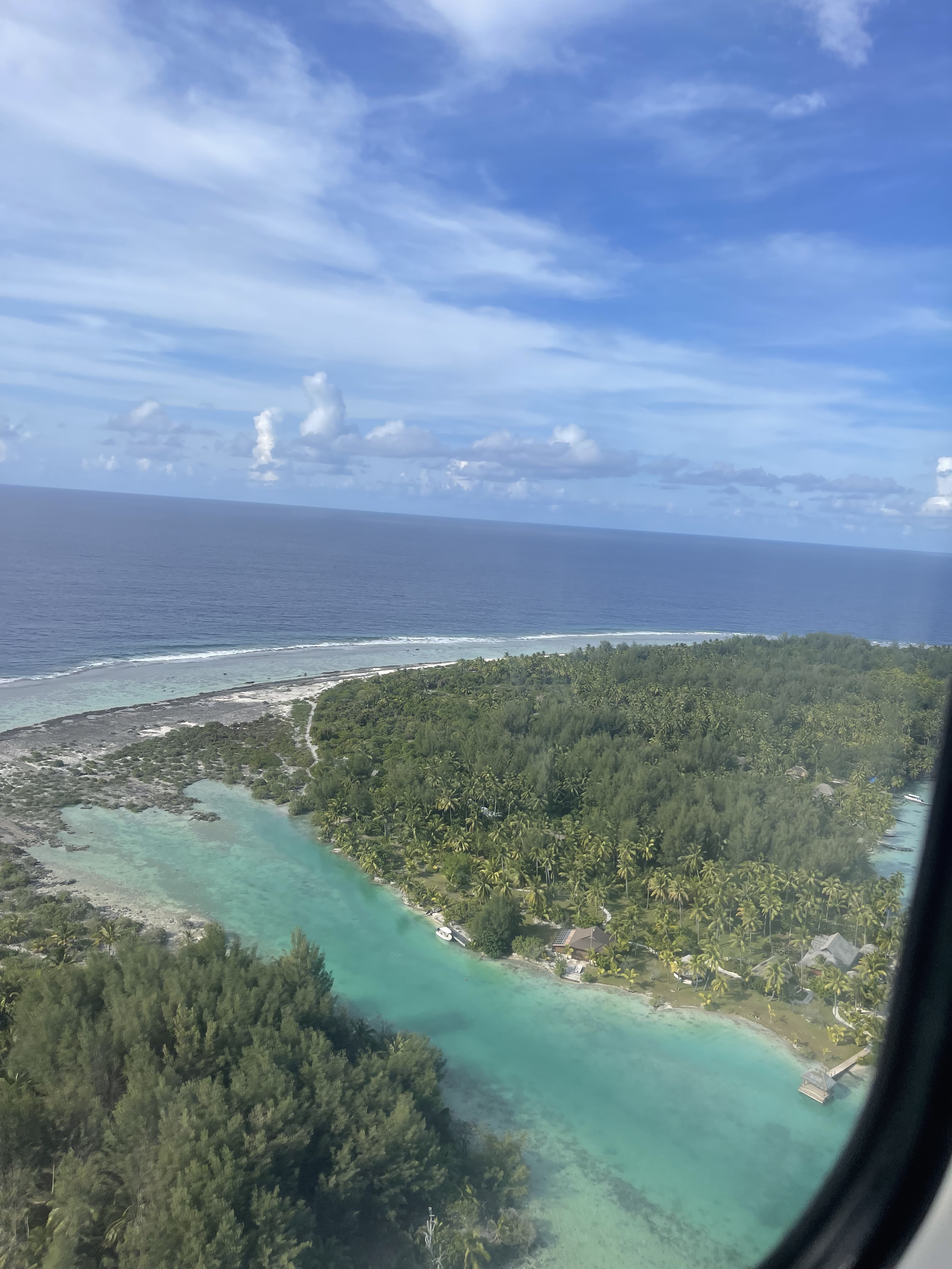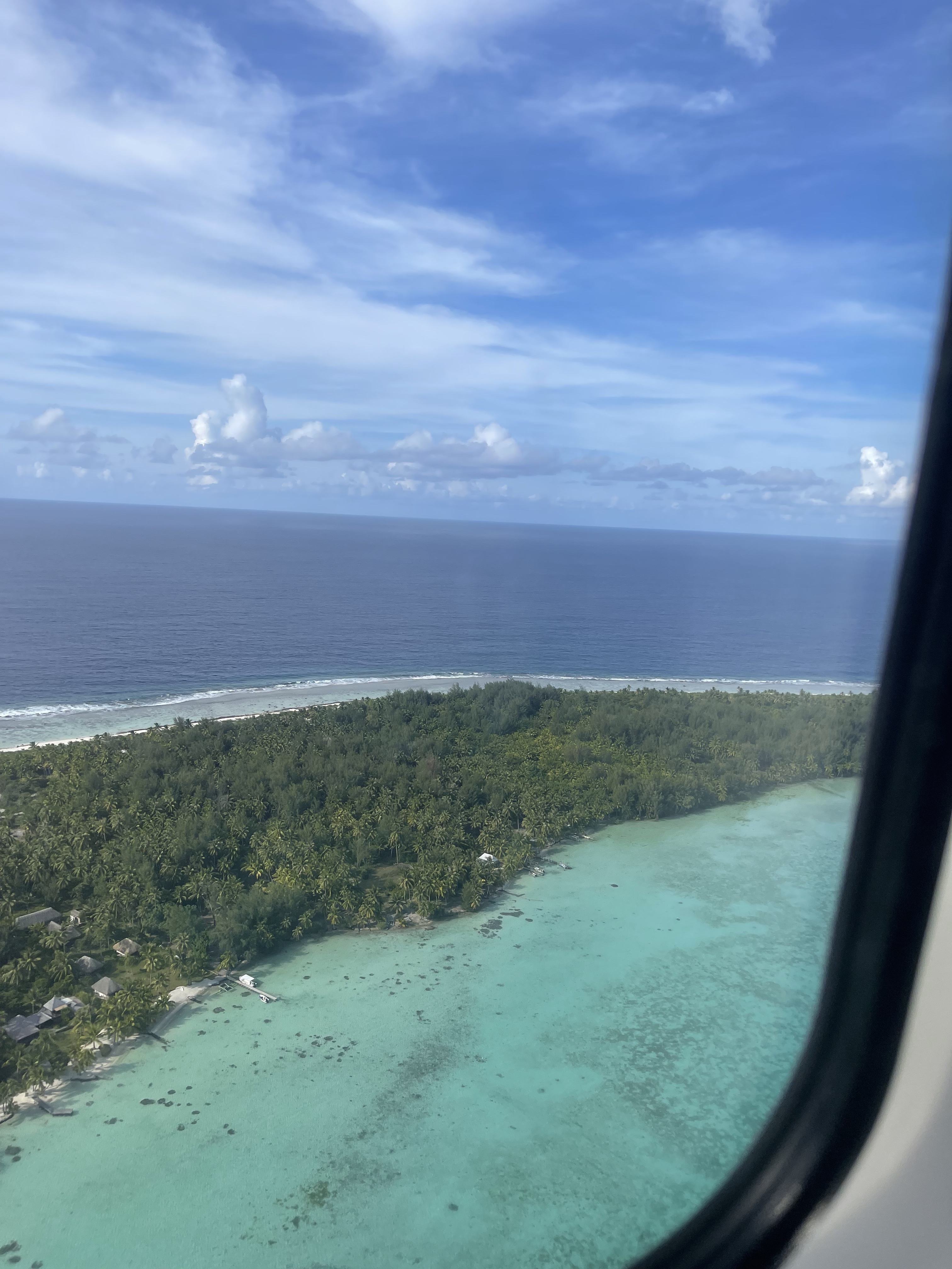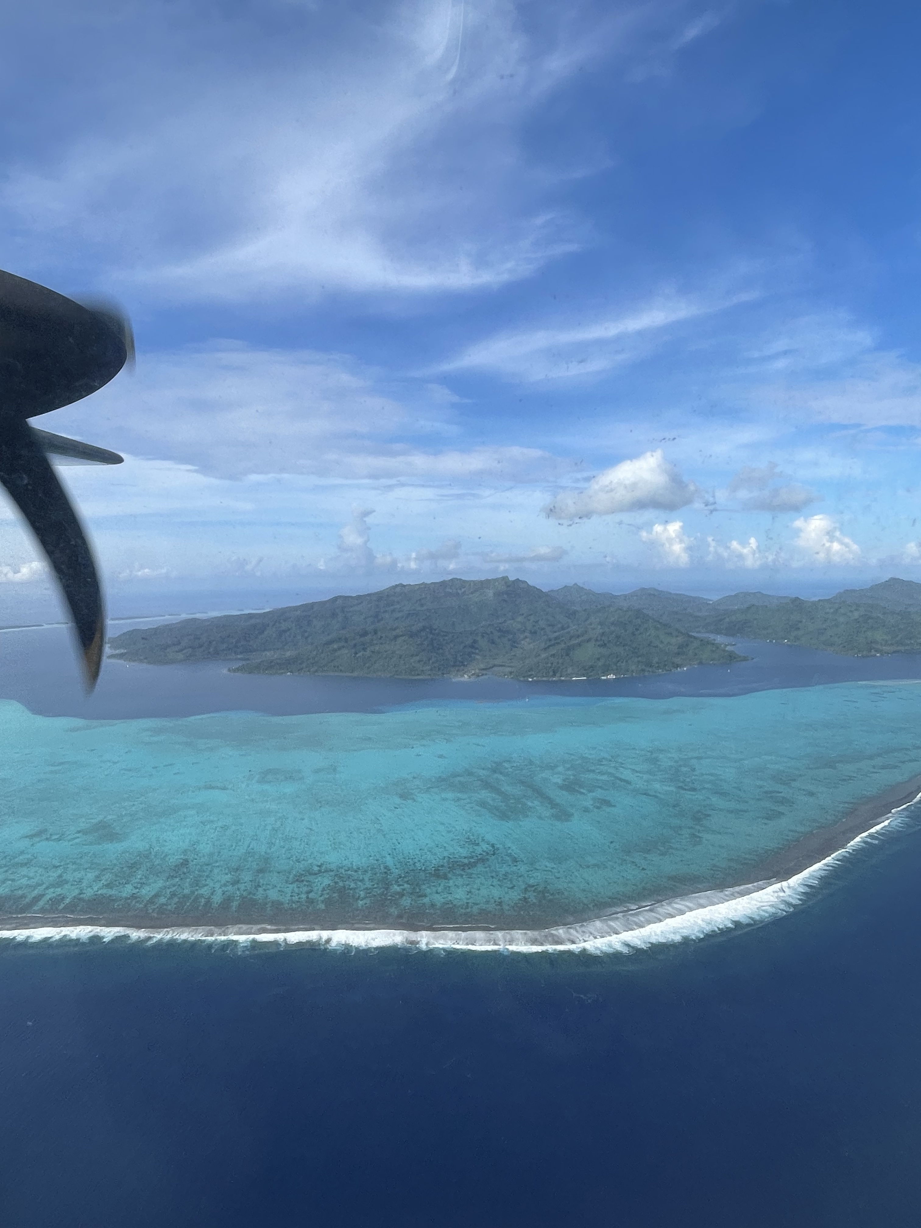 A notre arrivée tout est fermé. Le vol ne part que dans deux heures, nous sommes arrivés bien trop tôt… Finalement l’heure de l’embarquement arrive; à bord, on nous annonce un temps de vol de…. 10 minutes 😳!!!! Juste le temps de faire quelques photos du lagon de Bora depuis le ciel, et ça y est, nous prenons déjà des photos du lagon de Raiatea. Atterrissage au bord de l’eau, ensuite direction le comptoir de location de voiture 🚙. Personne; personne ne vient 😏. L’e-mail où nous confirmions la location ne semble pas être arrivé à l’agence mais très pro, ils nous trouvent tout de même un véhicule.
