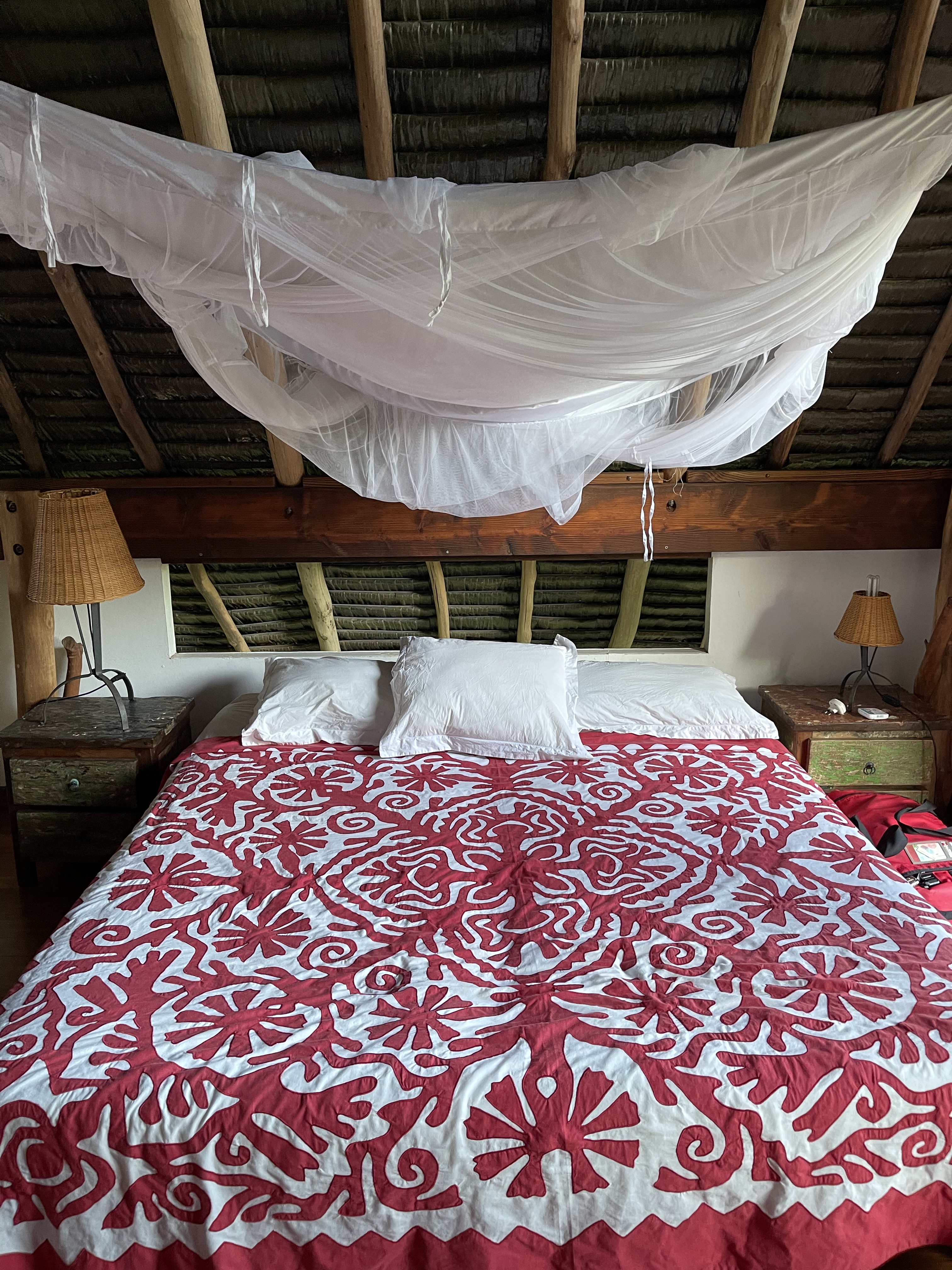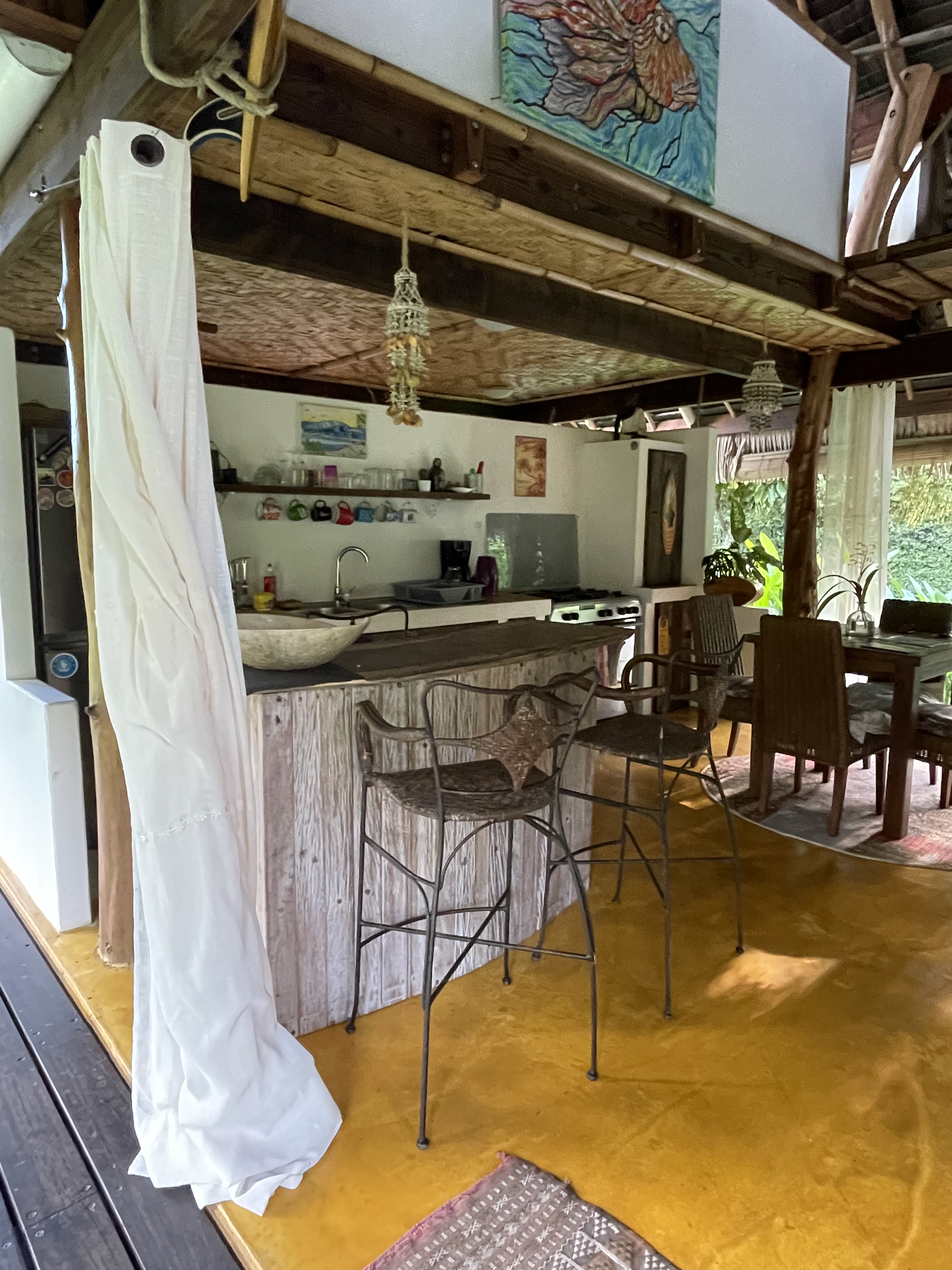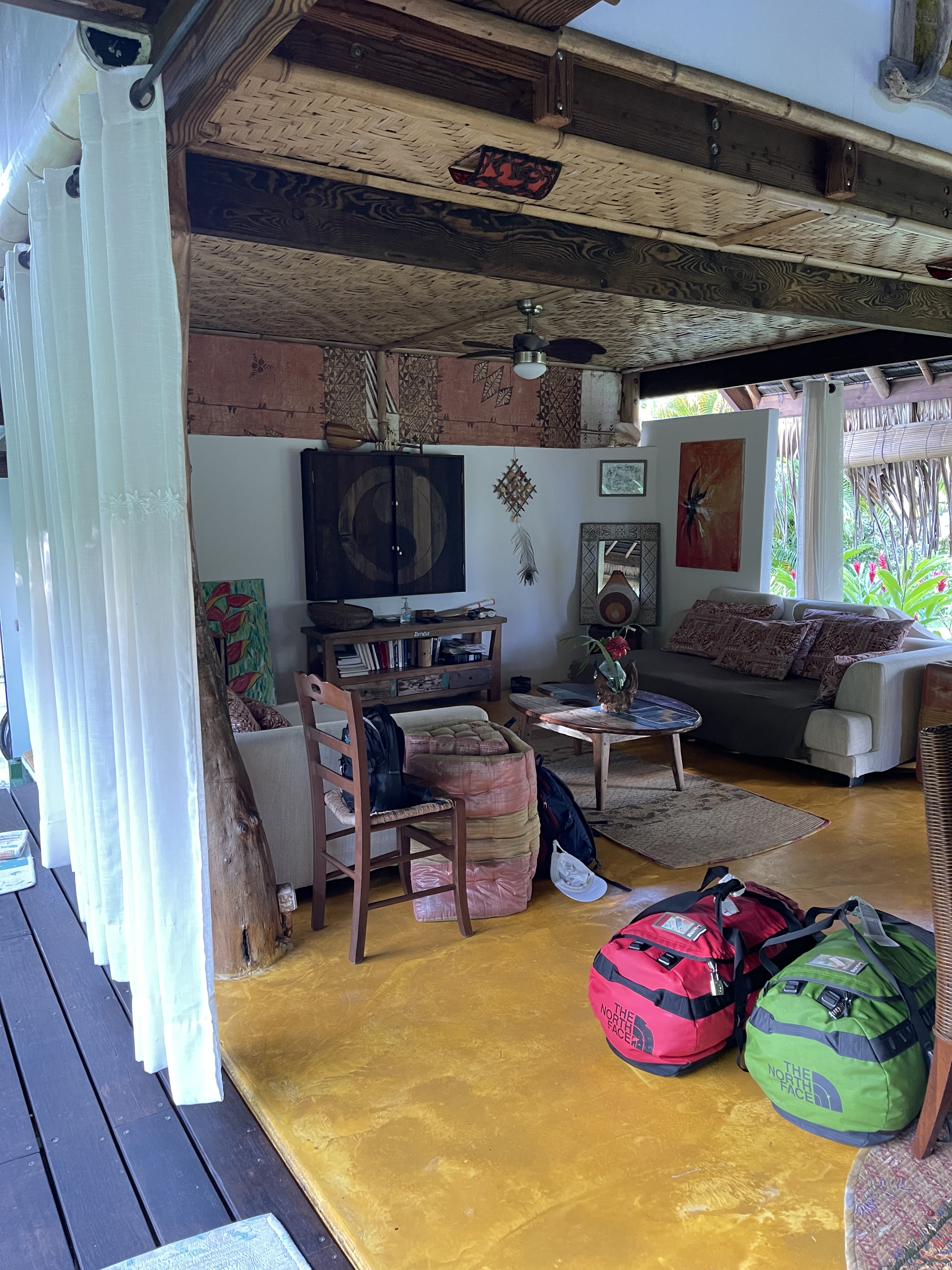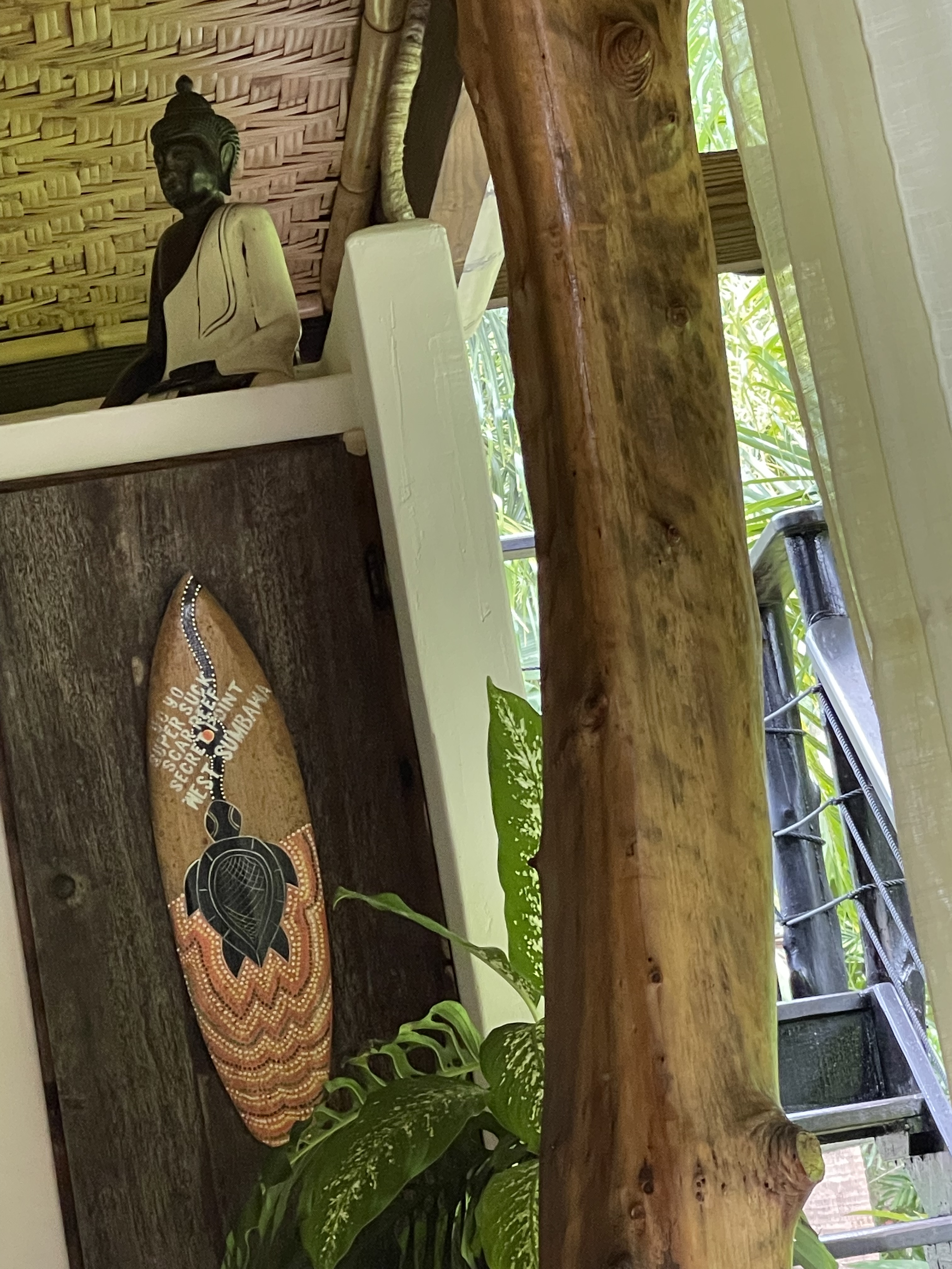 « Island Home » nous attend à Miri Miri posée dans son écrin de verdure – fleurs variées, bananiers, Nous sommes sur la côte ouest de l’île – top pour le coucher du soleil. C’est la première fois que nous logerons dans une maison sans portes ni fenêtres. Incroyable sensation d’espace et de connexion avec la nature. Le gazouilli des oiseaux, les lézards sur les murs, le chant des coqs avoisinants, mais aussi le bzzz bzzz des moustiques (moins sympathique car comme toujours ils m’aiment beaucoup mais dommage pour eux ma recette de répulsif à base d’huiles essentielles est à présent au point).