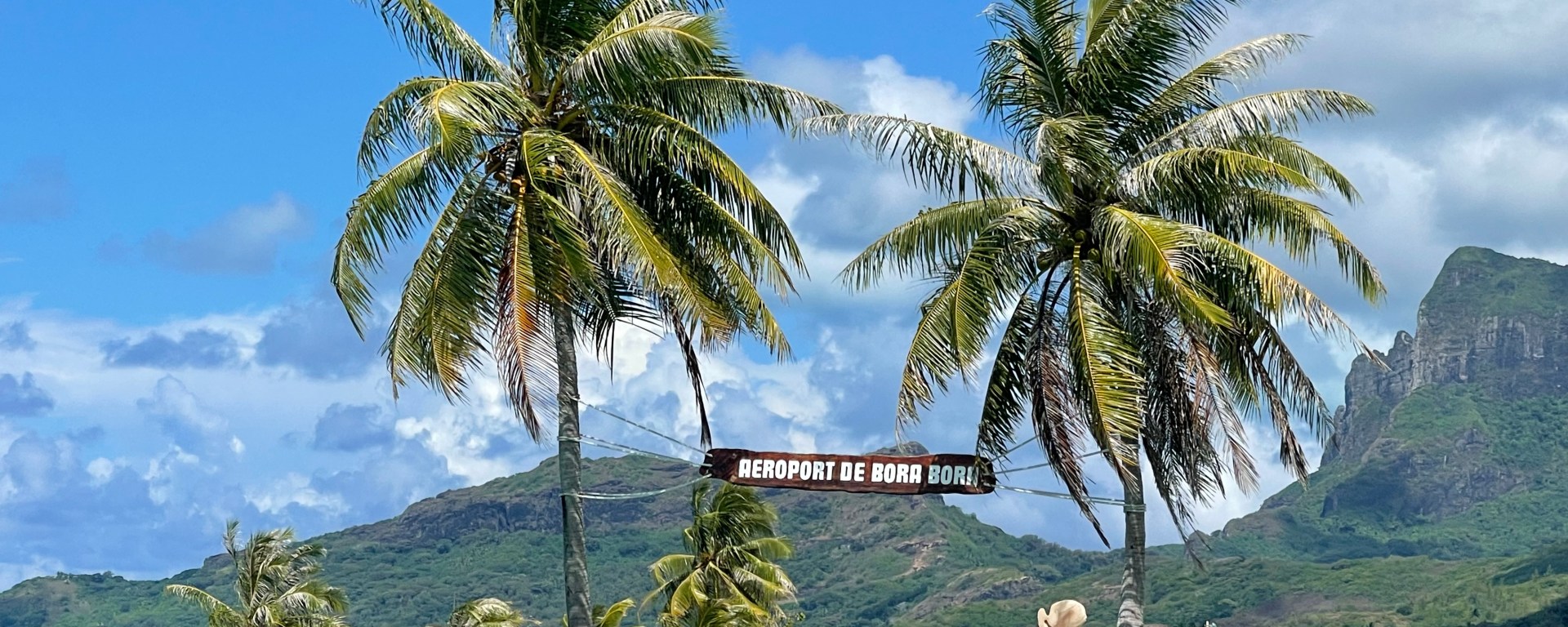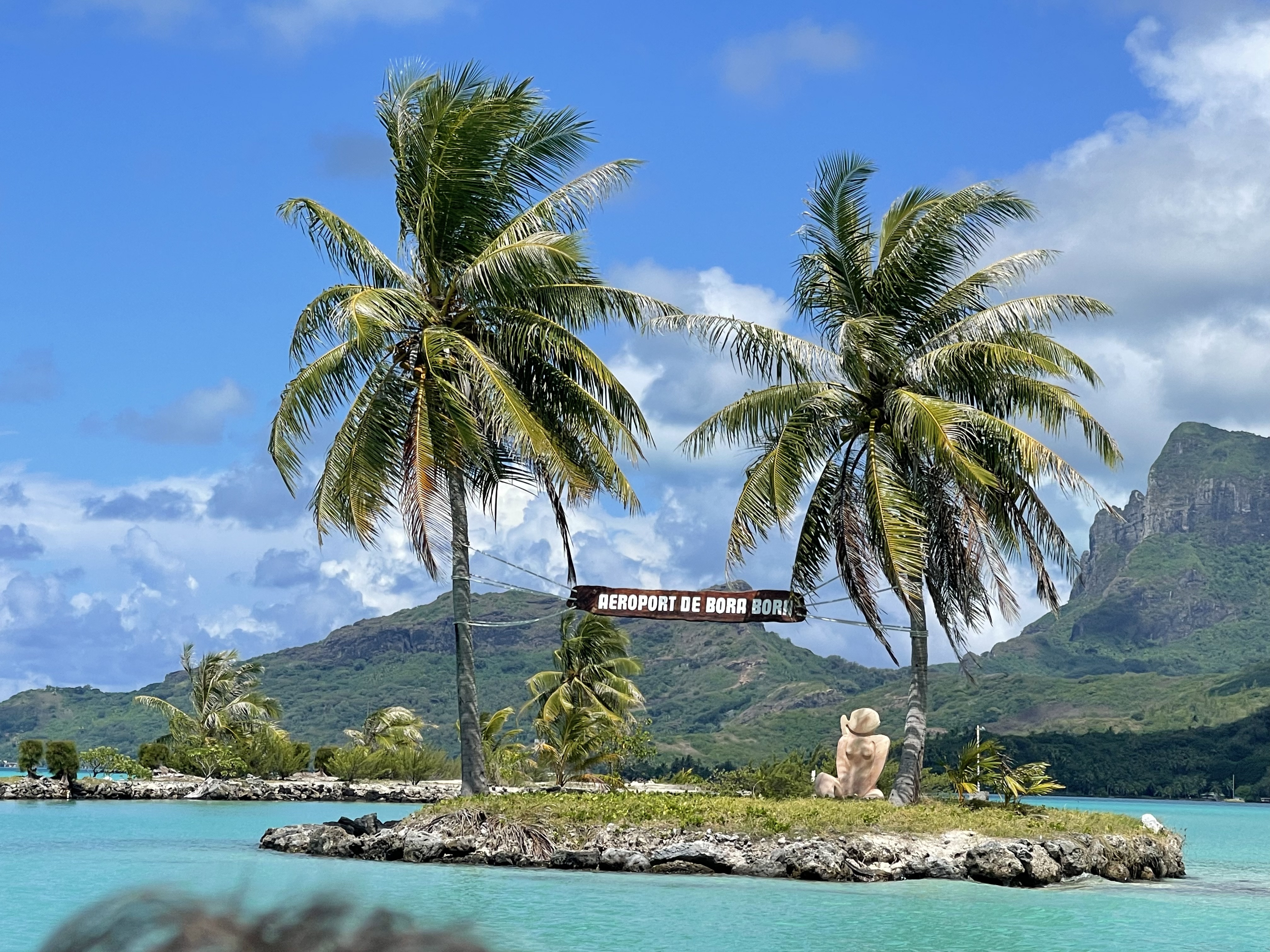 Un dernier déjeuner et il est déjà l’heure de se quitter. On charge les sacs dans le zodiac et hop, direction l’aéroport. Si nous avions déjà pris le bateau pour quitter l’aéroport de Venise, c’est la première fois qu’un bateau nous dépose sur le ponton de l’aéroport… L’aéroport de Bora Bora étant situé sur un motu, il n’est accessible que par la mer.