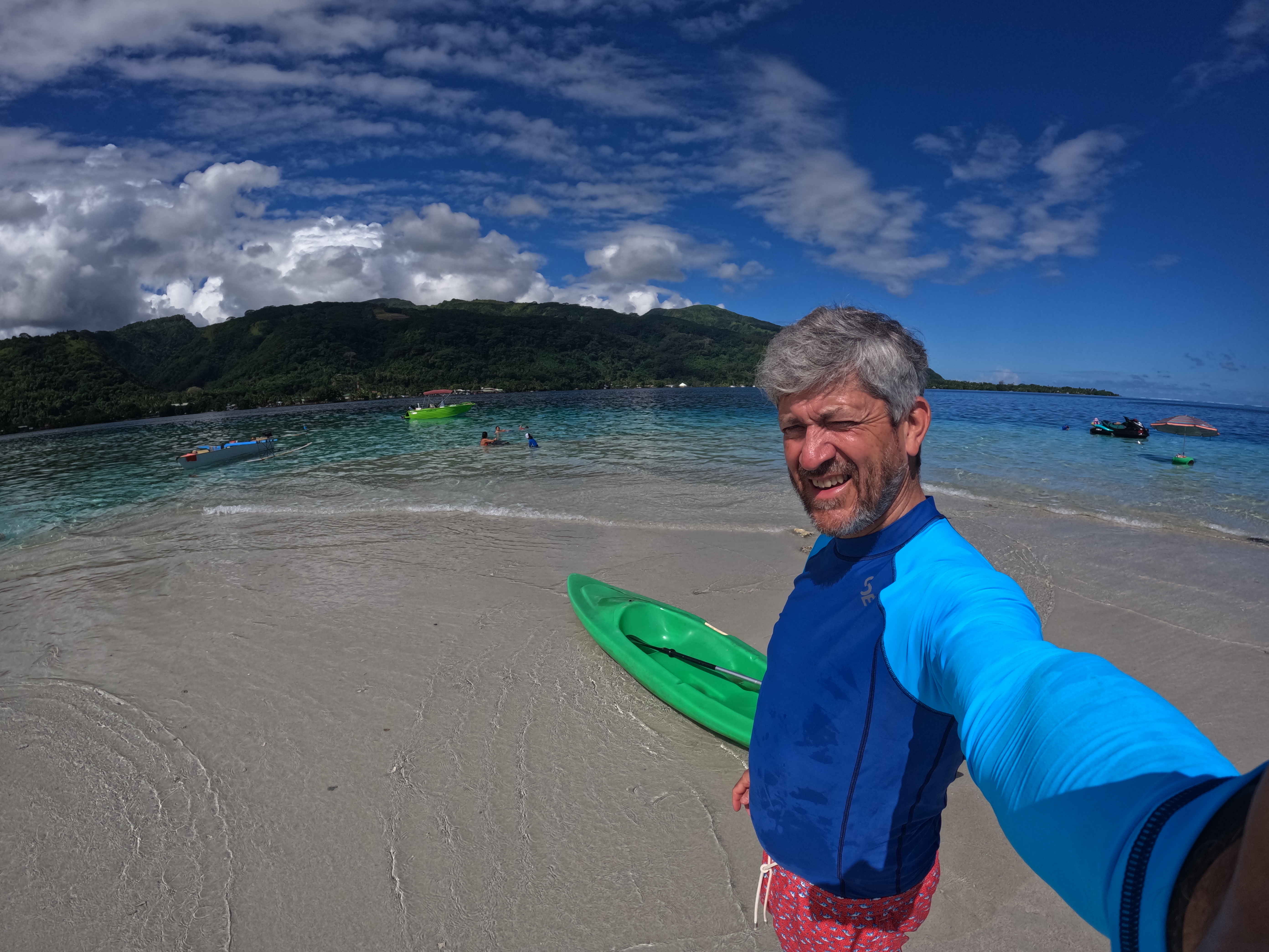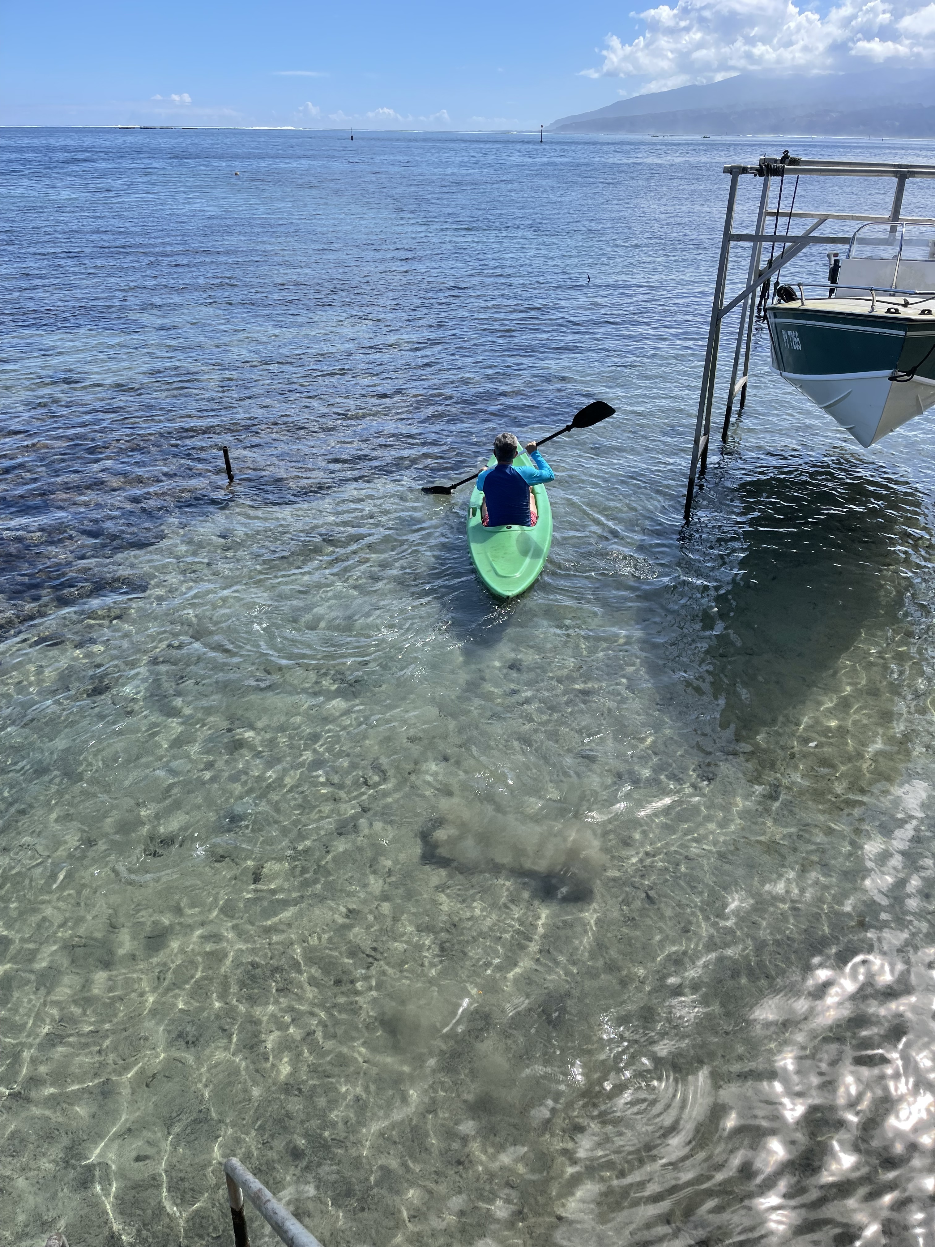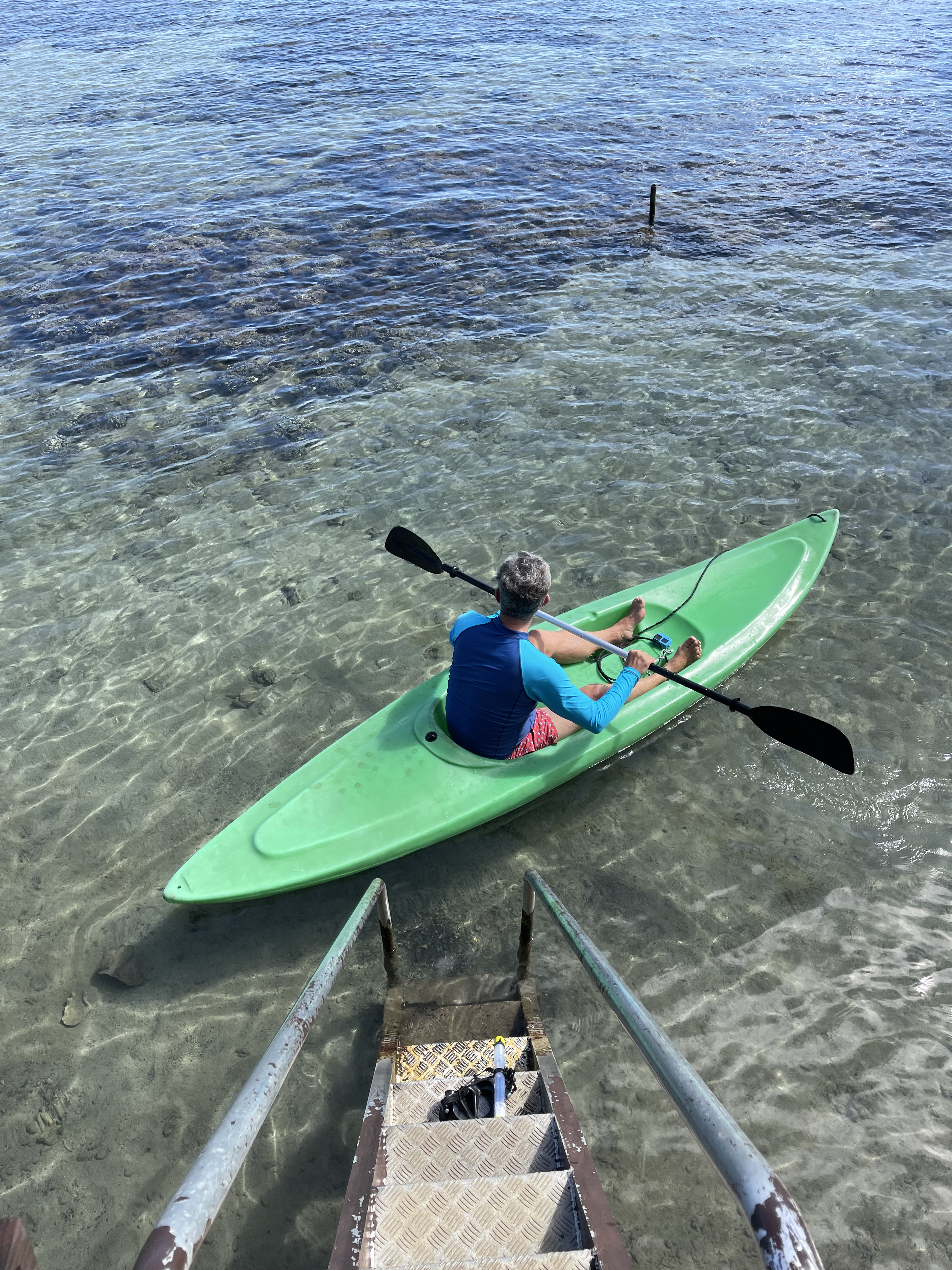 Ensuite on ira faire quelques courses et après un repas léger Christian part faire du kayak jusqu’à un banc de sable et dire bonjour au frère de Georges qui travaille sur son voilier en face de chez nous.