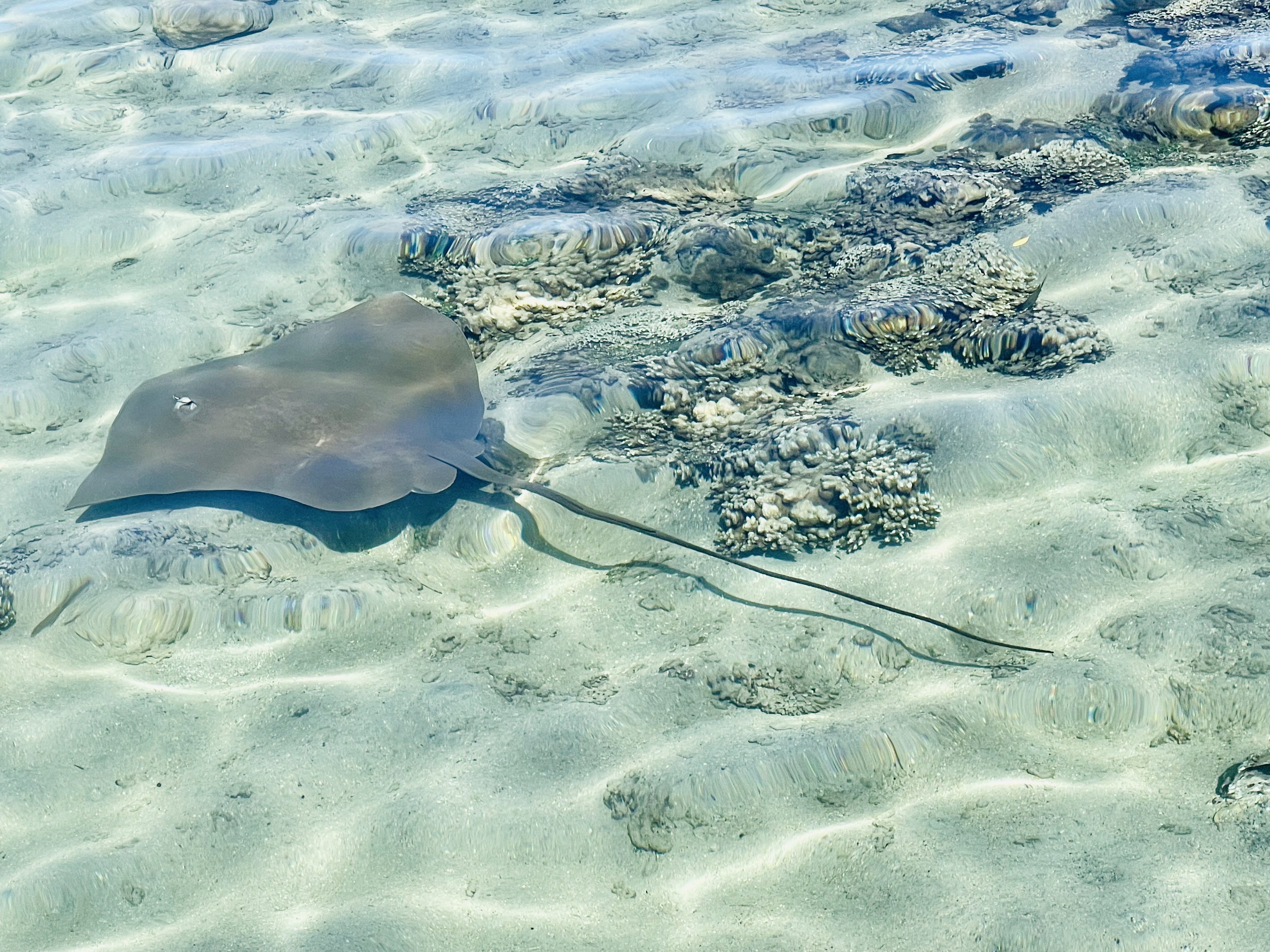 Par chance, on pourra parler aujourd’hui à Victoria, Margot et Arthur. Margot aura même la chance de voir la raie qui passe devant notre bungalow.