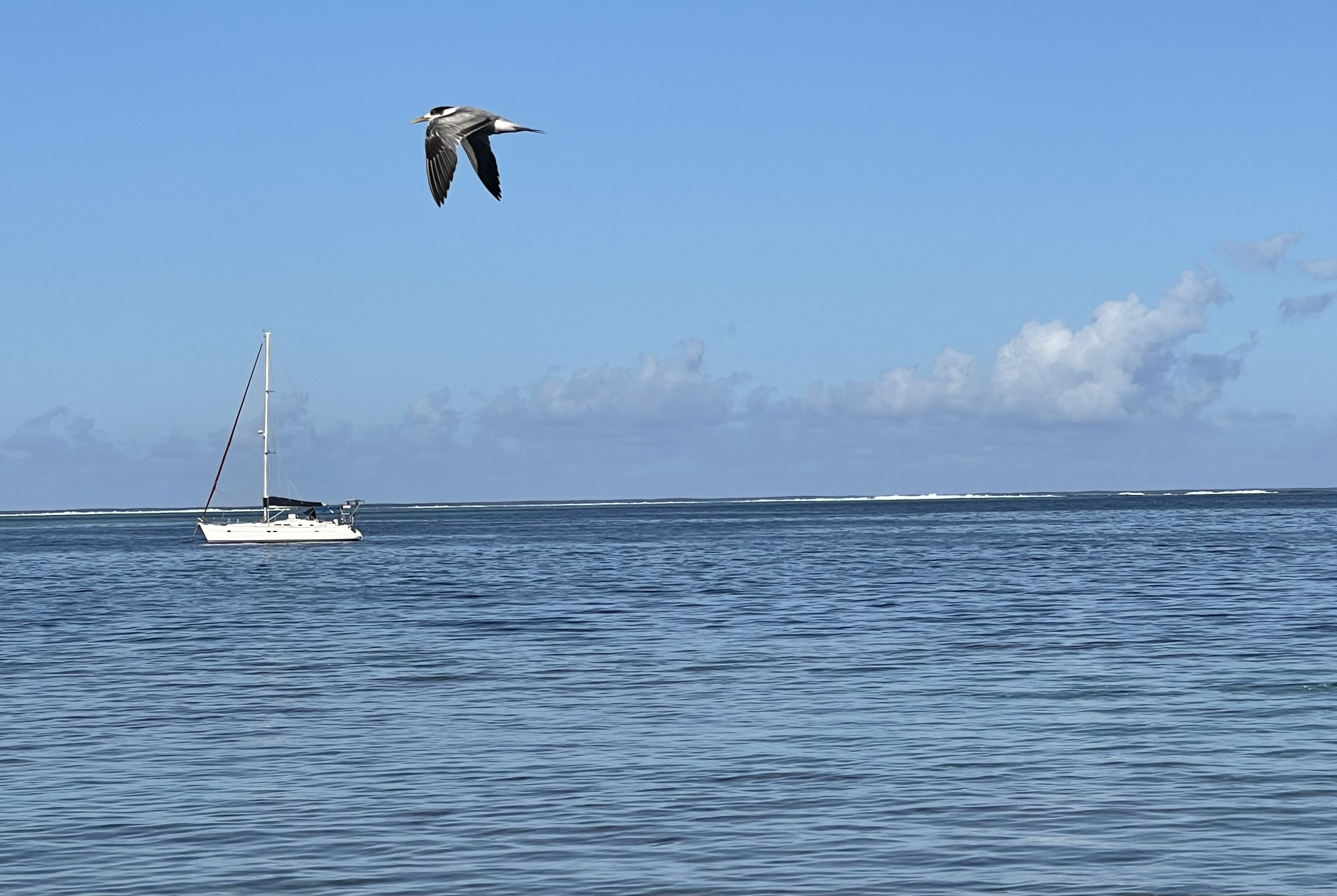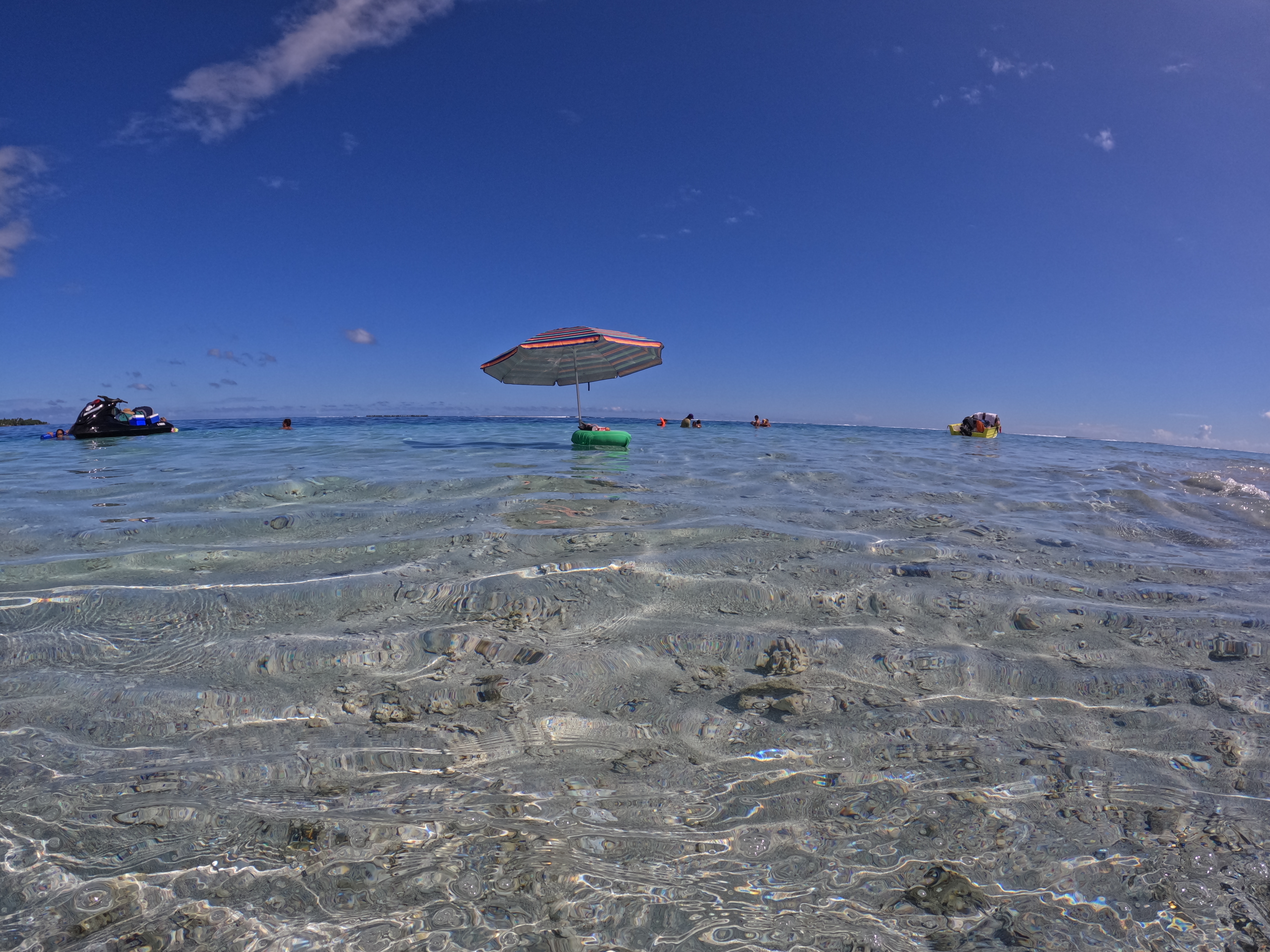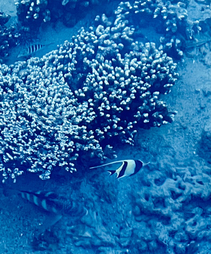 Une fois rassasiés, on jette quelques miettes dans le lagon et hop, les poissons de toutes formes et couleurs se précipitent: baliste, poisson clown, petits poissons irisés ressemblant à des sardines,… Du coup, ca nous motive à prendre nos palmes, masques et tuba et d’aller faire un tour dans l’aquarium qui est juste devant nous. Nul besoin d’aller très loin pour voir de jolies choses. Les coraux sont en bonne santé mais attention il y a quelques oursins et des poissons pierre. Jamais pieds nus dans le lagon.