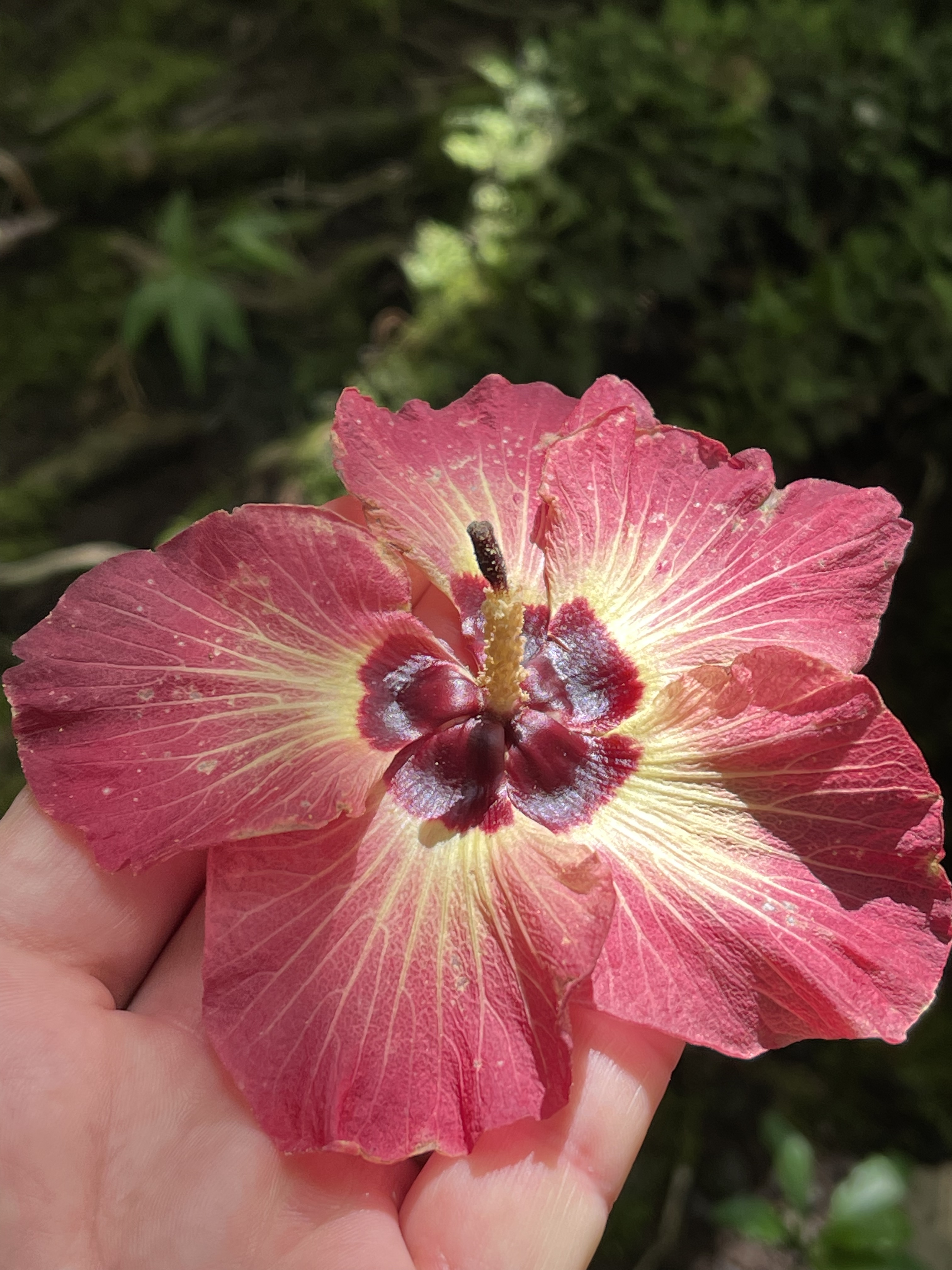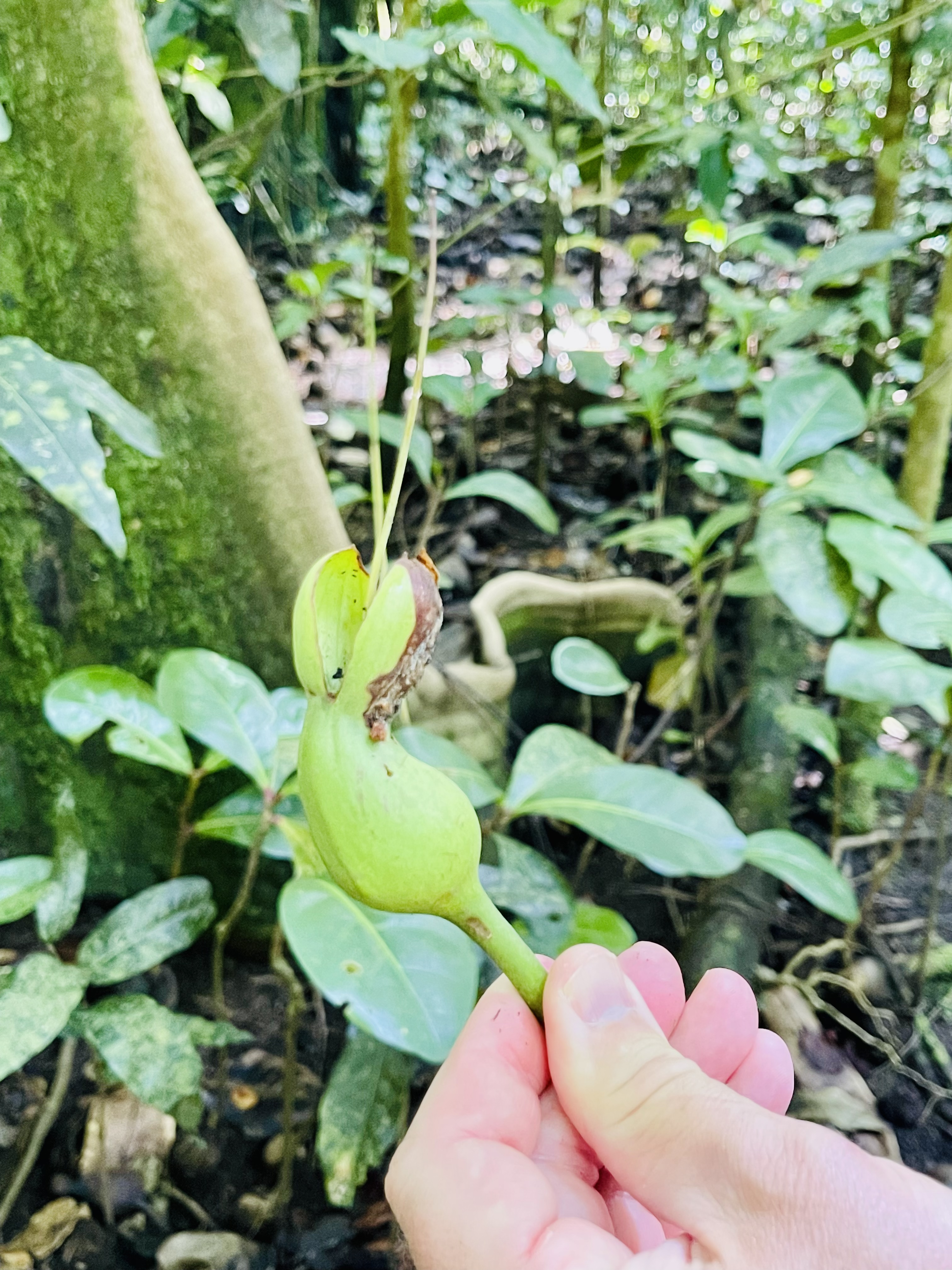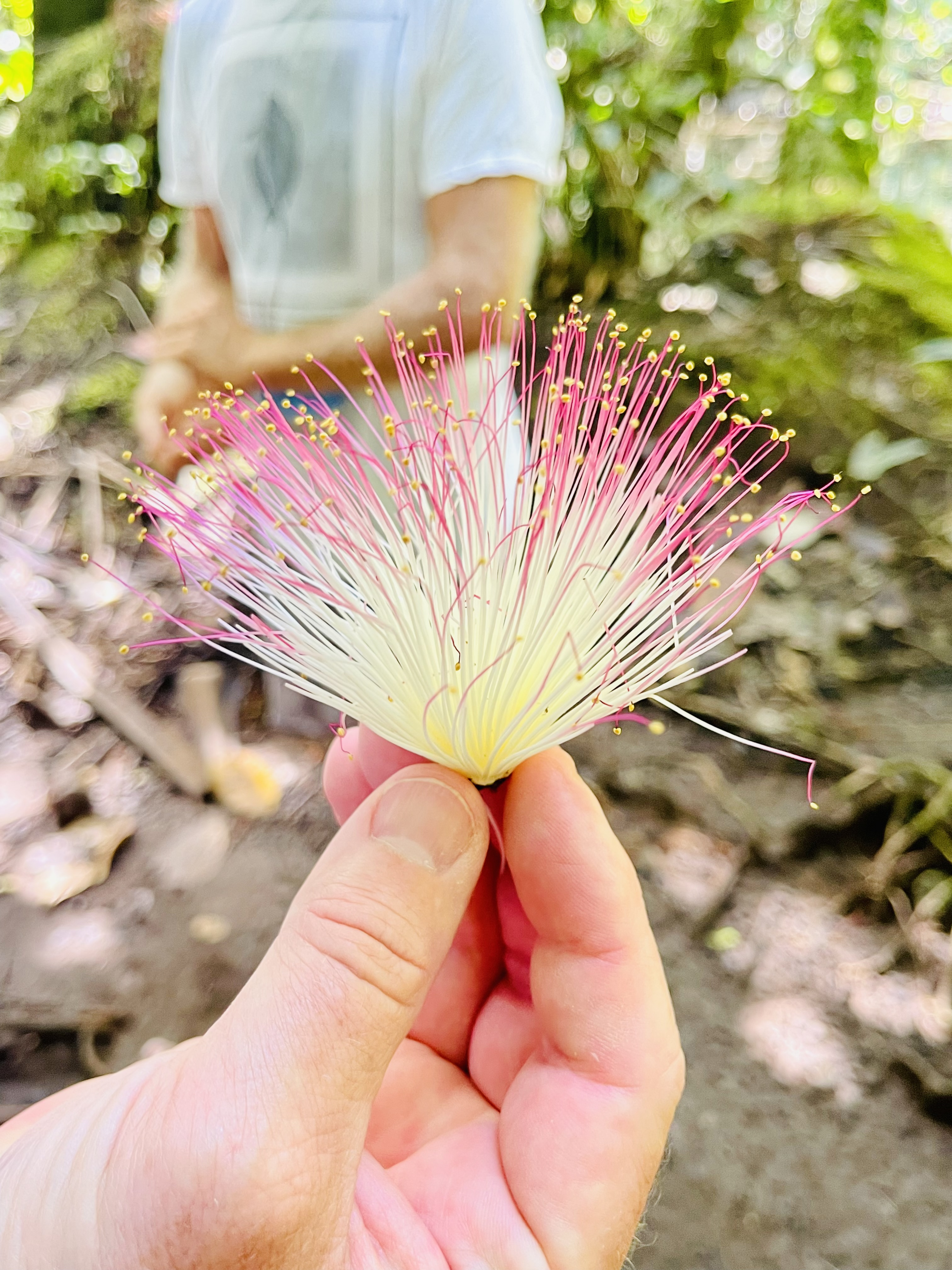 Yohan nous conduit ensuite un peu plus vers le sud où nous accostons et entrons dans une forêt de mapé, le châtaignier tahitien. La fleur de mapé est une merveille de la nature, tout en délicatesse. Elle a des propriétés médicinales et serait un antidote pour le poisson pierre (bien présent dans les eaux polynésiennes). Le fruit se développe sous la fleur. Les fruits se consomment après cuisson mais contrairement à nos marrons, ils sont cuits dans leurs coques deux heures à l’eau bouillante et seront épluchés après cuisson.