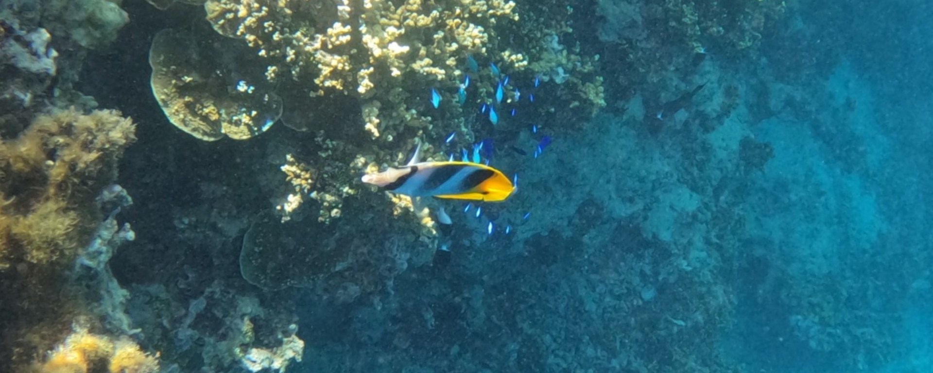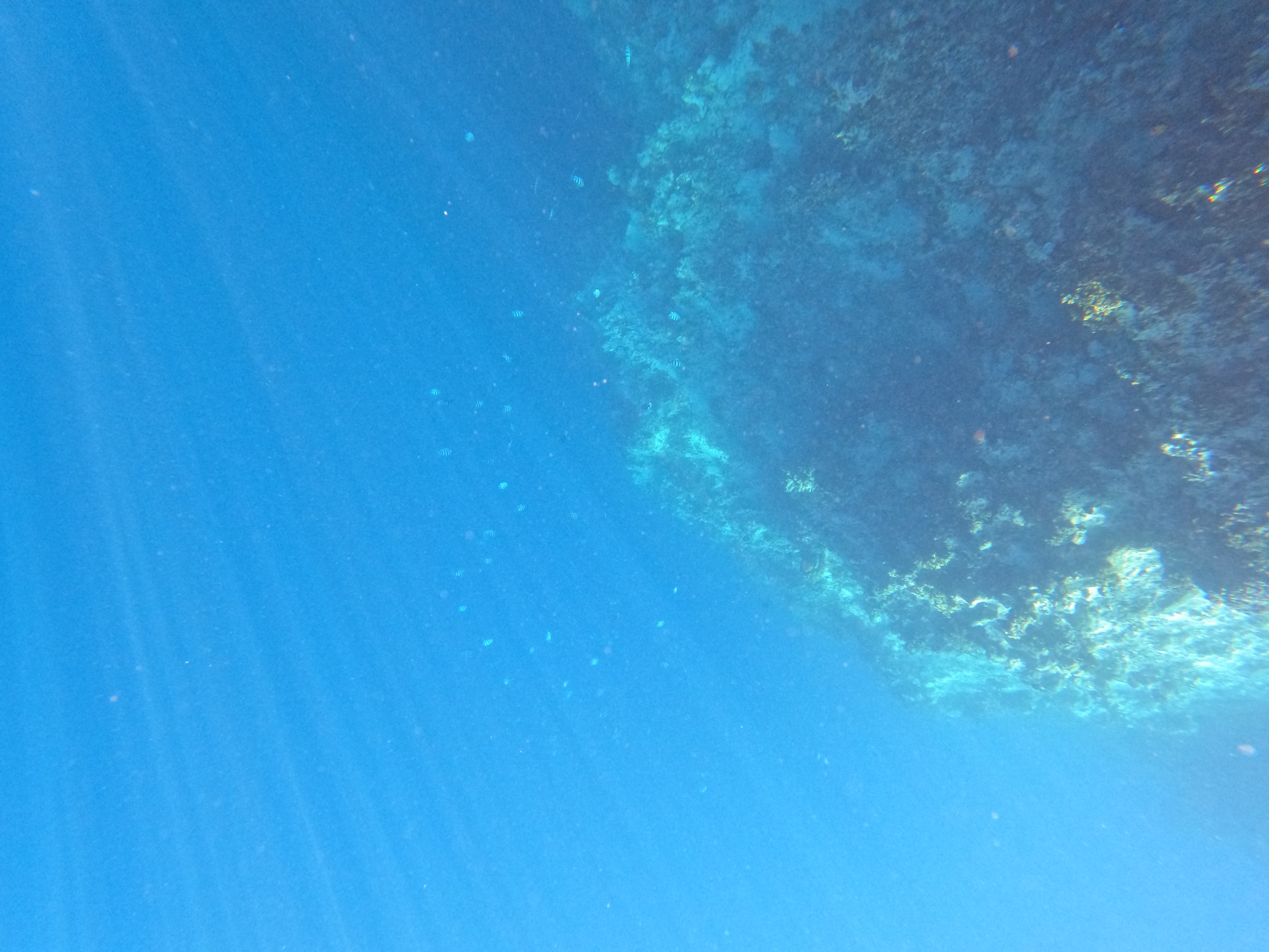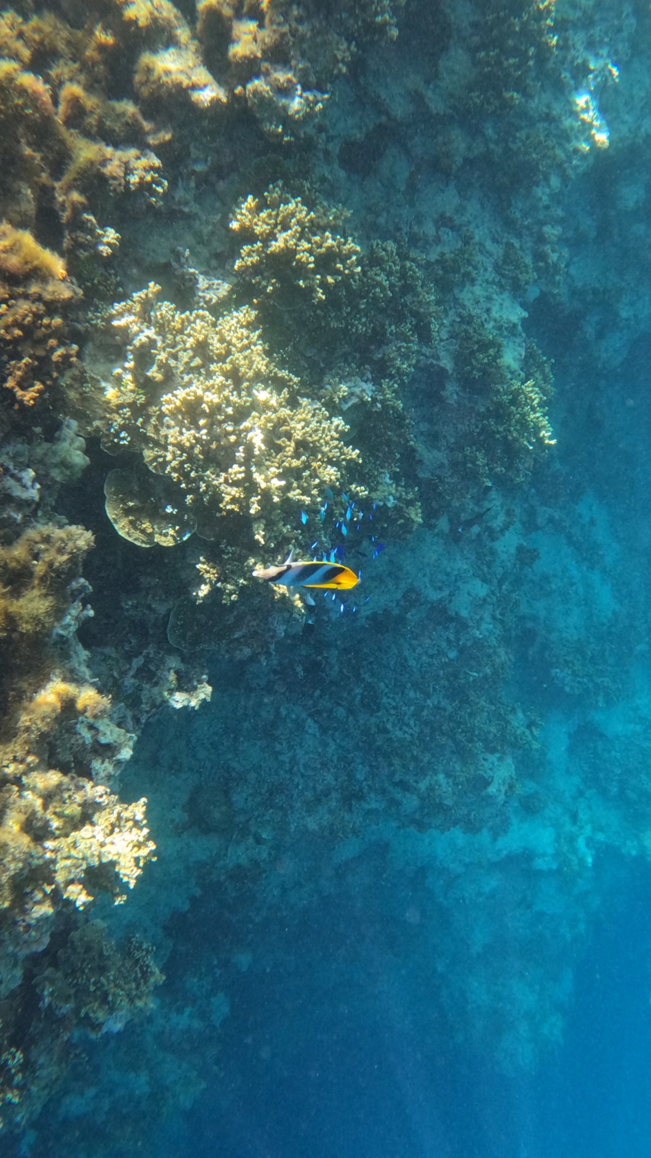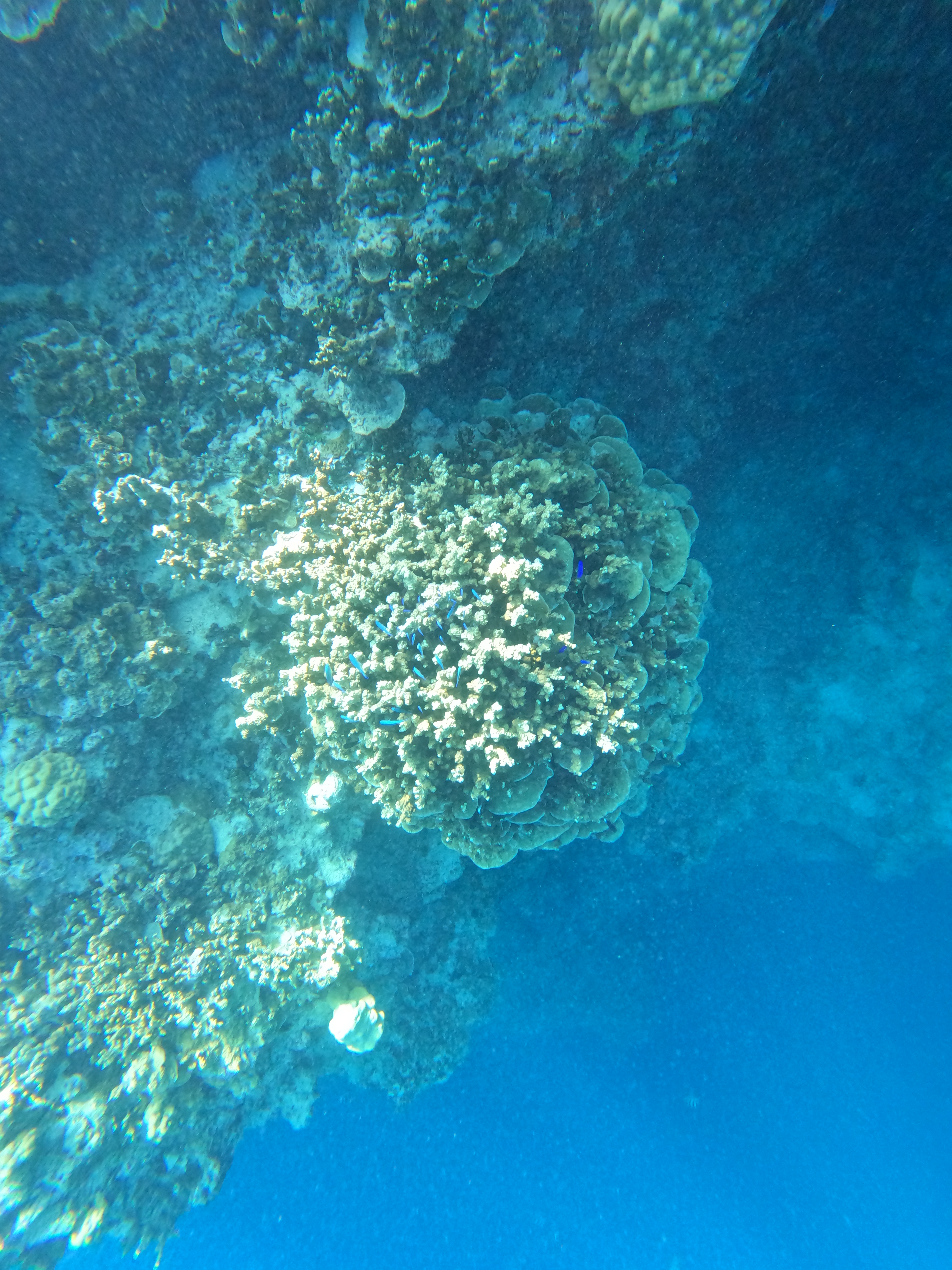 Ouf, on quitte la zone, mon estomac devenait limite mais la dextérité de Yohan m’a permis de rester sereine malgré le fort roulis. En route vers la papate merveilleuse… Sans doute vous demandez-vous de quoi il s’agit depuis que vous avez lu le titre de l’article. La partie du récif barrière coté lagon accumule des dépôts de sable. Ces bancs de sables sont souvent parsemés de « patates » de corail. Il s’agit d’espèces massives à croissance lente. La particularité de celle-ci est qu’elle est énorme avec des « tombants » très abrupts tout autour. Donc sur la papate, on voit quantité de petits poissons multicolores et autour des spécimens plus gros, du corail branche, bref… du merveilleux🐠🤩