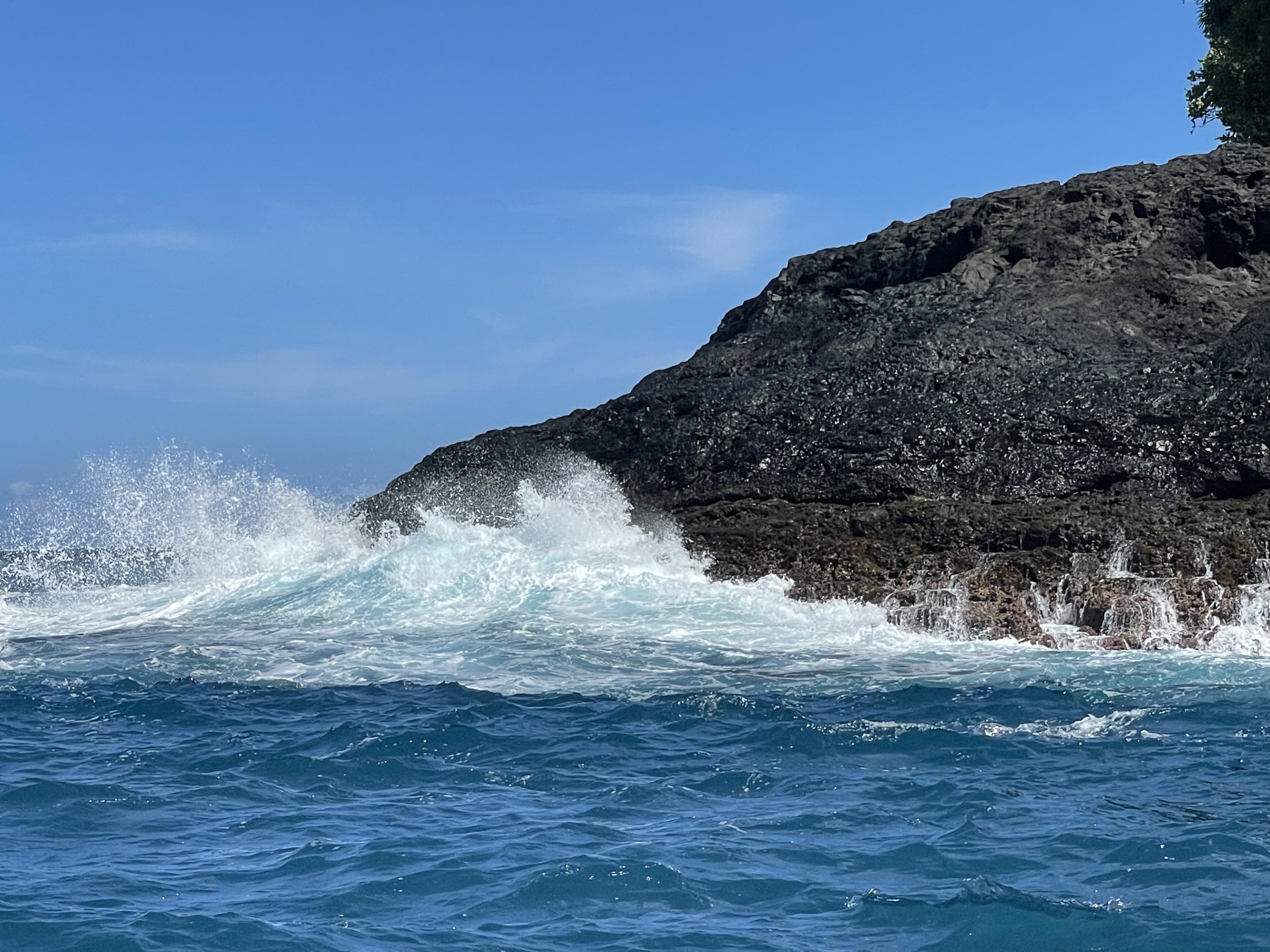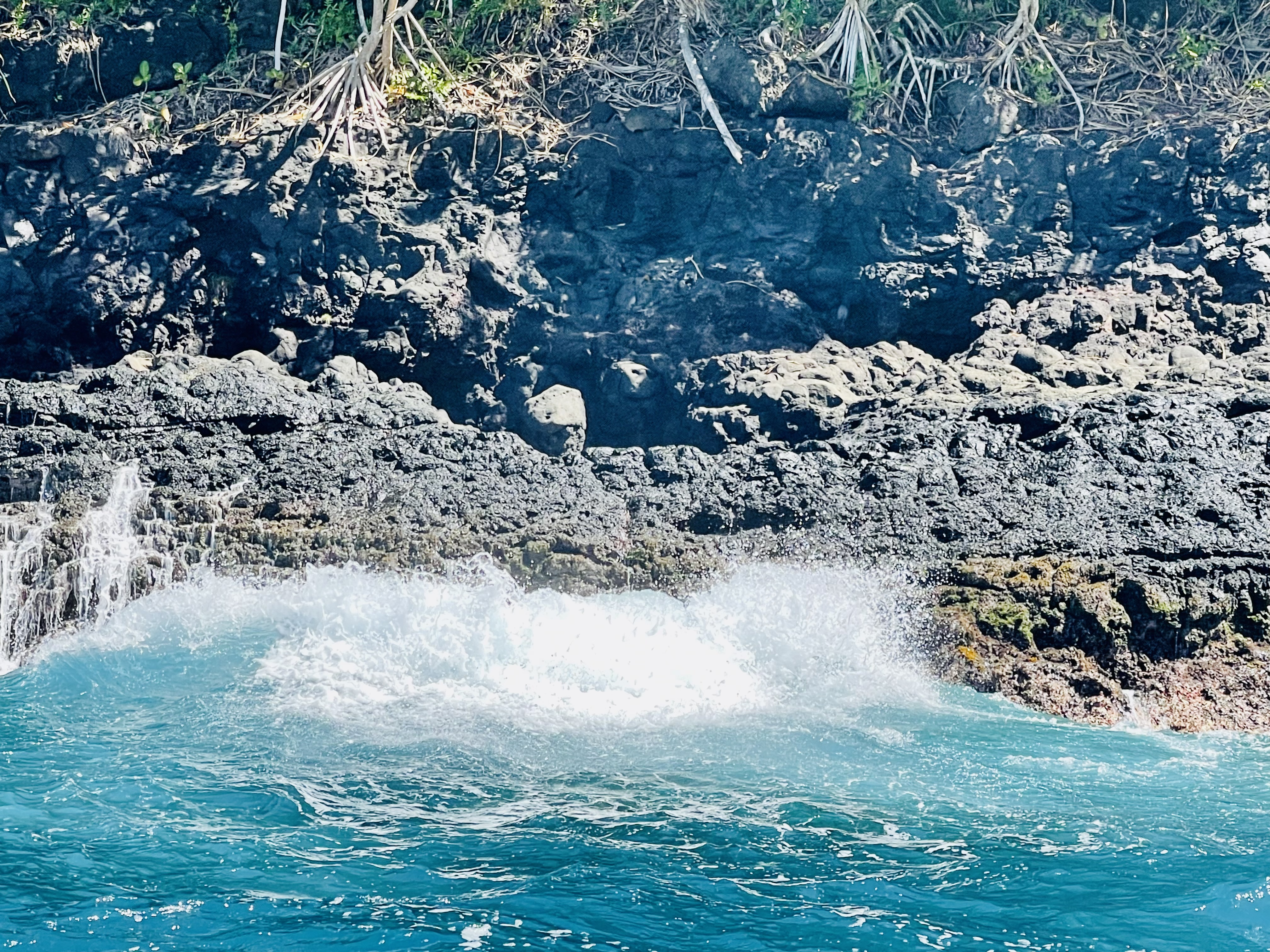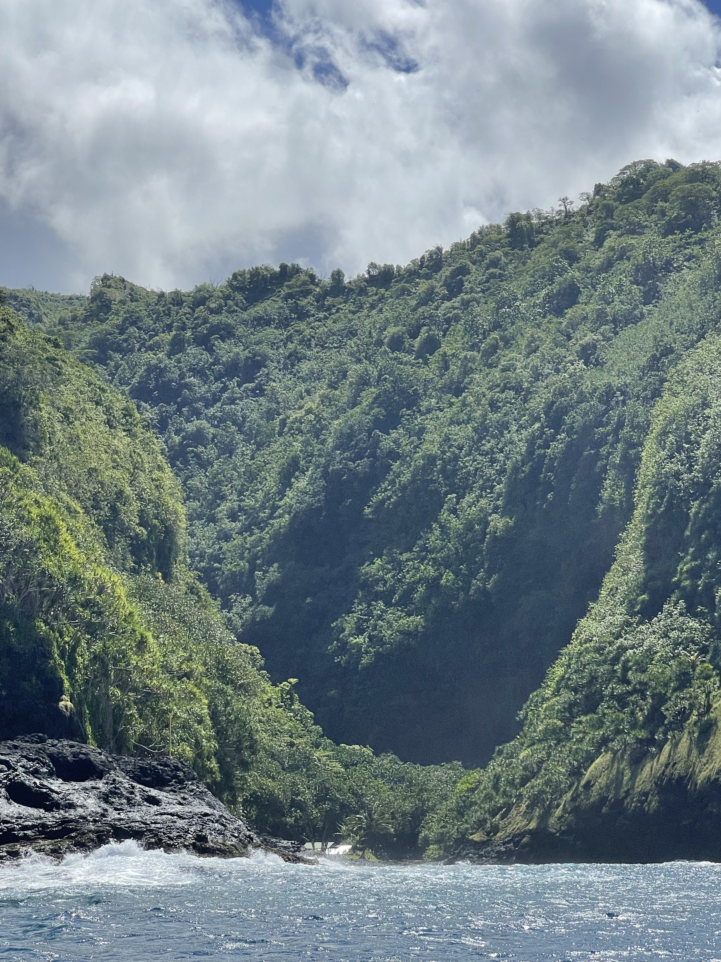On remonte sur le bateau et Yohan nous conduit voir une petite crique à flan de falaise où coule une cascade perpétuelle. Ici, pas de caprice géologique qui garde la mer d’huile, les creux sont très présents et ça bouge beaucoup 😱.