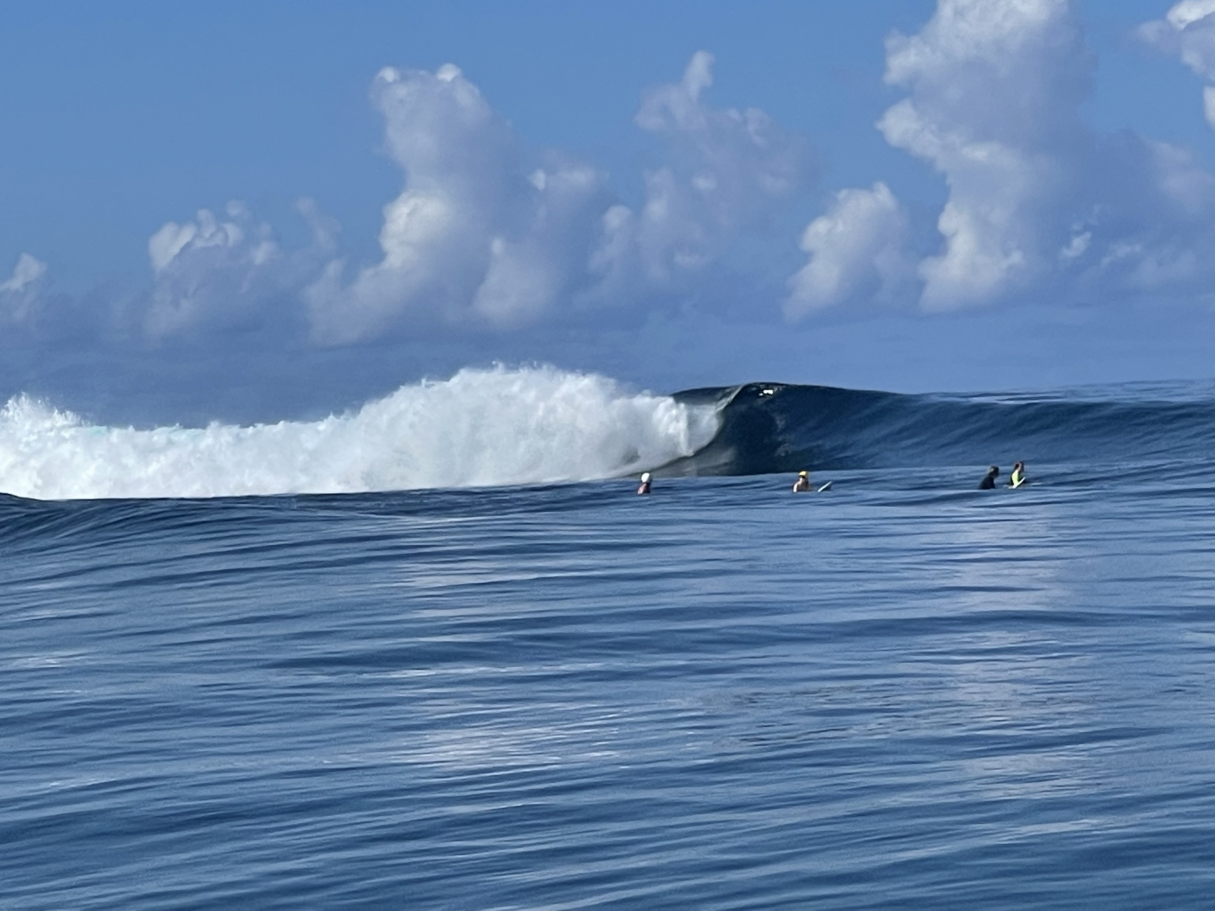 Il nous emmène pour découvrir la côte ouest et aller voir de près la vague de Teahupoo. On a de la chance, nous sommes seuls sur cet immense bateau en aluminium et la mer est calme. Très vite, nous arrivons à la vague que nous pouvons enfin voir de près grace à un caprice géologique qui permet aux bateaux d’être au calme à côté de ces énormes rouleaux (enfin pas tant que cela aujourd’hui car la mer est calme!!! – on trouve ça déjà pourtant pas mal). Un groupe de 4 surfeurs attend la vague qui tarde à venir. Puis hop, ça y est, il y en a un qui s’élance. Ces rouleaux qui se créent à l’infini sont presque hypnothiques; on resterait des heures. C’est donc là que se dérouleront les JO; il reste à leur souhaiter une mer nettement plus agitée pour que les surfeurs y trouvent leur compte.