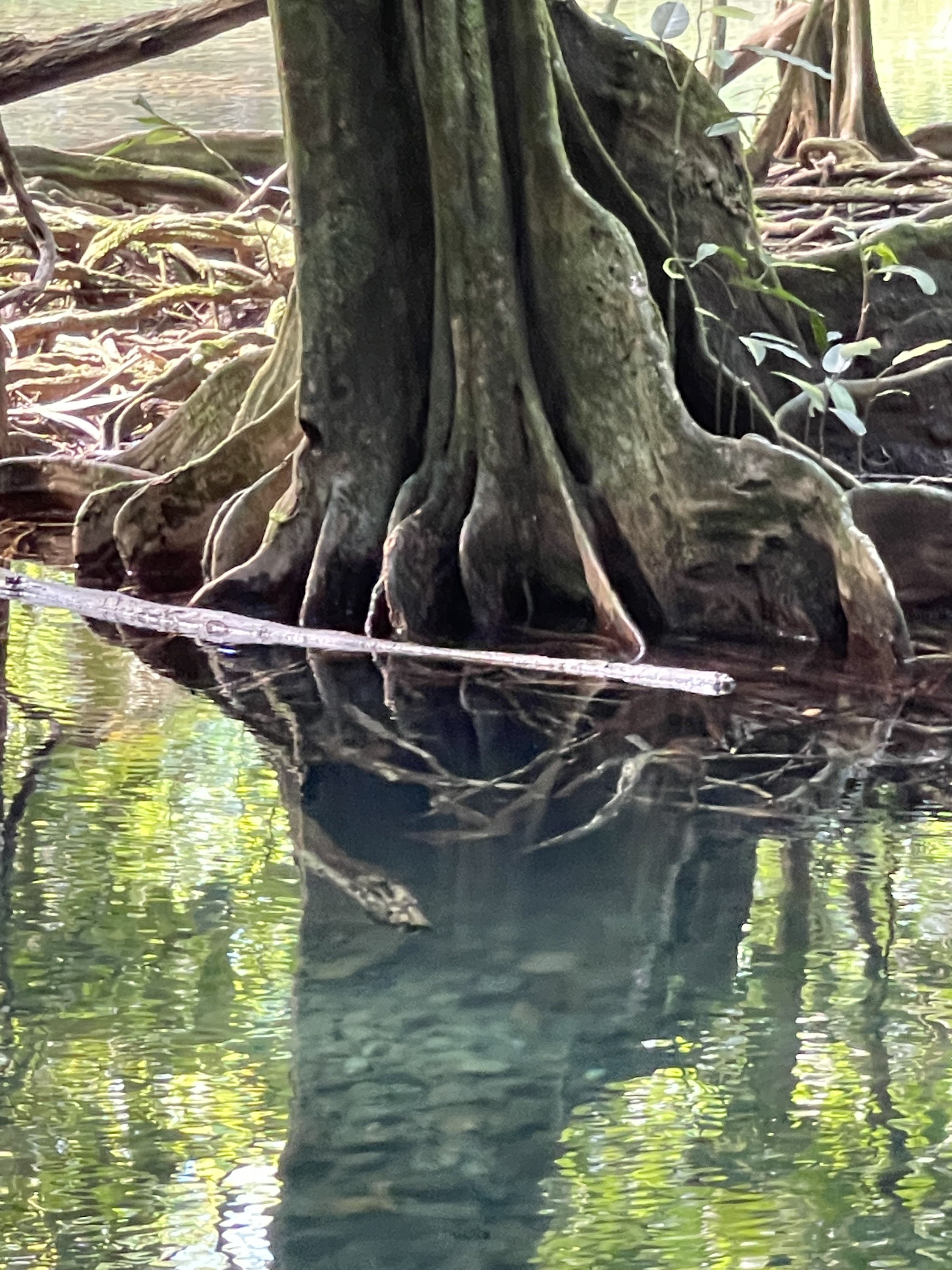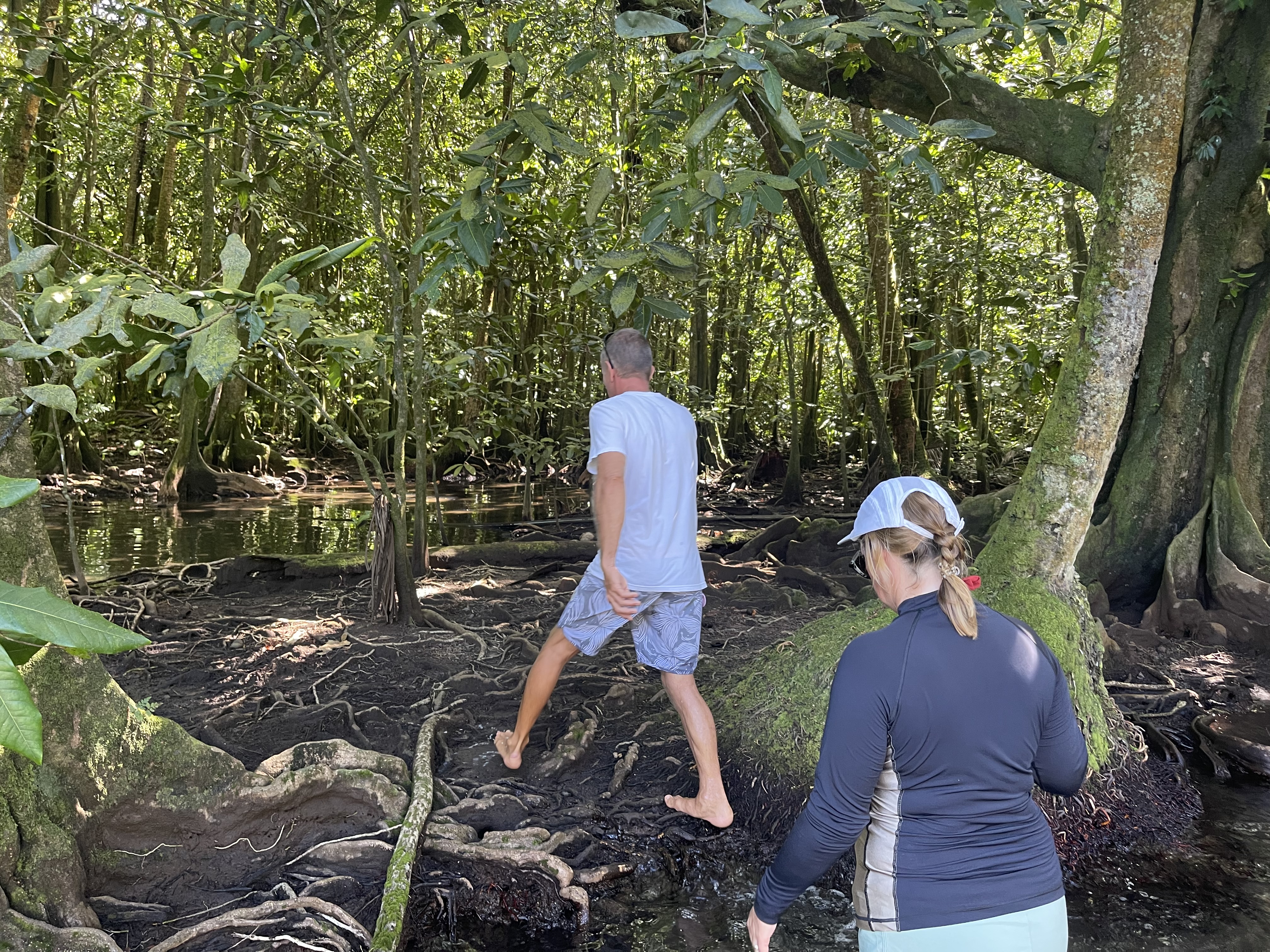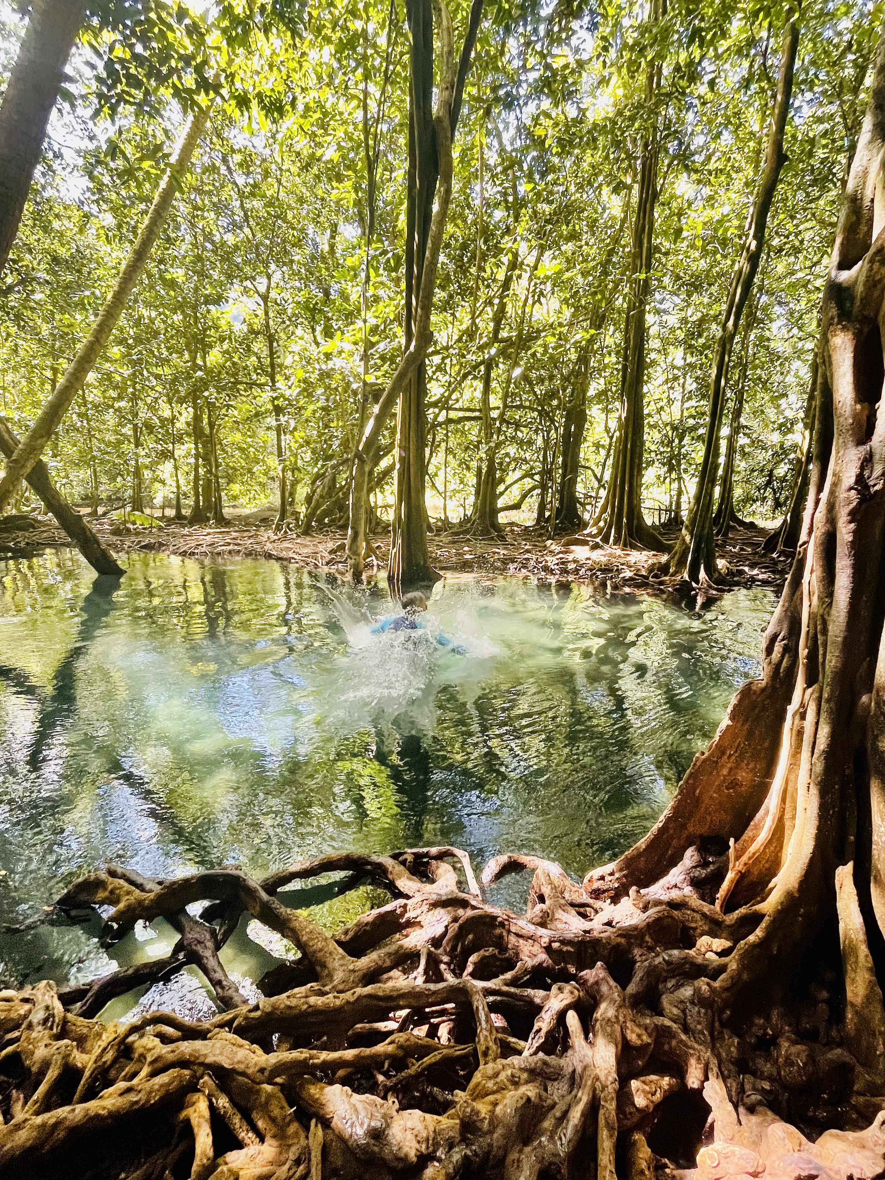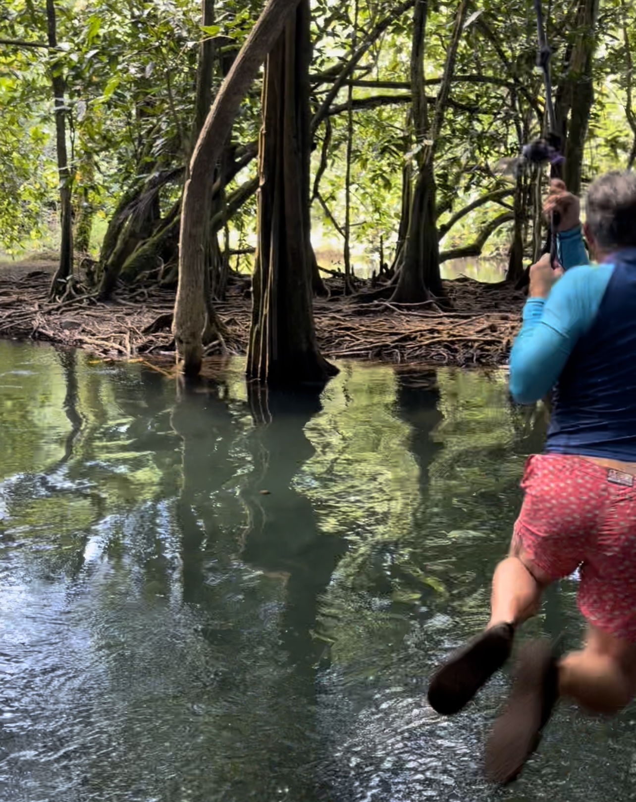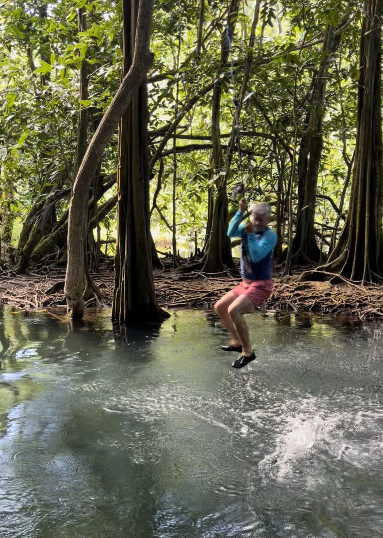 La rivière forme à un endroit une piscine naturelle de plus de 2m de profondeur. L’eau de mer plus salée et chaude est au fond et l’eau douce froide est en surface. Le guide nous indique une corde pendue au bout d’une grosse branche qui de toute évidence permet de jouer à Tarzan. Et devinez qui se lance…