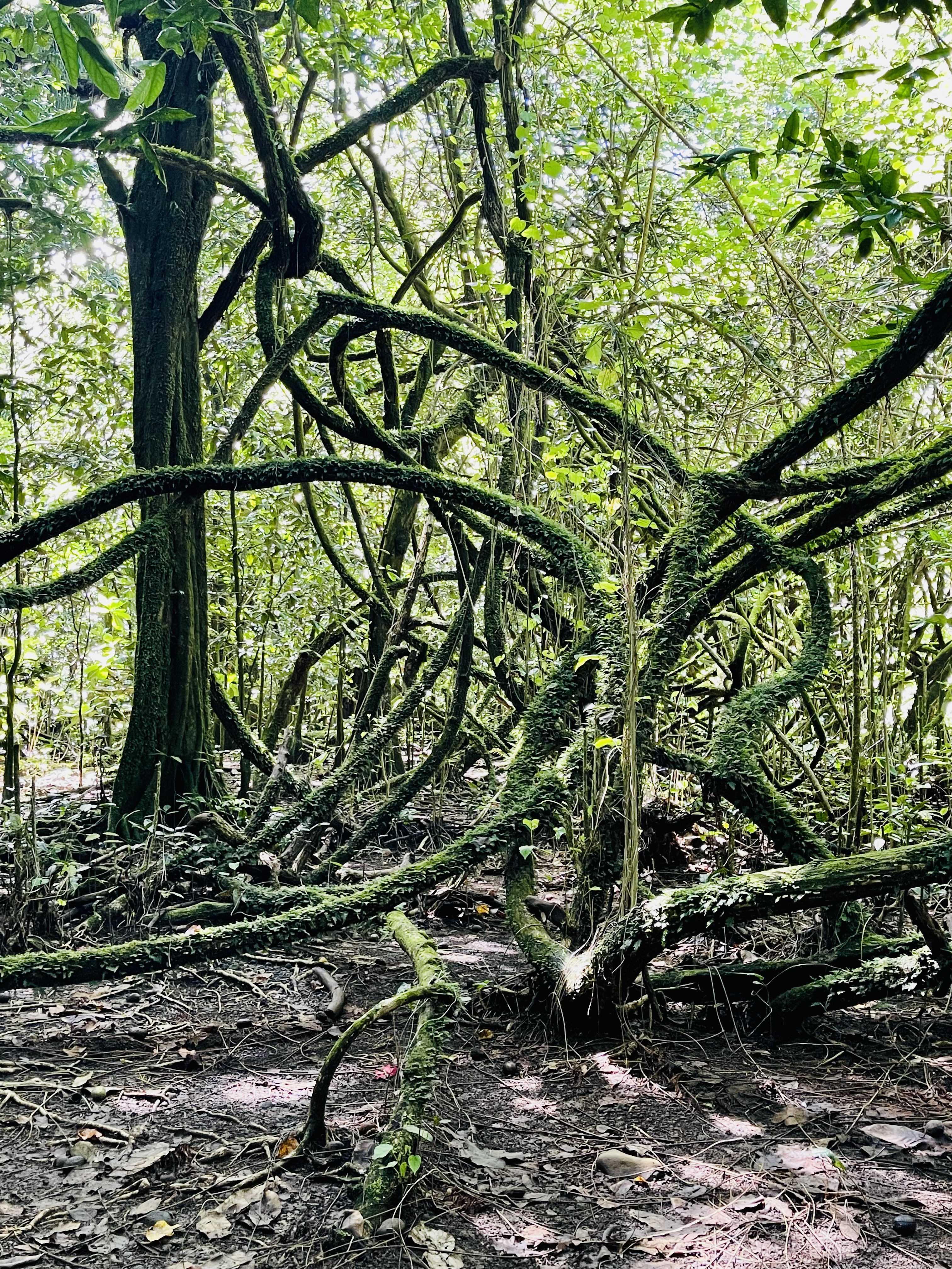 Cette forêt presque lacustre s’étend aux pieds d’une rivière. Nous nous trouvons dans une zone inhabitée. Les branches des arbres recouvertes de mousse s’enchevètrent dans des formes originales. On y verra aussi les Purau ou arbres aux fleurs multicolores. Ses fleurs d’hibiscus sauvage colorent le sol boueux. Elles ont la particularité d’éclore jaune le matin et de tomber sur le sol vers 16:30 de couleur rouge. Localement les parents avaient pris l’habitude de dire aux enfants de rentrer à la tombée des fleurs.