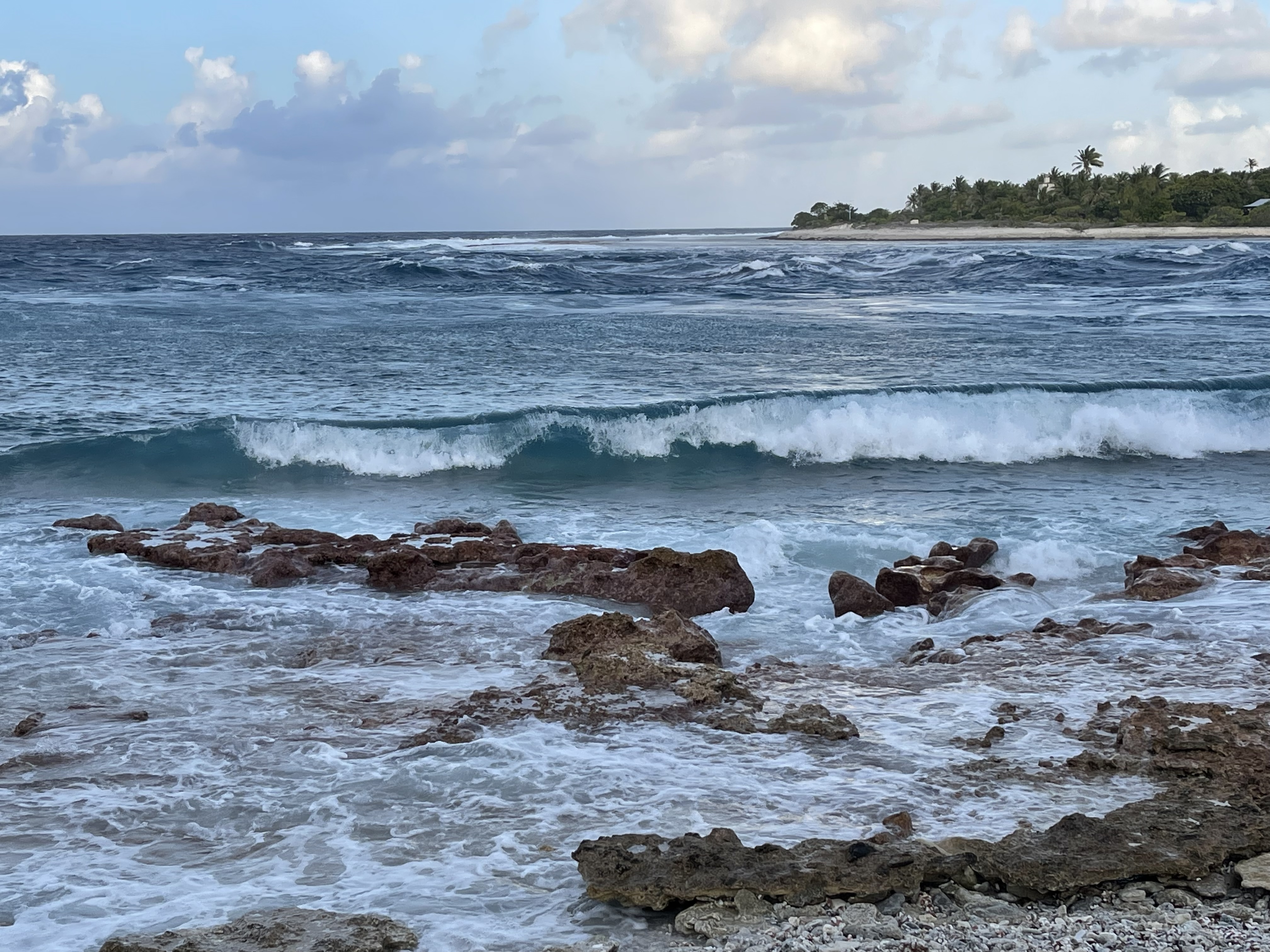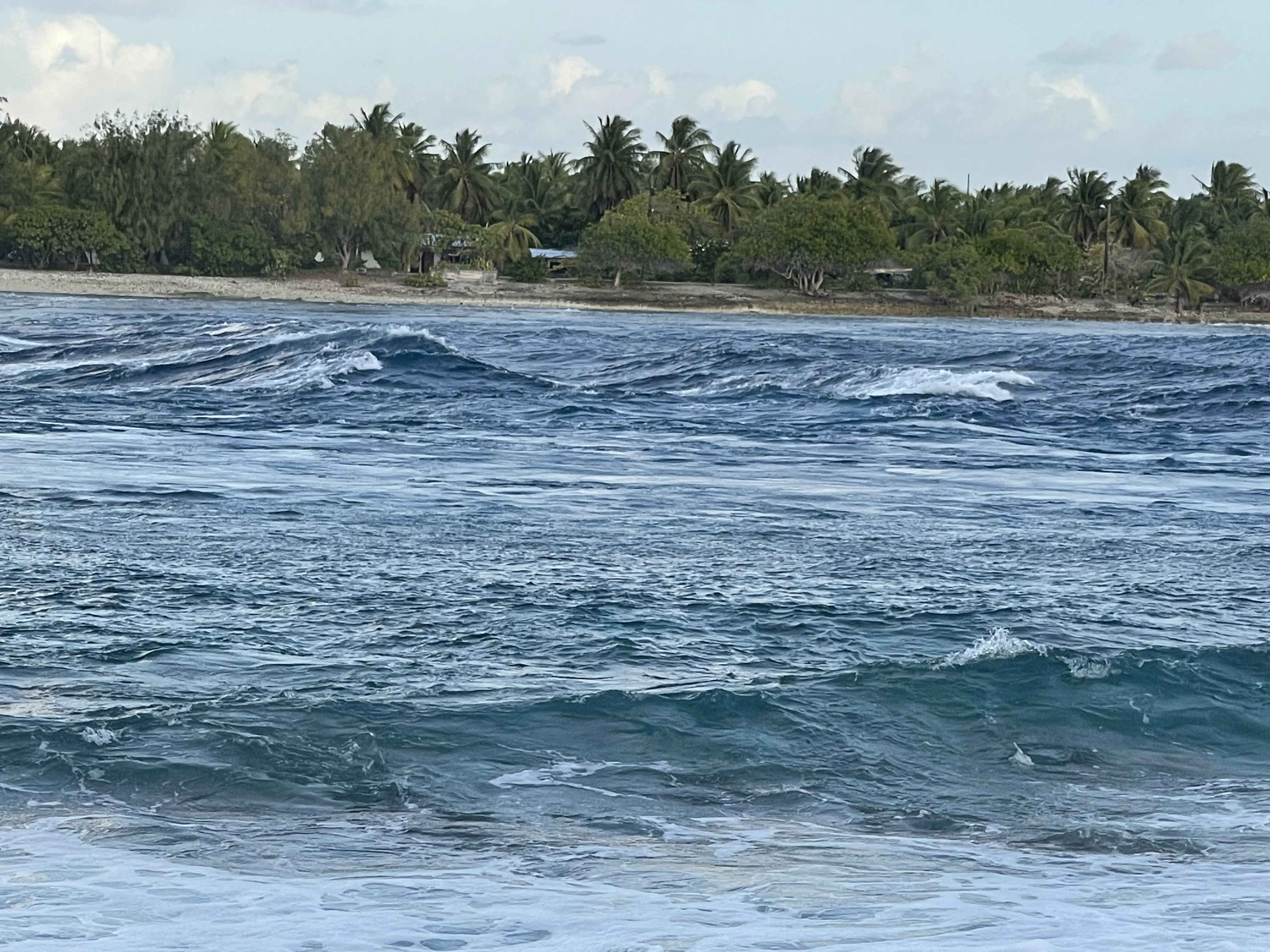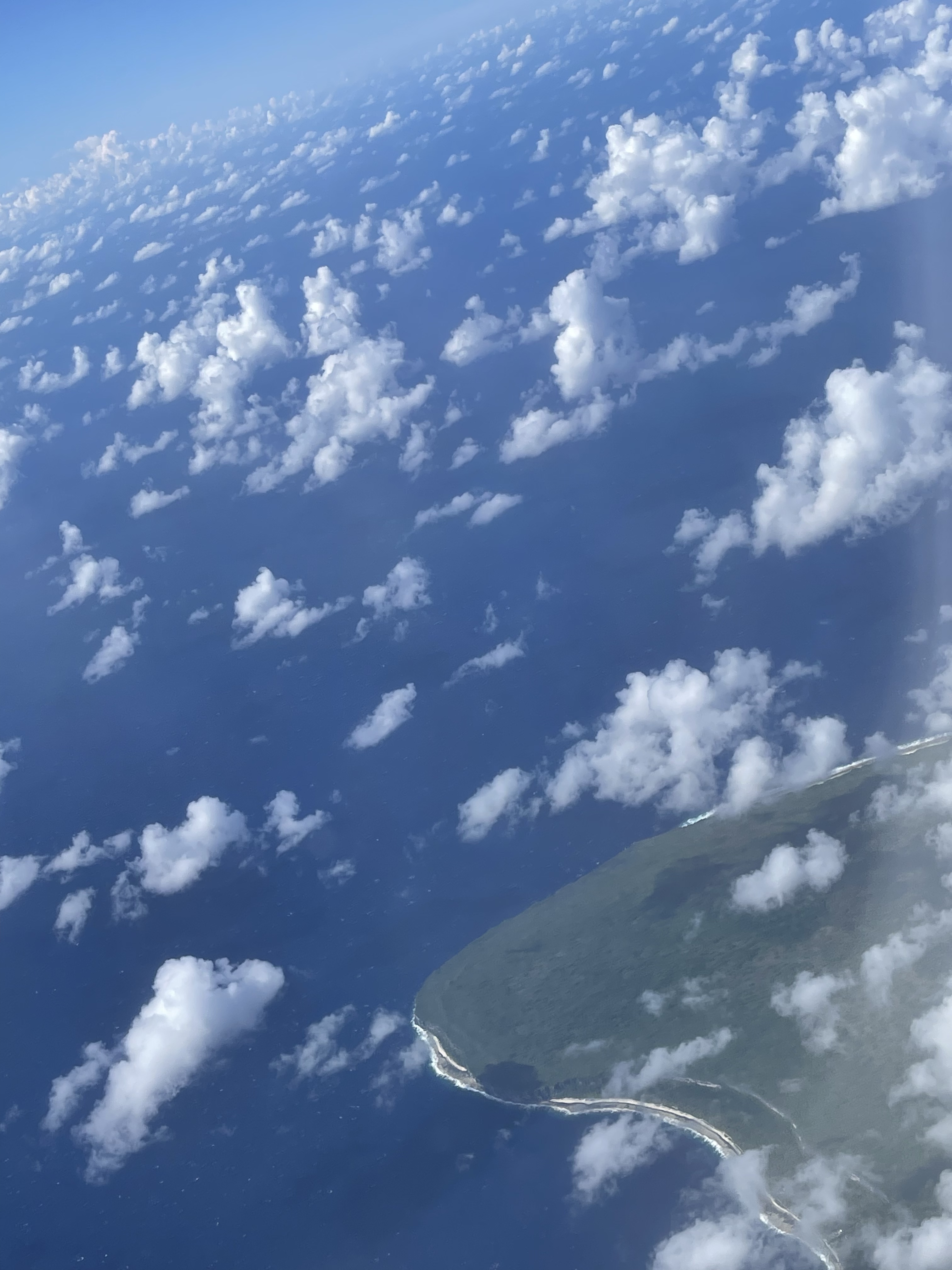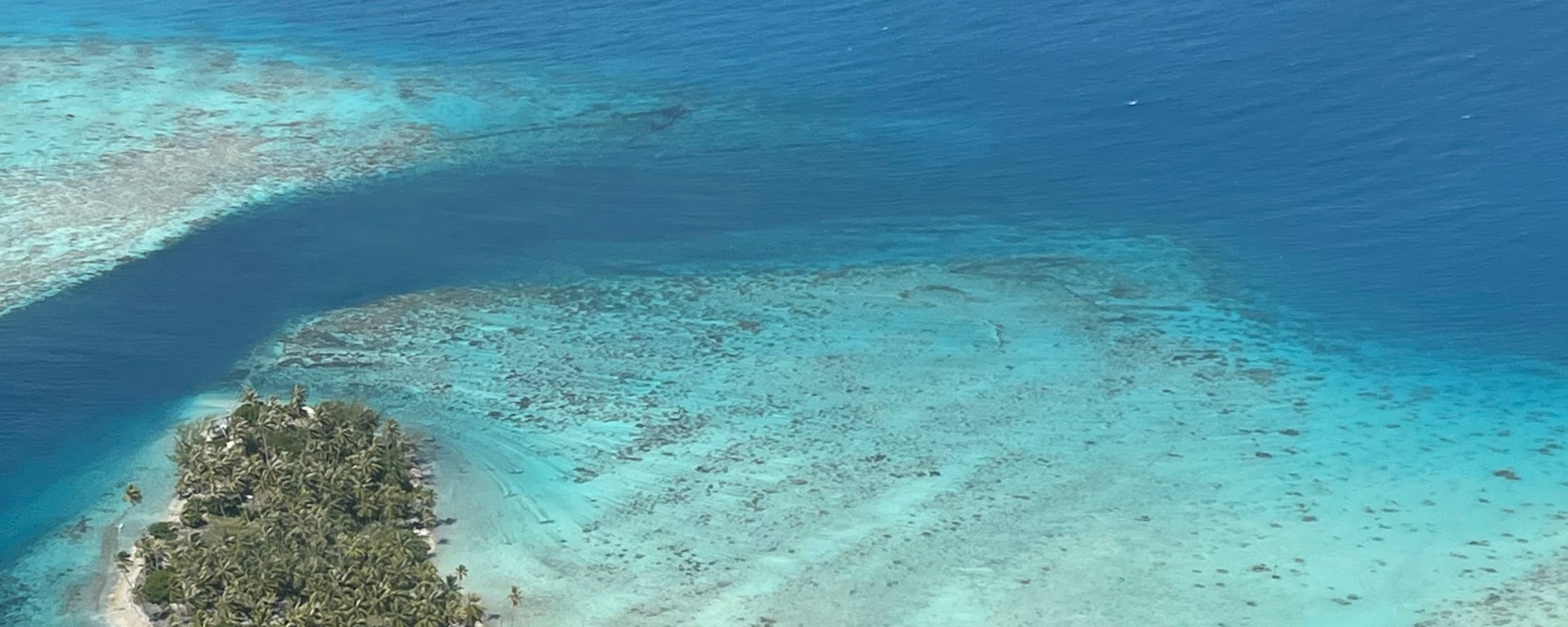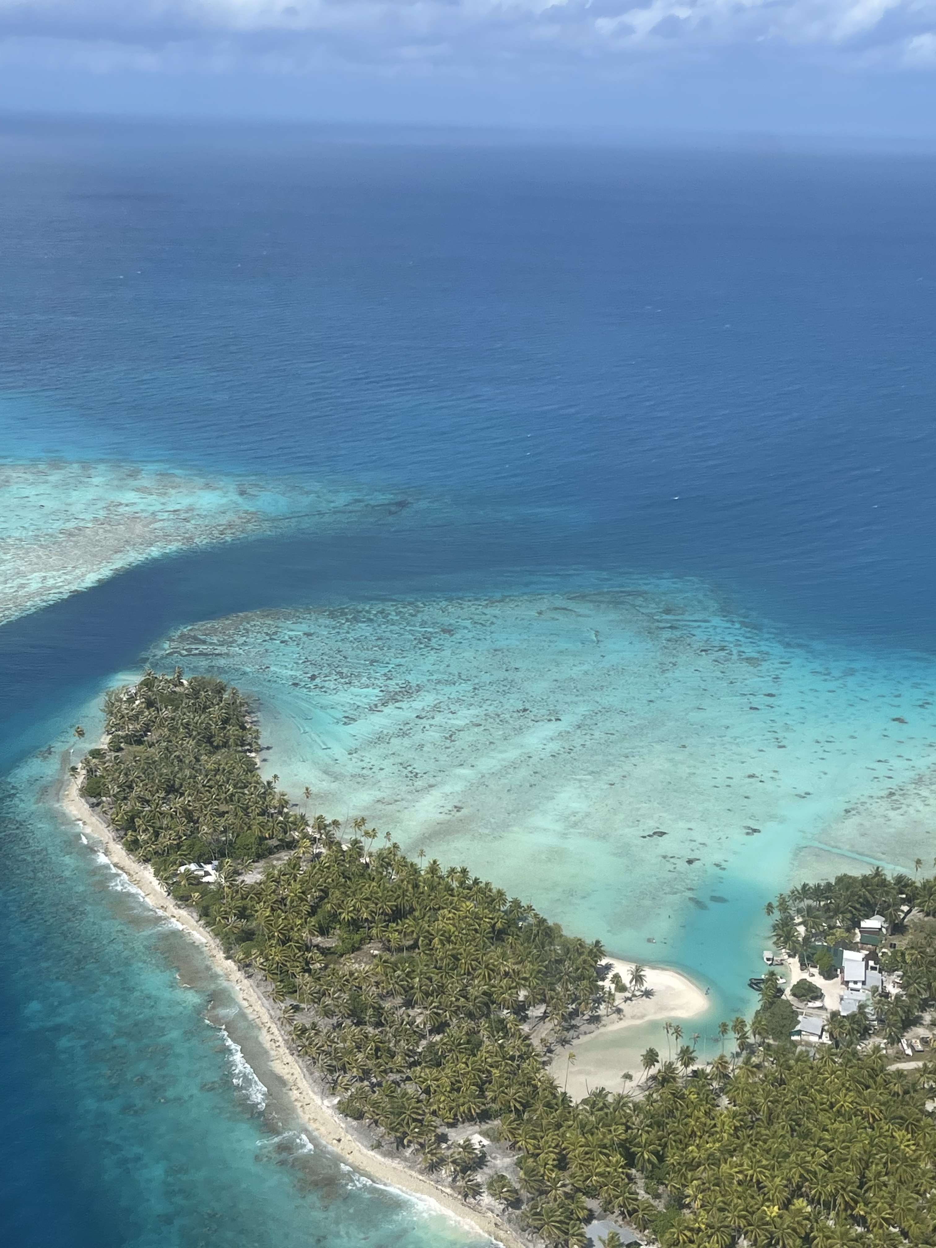 Peu de temps après, on voit apparaître des lagons entourés de longues bandes de corail parsemés de cocotiers. La couleur de l’eau est incroyable, une variation de turquoises à ne plus finir.