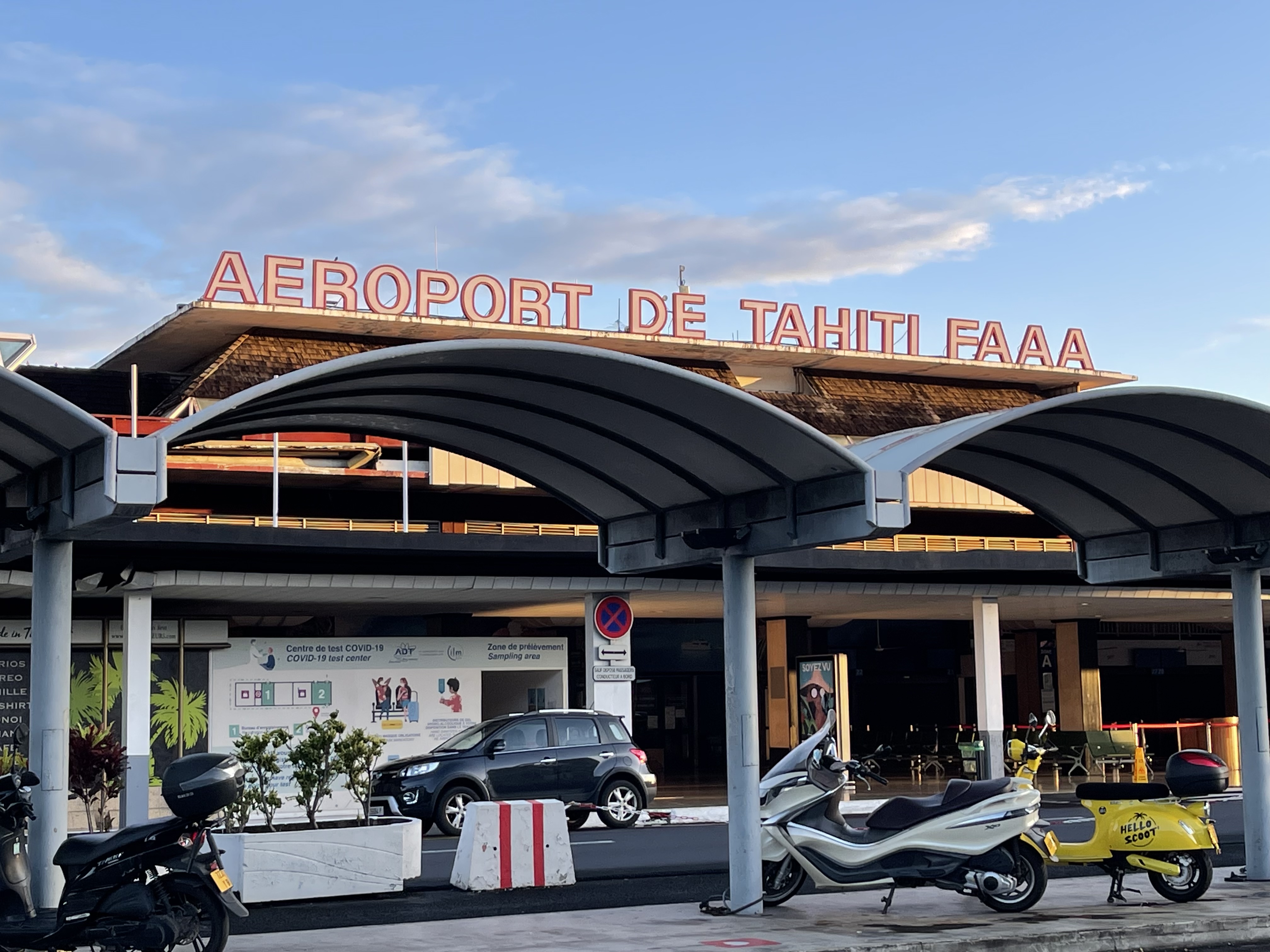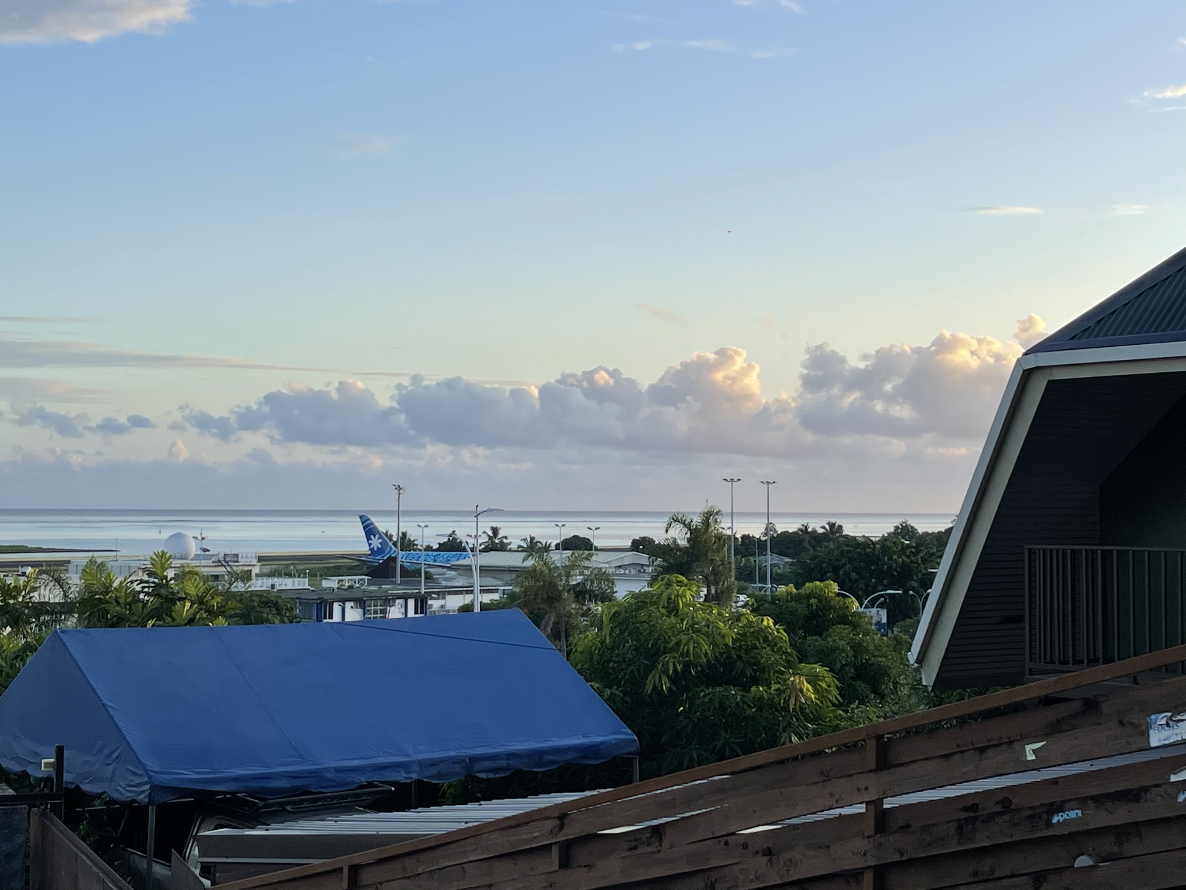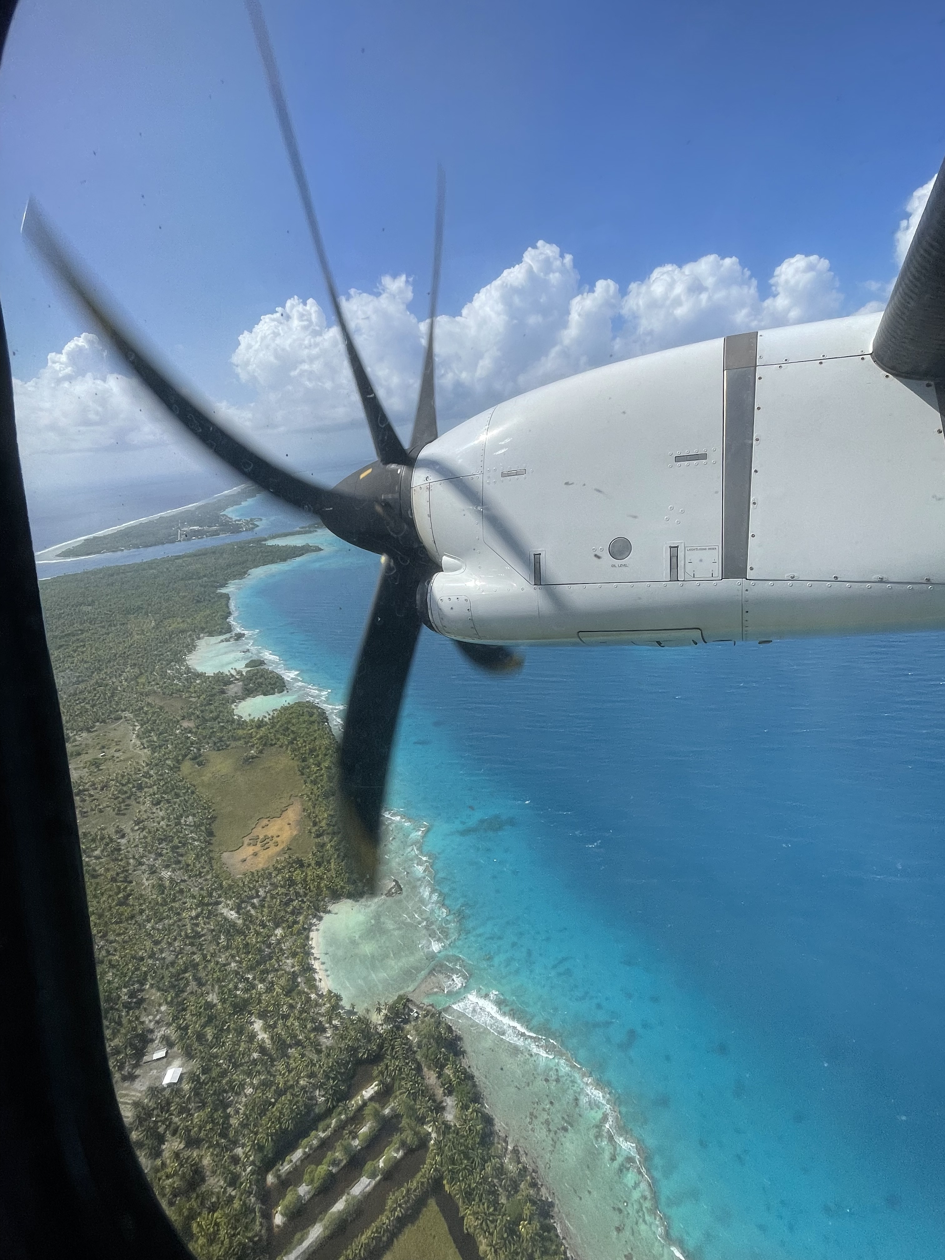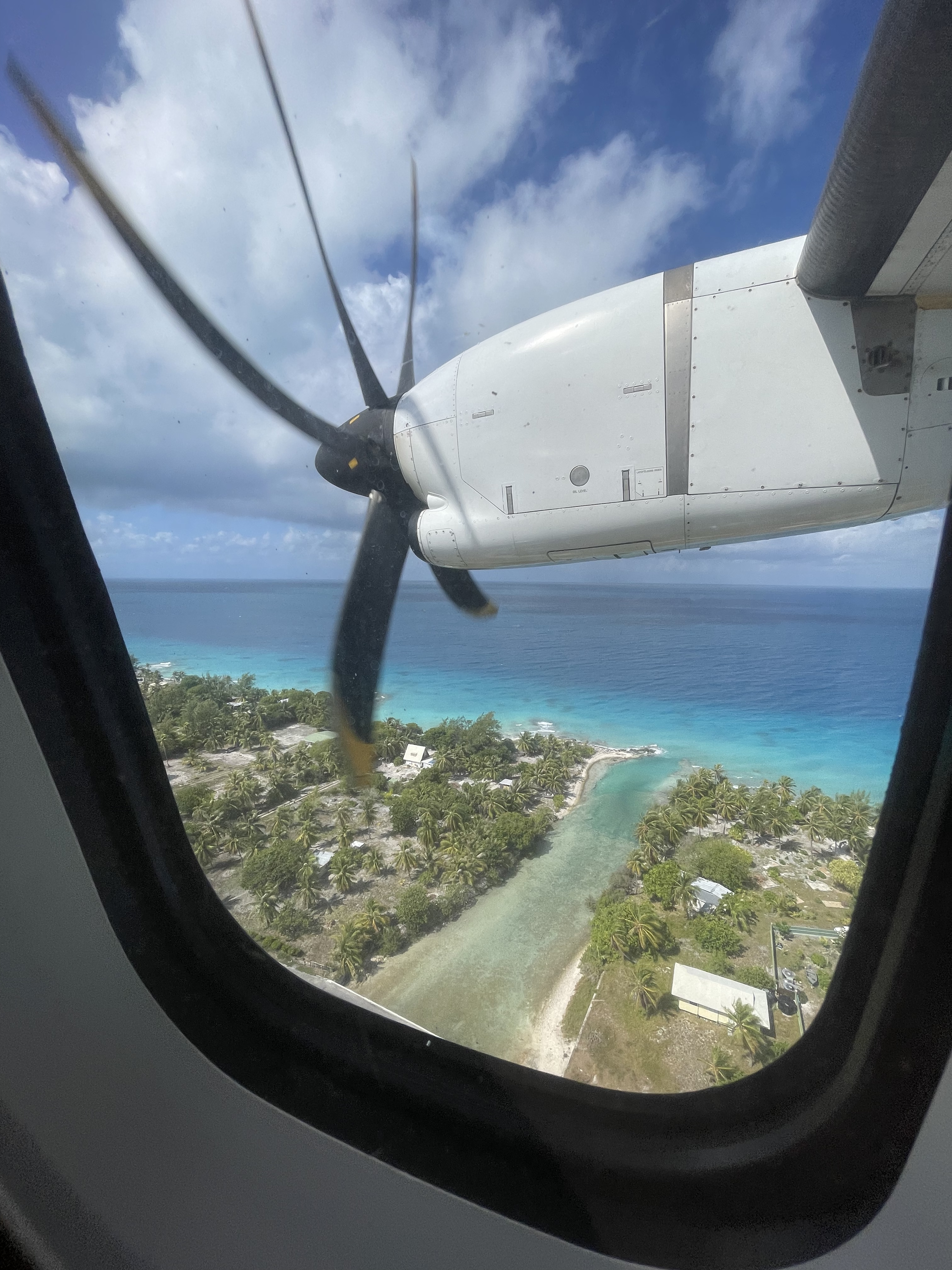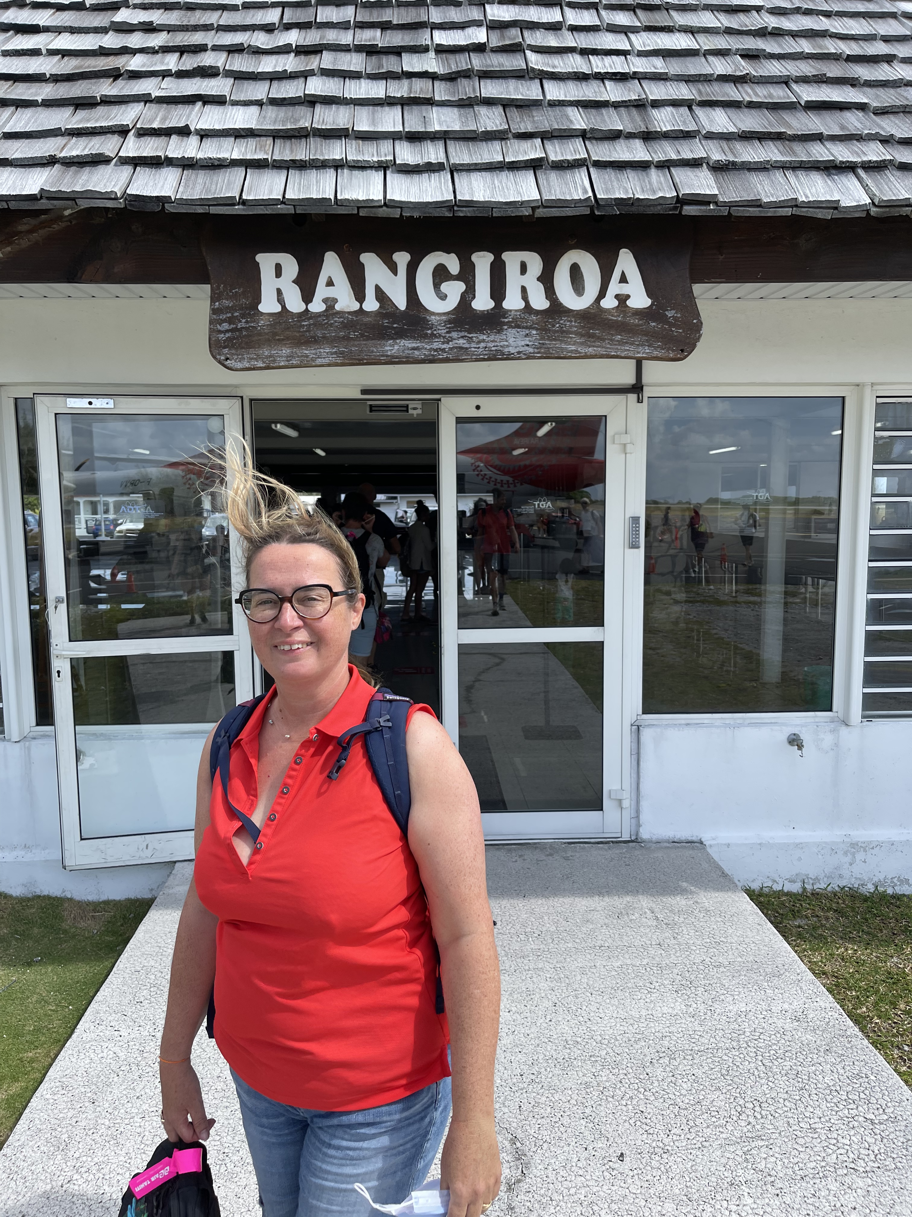 Nous arrivons comme conseillé une heure à l’avance à l’aéroport. Et là, c’est une file incroyable qui nous attend. On patiente un peu, la file continue de s’allonger… Voyant l’heure tourner et vu la difficulté de trouver des vols inter-îles, je me dis que je vais nous enregistrer aux bornes automatiques. Quelques minutes plus tard, c’est chose faite mais on nous refuse l’accès au comptoir dépose des bagages sous prétexte qu’il n’est pas ouvert 😠! Retour à la case départ mais du coup on fait connaissance avec d’autres passagers. Nicolas et Fanely, qui ont quittés la métropole depuis plusieurs mois et vivent à présent sur leur catamaran voyageant d’île en île. Une voix dans un haut-parleur appelle soudain les passagers du vol vers Rangiroa à se présenter aux comptoirs d’enregistrement. Se présenter, hum enfin presque, c’est plutôt rejoindre une autre file mais plus proche des guichets cette fois mais aussi l’occasion de comprendre la raison du retard. Panne informatique totale à l’aéroport de Tahiti; les cartes d’embarquement sont faites à la main comme dans le bon vieux temps. C’est donc avec plus d’une heure de retard que nous décollons. Mais bon, tout vient à point à qui sait attendre.