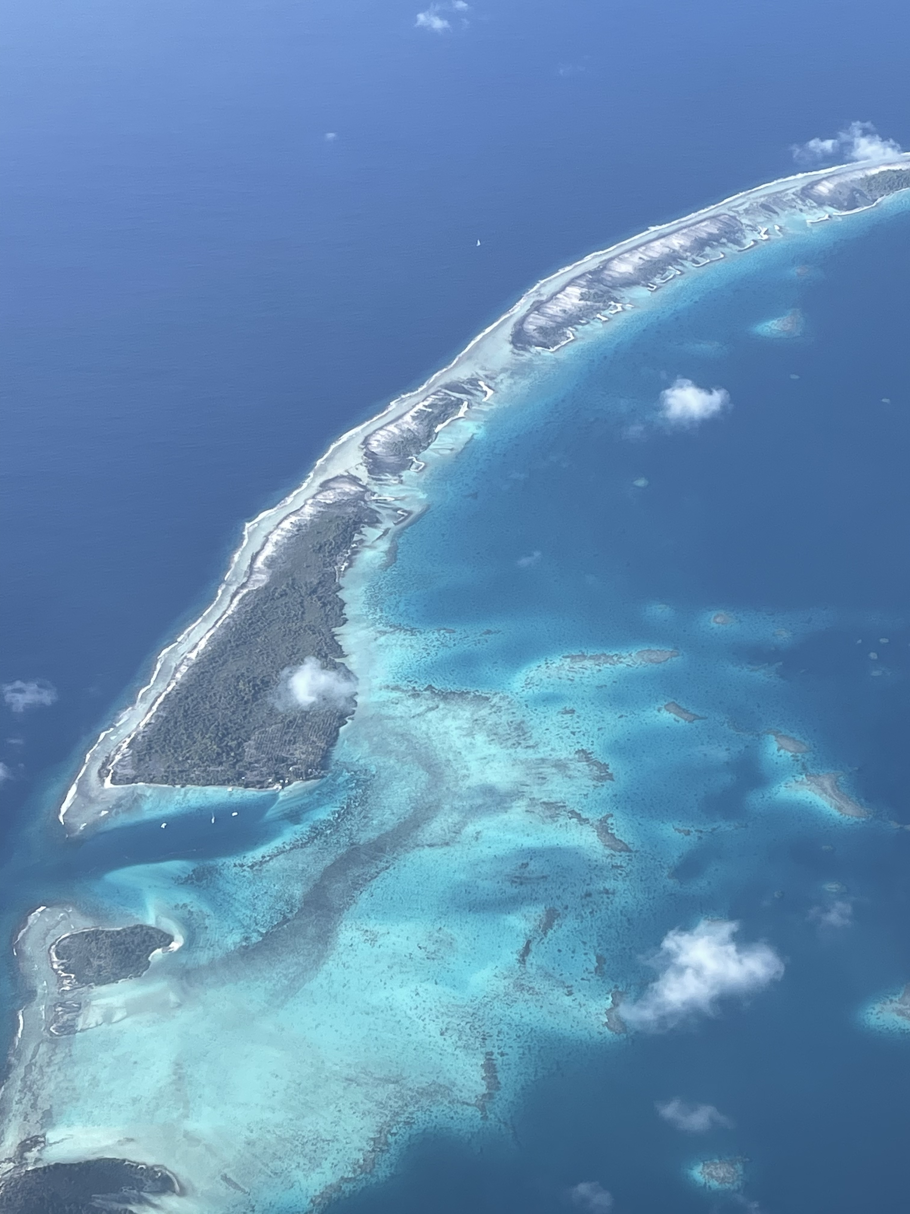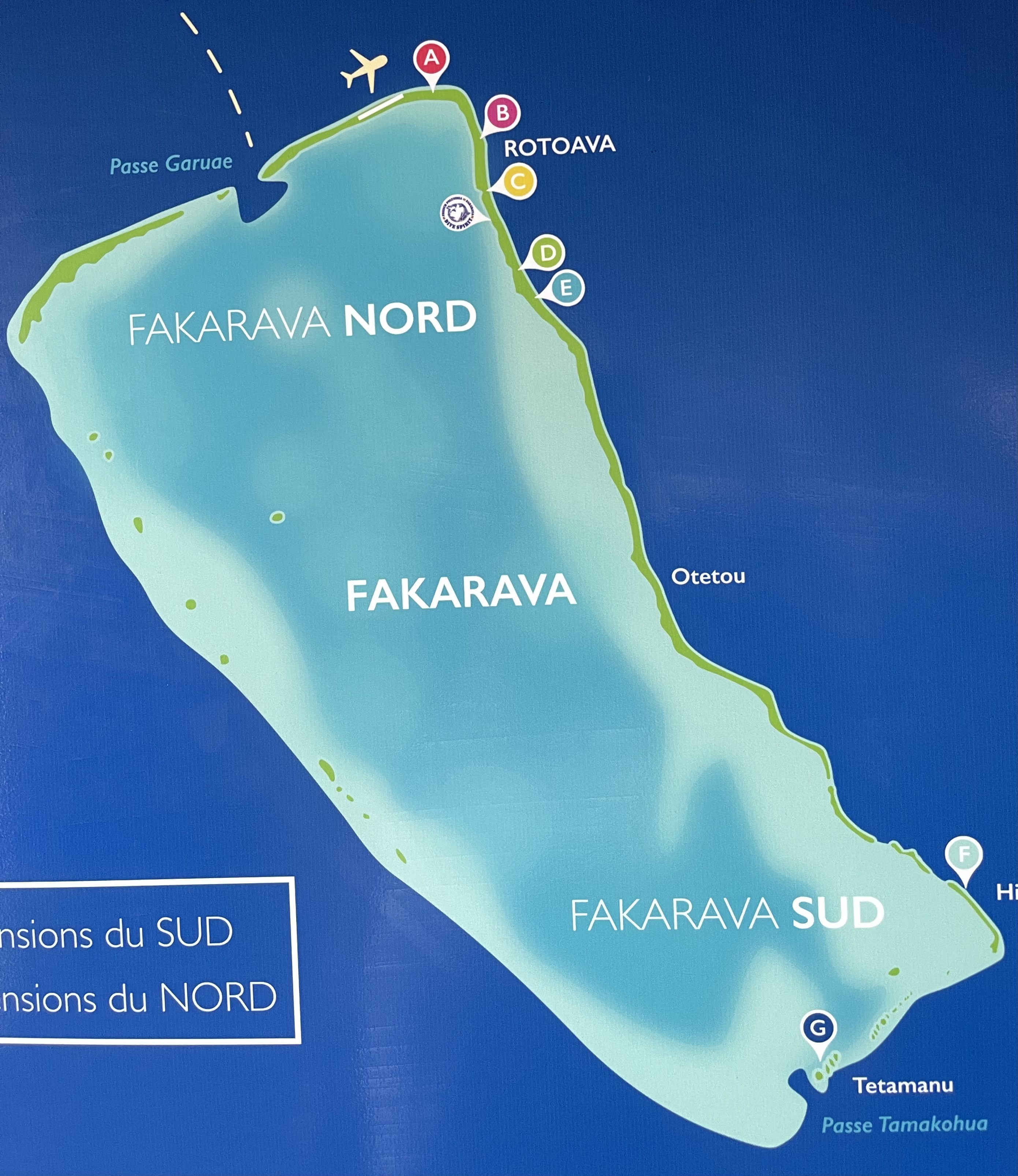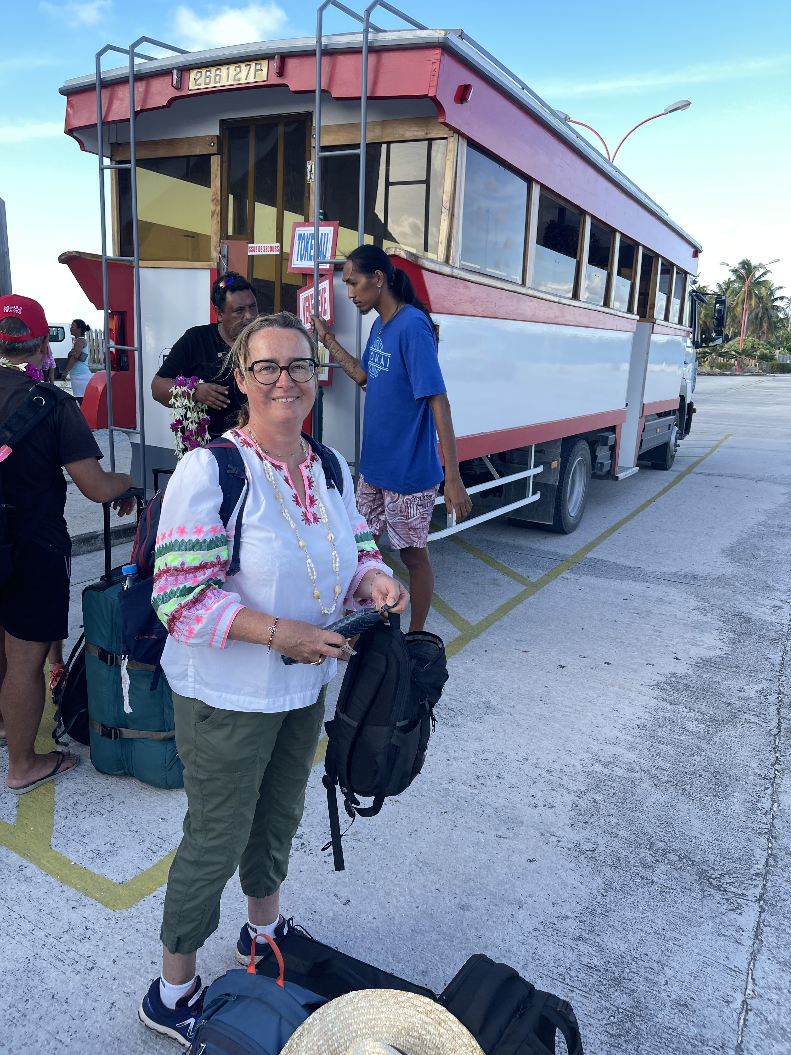 On embarque avec 15 minutes d’avance aujourd’hui, une fois n’est pas coutume. Pour les vues sur Rangiroa, c’est raté, on est du mauvais coté de l’appareil. par contre, au fur et à mesure du vol, on peut admirer du ciel les îles et lagons d’Arutua et d’Apataki. C’est magique. Arrivée sans problème à Fakarava où on prend le bus pour rejoindre le quai où Françoise nous attend. Ah oui, le bus est assez spécial ici…