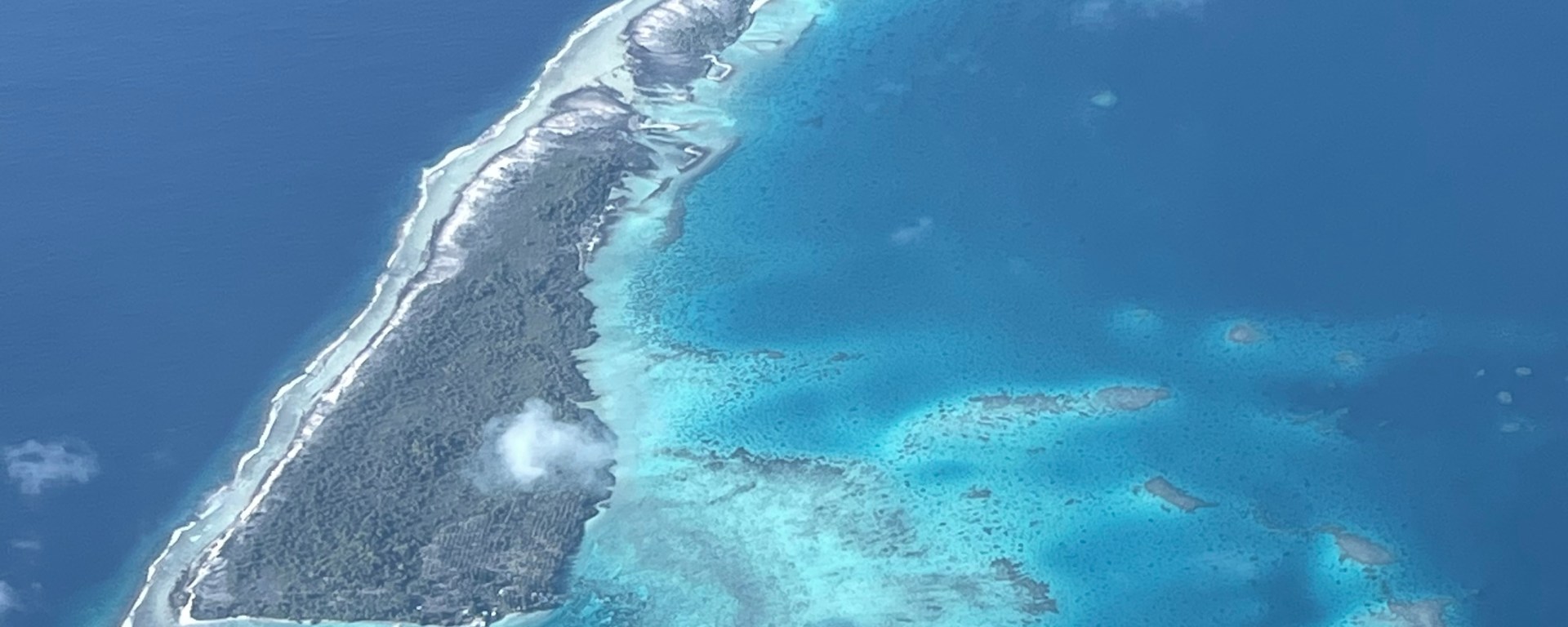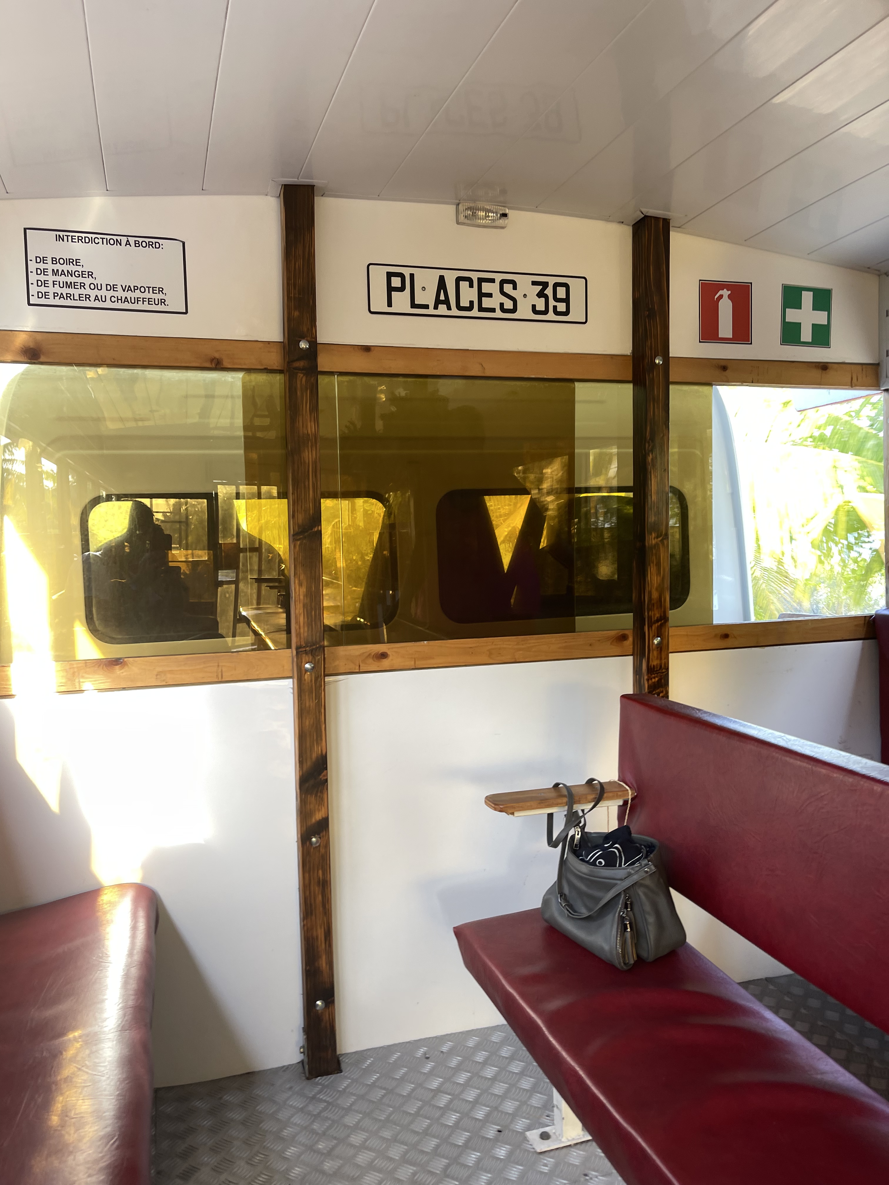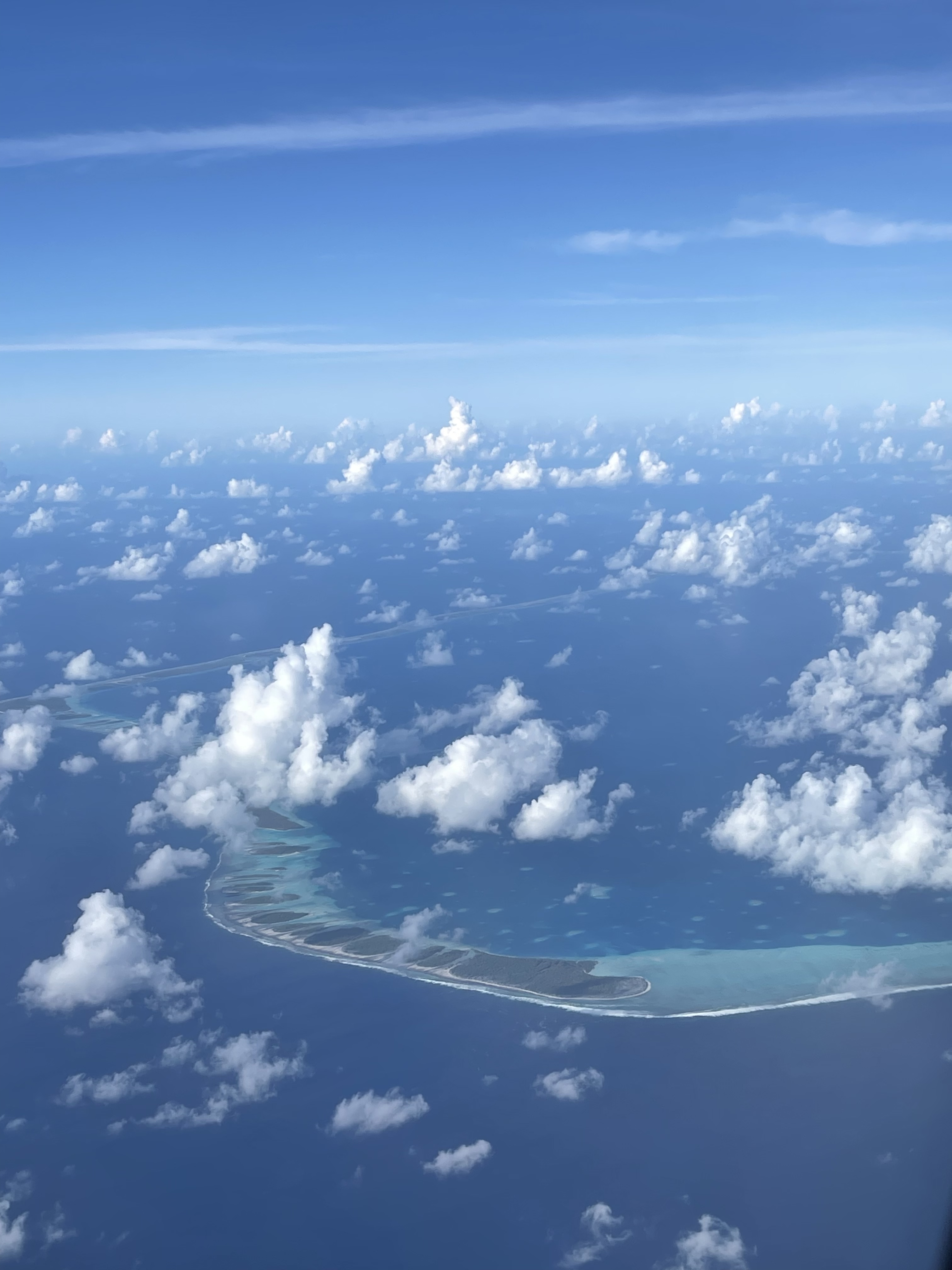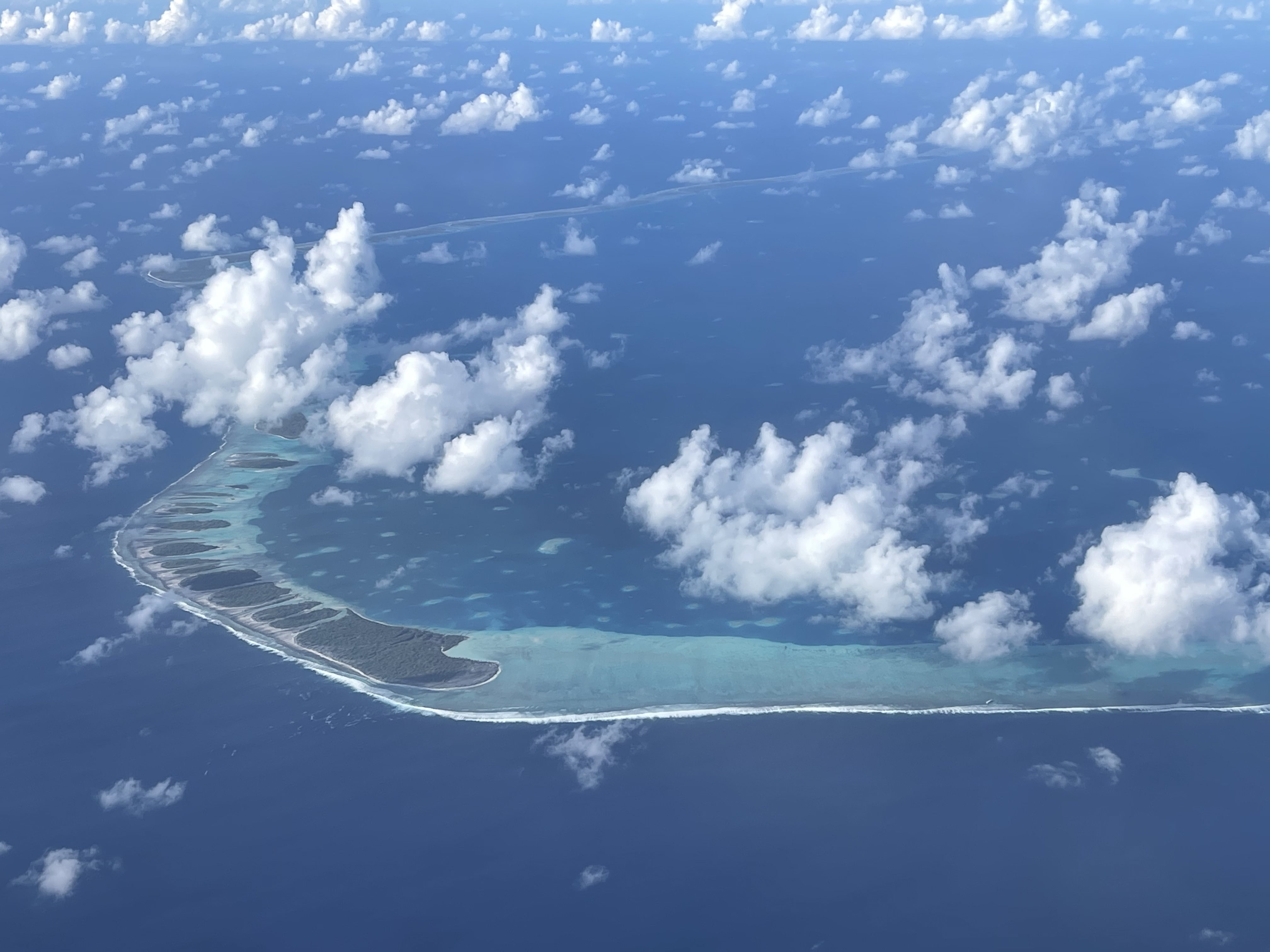 On embarque avec 15 minutes d’avance aujourd’hui, une fois n’est pas coutume. Pour les vues sur Rangiroa, c’est raté, on est du mauvais coté de l’appareil. par contre, au fur et à mesure du vol, on peut admirer du ciel les îles et lagons d’Arutua et d’Apataki. C’est magique. Arrivée sans problème à Fakarava où on prend le bus pour rejoindre le quai où Françoise nous attend. Ah oui, le bus est assez spécial ici…