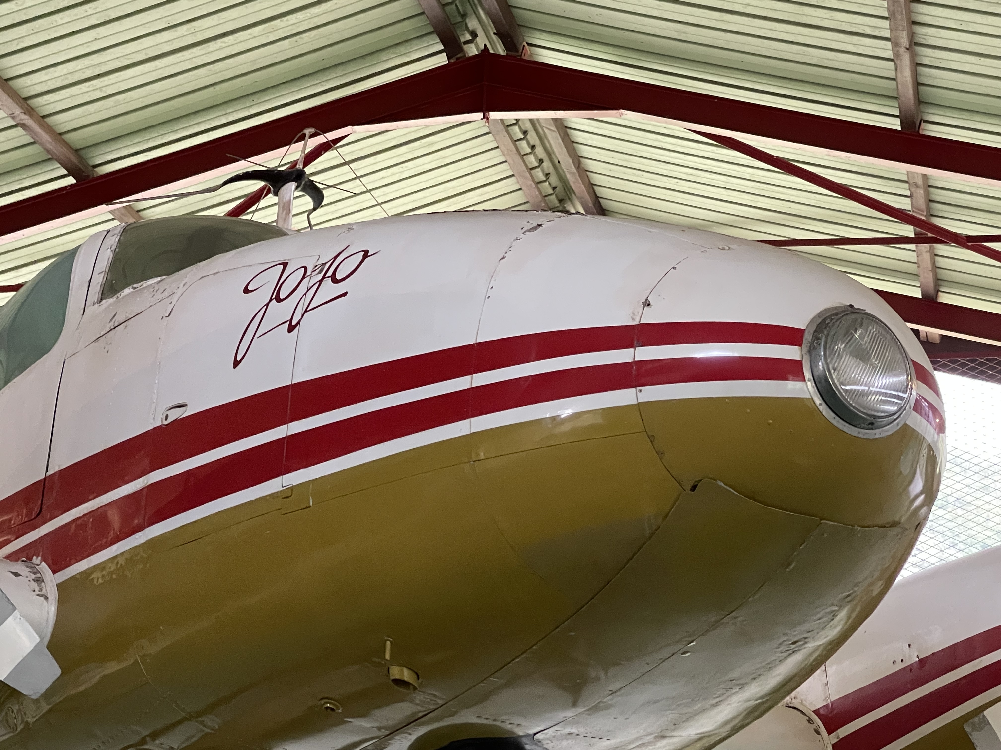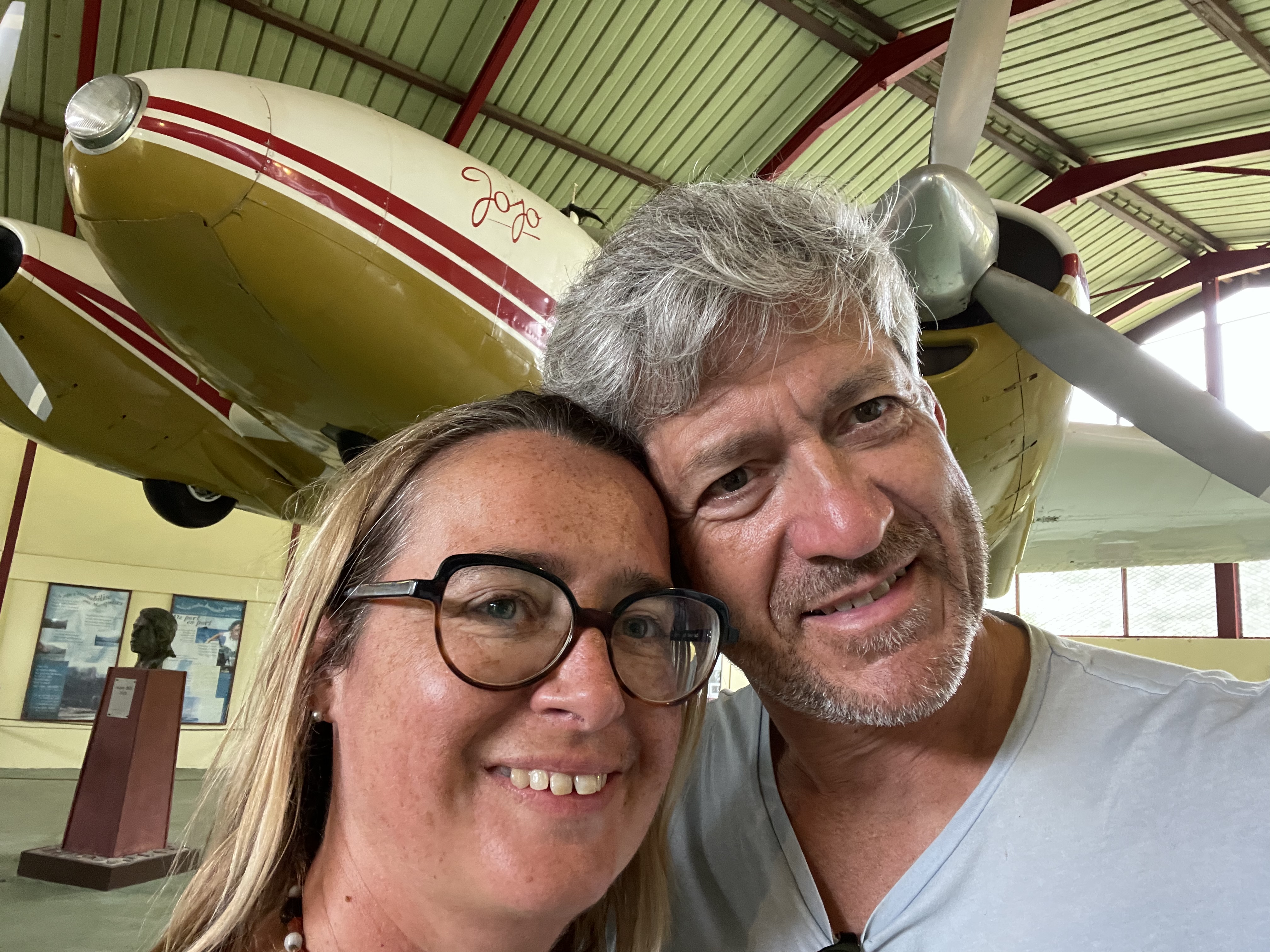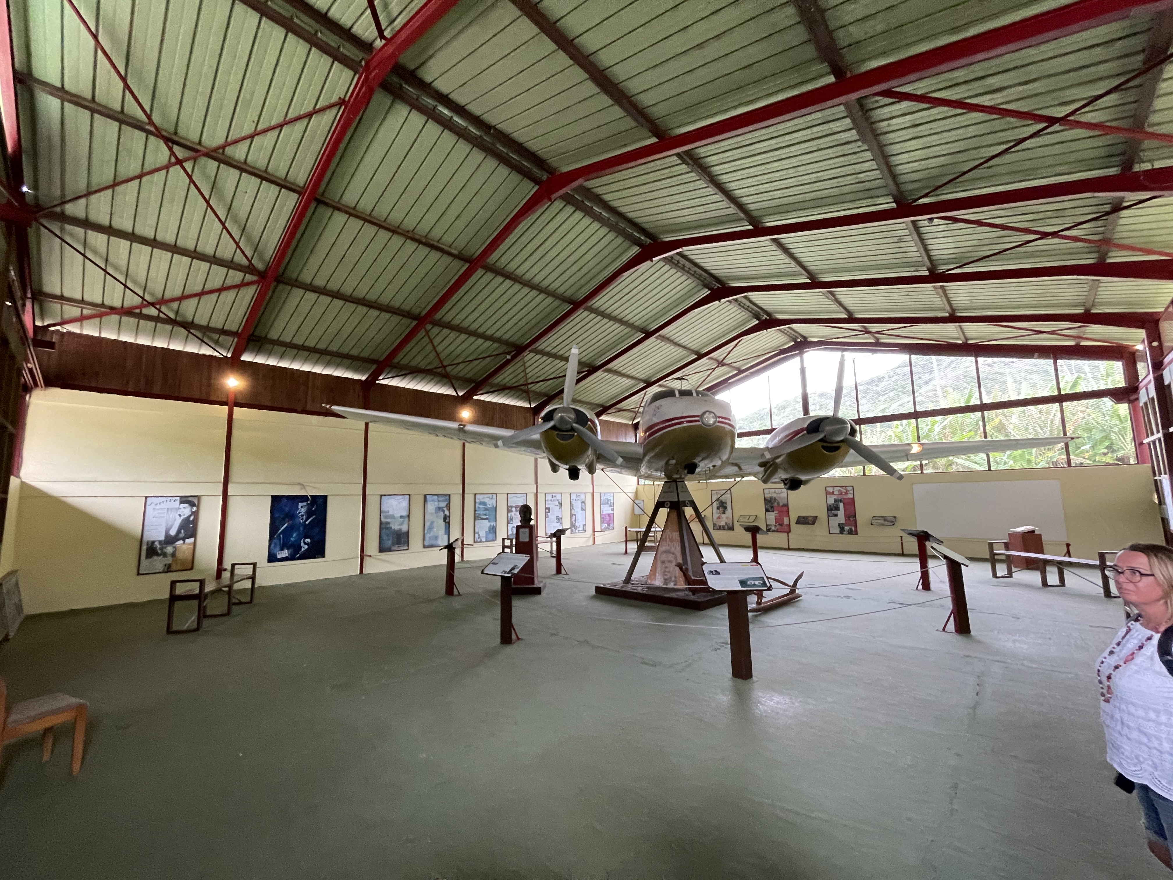 Nous poursuivons par l’espace consacré à Jacques Brel et sommes surpris car il s’agit d’un modeste hangar au toit vert à l’écart du centre culturel. Dès que nous approchons, nous entendons une de ses chansons. A l’intérieur, son avion baptisé Jojo, en hommage à un de ses amis décédé, a trouvé sa place même s’il ne vole plus. Cet avion a largement contribué à la légende de Brel aux Marquises. En effet, il l’utilisait pour rapporter du courrier, de la nourriture, des urgences médicales. C’est un moment fort, les chansons résonnent dans le hangar et Christian est fort ému.