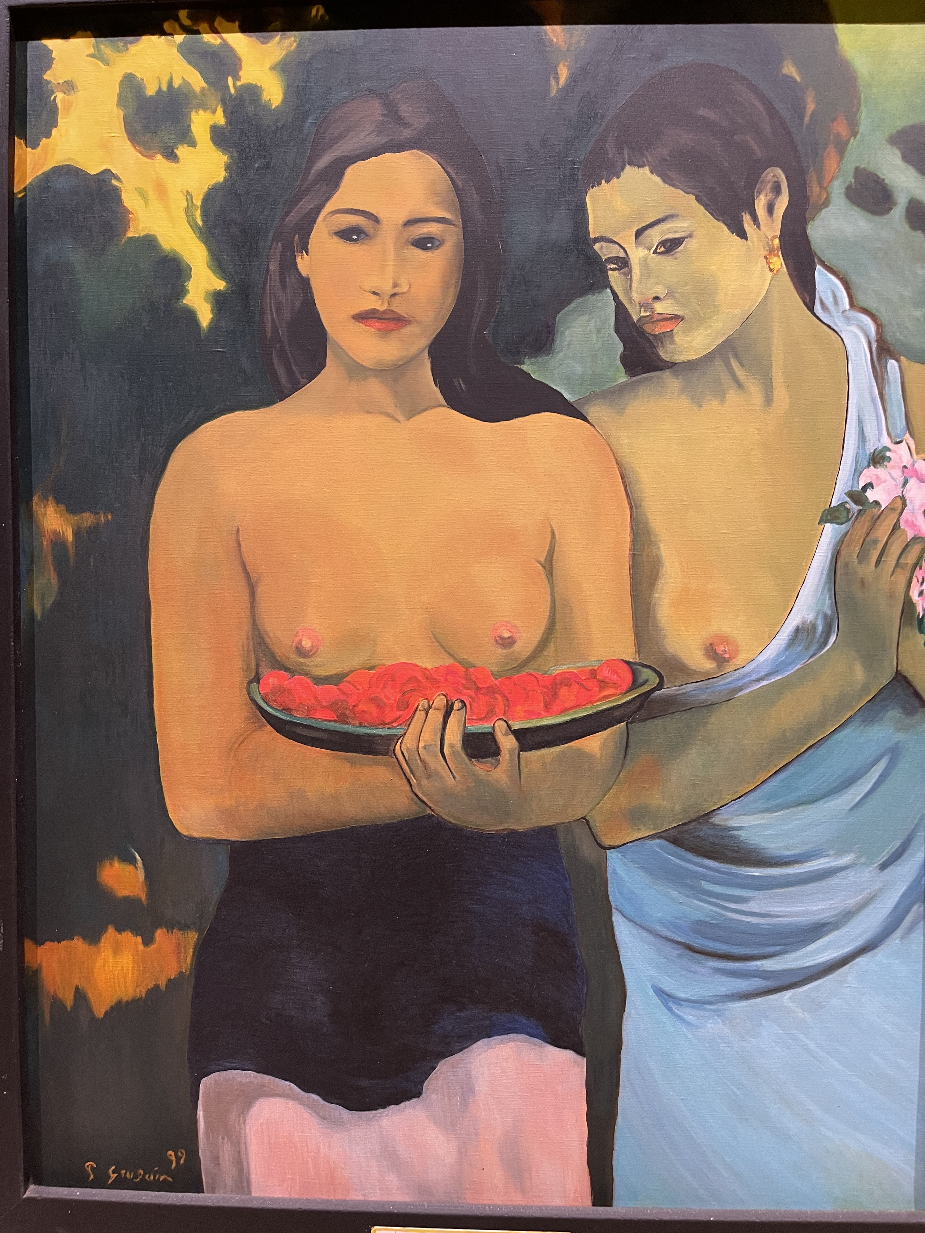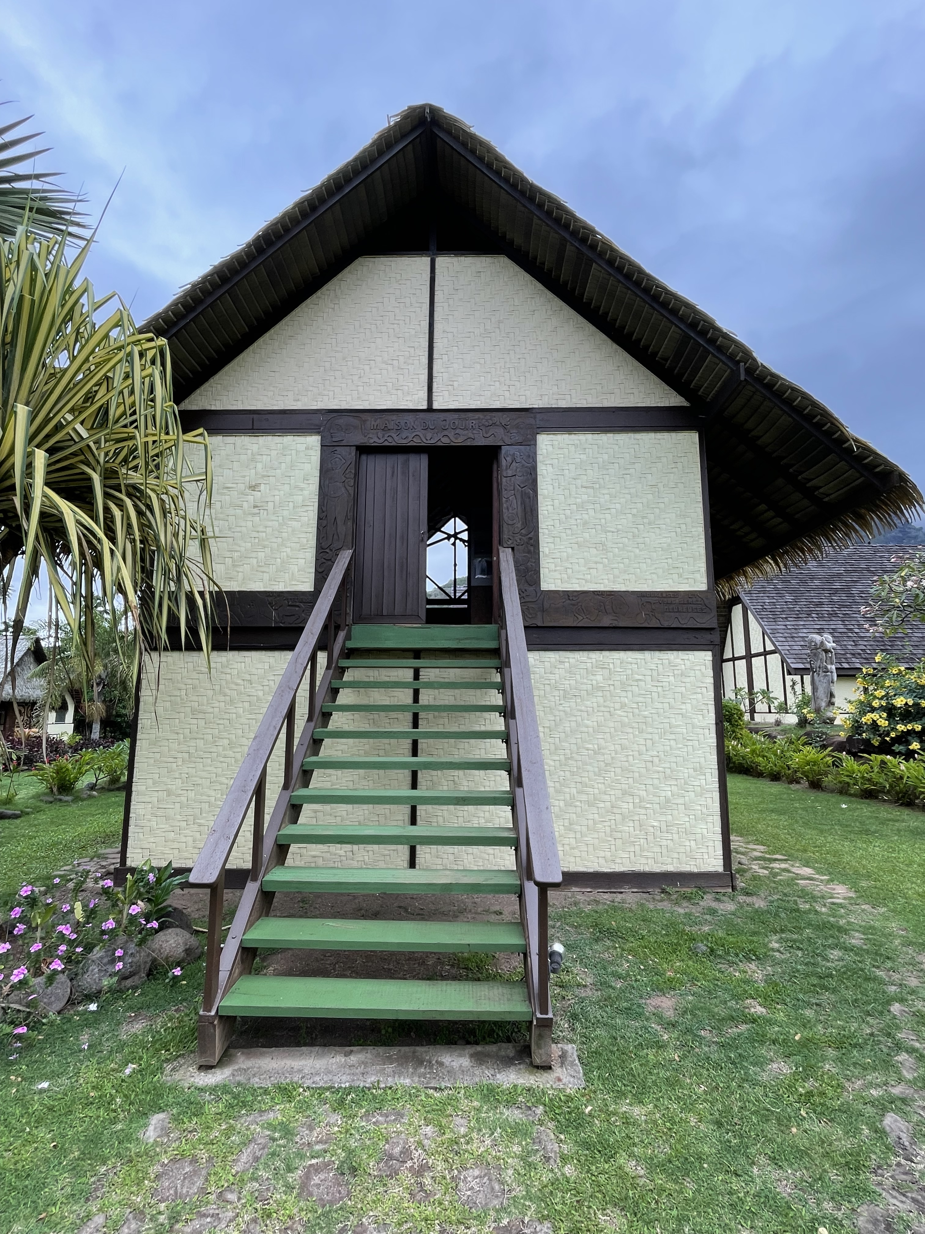 Nous sommes juste à côté, aussi, nous commençons par le Centre Culturel Paul Gauguin qui retrace une partie de l’oeuvre du peintre et montre une reproduction de la maison du Jouir, la maison sur pilotis qu’il fait construire après son arrivée à Hiva Oa en 1901.
