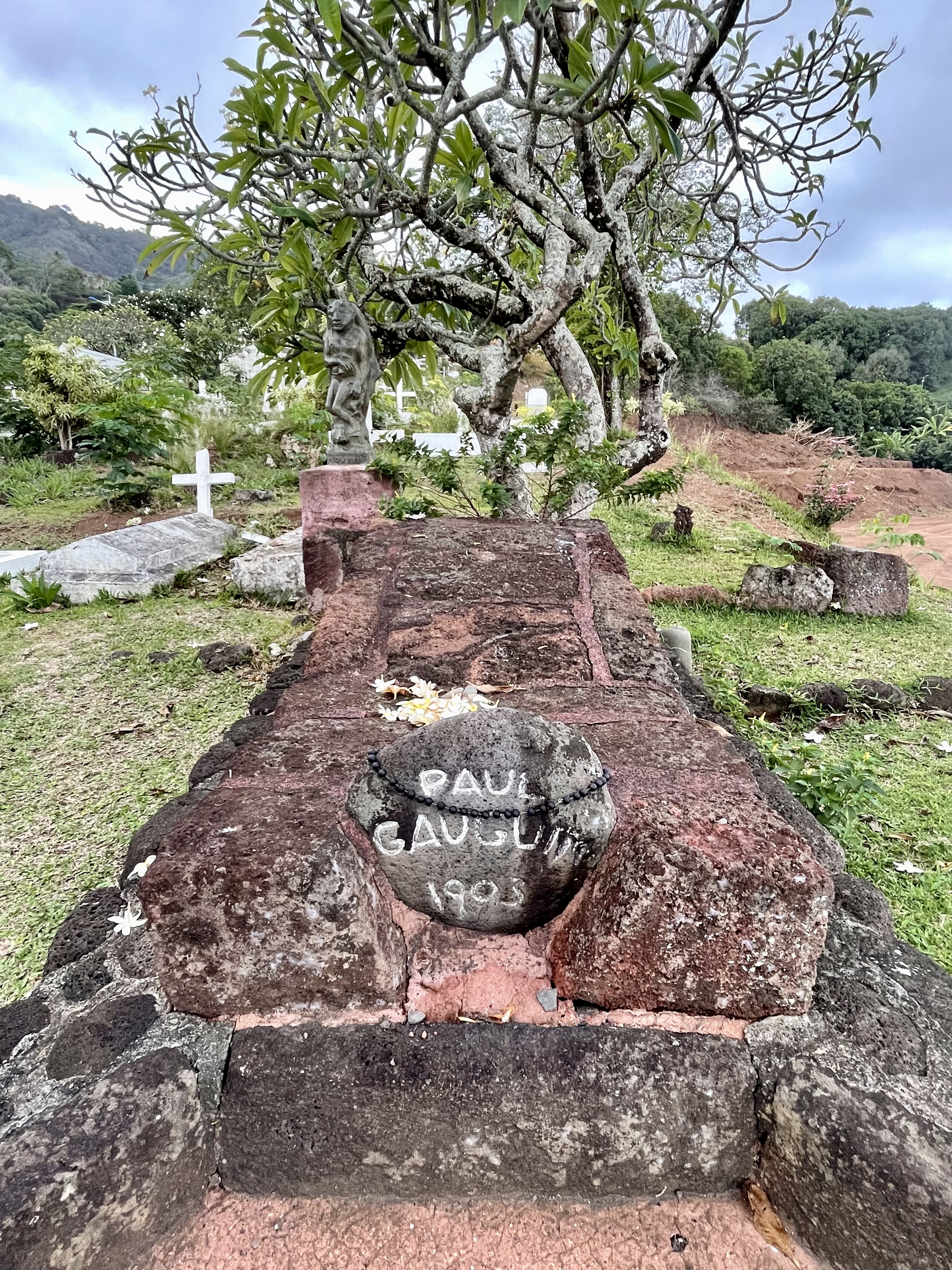 Nous poursuivons par une visite au centre artisanal où nous serons accueillis dans la bonne humeur. Quelques emplettes plus tard, nous nous mettons à la recherche du cimetière. Cela monte pour arriver jusque-là car il est situé sur les hauteurs avec une vue imprenable sur la baie. Brel venait souvent s’asseoir à cet endroit pour boire un verre de vin en regardant le coucher de soleil. Il paraît que certains locaux viennent encore parfois boire un verre à la même heure et laisse le reste de la bouteille sur la tombe pour le grand Jacques. La tombe est recouverte de galets tous dédicacés par les visiteurs. Gauguin se trouve quelques mètres à droite dans une tombe en tuf rouge. Quelques gouttes de pluie se mettent à tomber, il est temps de redescendre vers notre lieu de rendez-vous.