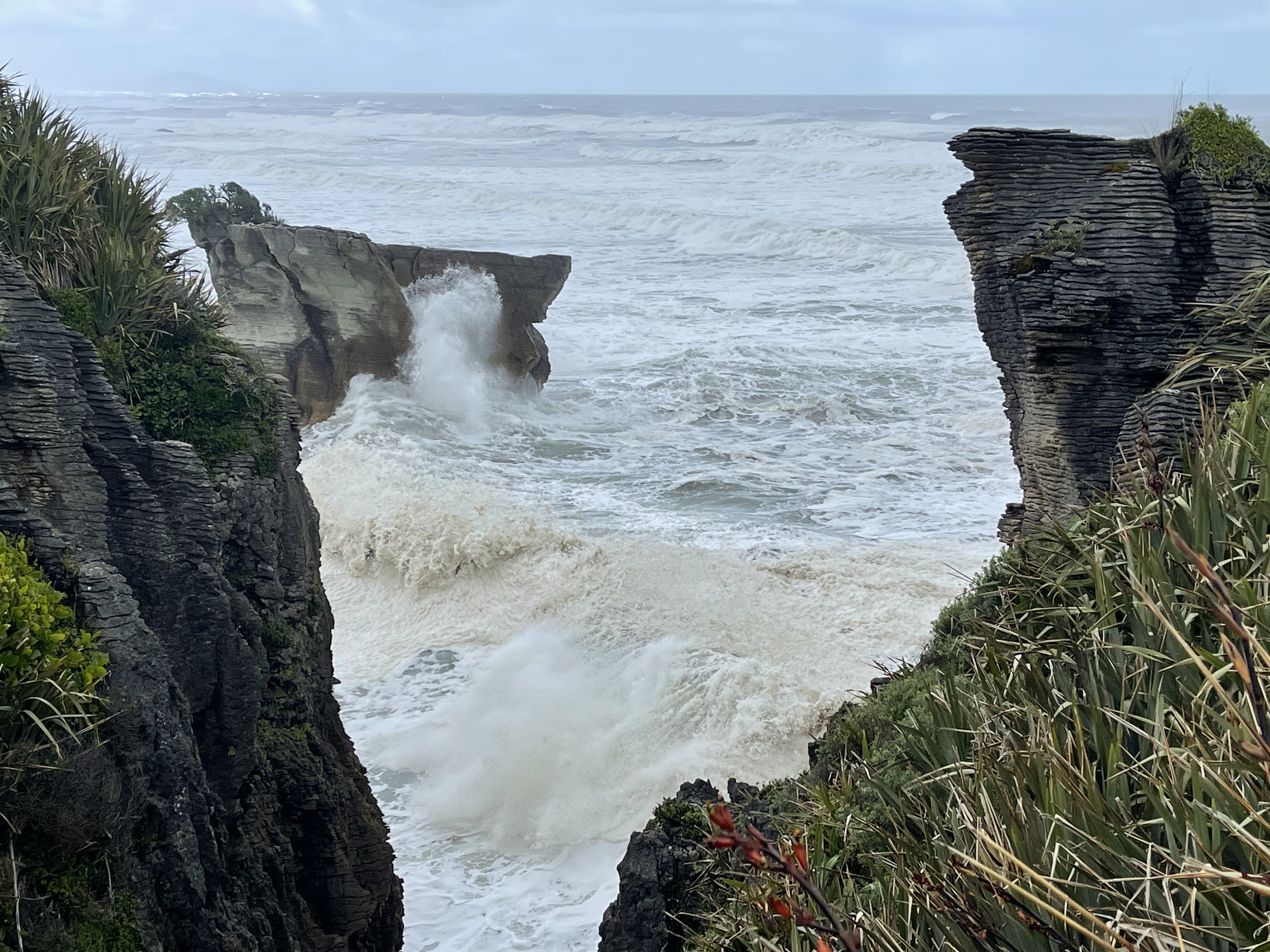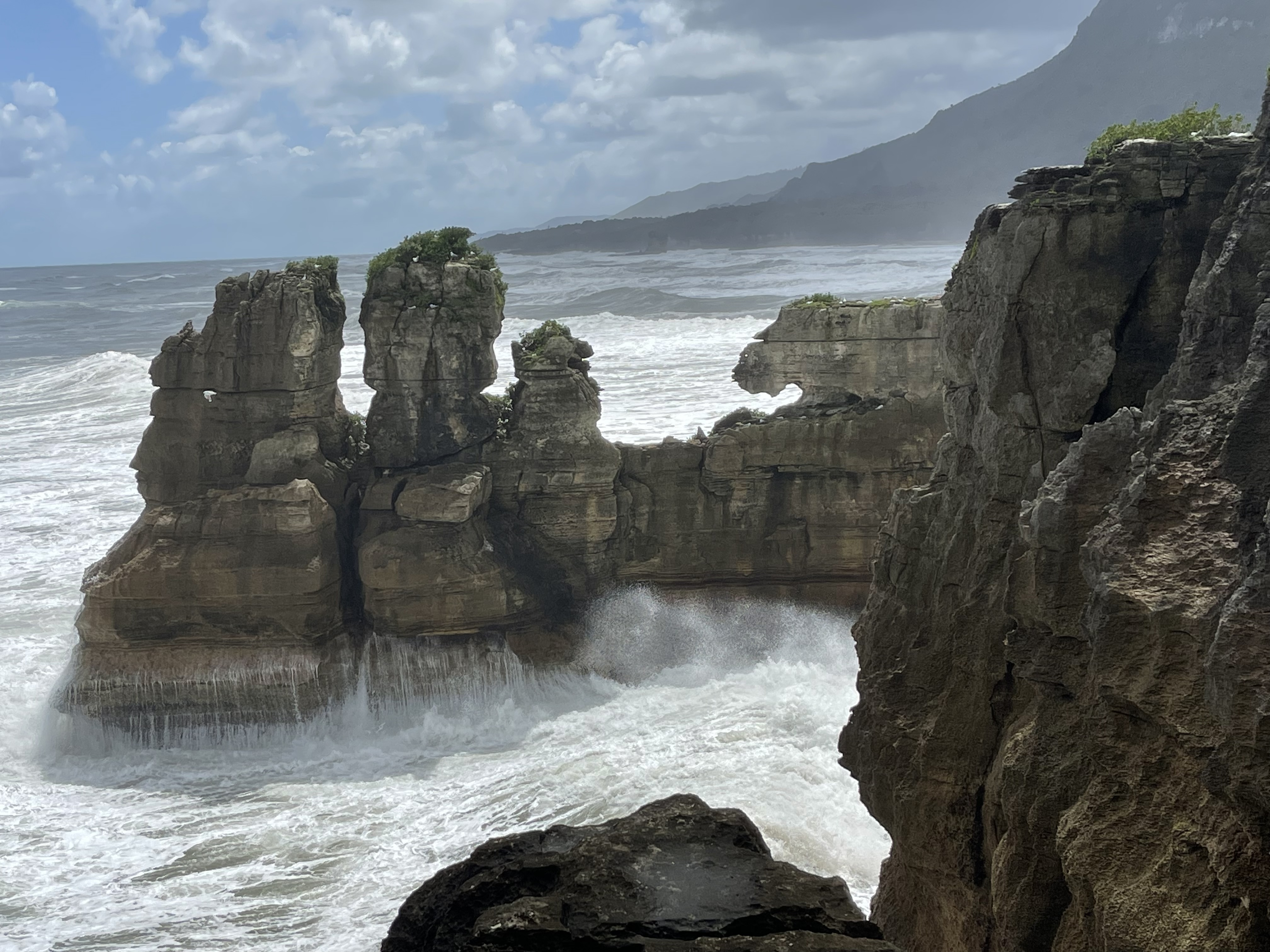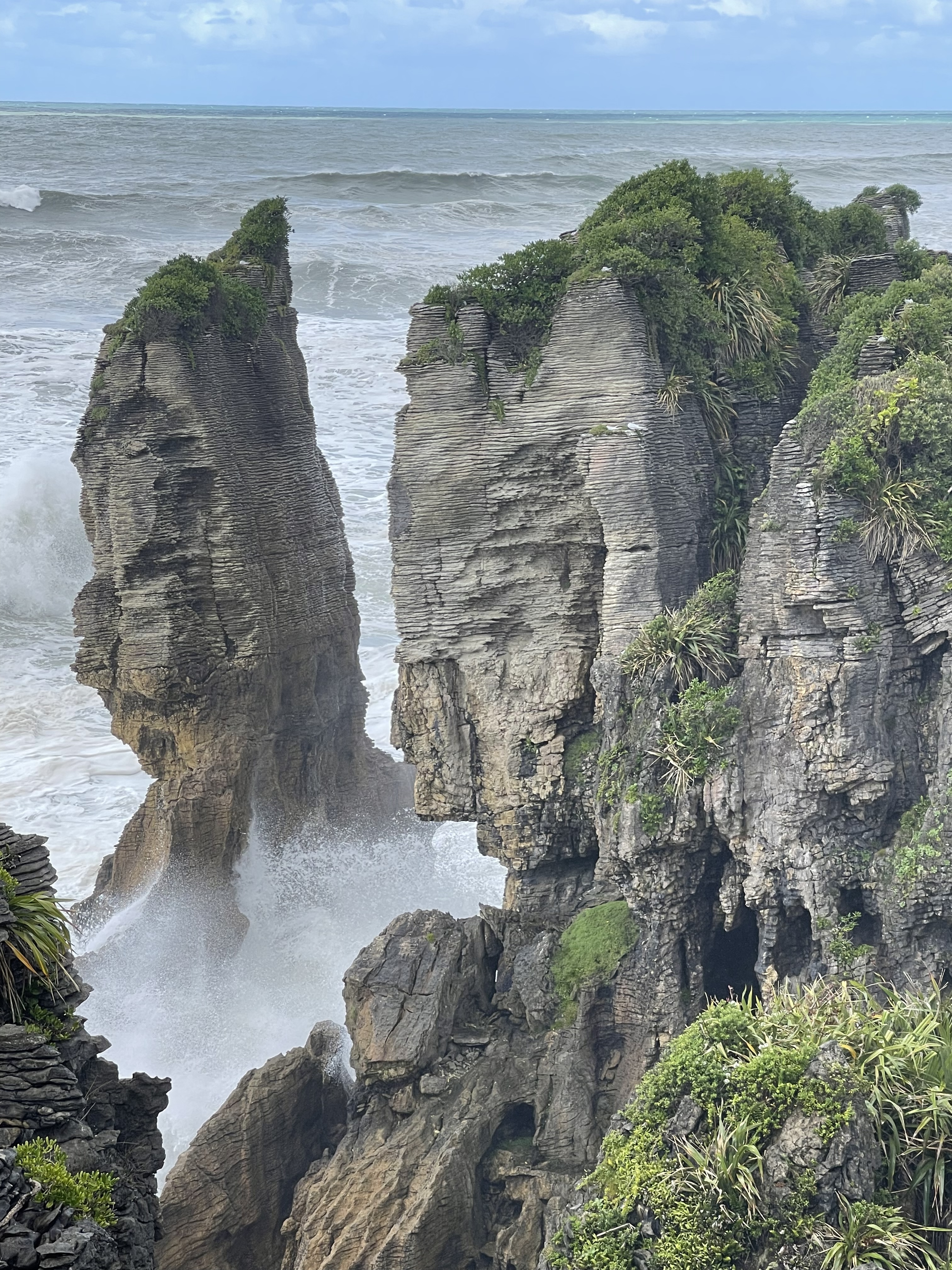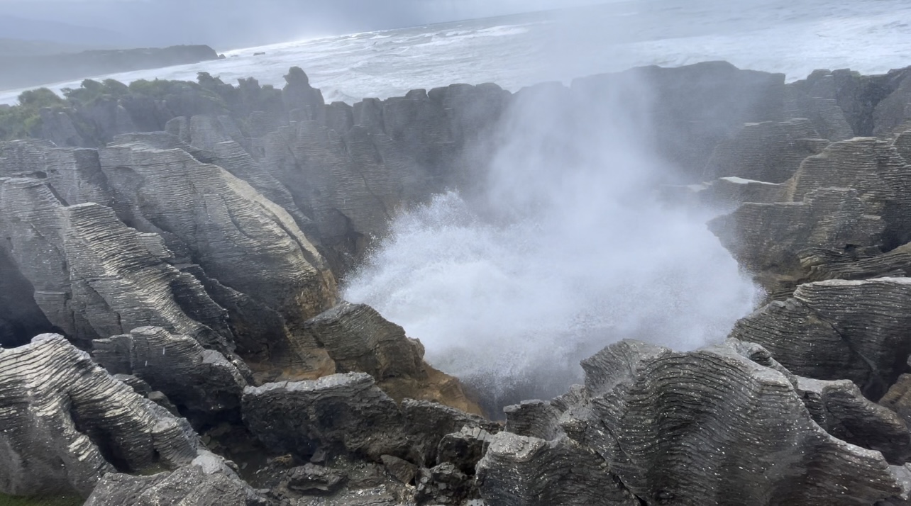 Avant de quitter Punakaiki, nous irons voir les « Pancake rocks », formation de roches calcaires composées des strates superposées faisant penser à une pile de crêpes. La nature a commencé à façonner cette oeuvre d’art il y a environ 30 millions d’années. Couches de calcaire dur et de grès tendre se sont superposées au fil du temps au fond de l’océan. L’activité sismique les a ensuite soulevées; pluie et vent sont alors entrés en action et ont commencé à éroder les parties les plus tendres pour laisser la place à ces falaises composées de centaines de tranches horizontales.