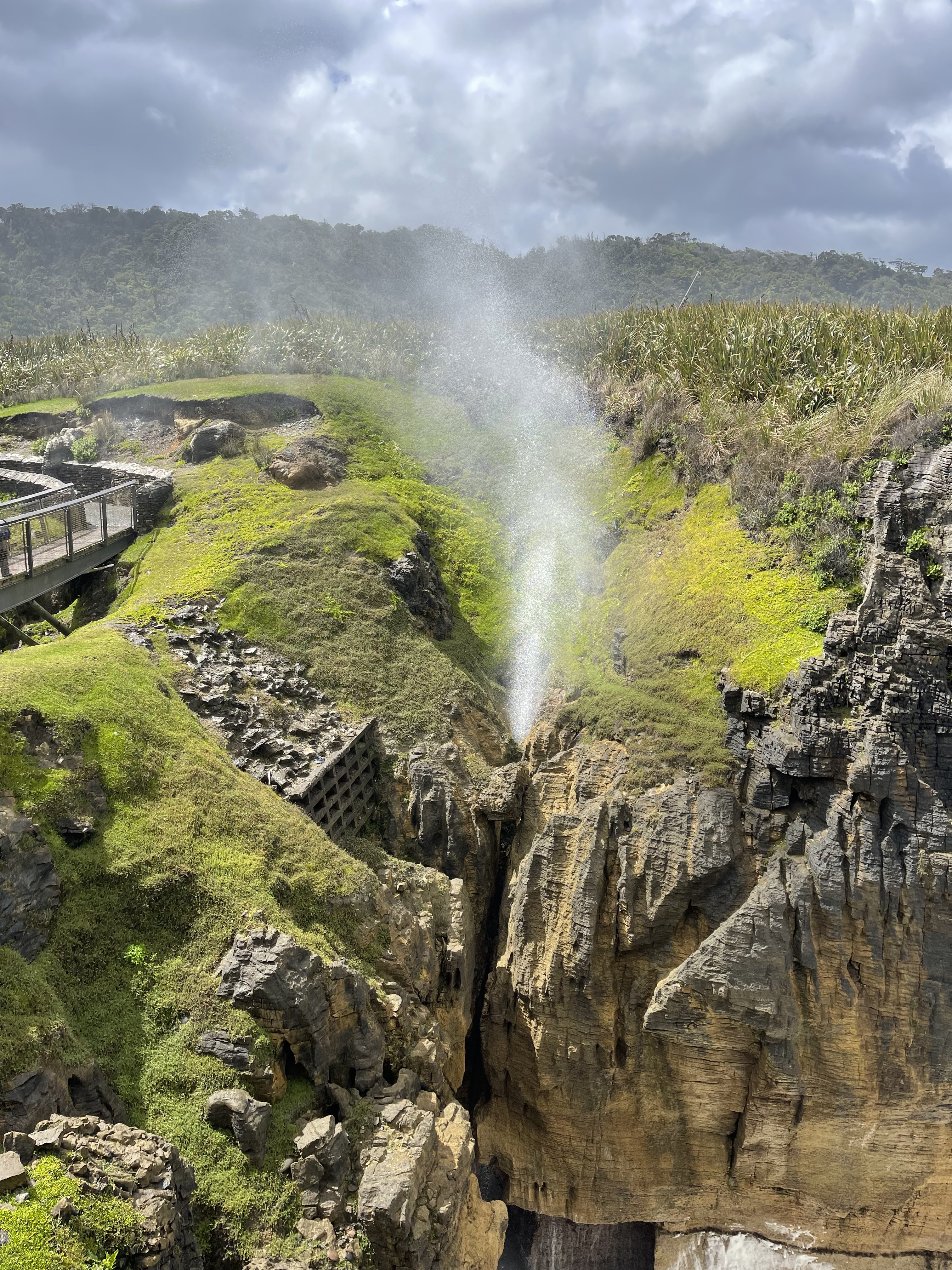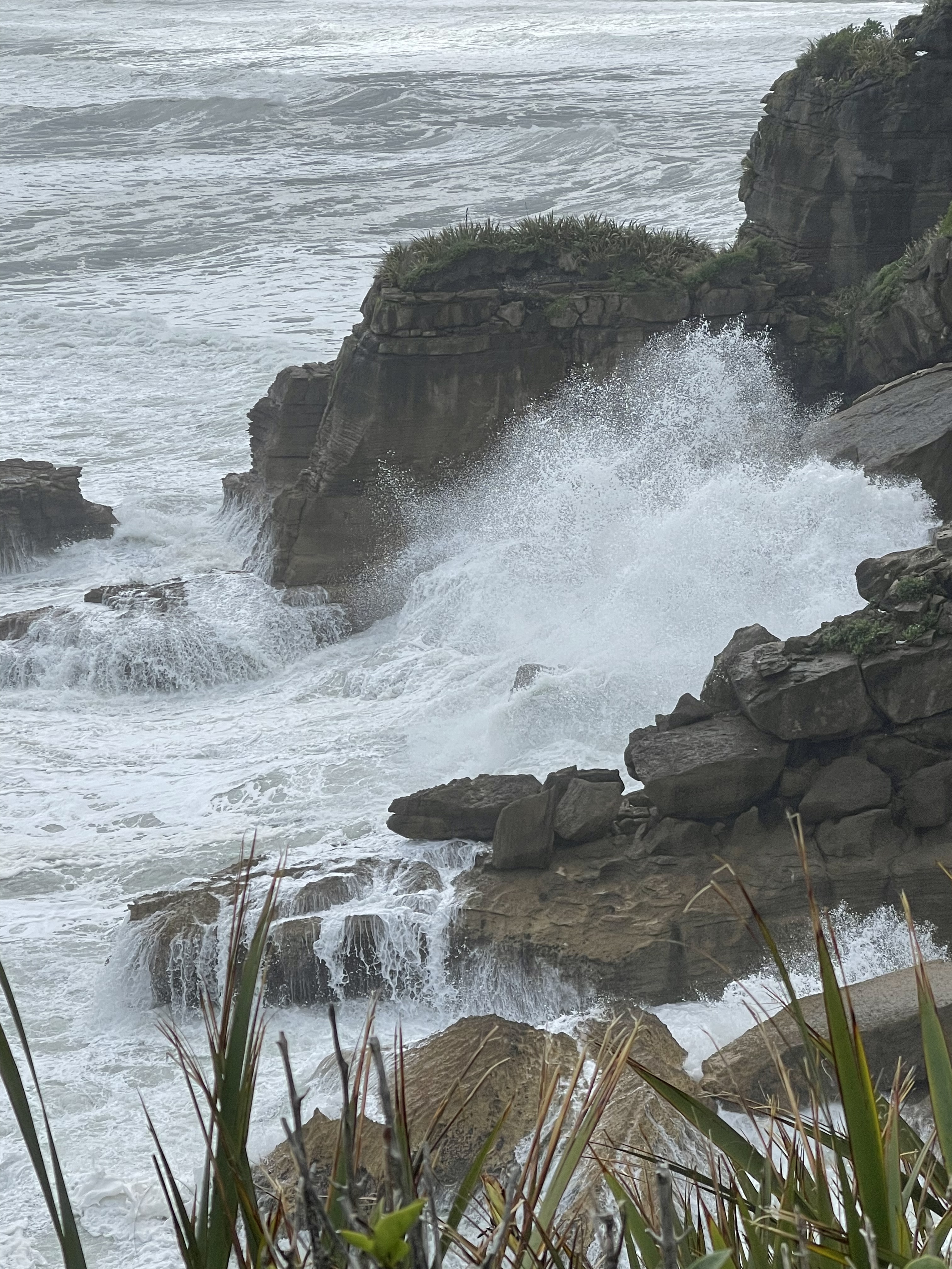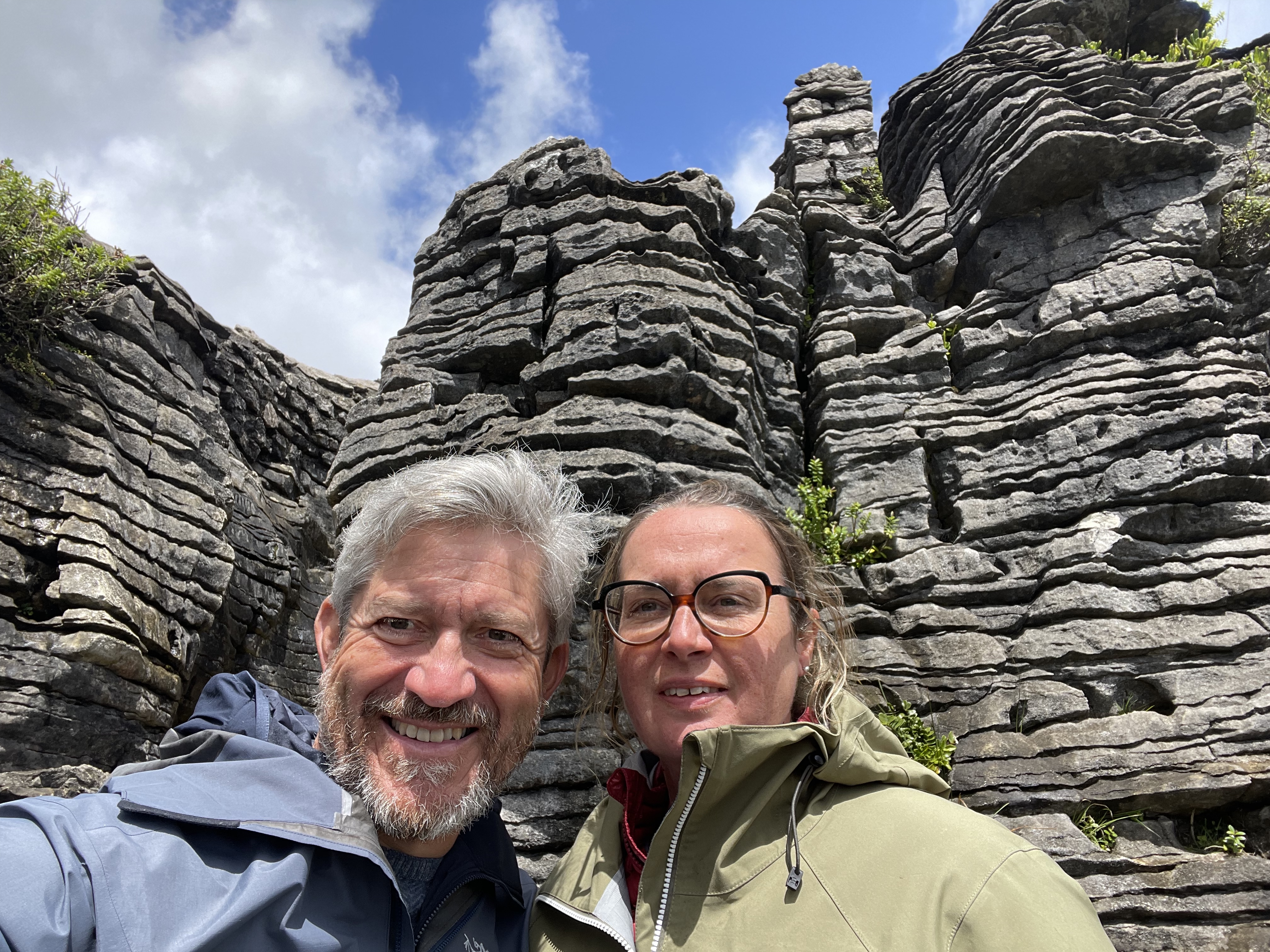 Avant de quitter Punakaiki, nous irons voir les « Pancake rocks », formation de roches calcaires composées des strates superposées faisant penser à une pile de crêpes. La nature a commencé à façonner cette oeuvre d’art il y a environ 30 millions d’années. Couches de calcaire dur et de grès tendre se sont superposées au fil du temps au fond de l’océan. L’activité sismique les a ensuite soulevées; pluie et vent sont alors entrés en action et ont commencé à éroder les parties les plus tendres pour laisser la place à ces falaises composées de centaines de tranches horizontales.