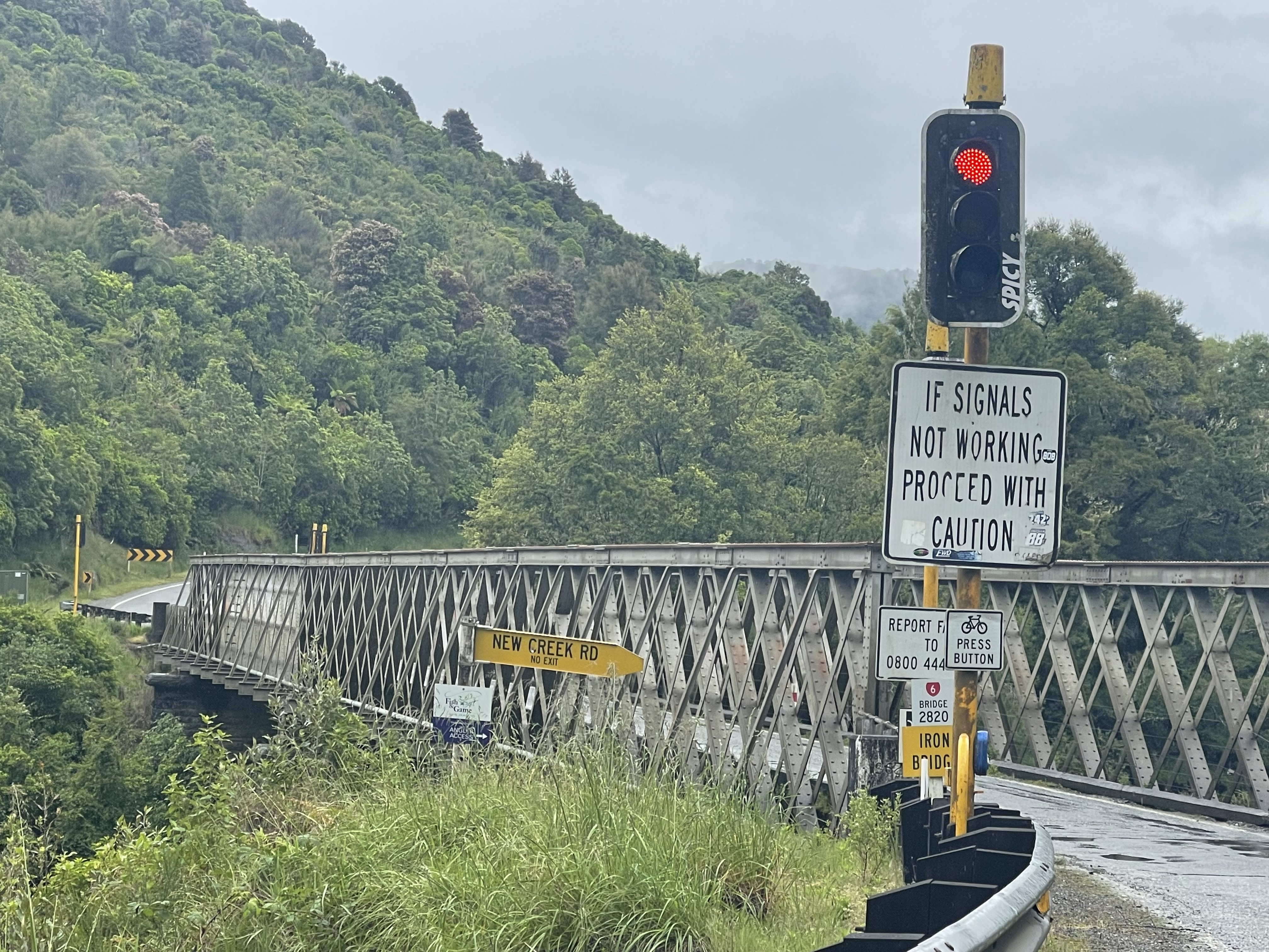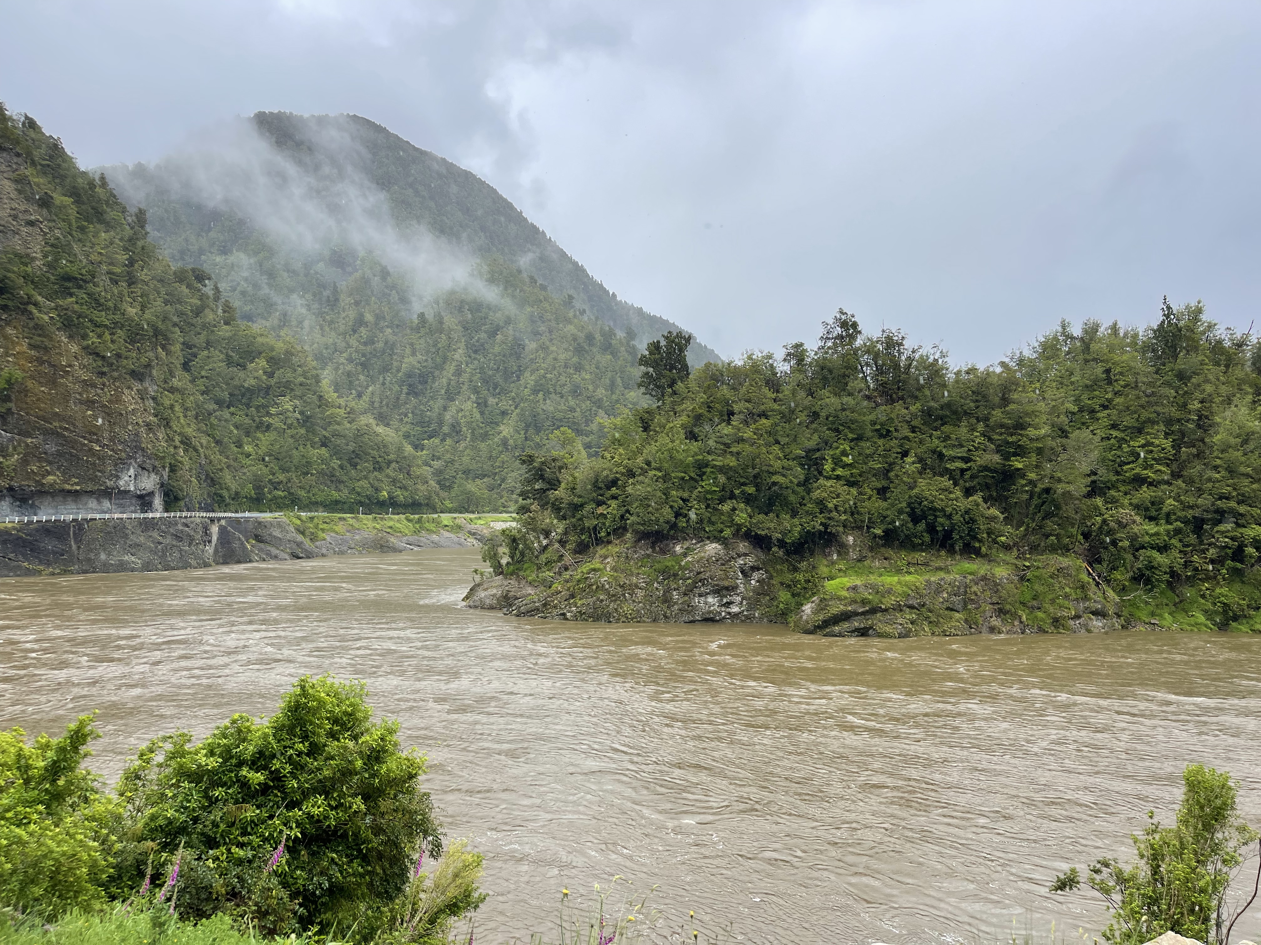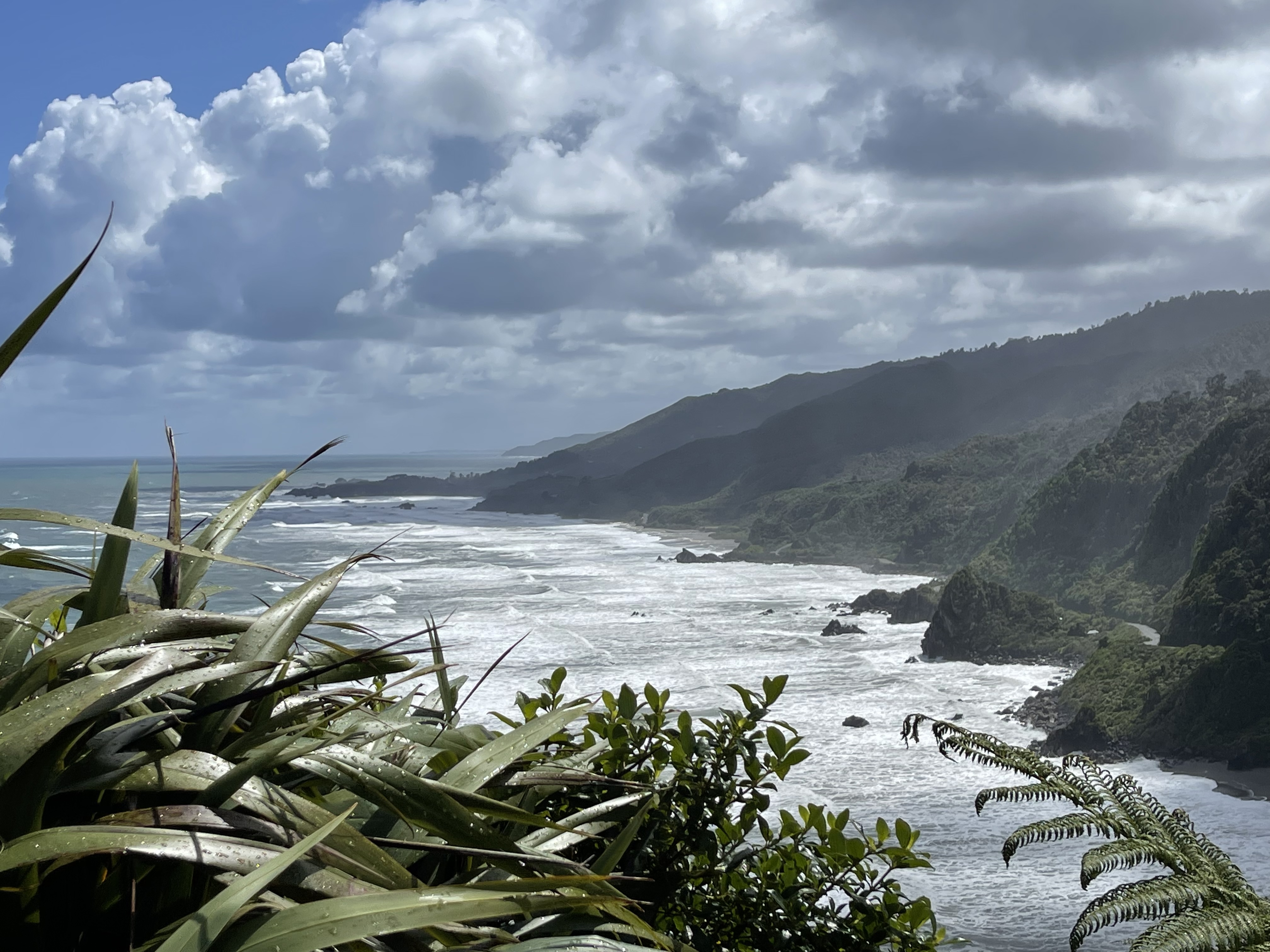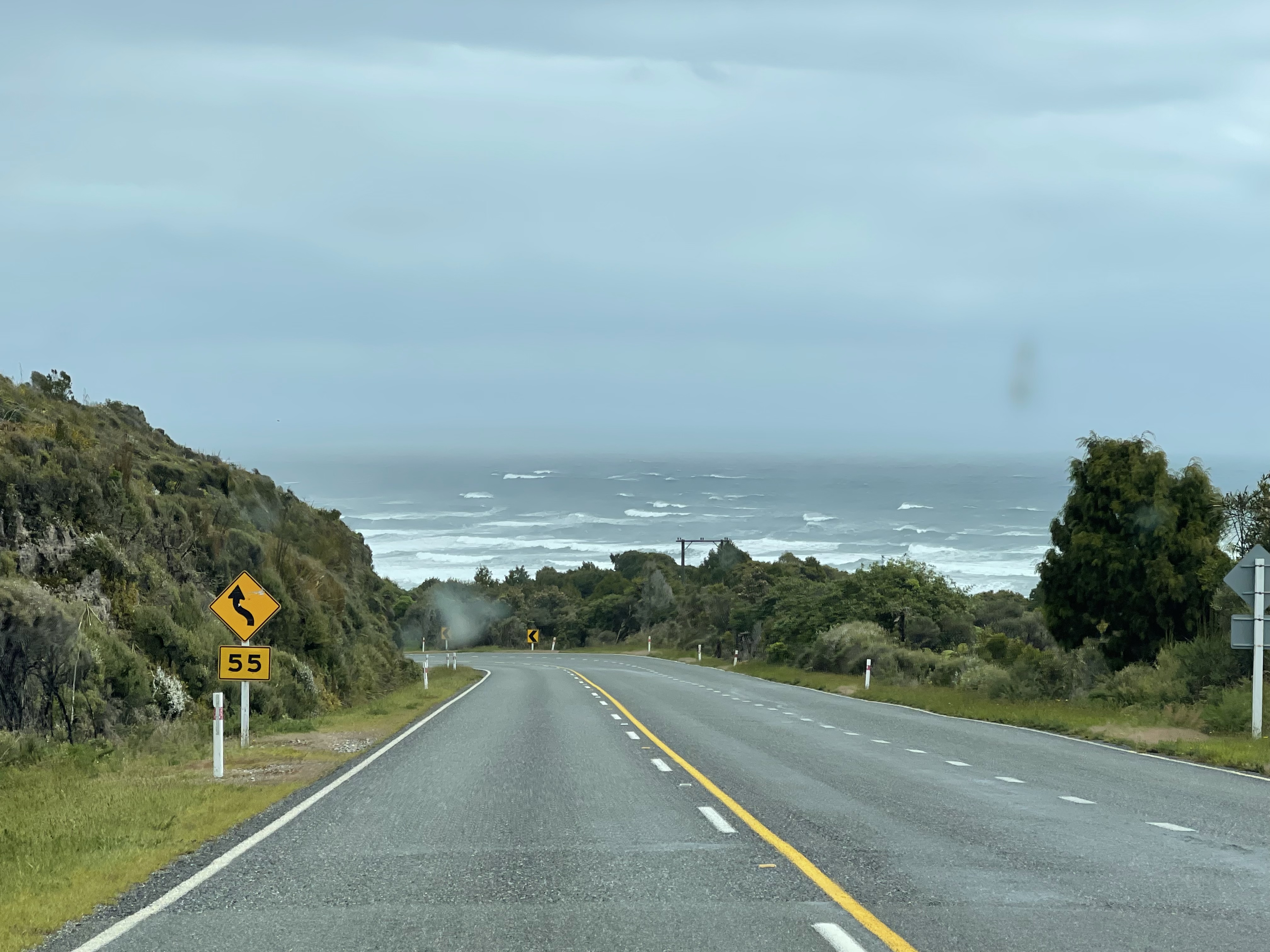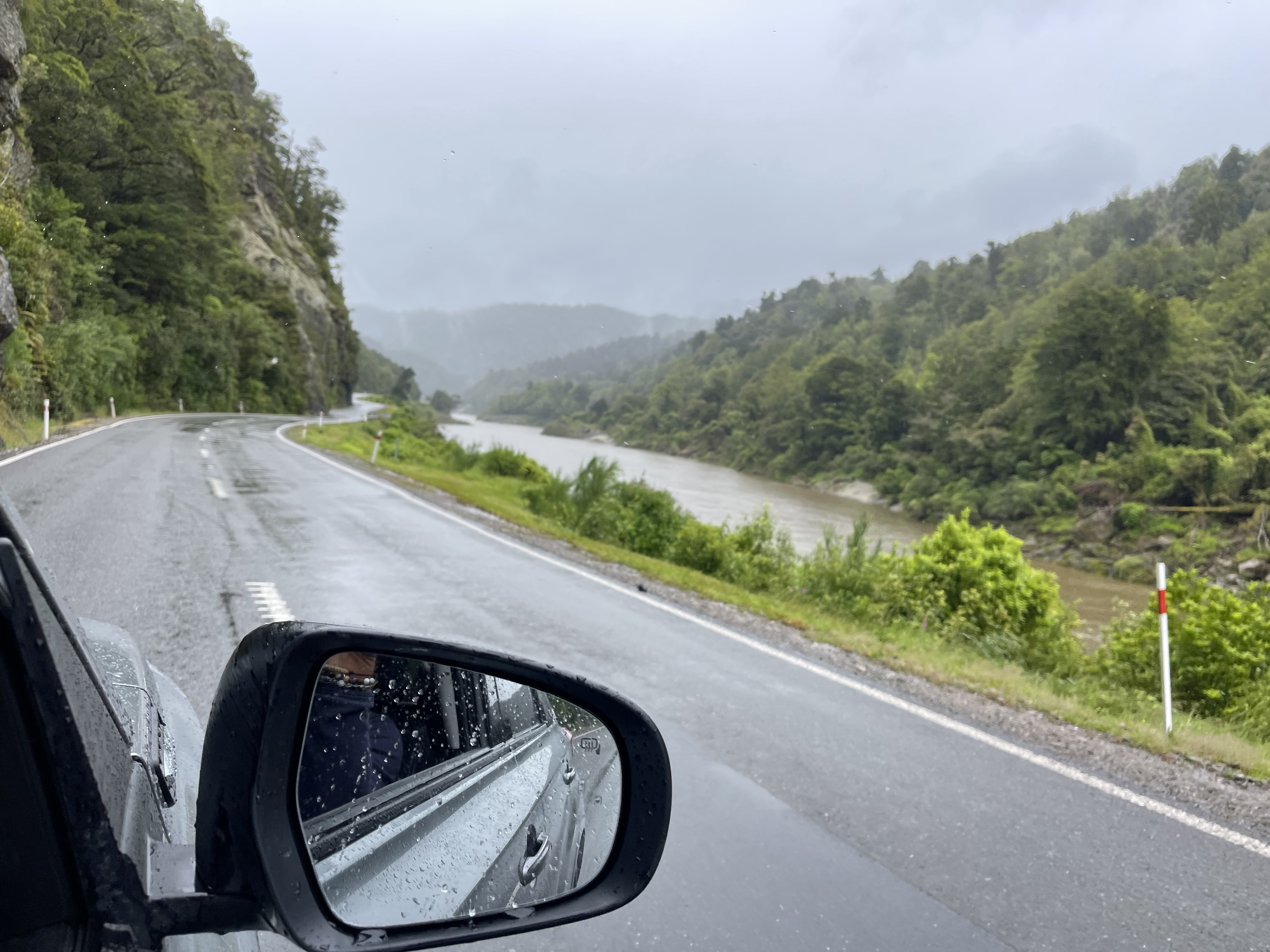 L’île est grande et les étapes s’allongent; 4h30 aujourd’hui et presque sans étape car le temps n’est pas de la partie. Mais, ca y est, nous avons à présent atteint la côte ouest qui fait face à la mer de Tasman. On nous avait dit que la côte ouest était humide; on le vit en direct. La température a bien chuté et l’humidité renforce encore cette sensation de froid. Mais l’humidité est parfaite pour la forêt tropicale et nous avons le sentiment de traverser des paysages dignes de Jurassic Park. Peu de trafic sur cette route, l’occasion pour moi d’observer plusieurs kiwis. Les locaux semblent bien habitués à ce climat car les portes des restaurants restent grandes ouvertes. Le potage pourtant servi très chaud ne parviendra pas à me réchauffer…