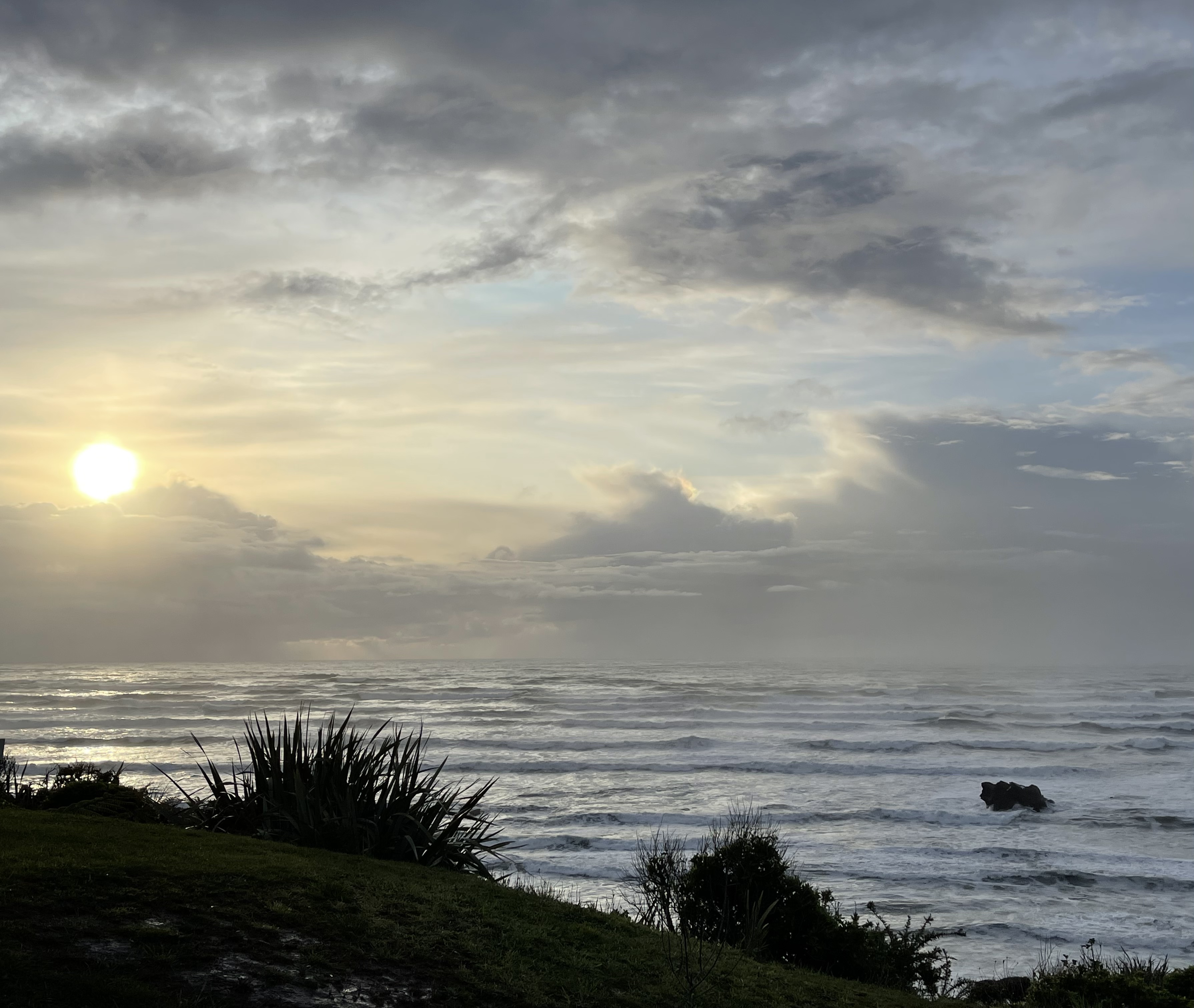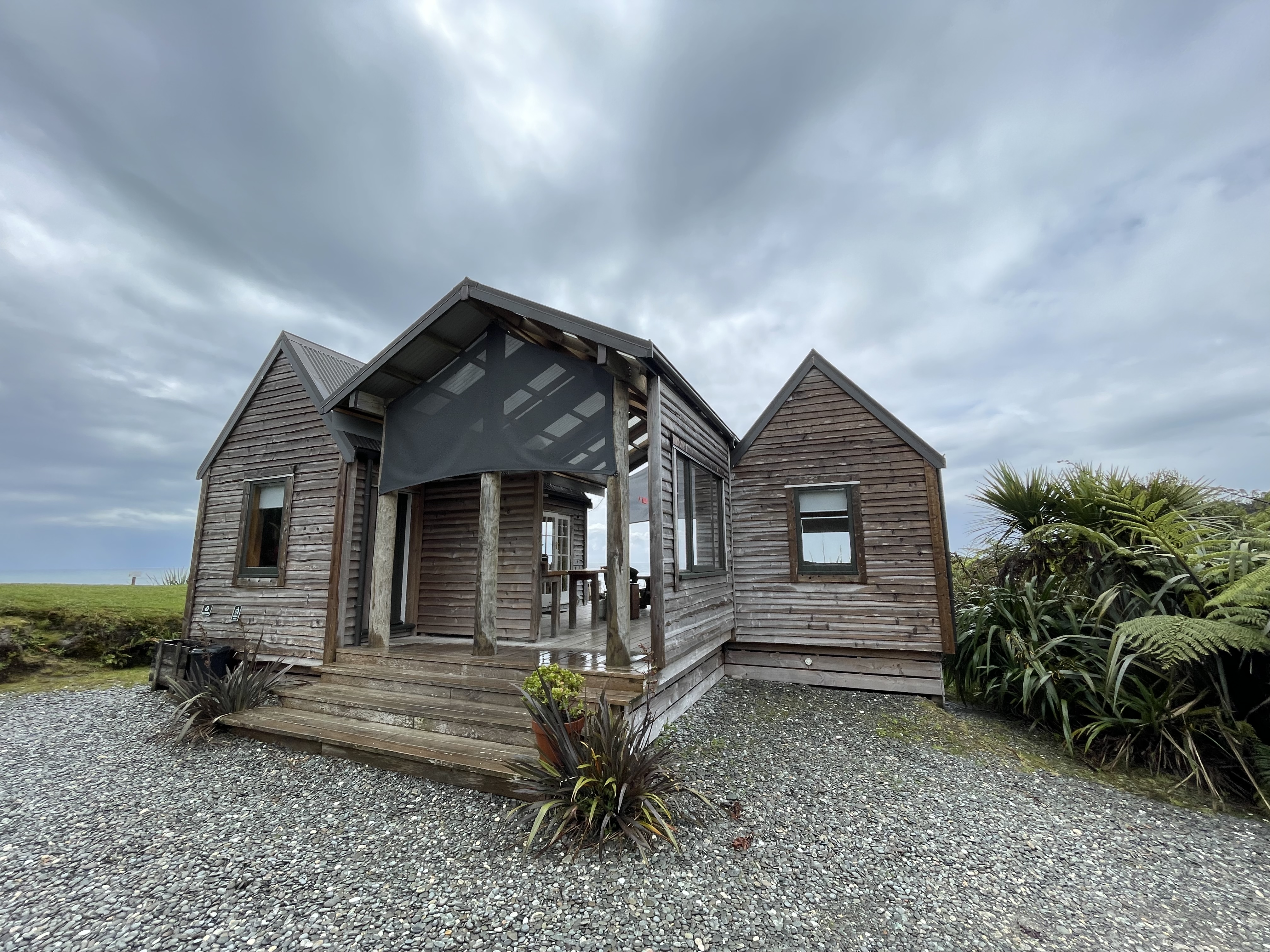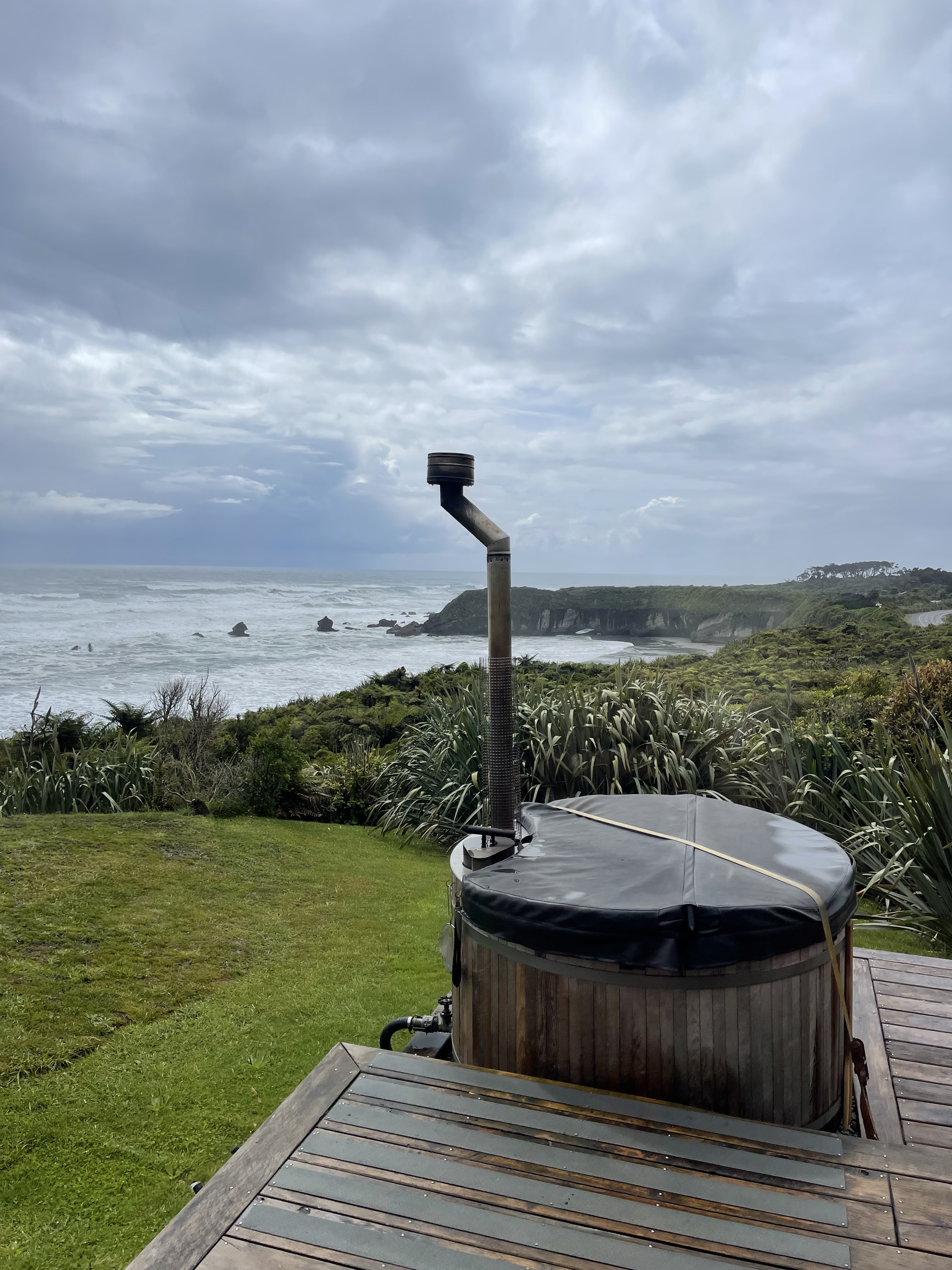 Une nuit seulement pour Punakaiki où l’on a choisi de faire une expérience de glamping. Pas d’internet, pas de TV, cuisine extérieure heureusement abritée sous un toit et passage par l’extérieur obligé par rejoindre douche et wc. Néanmoins, la vue exceptionnelle, le poêle à bois et le bain d’eau chaude face à la mer compensent largement. Les vagues sont impressionnantes pas tant par leur taille que par leur force; elles s’écrasent bruyamment sur la plage. Nous profitons de la vue, passons une soirée au coin du feu en écoutant de la musique.