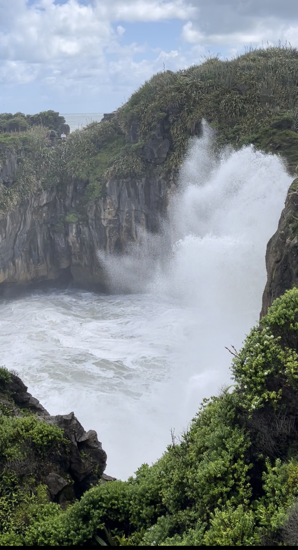 Ici aussi, la mer se déchaîne et les vagues viennent se fracasser violemment sur les rochers les sculptant encore ainsi chaque jour davantage. L’eau s’engouffre aussi dans les tunnels horizontaux créés par le martèlement de l’océan et des conduits d’aération verticaux créés par la pluie. A marée haute, c’est l’occasion d’observer des colonnes d’eau propulsées vers le ciel, les éléments en action…