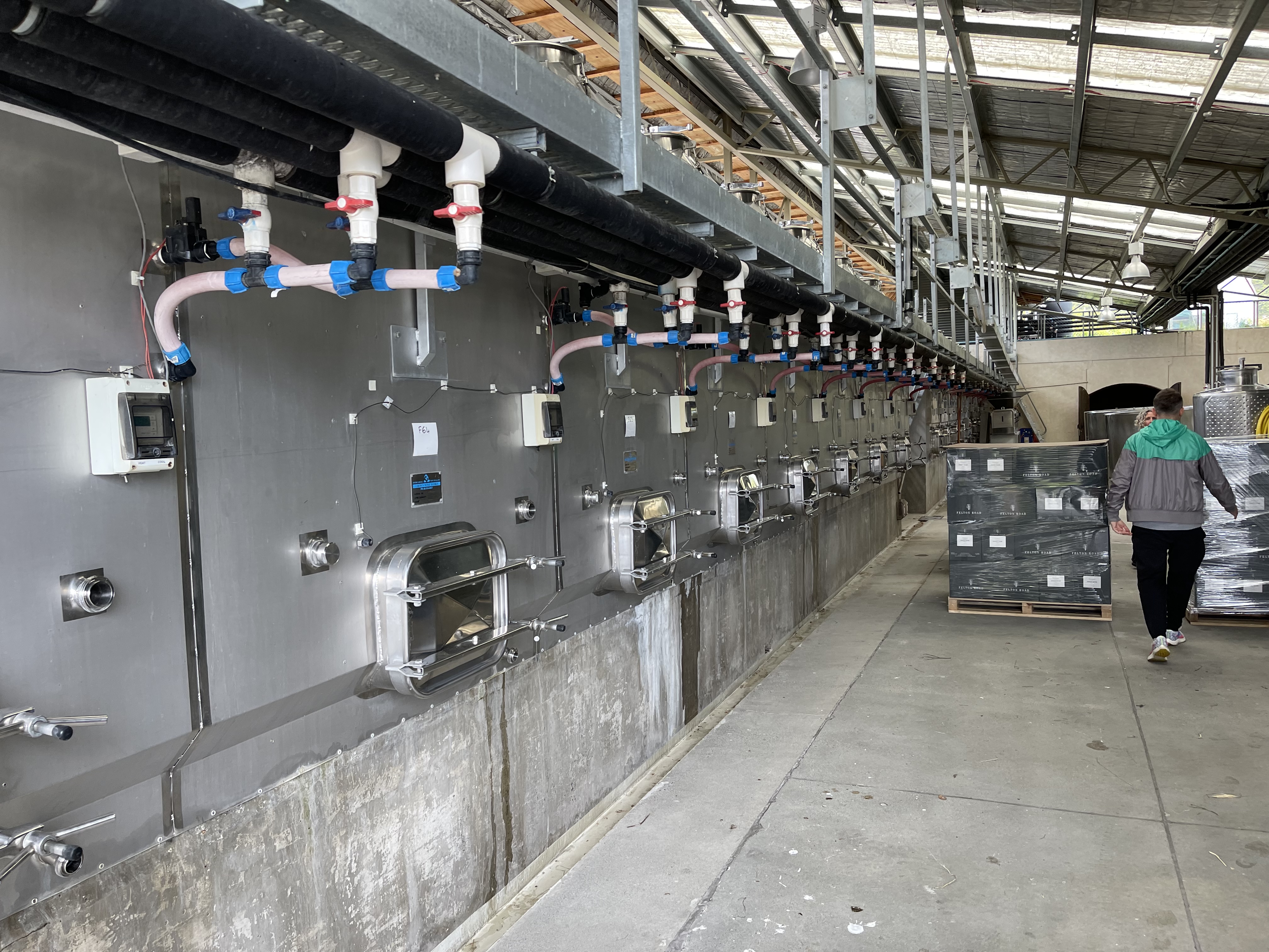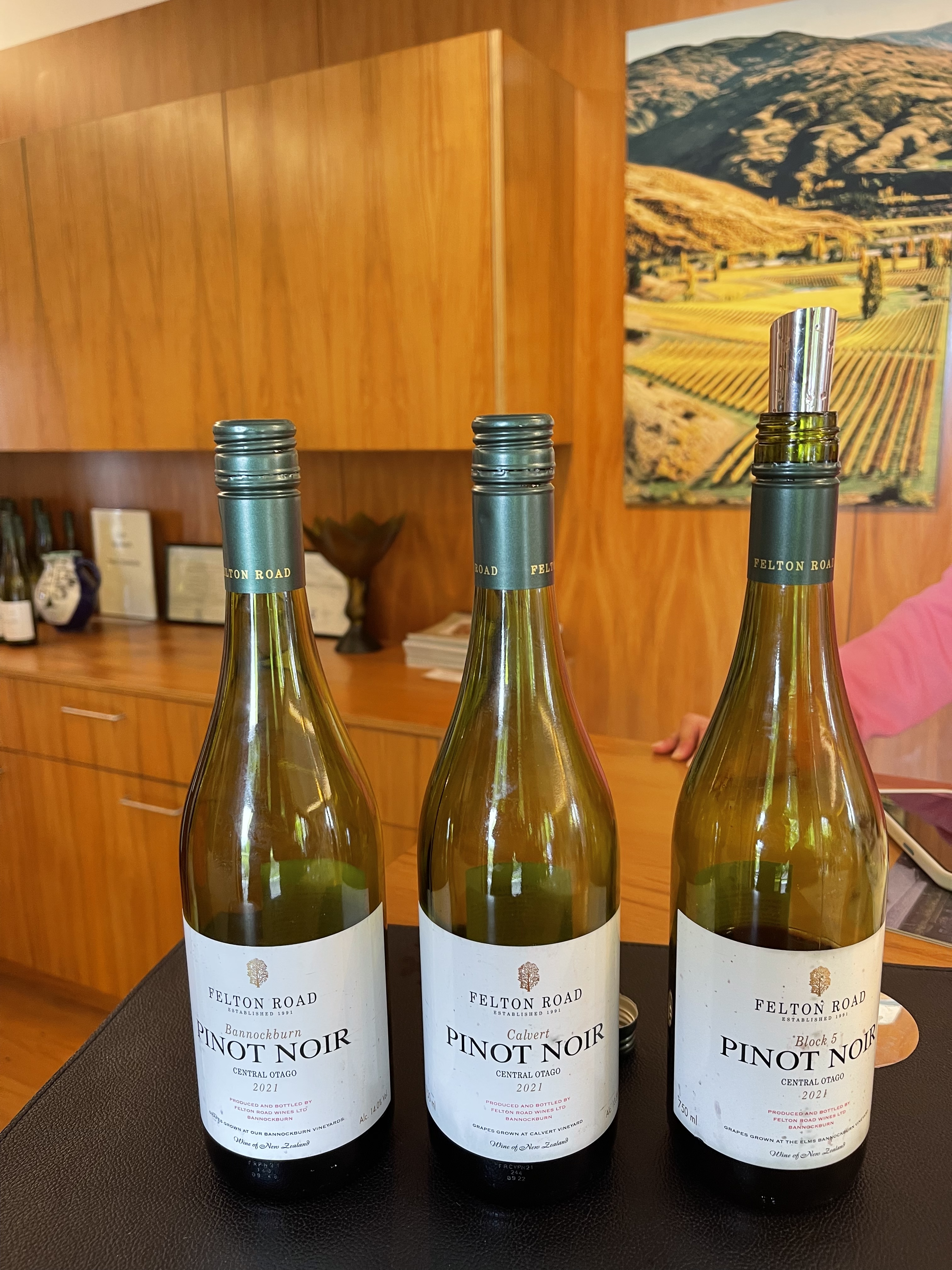 L’Otago, c’est aussi une merveilleuse région pour le pinot noir. Sol de graves, fortes températures diurnes avec nuits fraîches, une bonne recette! Le choix est immense, mais beaucoup de maisons n’ouvrent que le we. On essaie donc des coups de fils et mails et çà marche. Nous visitons Desert Heart – la propriétaire a ouvert pour nous! merci Jane – puis l’ultra prisé Felton Road. Ici on compense même le carbone que vous utilisez pour venir les visiter. Les fûts de chêne français, remplis par gravité (bien entendu) vieillissent au son d’une douce musique classique. Les parcelles sont enherbées avec 9 variétés de plantes différentes qui varient suivant la composition du sol etc. La biodynamie et le développement durable dans toutes leurs splendeurs. Et le résultat est à la hauteur. Les grands crus sont indisponibles à l’achat au domaine, et sur liste d’attente. Les visiteurs sont australiens, belges et sont venus à Bannockburn (c’est le nom de cette vallée) uniquement pour les visiter. Ici on n’essaie plus de ressembler aux « maîtres » européens mais de développer son propre style, la signature des Pinot de l’Otago. Bien que récent (une trentaine d’années), la région est en passe de réussir son pari!