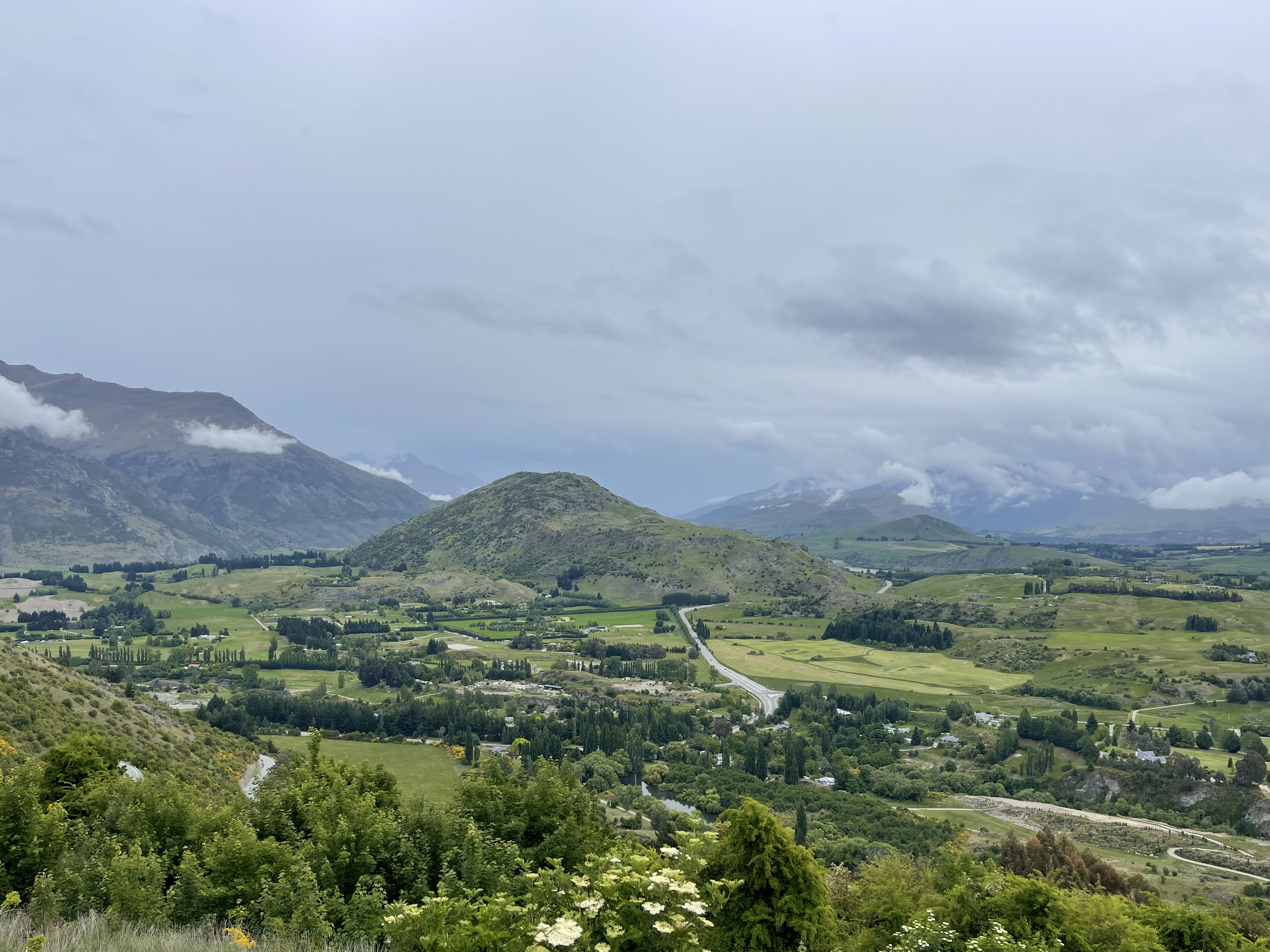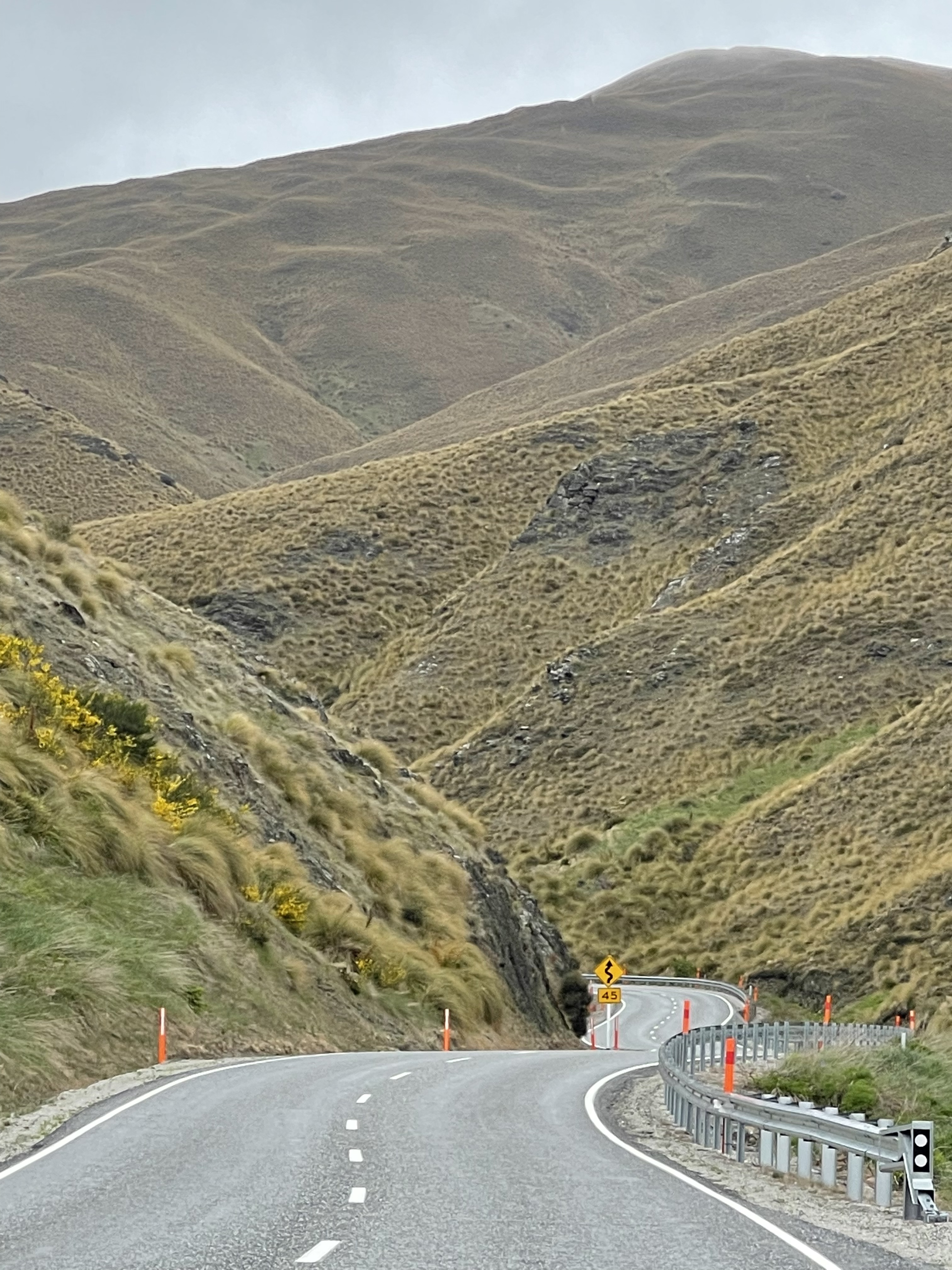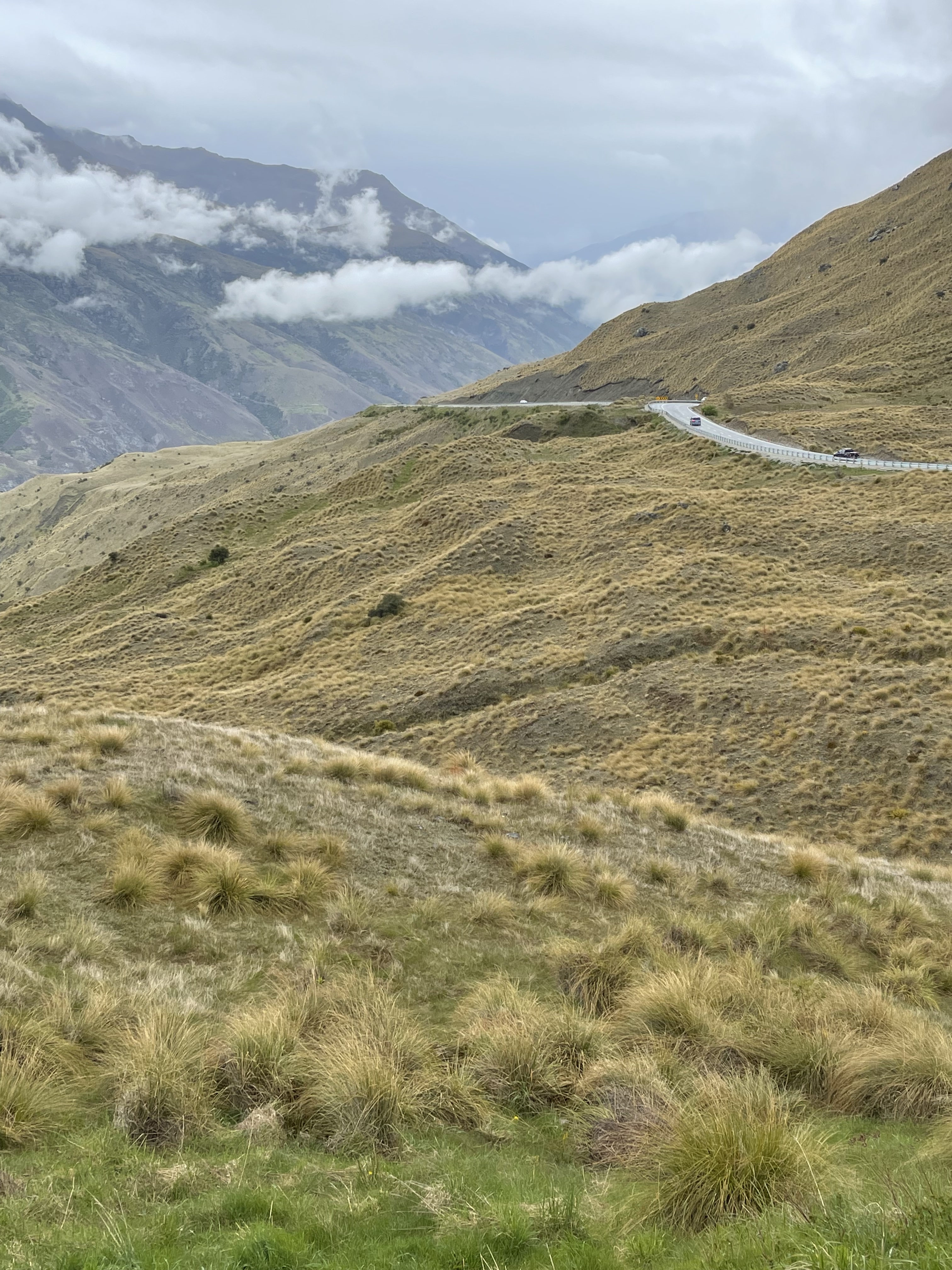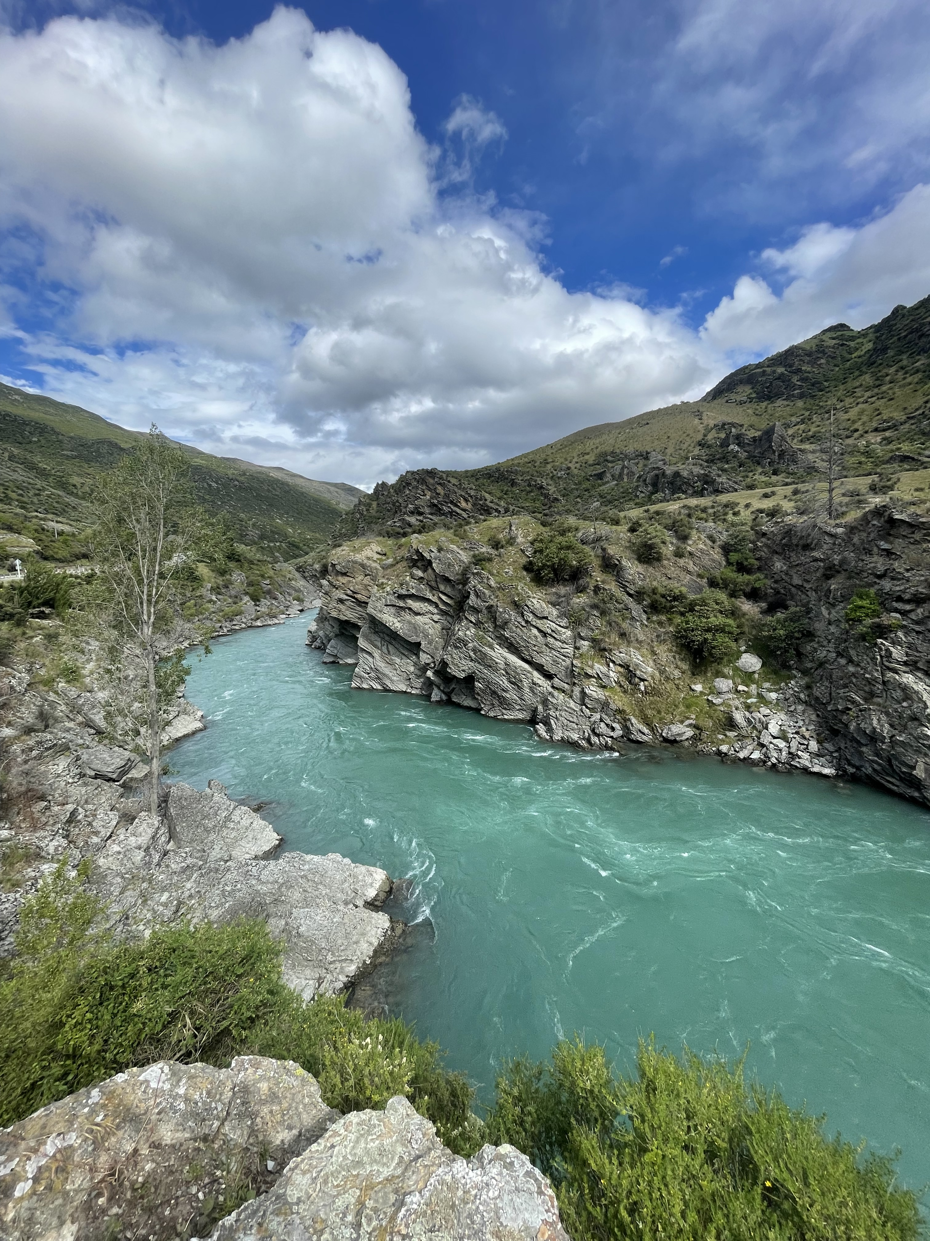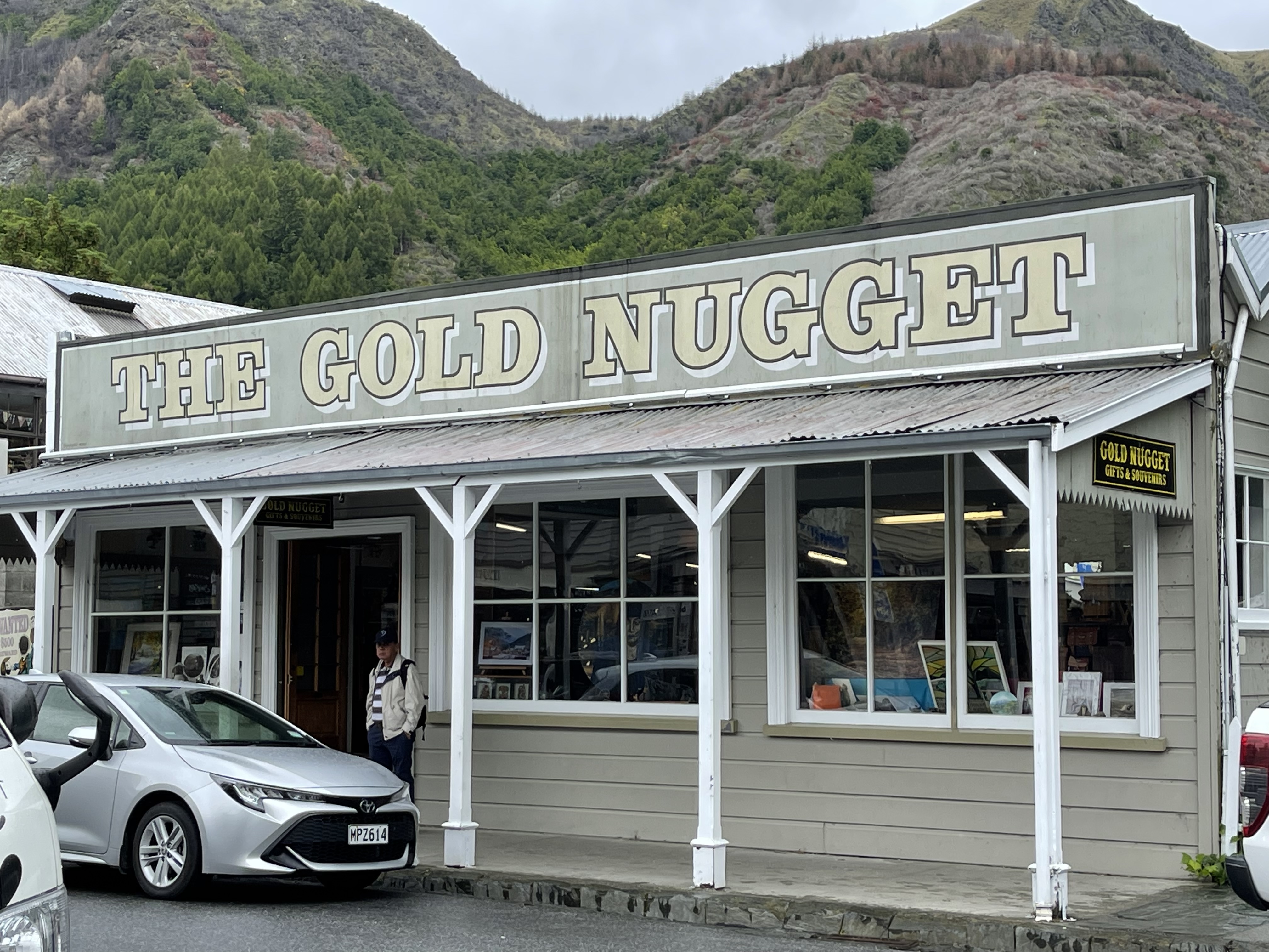 On se remet en route et la route part à droite vers une station de ski. Nous sommes donc bien à la montagne! La suite n’est que gorges couvertes de graminées (pas d’épicéa ici) et montées avec en final une vue spectaculaire sur la vallée. Nous sommes à 1100m, nous allons donc descendre vers la très typique et touristique petite ville d’Arrowtown qui a préservé des rues commerciales aux façades très fin XIXè avec des commerces d’aujourd’hui. Au retour, nous longeons la spectaculaire rivière Kawarau. On y fait du rafting entre ses parois rocheuses ou du saut à l’élastique depuis un ancien pont. Un vrai business très huilé! On se contentera de photos :-).