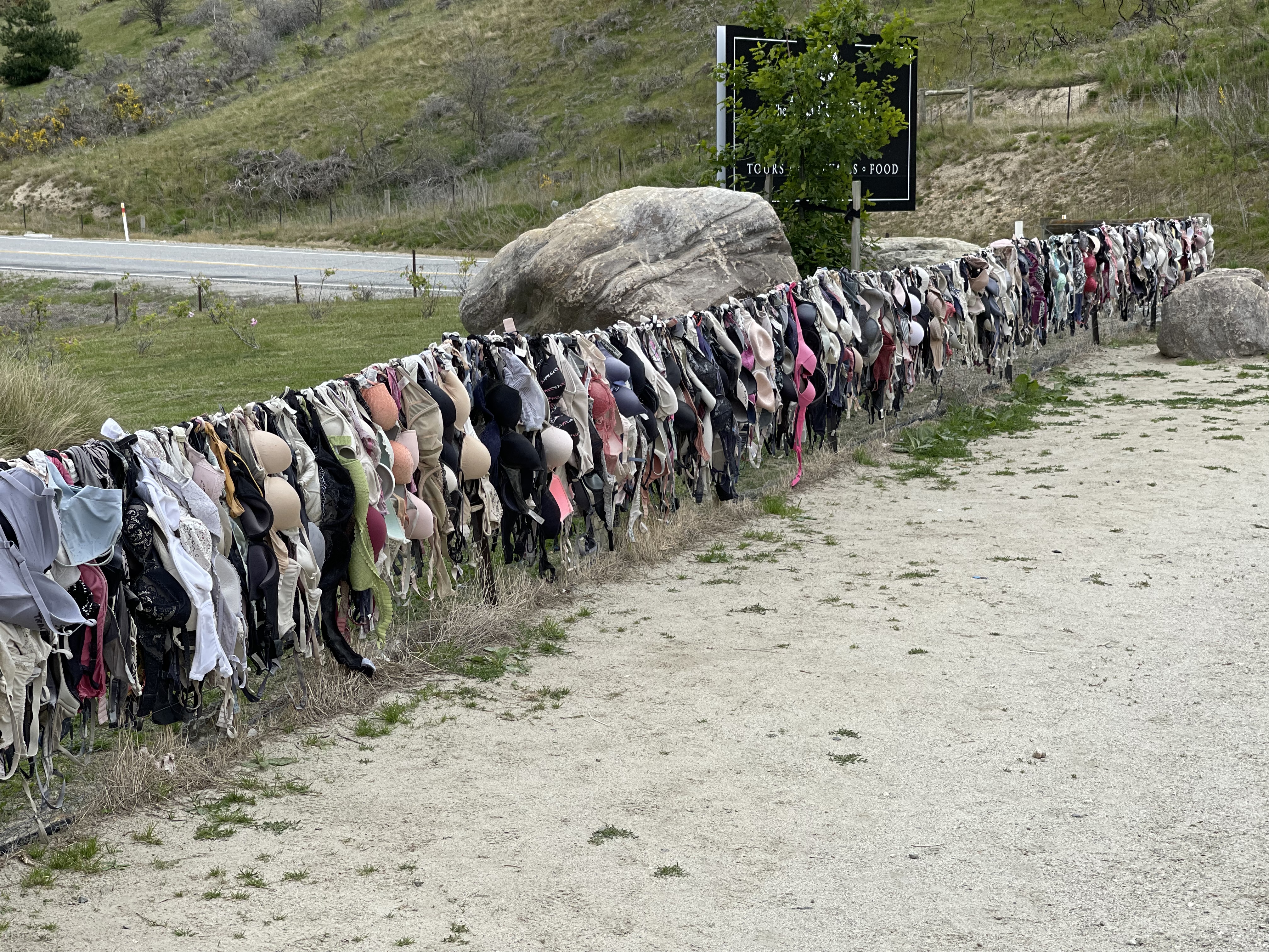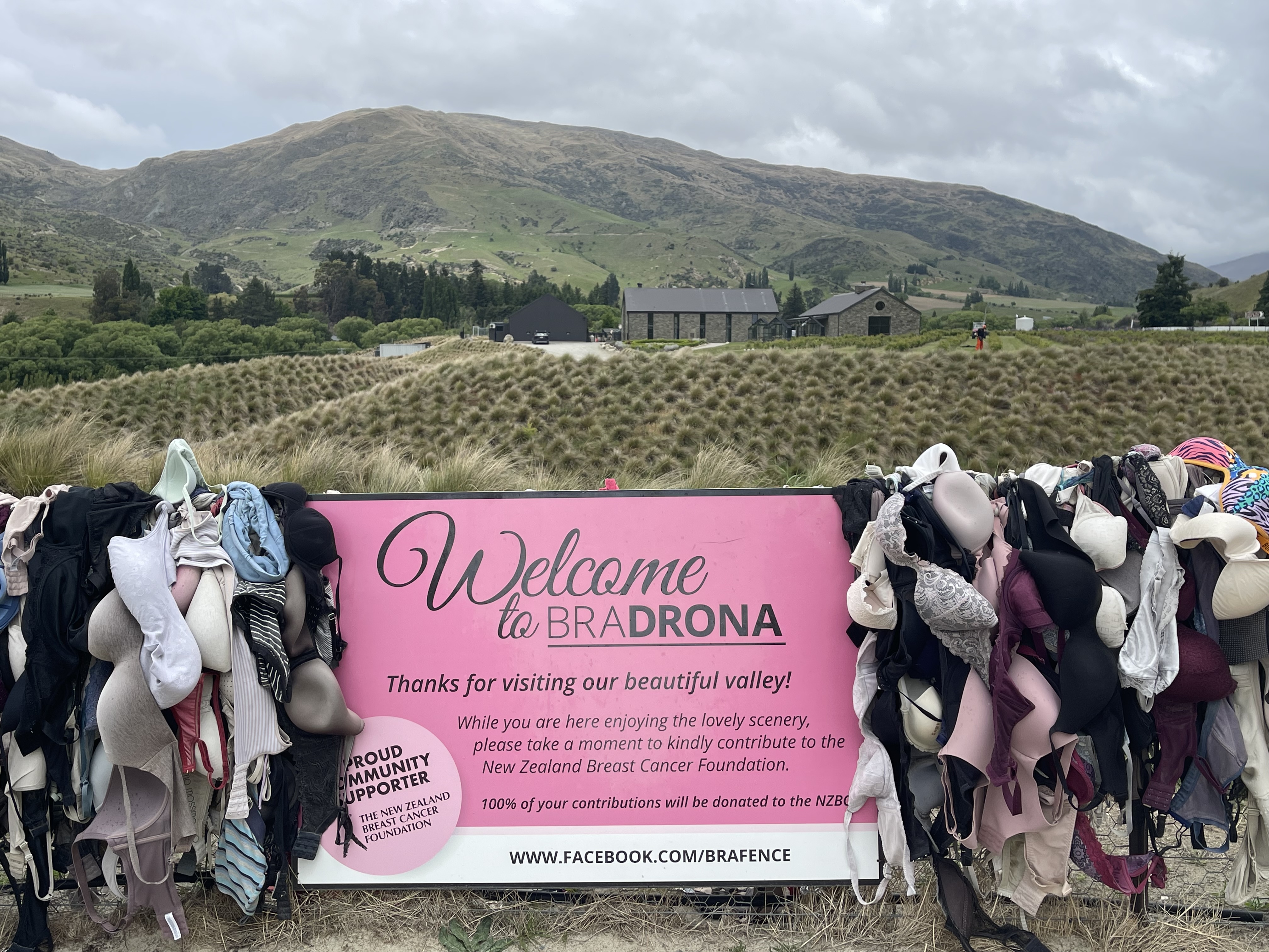 Sur la route des montagnes, nous croisons la distillerie Cardrona. Très beaux bâtiments posés au milieu de graminées (elles sont ici chez elles) qui ondulent sous le vent. Distillerie de whisky mais pas que. L’endroit est aussi connu pour Bradona. Juste avant d’arriver à la distillerie, des centaines de soutiens-gorges sont suspendus le long d’une clôture. Une manière pour le moins originale d’inviter les visiteurs à contribuer à la Fondation néo-zélandaise du cancer du sein.