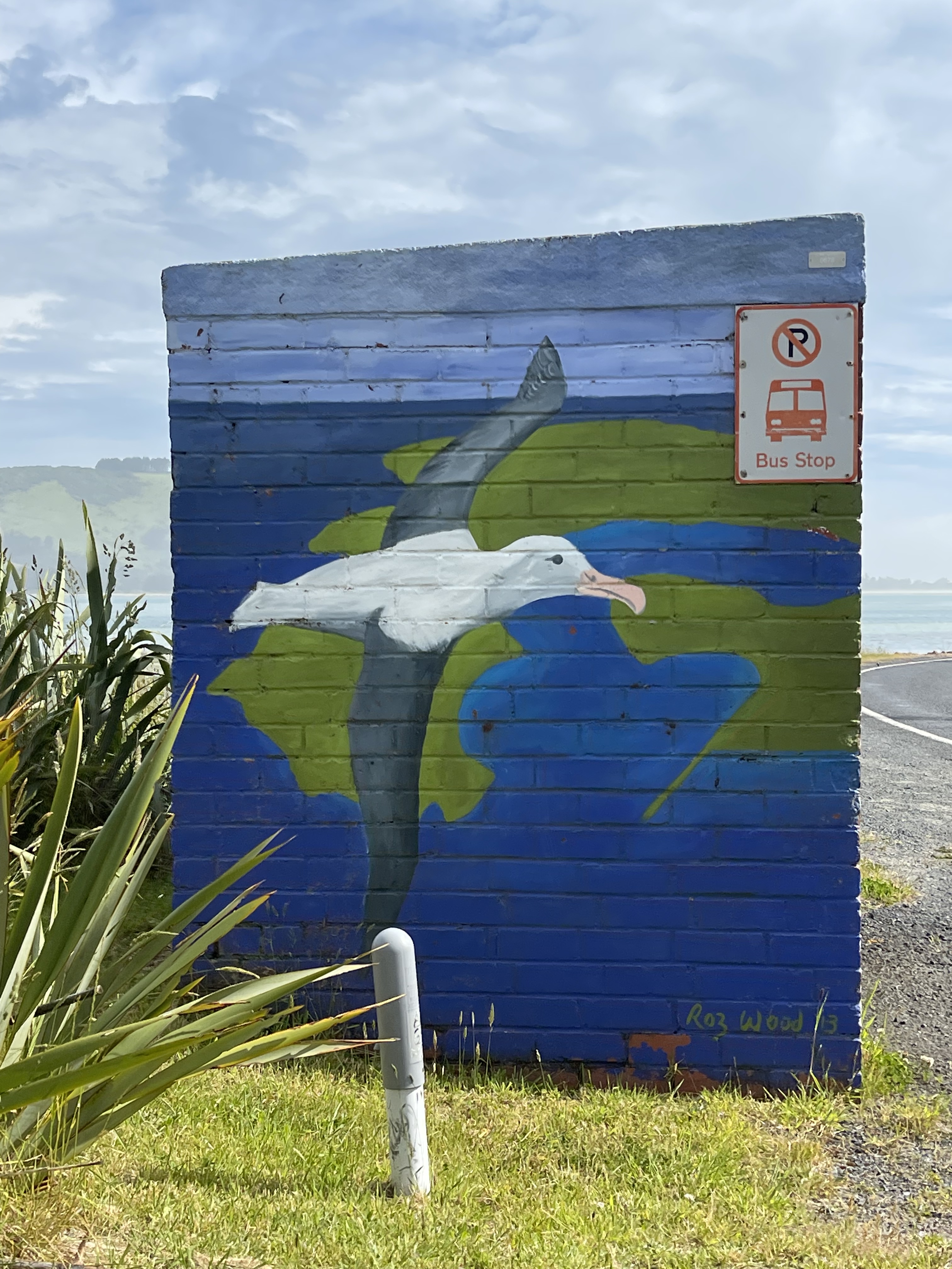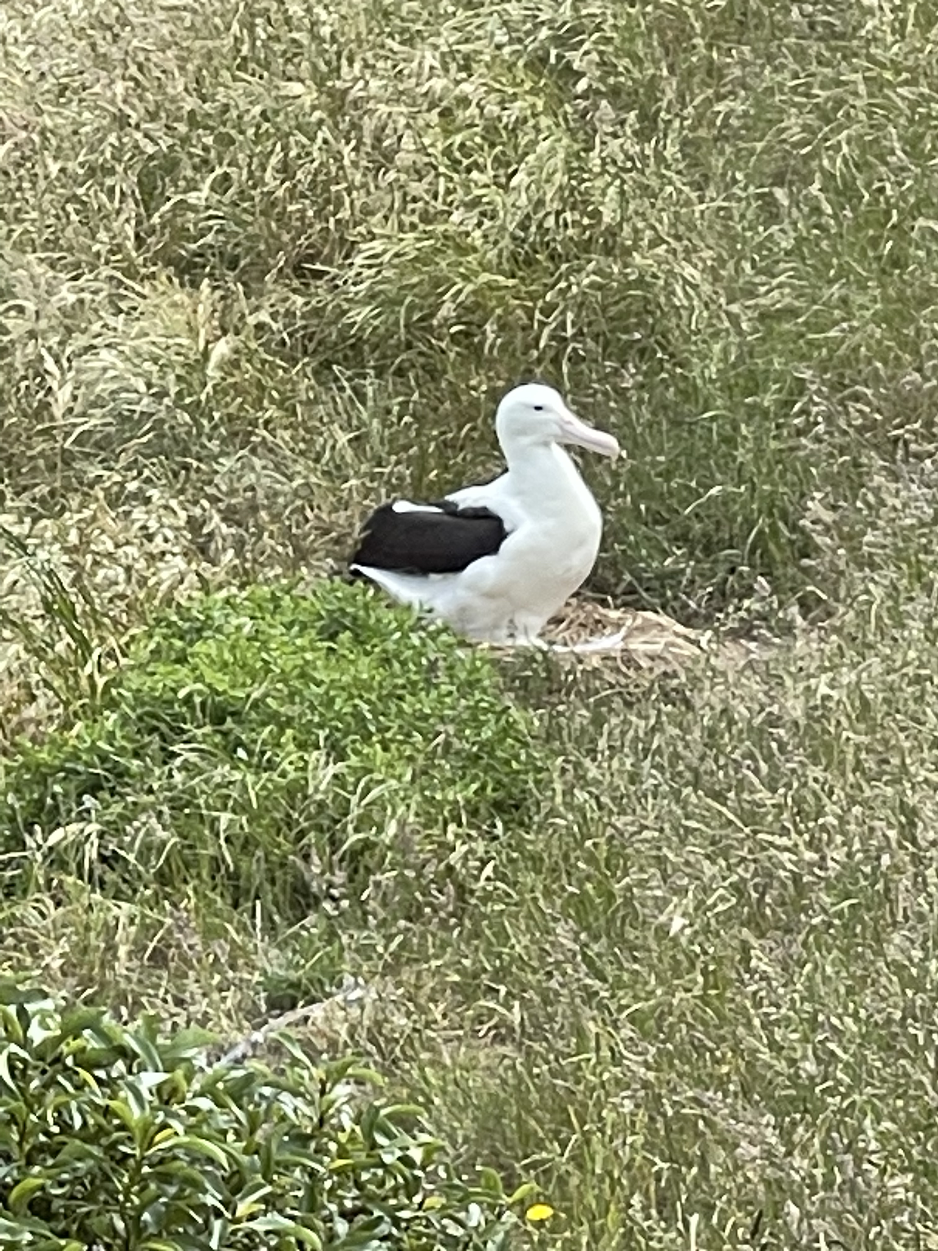 Entendez-vous les cloches de toutes les églises de la péninsule et de Dunedin? Elles annoncent le retour du premier albatros royal. Les autres suivront, des couples se formeront et les albatros resteront à Taiaroa jusqu’à ce que les jeunes soient en mesure de s’envoler à leur tour. Leur premier vol sera pour aller visiter les eaux poissonneuses du Chili à 9000km de là. Ce « petit » déplacement ne leur prendra que 11 ou 12 jours. L’albatros parcourra plus de 200.000km avant de revenir nicher sur la péninsule l’an prochain. Il passe plus de 80% de son temps dans les airs et se nourrit principalement de calamars. Ce matin, lors de notre visite au centre, le vent est tombé. Seul un albatros viendra nous saluer. Les autres sont soit occupés à couver ou sont partis pêcher à quelques 300 km de là dans les eaux riches de Kaikoura, où nous avons séjourné un peu plus tôt. Impossible de le confondre avec les mouettes ou cormorans qui nichent sur le même bout de la péninsule – 3 mètres d’envergures au bas mot.