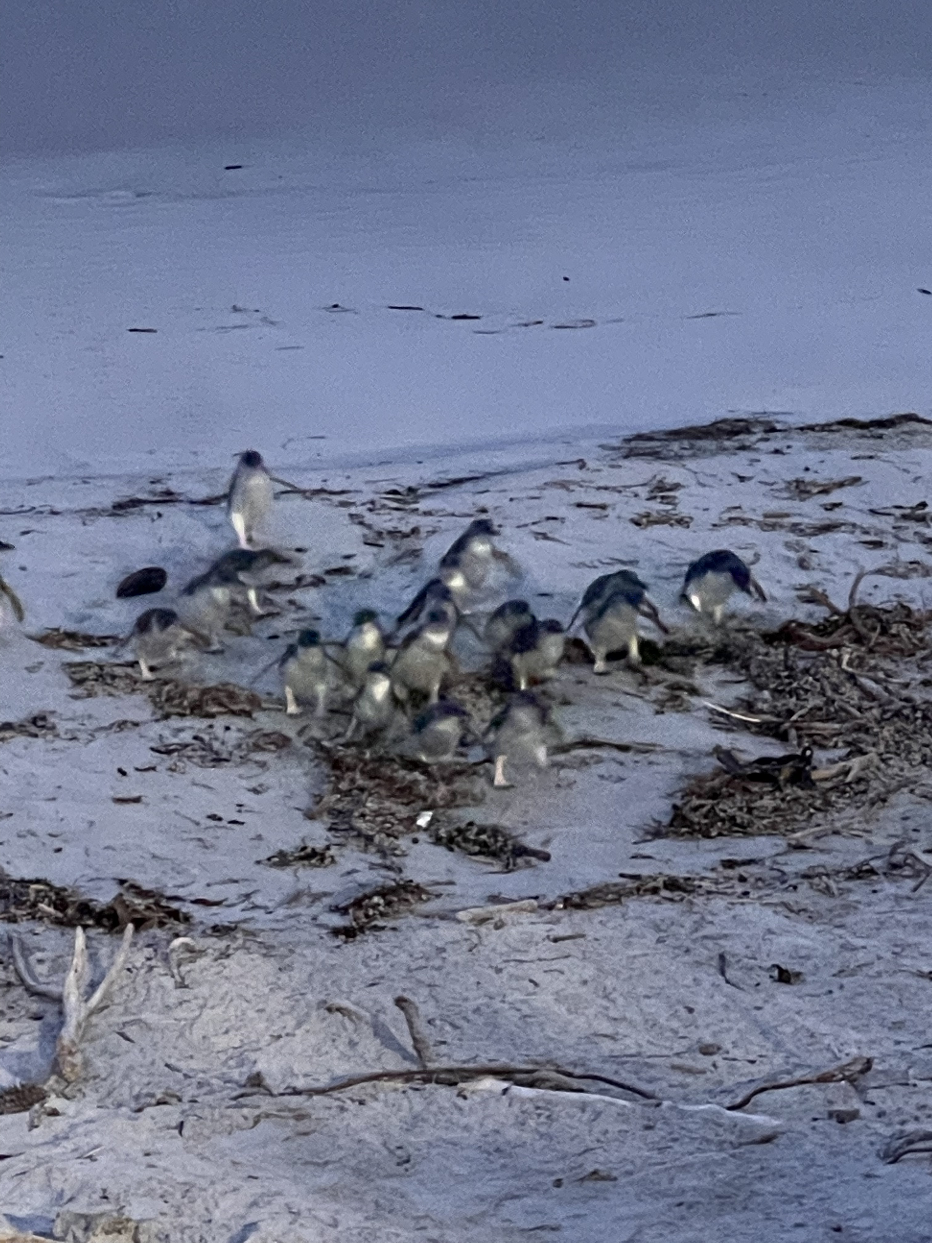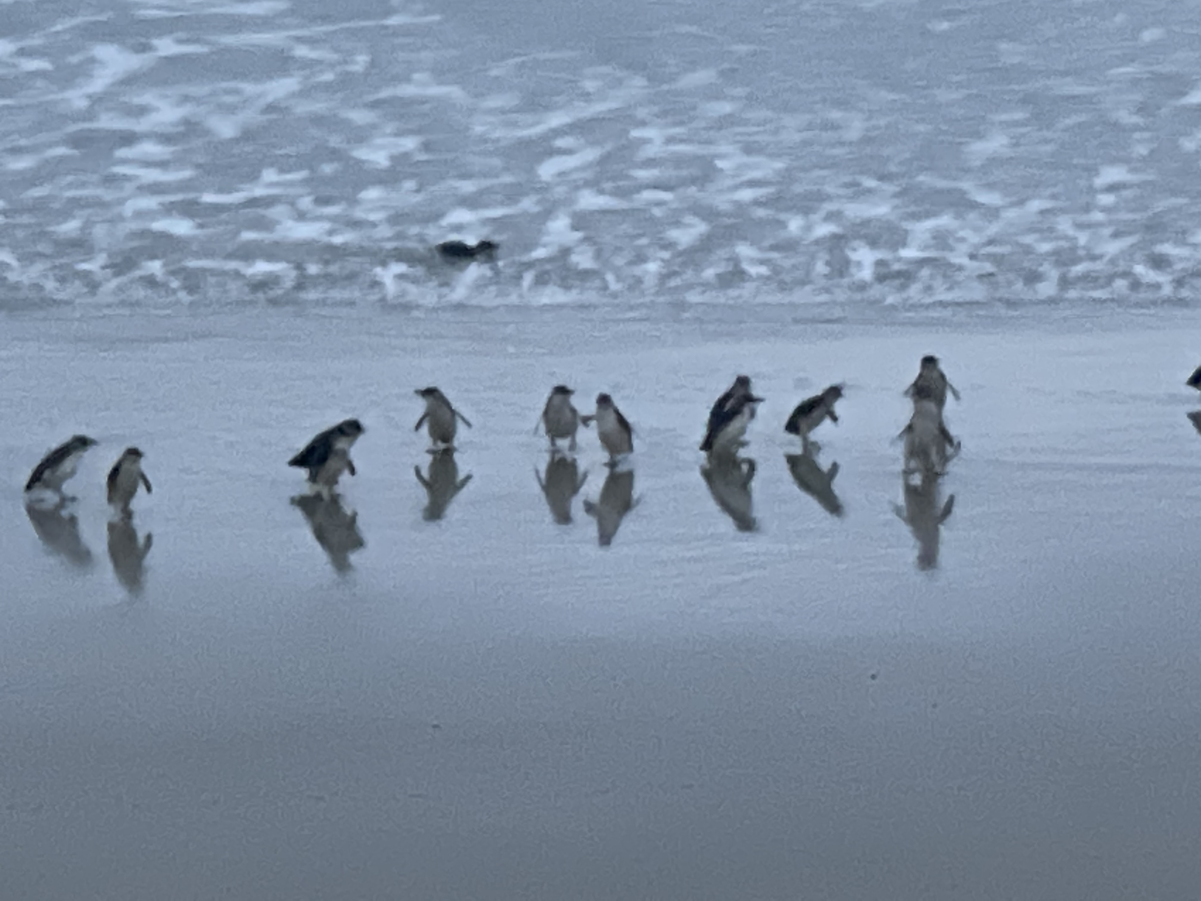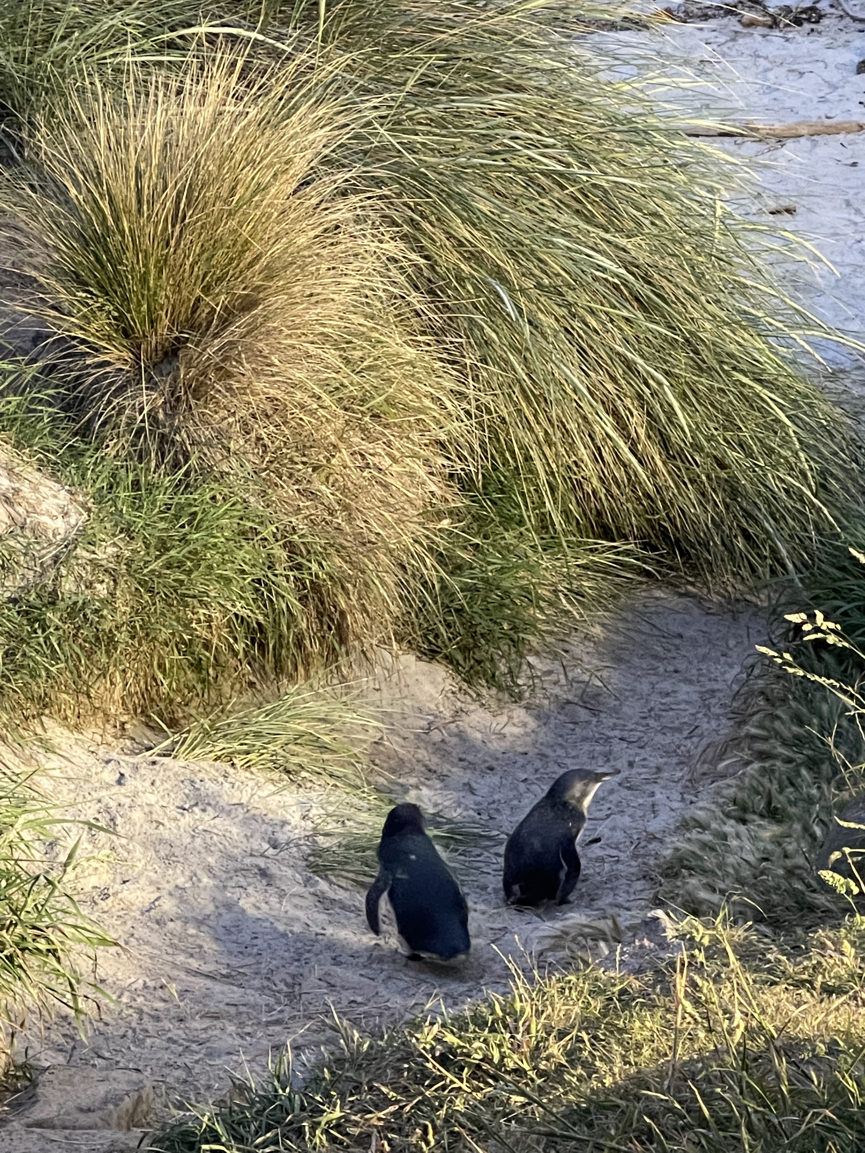 Sur la plage en contrebas nichent des manchots pygmée, les plus petits manchots au monde. Pour les observer, il faut attendre la tombée du jour. Ils rentrent alors de leur journée de pêche, ramenant avec eux de quoi nourrir leurs petits. Leur arrivée se fait par groupe afin de se protéger mutuellement des prédateurs qui pourraient les attendre sur la plage, comme les phoques ou lions de mer. C’est un vrai spectacle que de voir ces « petits bonhommes bleus » de 60 cm de haut se dandiner en groupe sur la page et rejoindre leur nid. La plateforme est idéalement située et nous permet de les voir de très près sans déranger leur routine. Ces petits pingouins se reproduisent très bien (3 oeufs par an) et ne sont pas en danger d’extinction.