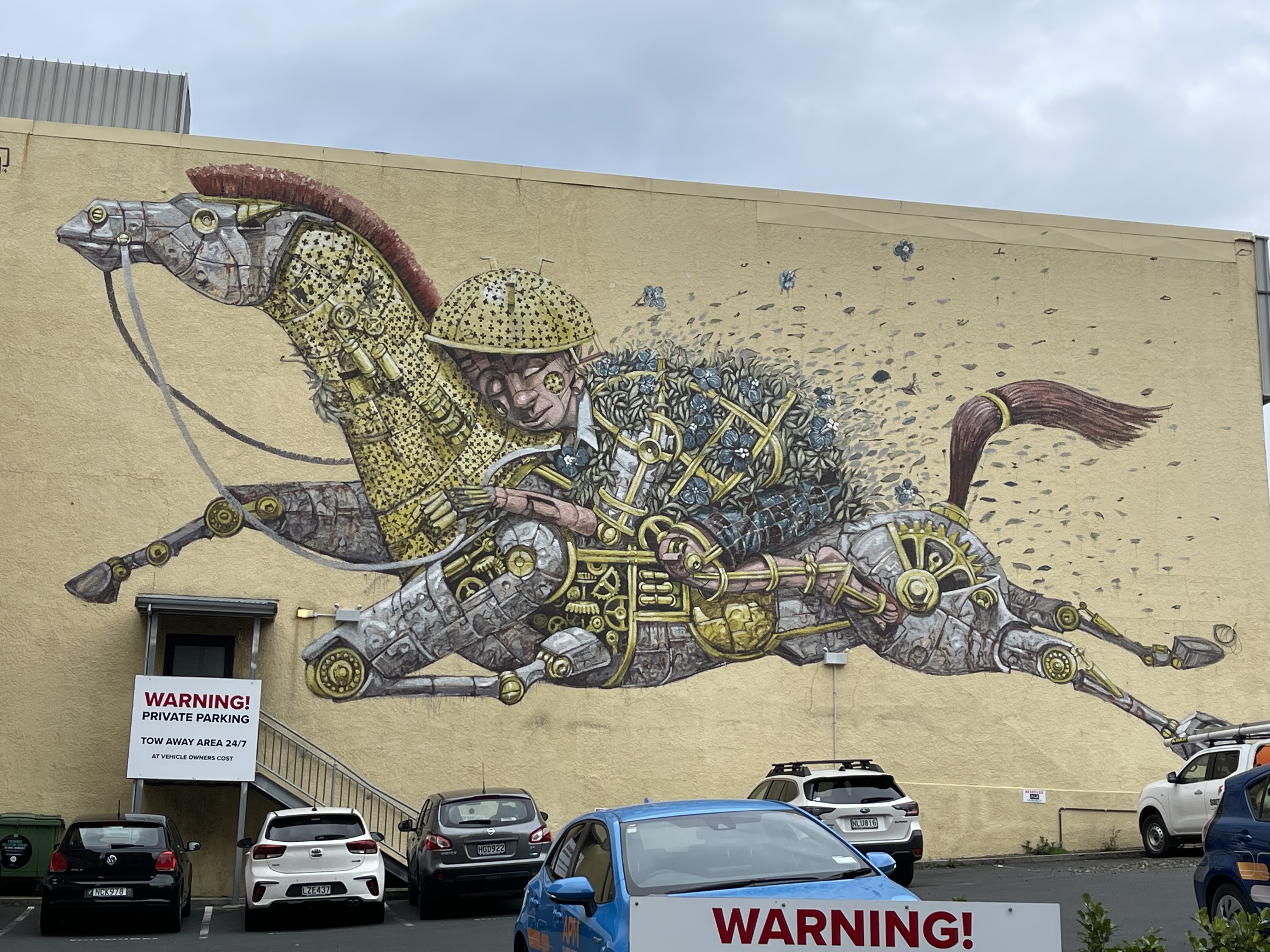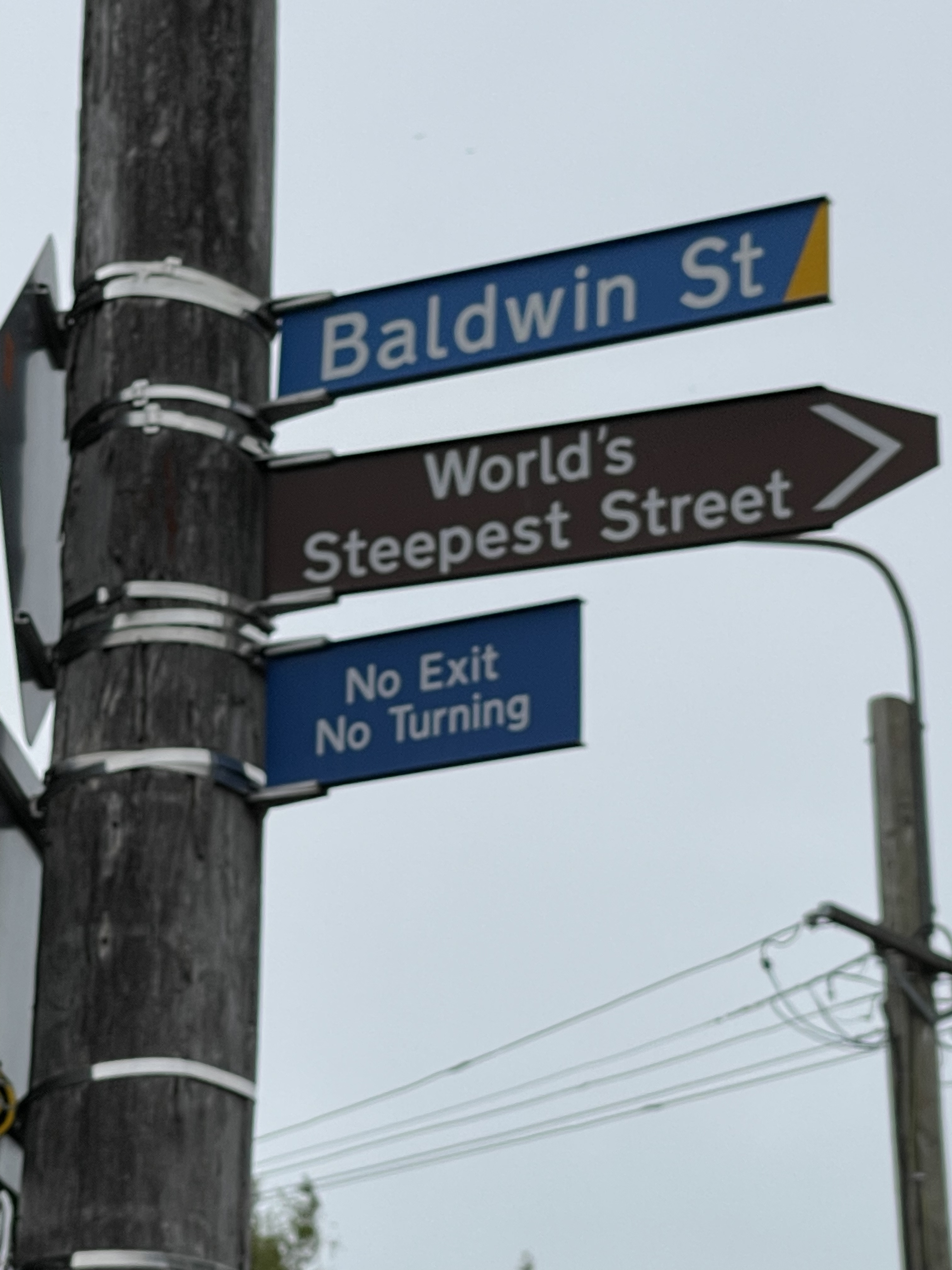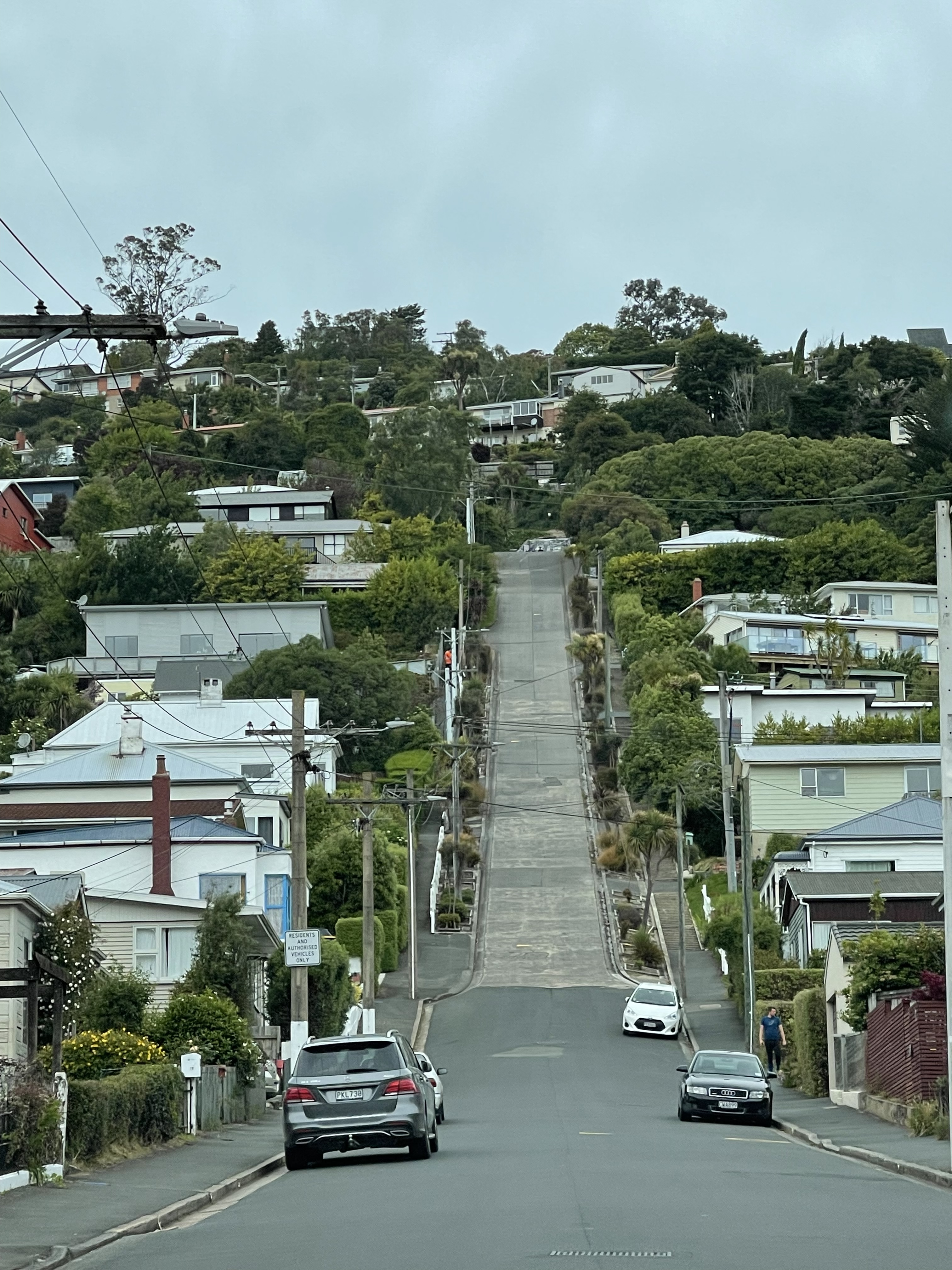 Dunedin étant seulement à 30 minutes de voiture, nous décidons d’aller y passer une journée. Les descriptions du guide étant plutôt enthousiastes. Nous en reviendrons assez déçu… peut-être que si le soleil avait été de la partie, notre appréciation aurait été différente mais pas certain. Nous marchons dans la ville avec ses décorations de Noël, visitons le plus ancien jardin botanique du pays (magnifiques cèdres du Liban et pins d’Amérique, quelques derniers rhododendrons en fleurs) et faisons l’expérience de la rue la plus pentue du monde. 47 mètres d’élévation sur 160 mètres de route. De quoi vous donner l’impression de la voiture va partir en looping arrière…mais ça passe. Ouf!