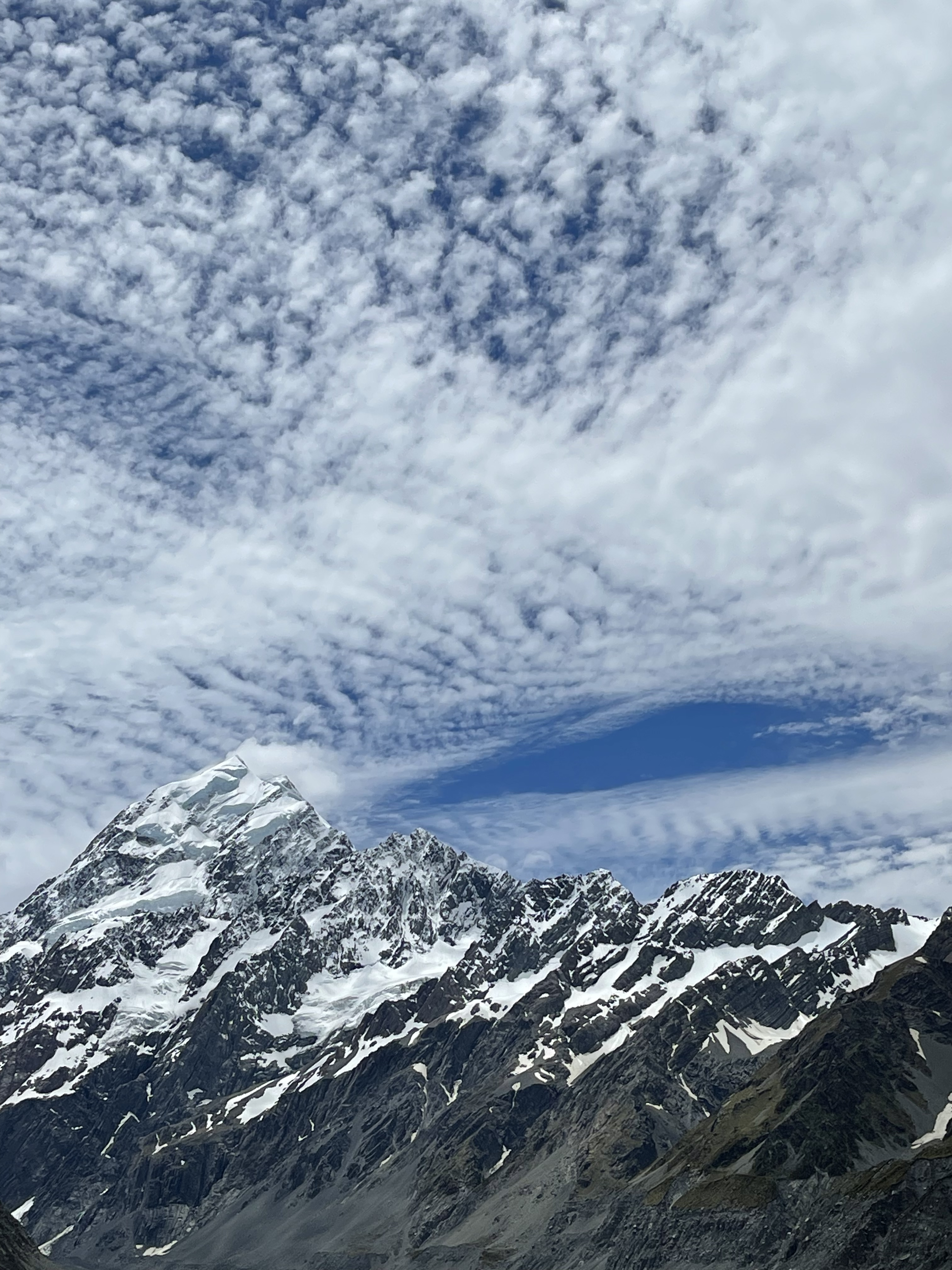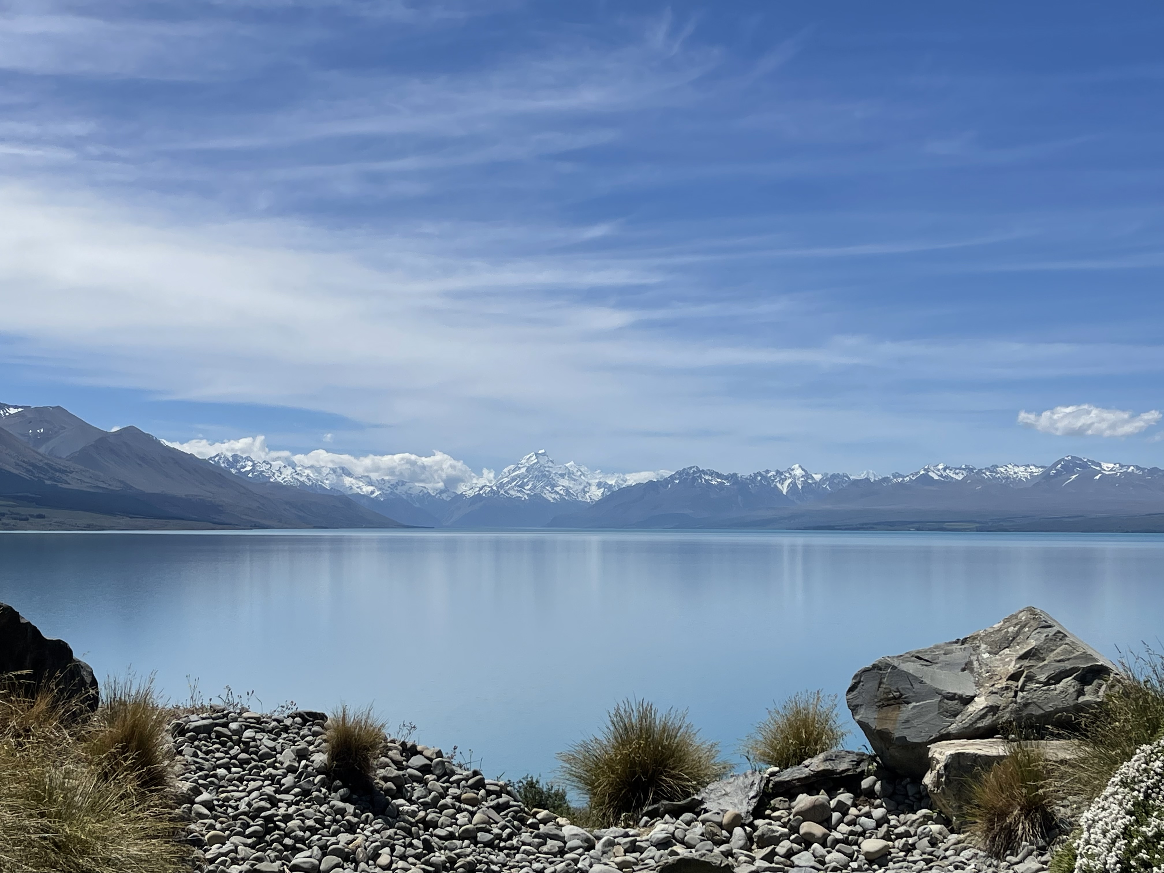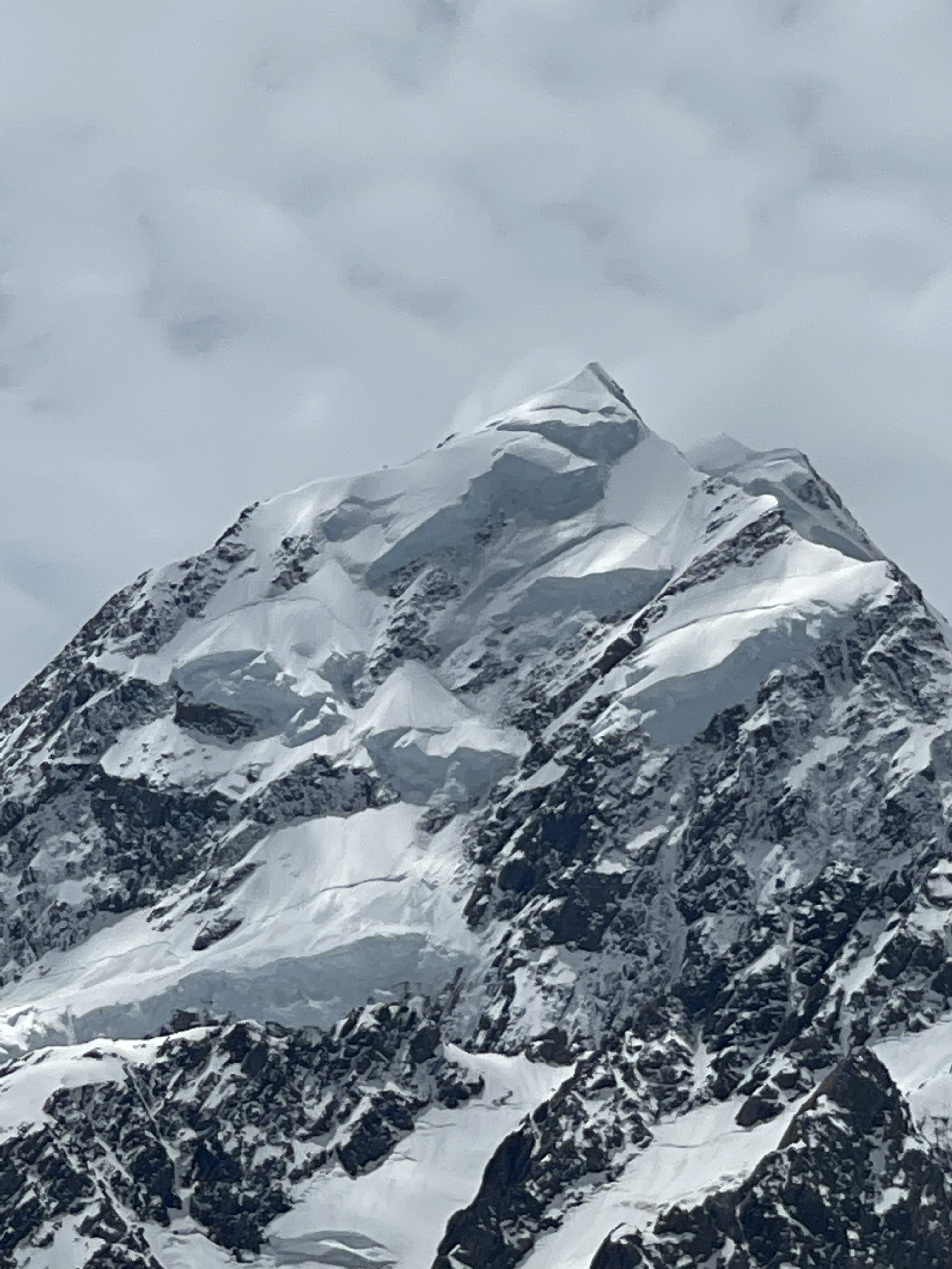 Enfin le voilà. Et quelle mise en scène. Il est visible à une cinquantaine de kilomètres. Entre lui et nous un lac d’une couleur…bleu électrique, c’est hallucinant. Nous sommes devant le point culminant de la NZ à 3722m. Son nom Maori est Aoraki. Ce sera aussi le nom de notre chambre au lodge. De la terrasse, vue sur le lac et le mont Cook. Magique. On rencontre une Suissesse et un Allemand qui travaille au lodge depuis 6 ans. Très sympas. Repos avant d’aller tâter les pentes de la bête demain.