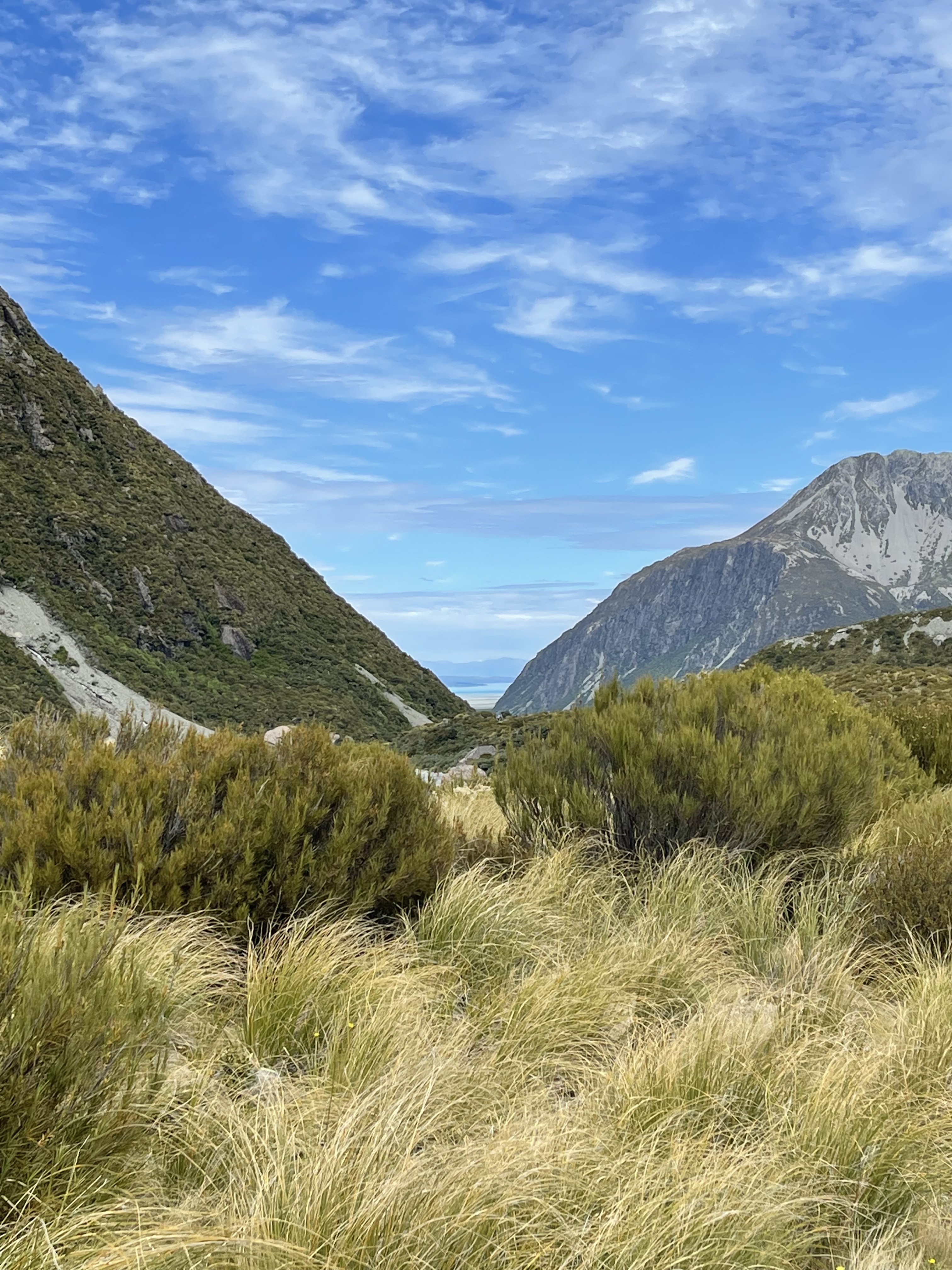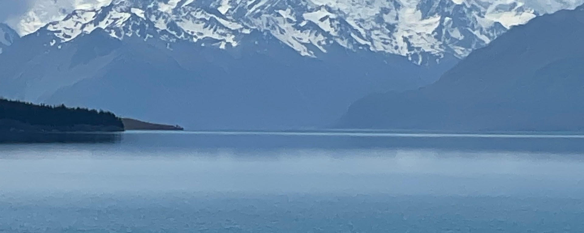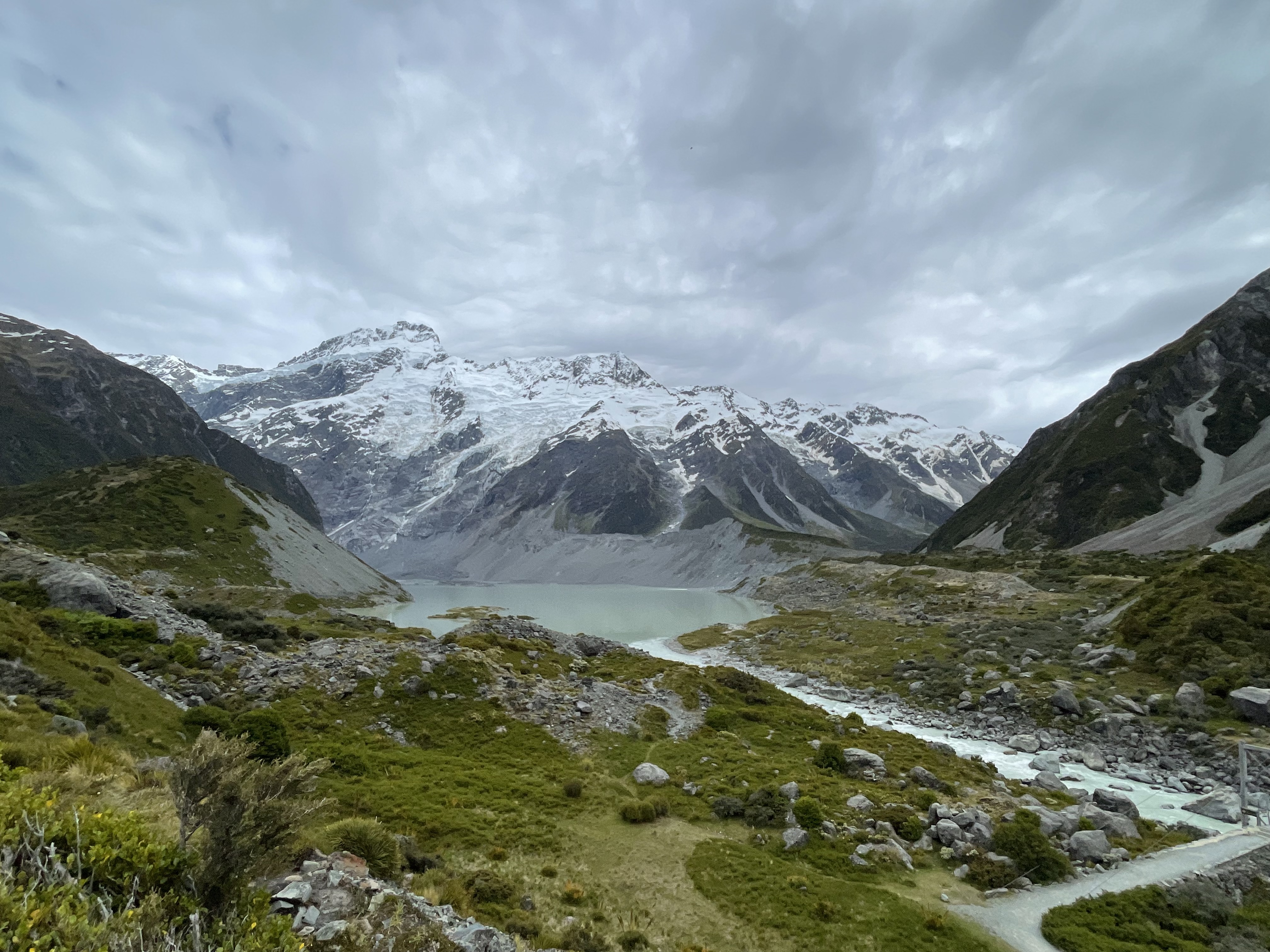 Enfin le voilà. Et quelle mise en scène. Il est visible à une cinquantaine de kilomètres. Entre lui et nous un lac d’une couleur…bleu électrique, c’est hallucinant. Nous sommes devant le point culminant de la NZ à 3722m. Son nom Maori est Aoraki. Ce sera aussi le nom de notre chambre au lodge. De la terrasse, vue sur le lac et le mont Cook. Magique. On rencontre une Suissesse et un Allemand qui travaille au lodge depuis 6 ans. Très sympas. Repos avant d’aller tâter les pentes de la bête demain.
