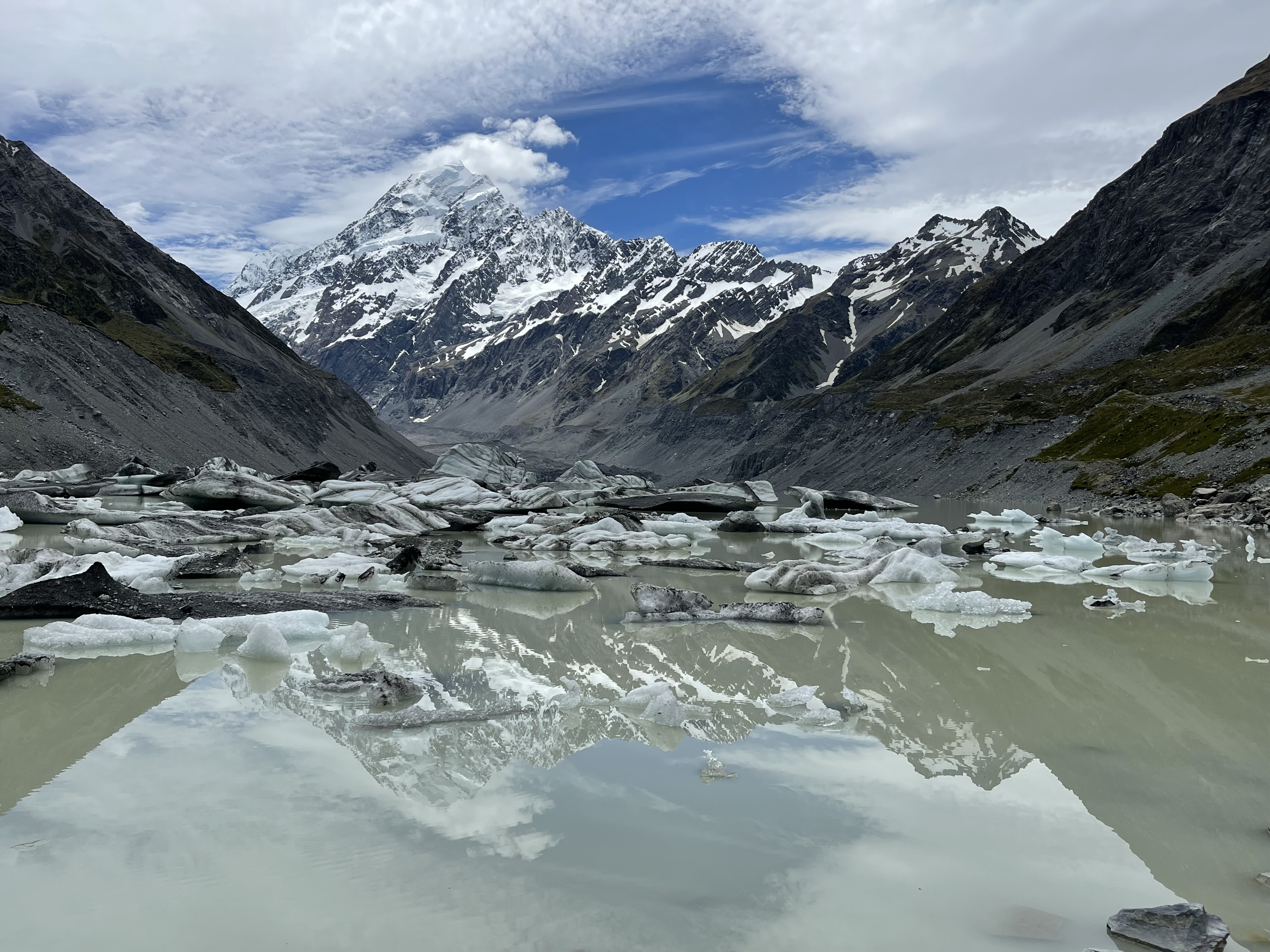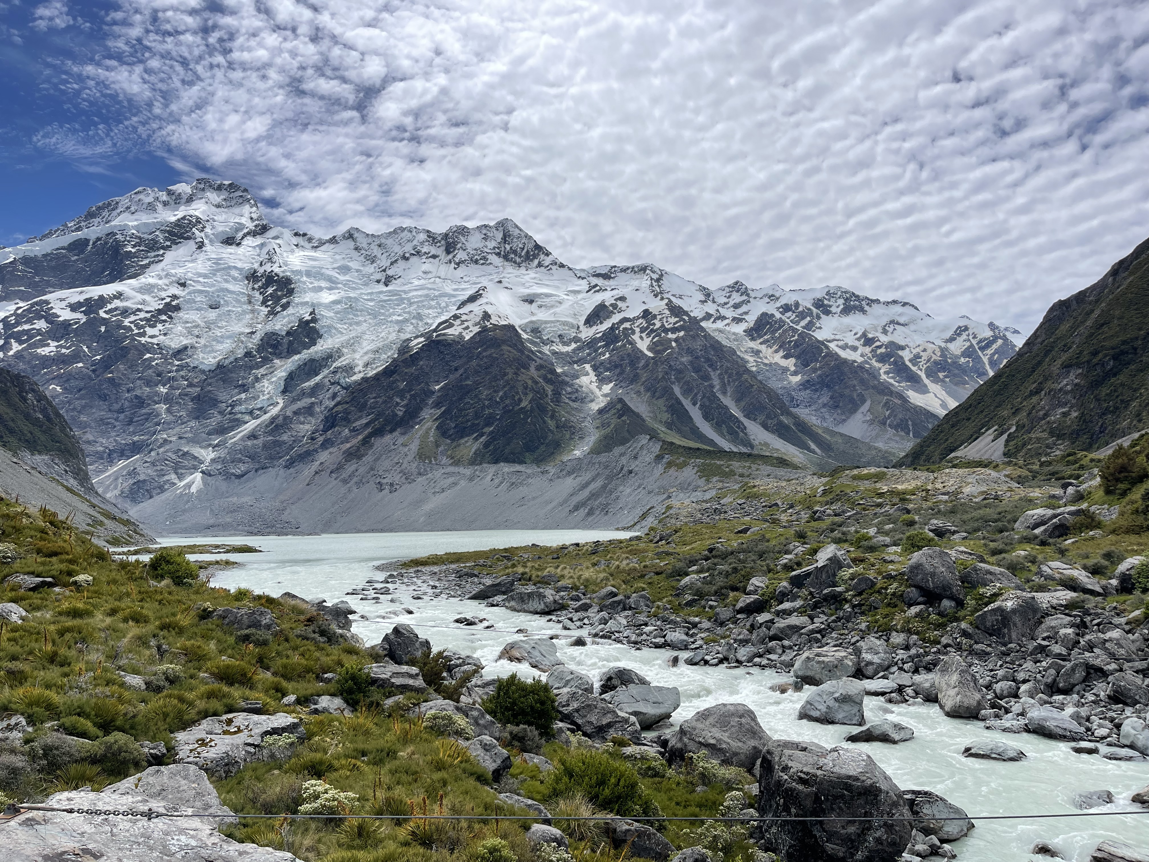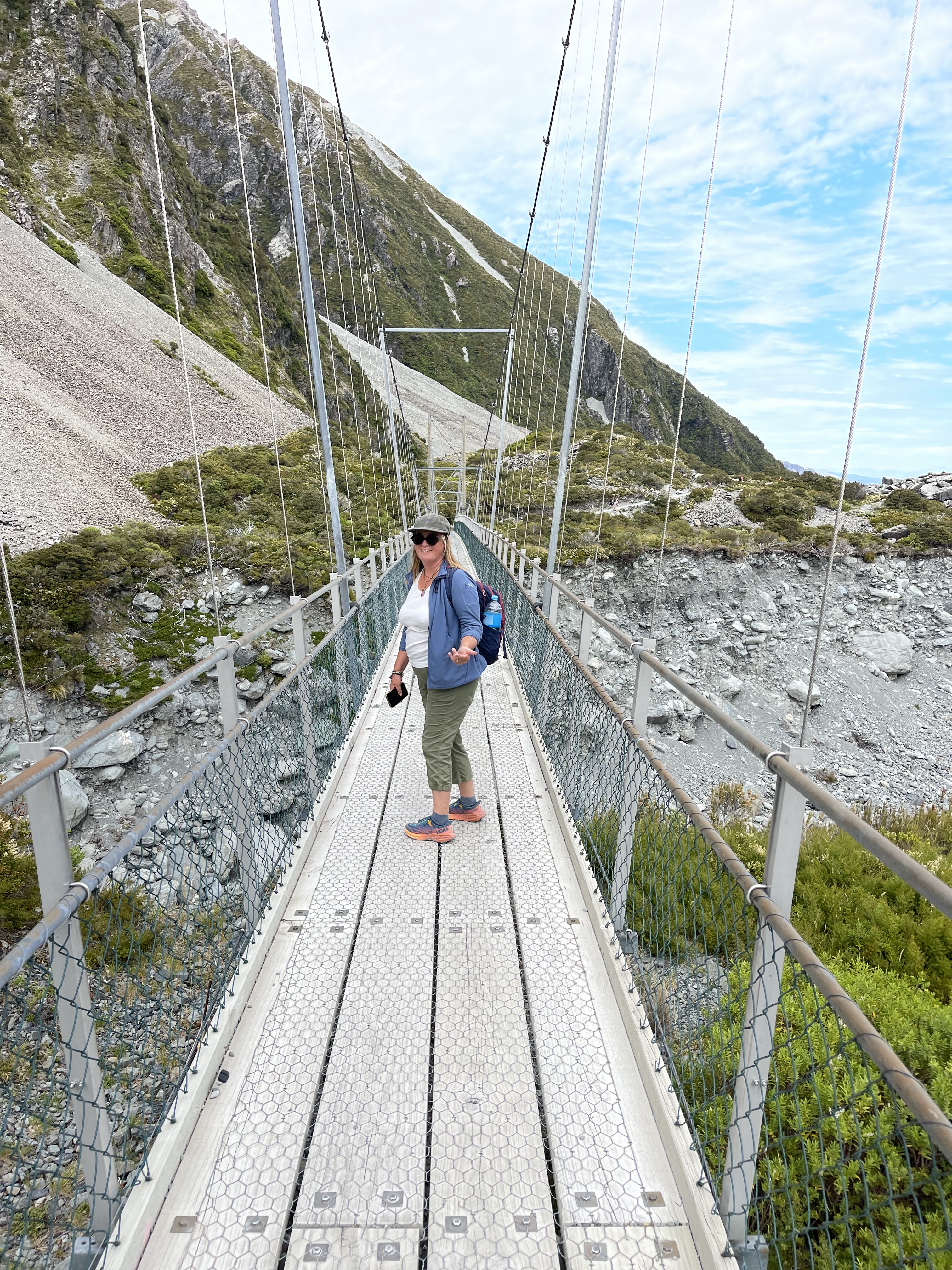 On a choisi une marche de 10km et 3 Hr, la Hooker valley track. On y restera bien 5 heures en flânant, déjeunant et mitraillant tellement l’endroit et le track sont photogéniques. Trois passerelles suspendues nous amènent à près de 900 mètres devant un petit lac au pied d’un glacier. Et dans ce lac à l’eau à 3 degrés, des icebergs qui se sont détachés du glacier et fondent lentement avant d’être emporté par le gros torrent qui descend vers la vallée. C’est tout simplement magnifique et on une chance énorme avec le temps. Le ciel est bleu, moments magiques.